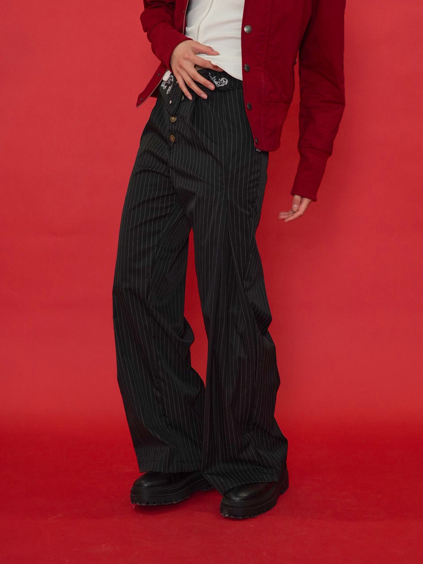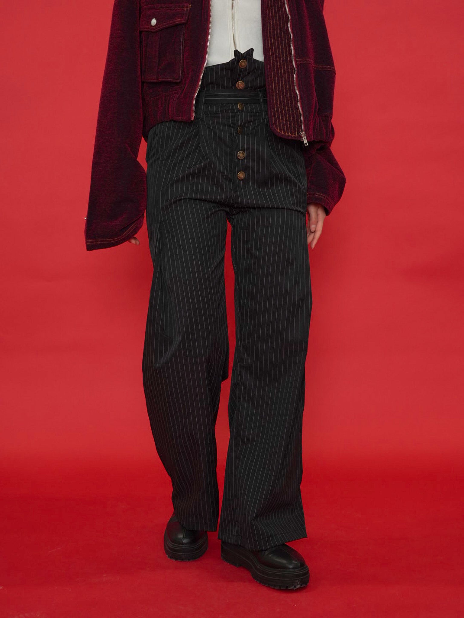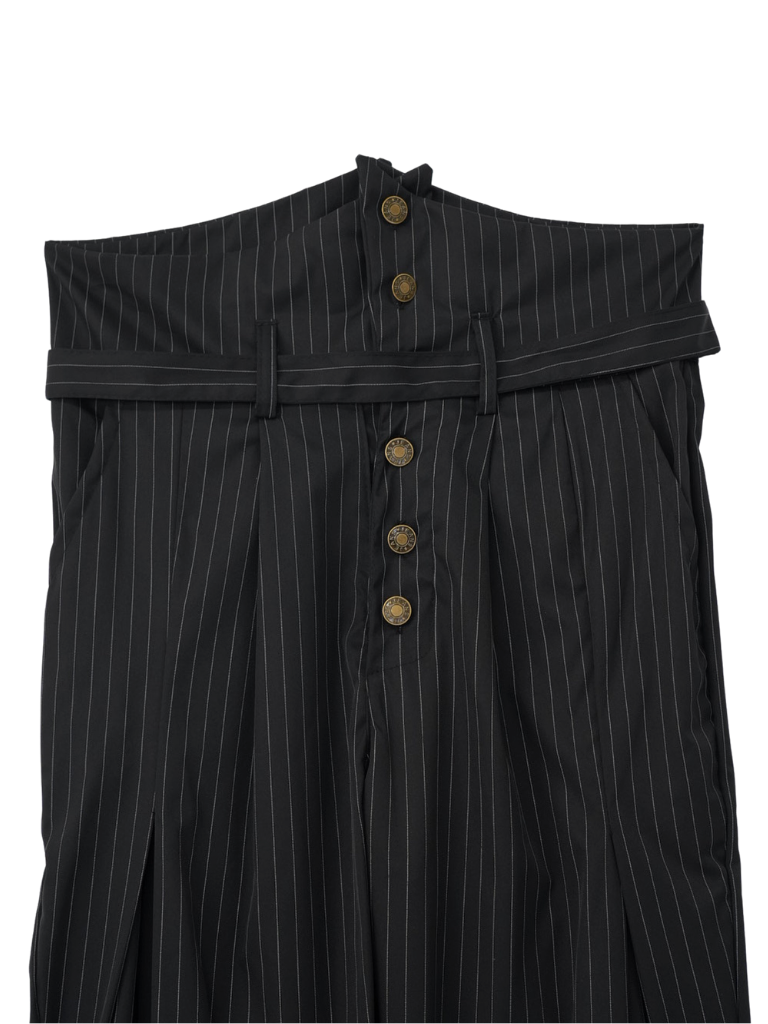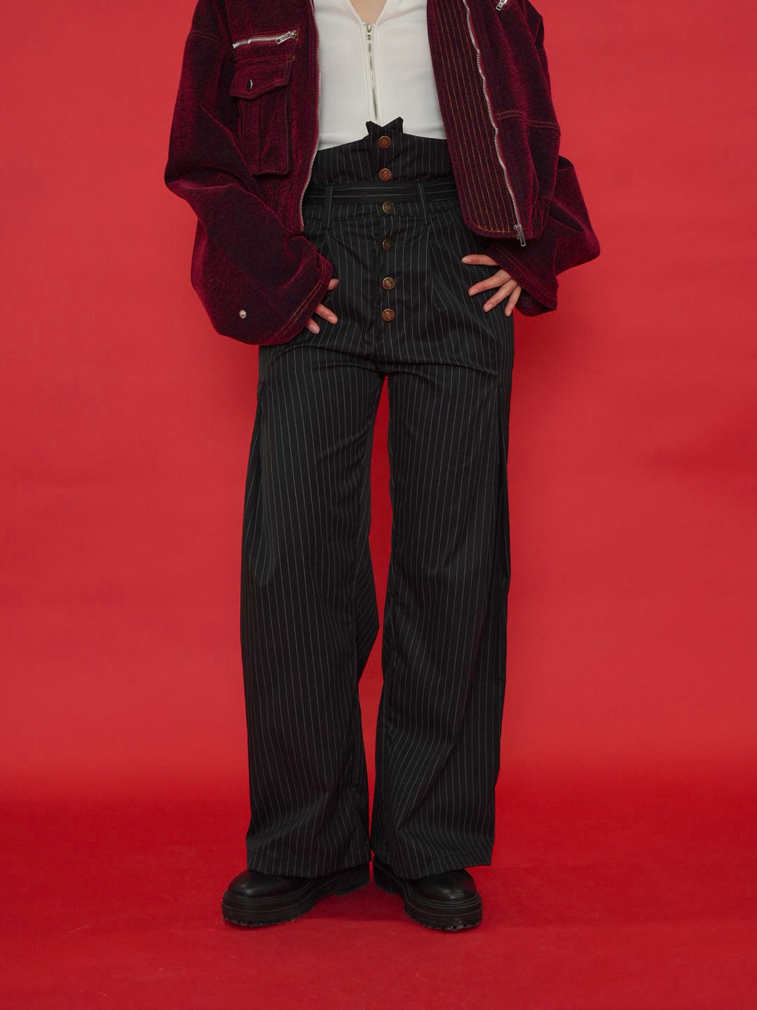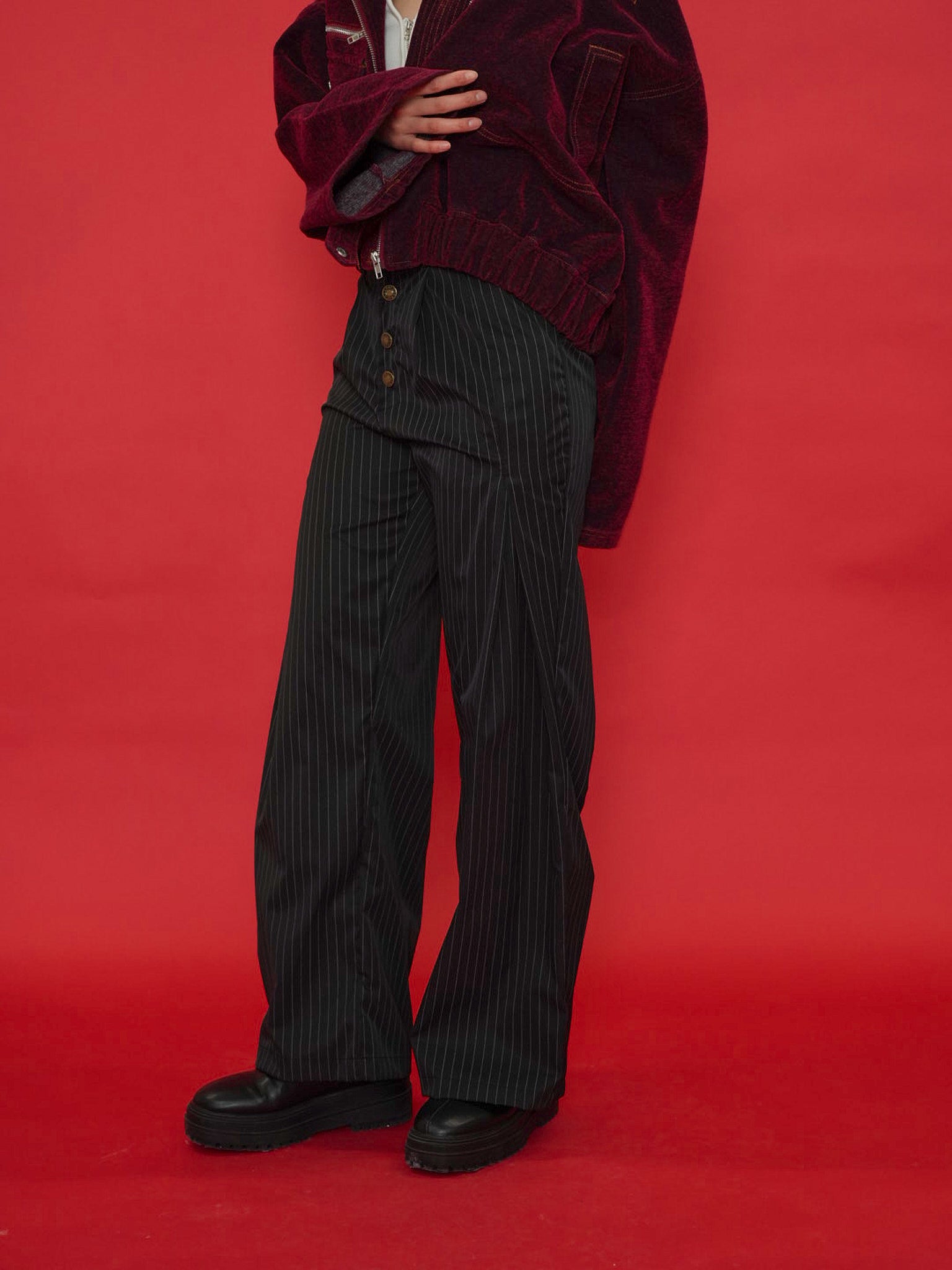 ボタンディテールが印象的なワイドシルエットパンツ。ウエストの留め方で表情が変わる2way仕様で、ハイウエストにもローライズにも着用可能。落ち感のある素材が動きを美しく見せ、スタイリングに程よい緊張感を与える一本。