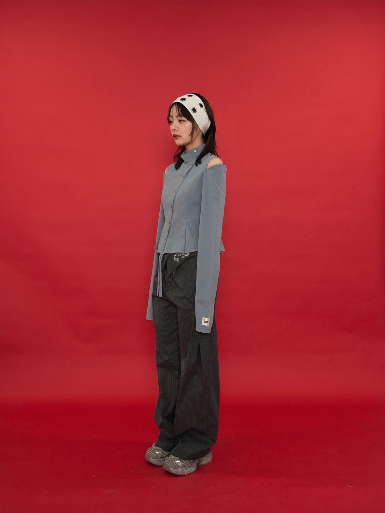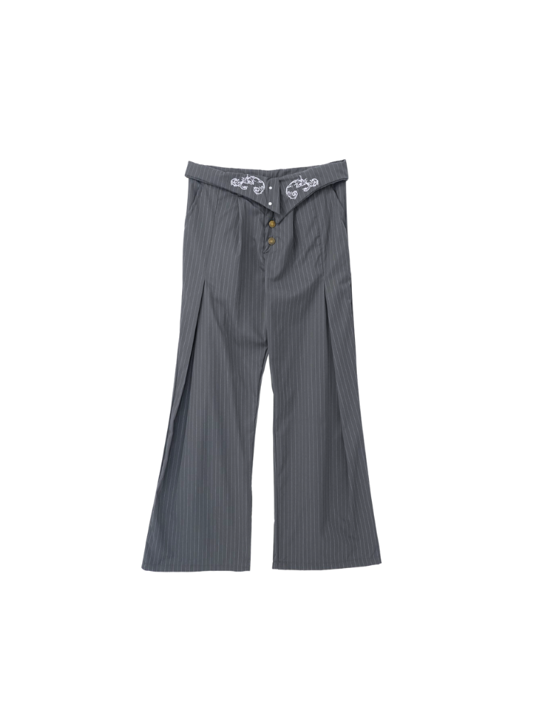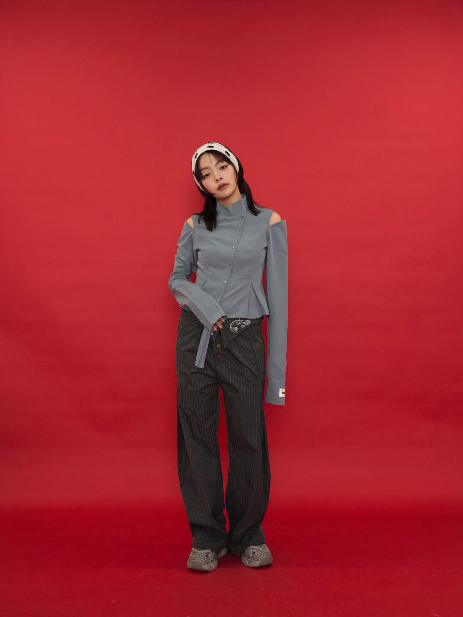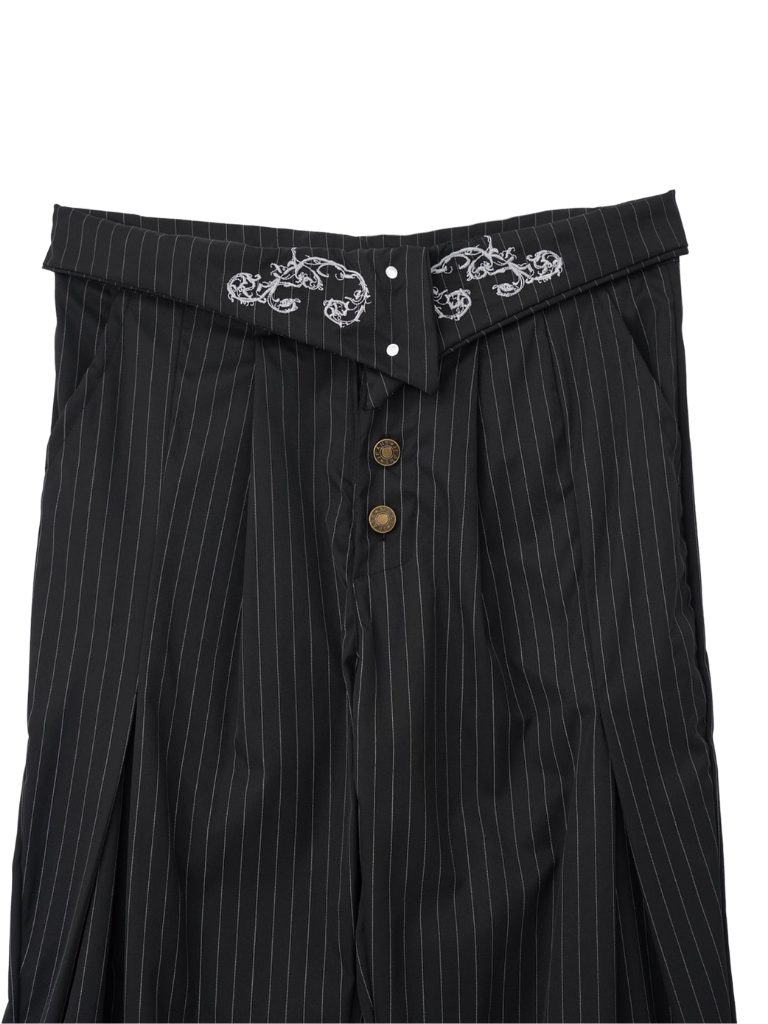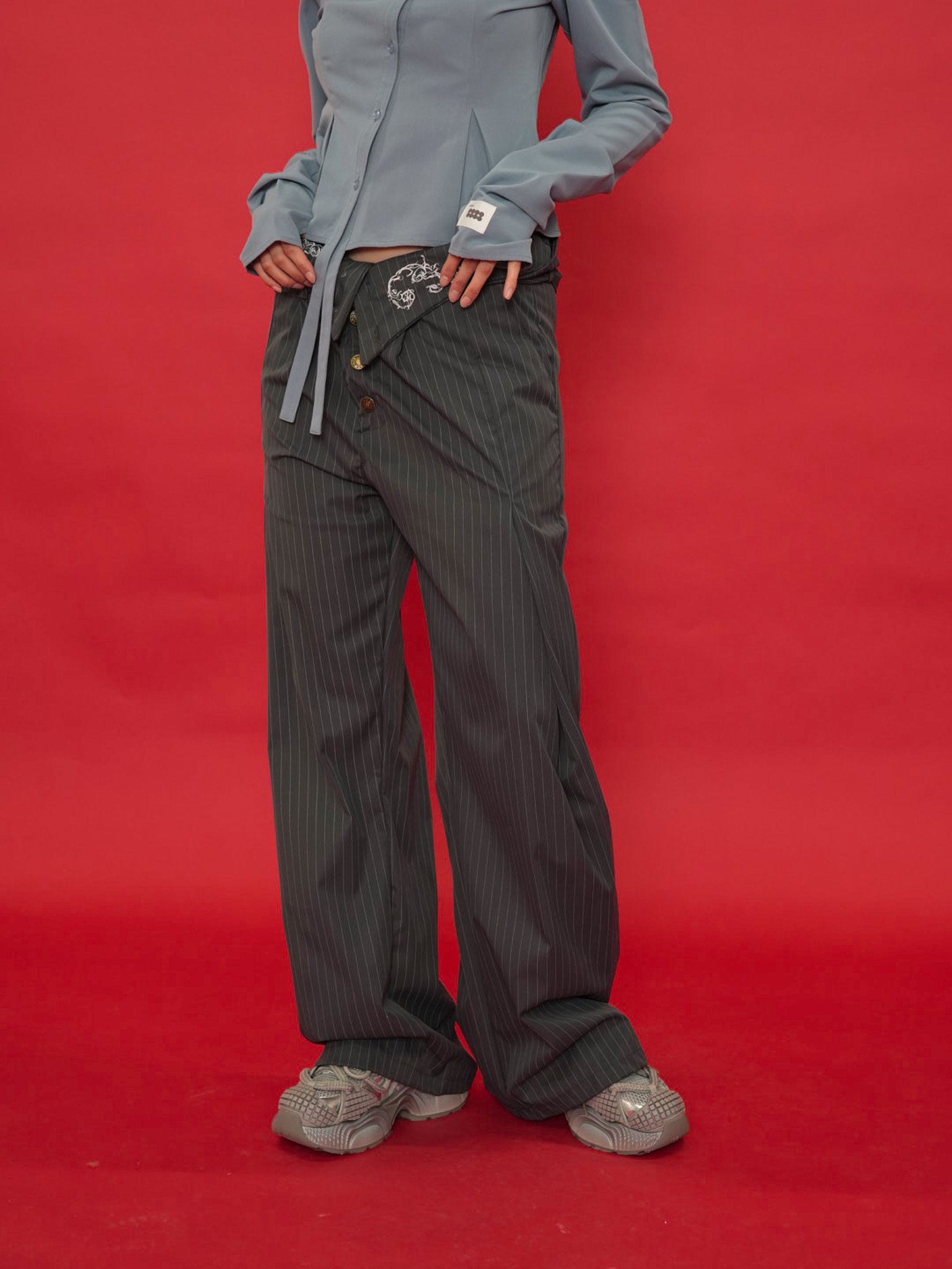 ボタンディテールが印象的なワイドシルエットパンツ。ウエストの留め方で表情が変わる2way仕様で、ハイウエストにもローライズにも着用可能。落ち感のある素材が動きを美しく見せ、スタイリングに程よい緊張感を与える一本。