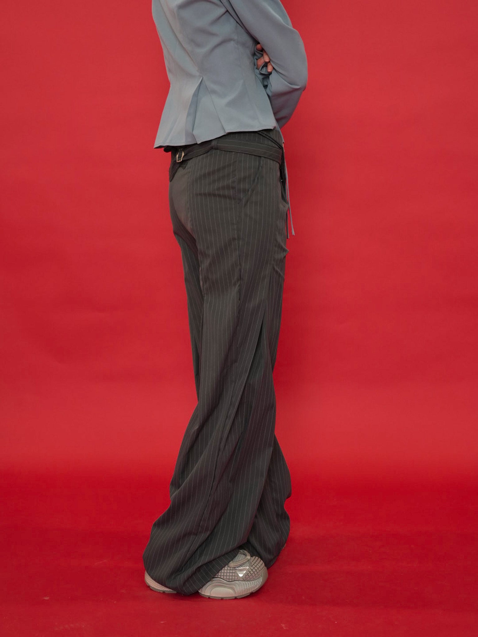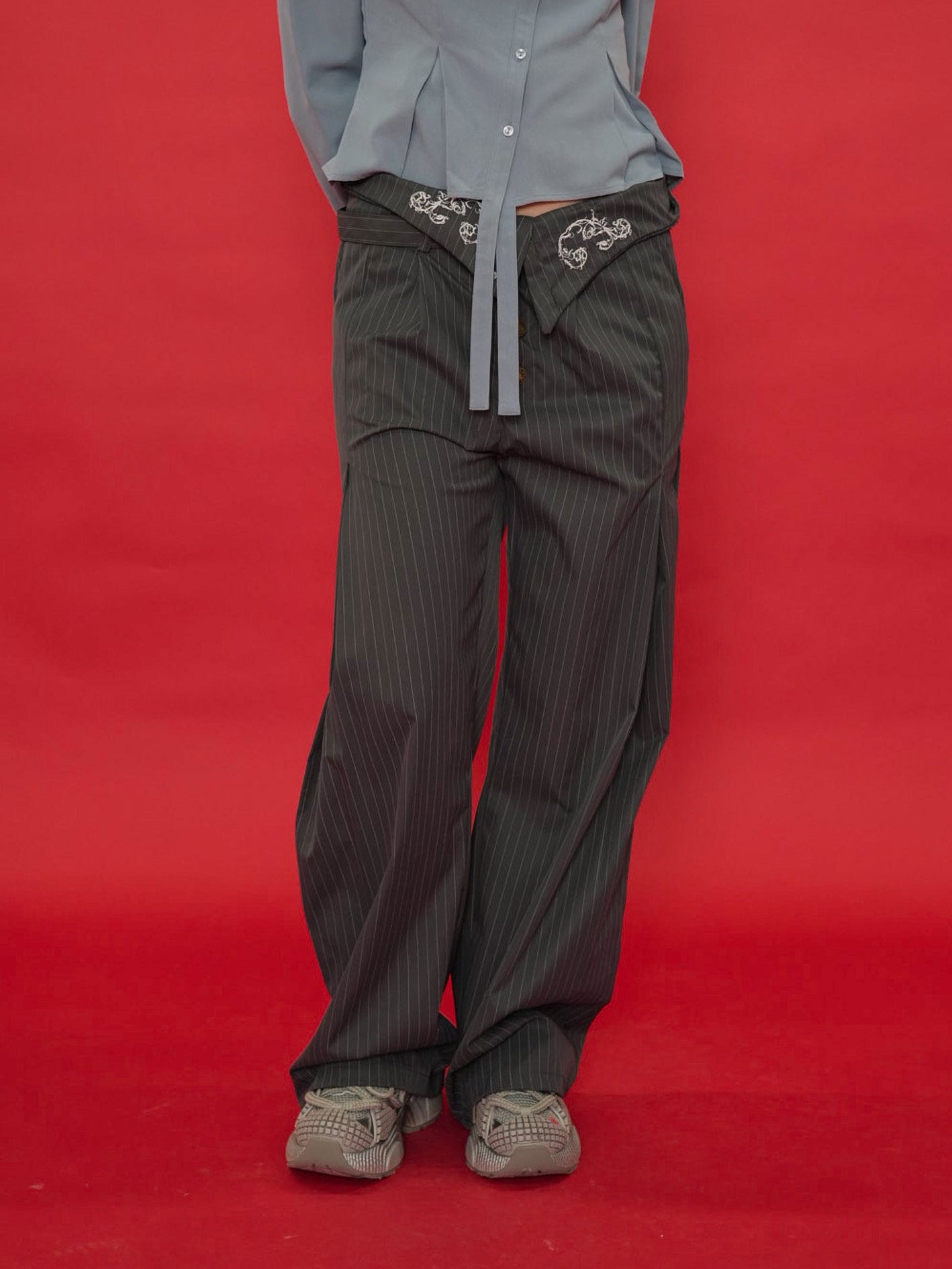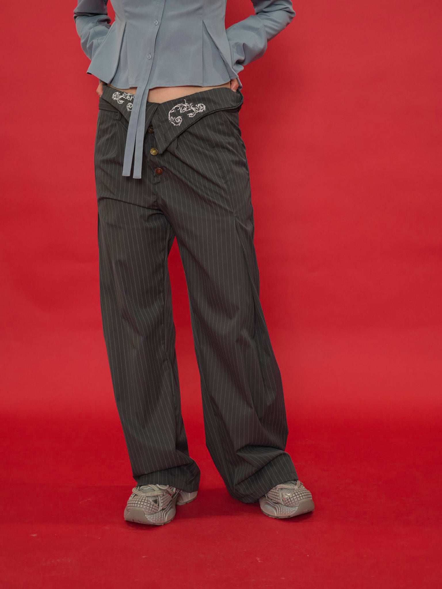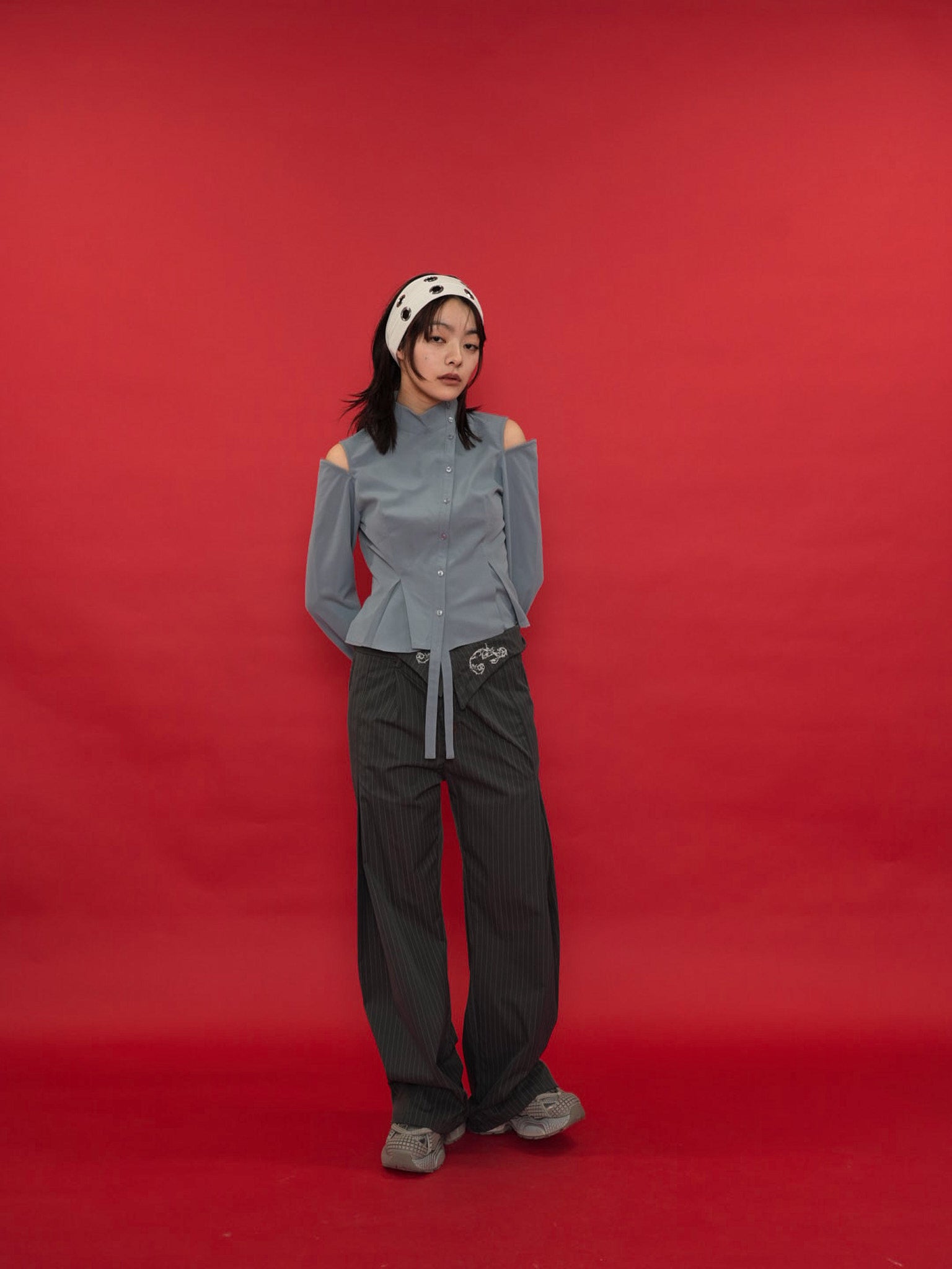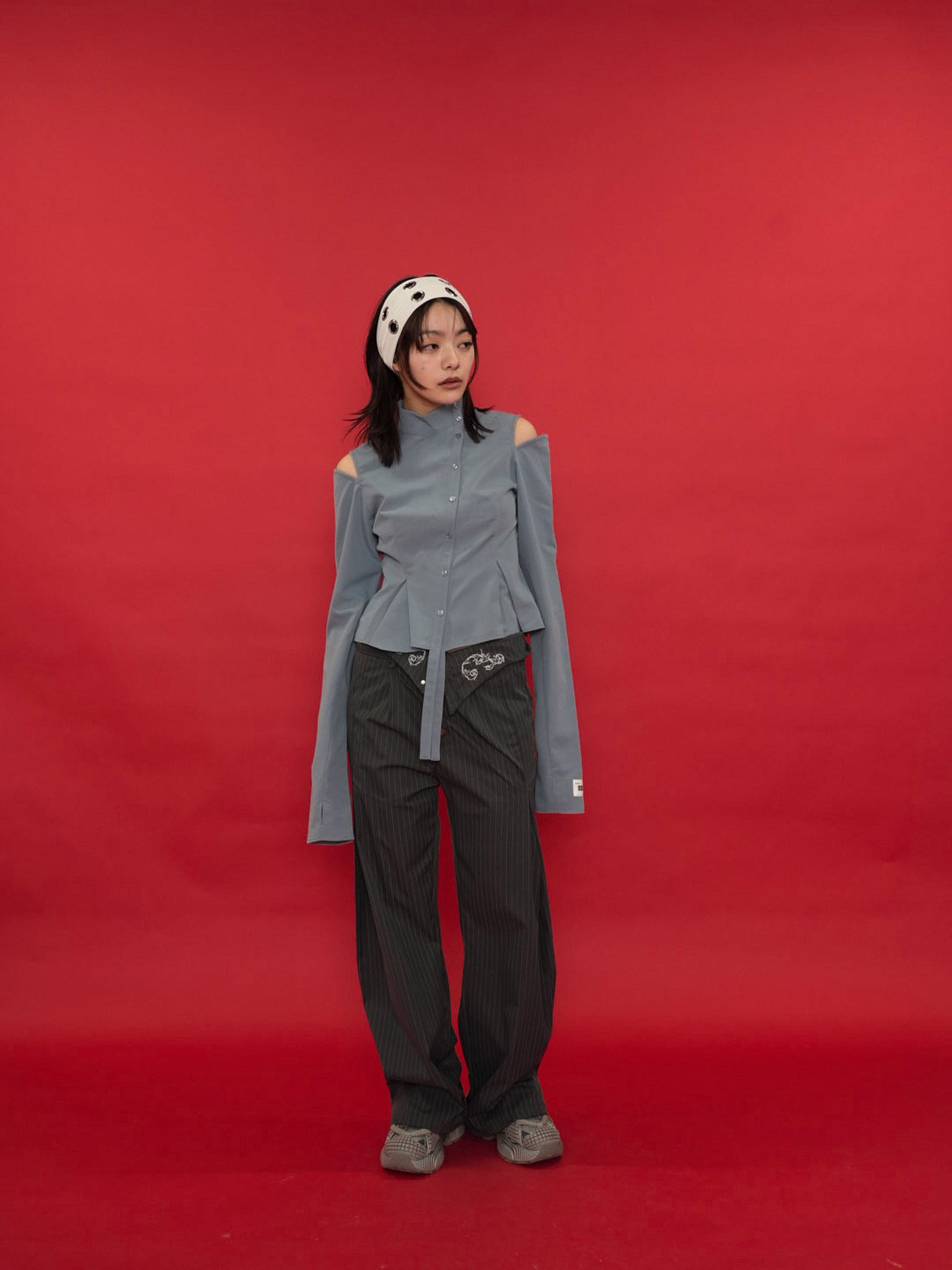 ボタンディテールが印象的なワイドシルエットパンツ。ウエストの留め方で表情が変わる2way仕様で、ハイウエストにもローライズにも着用可能。落ち感のある素材が動きを美しく見せ、スタイリングに程よい緊張感を与える一本。