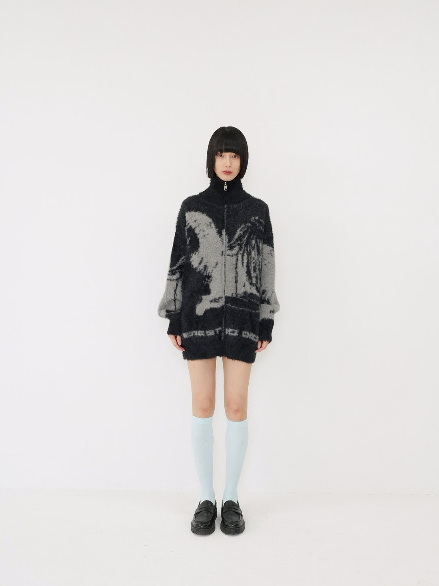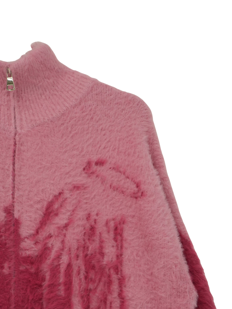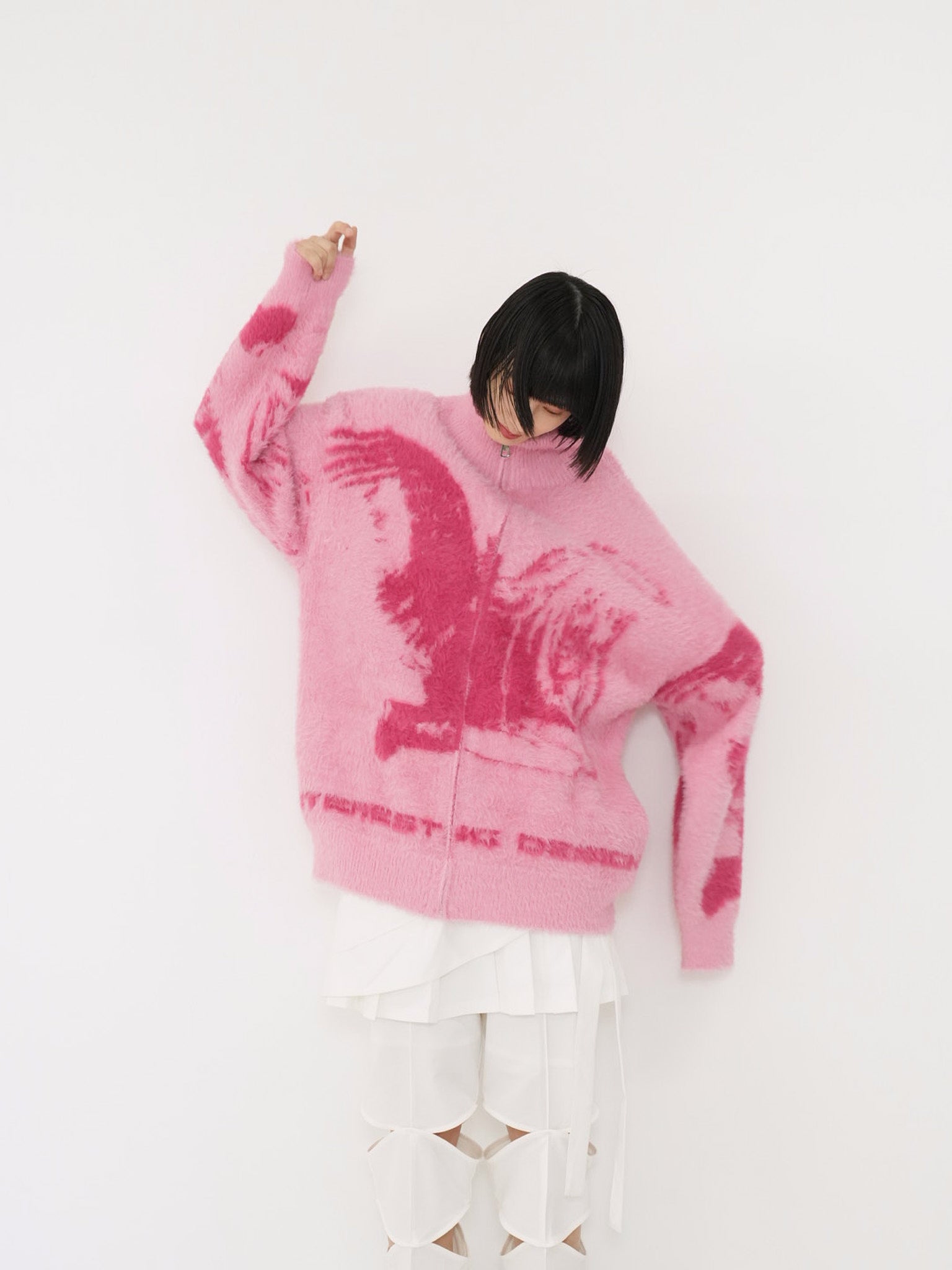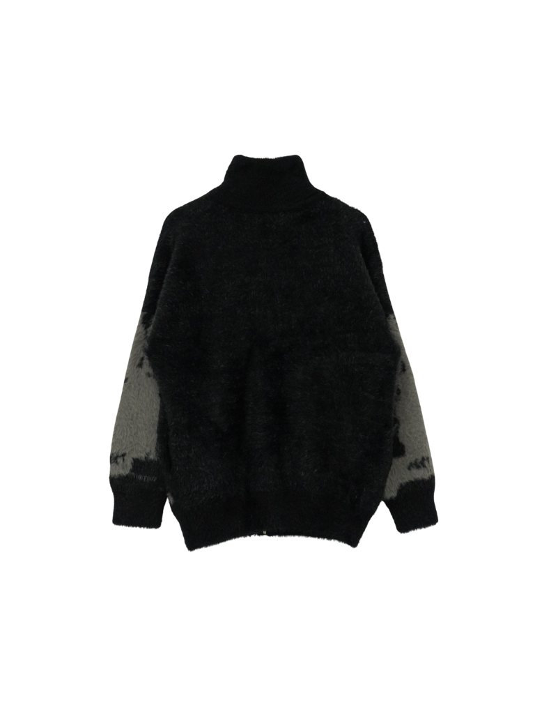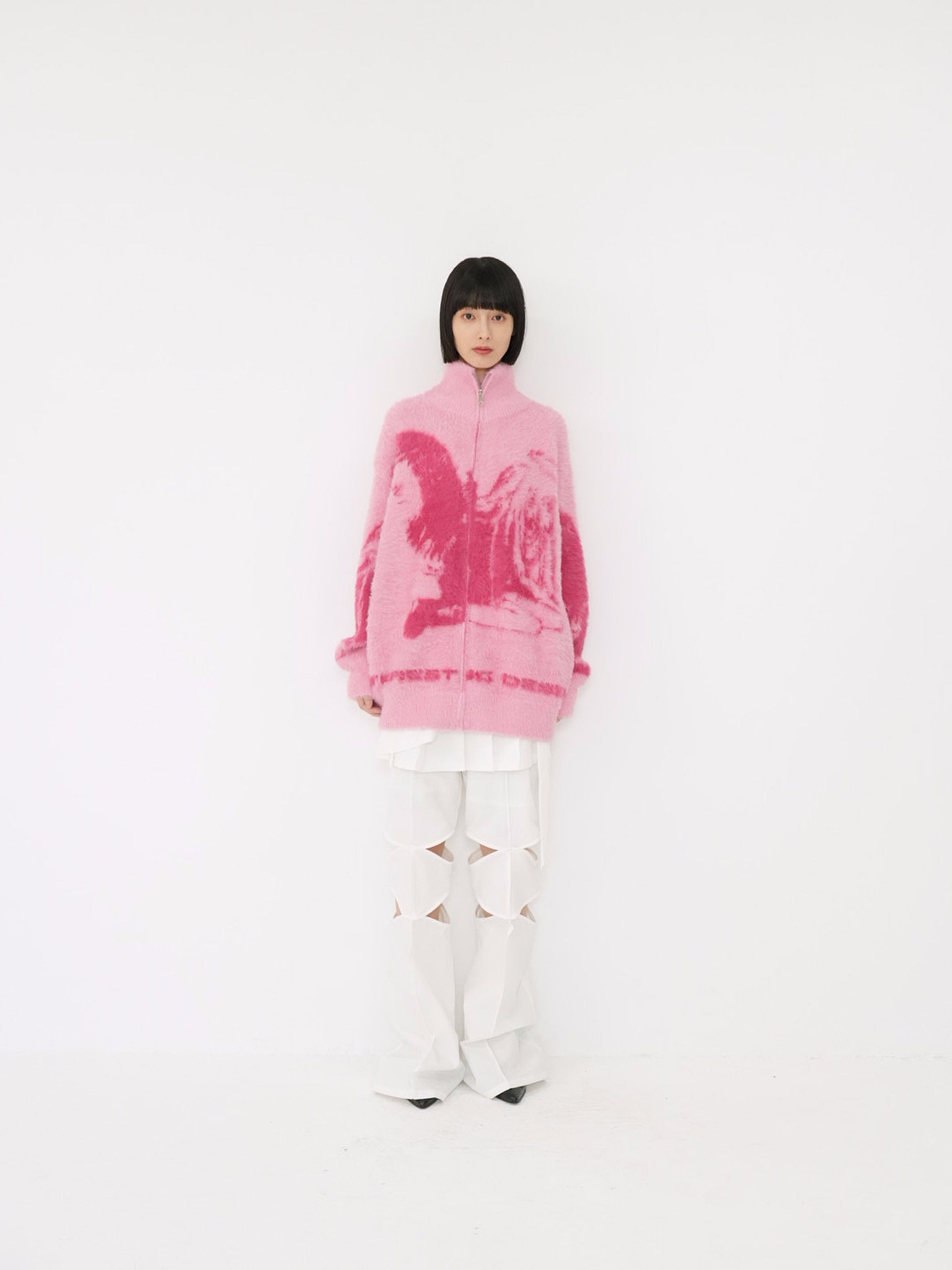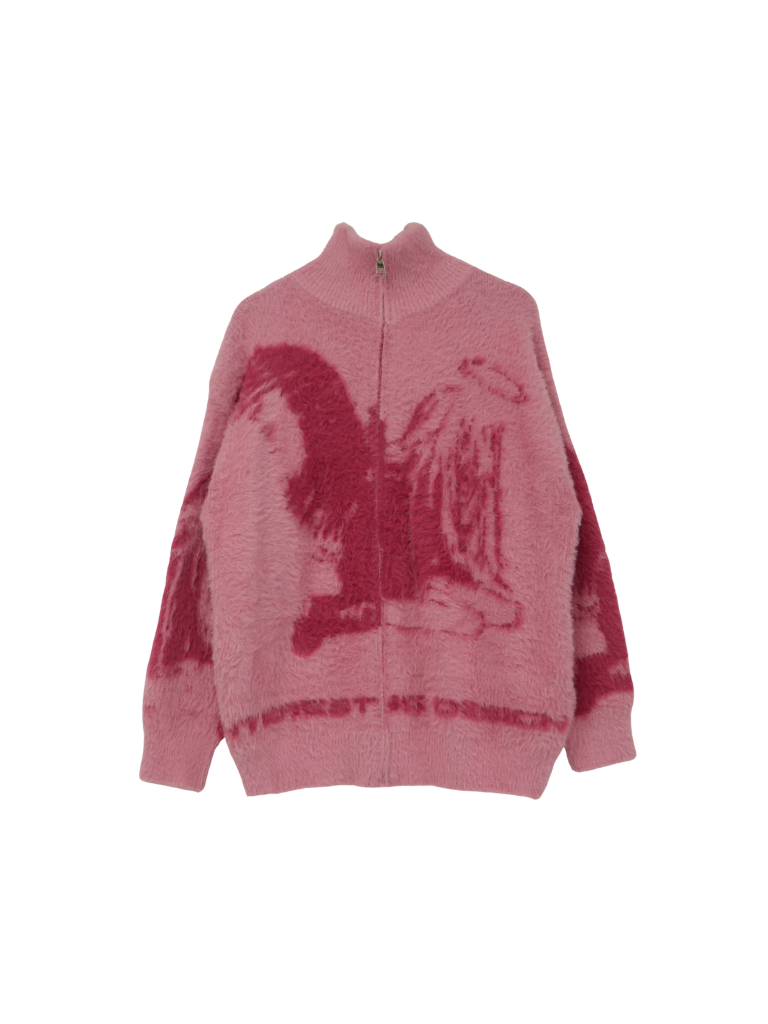 天使モチーフを大胆に編み込んだフルジップニット。