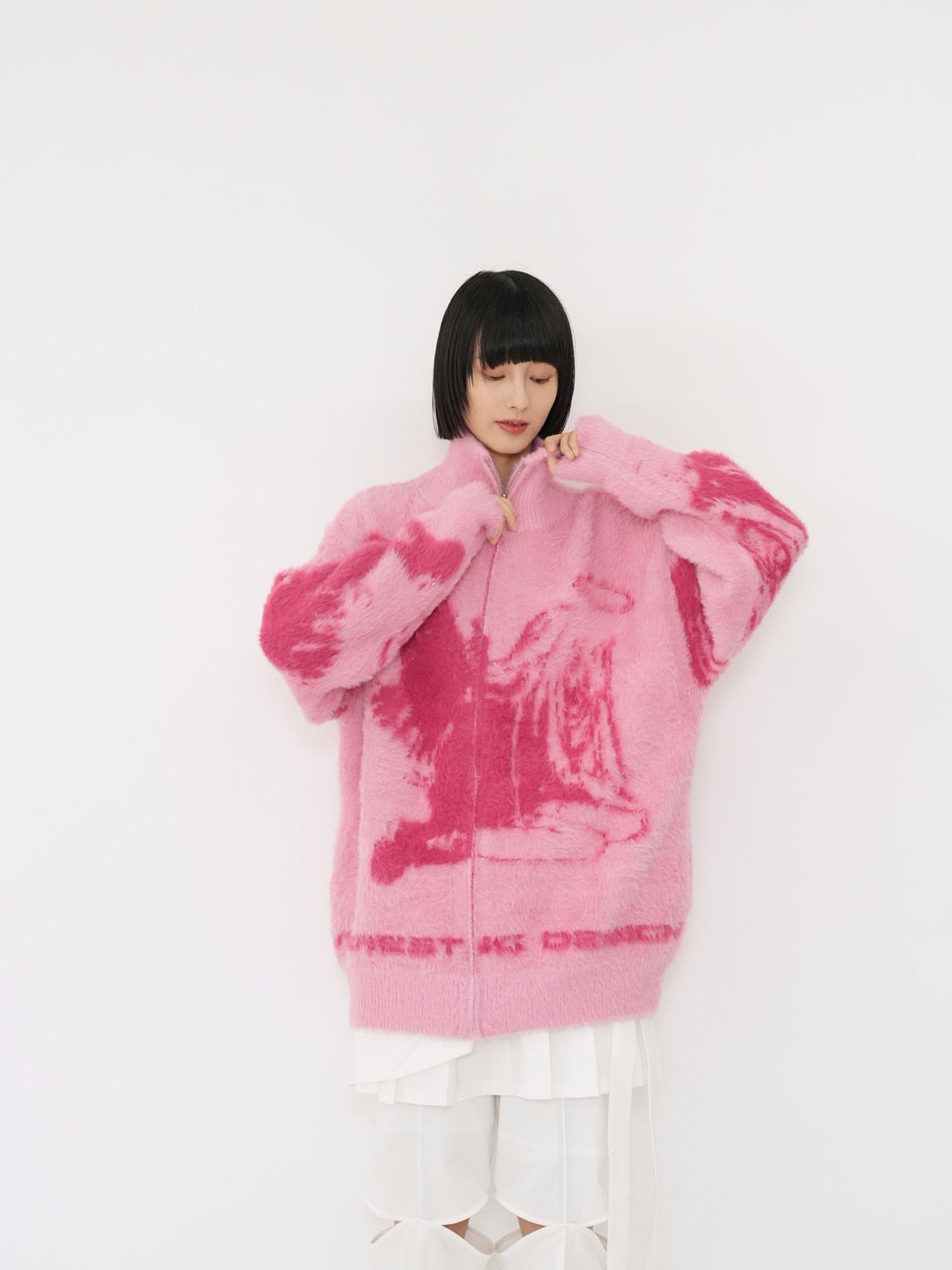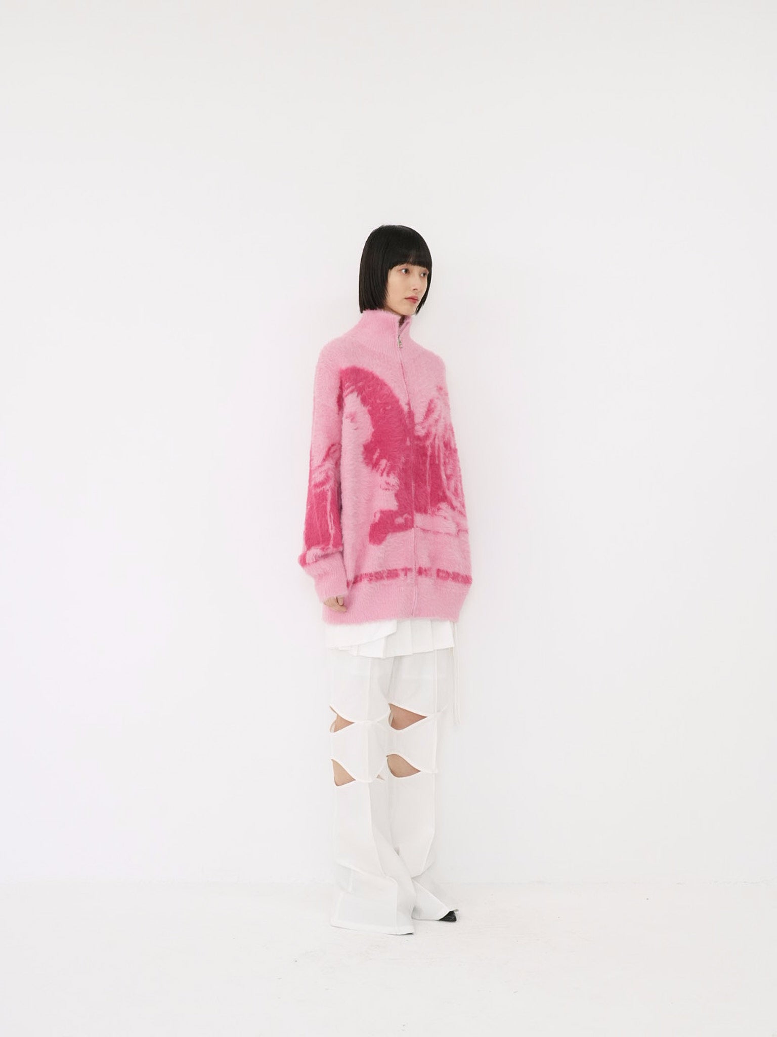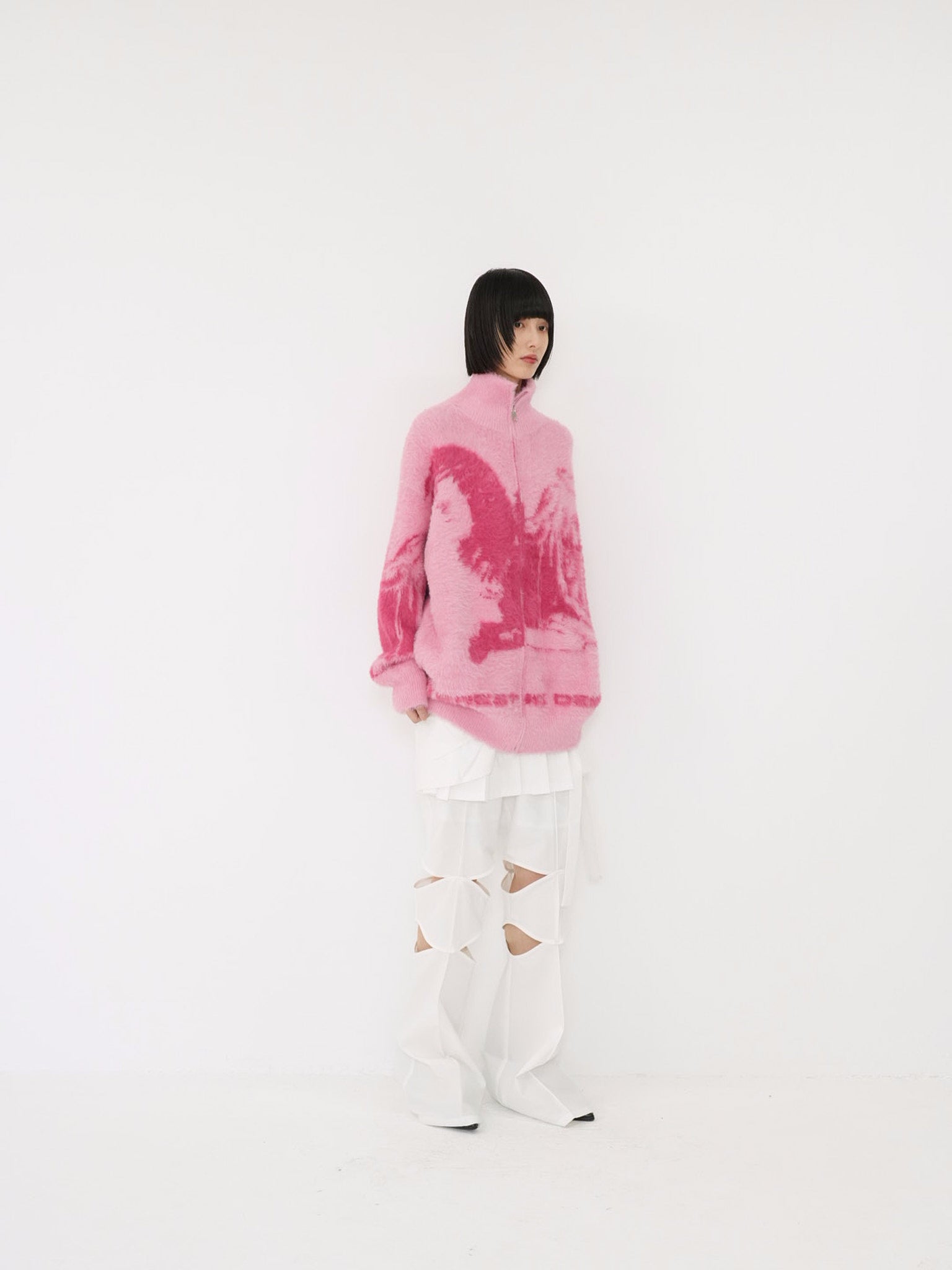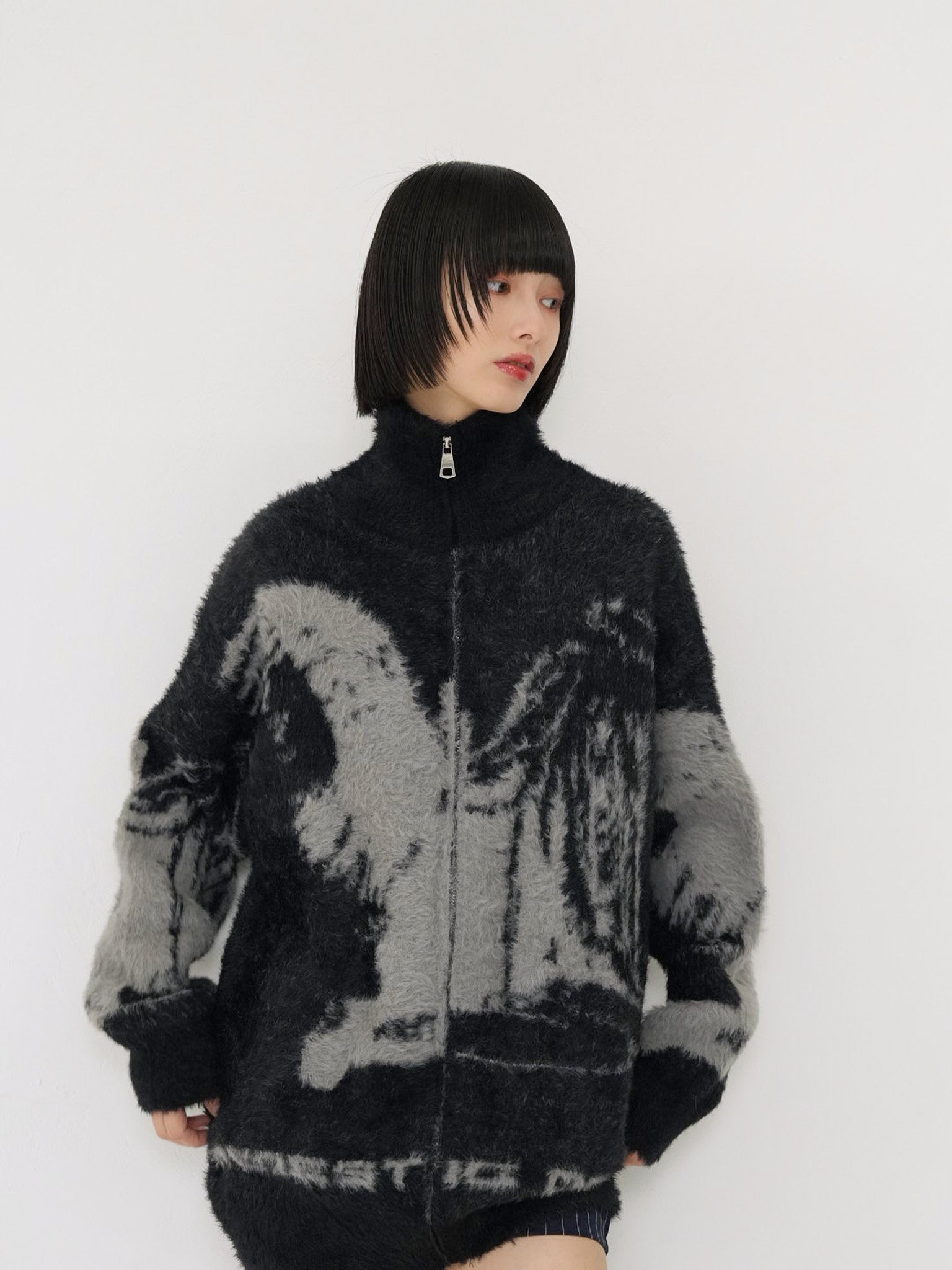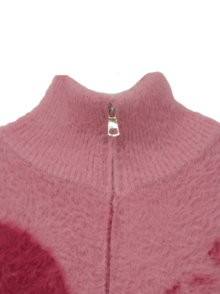 天使モチーフを大胆に編み込んだフルジップニット。