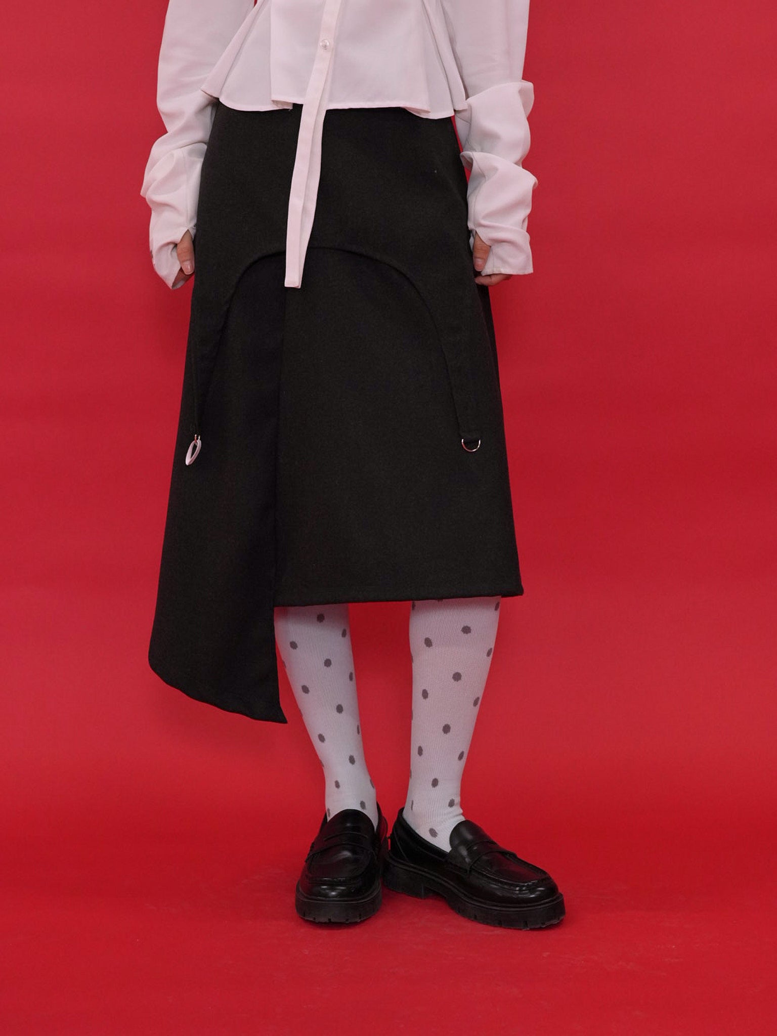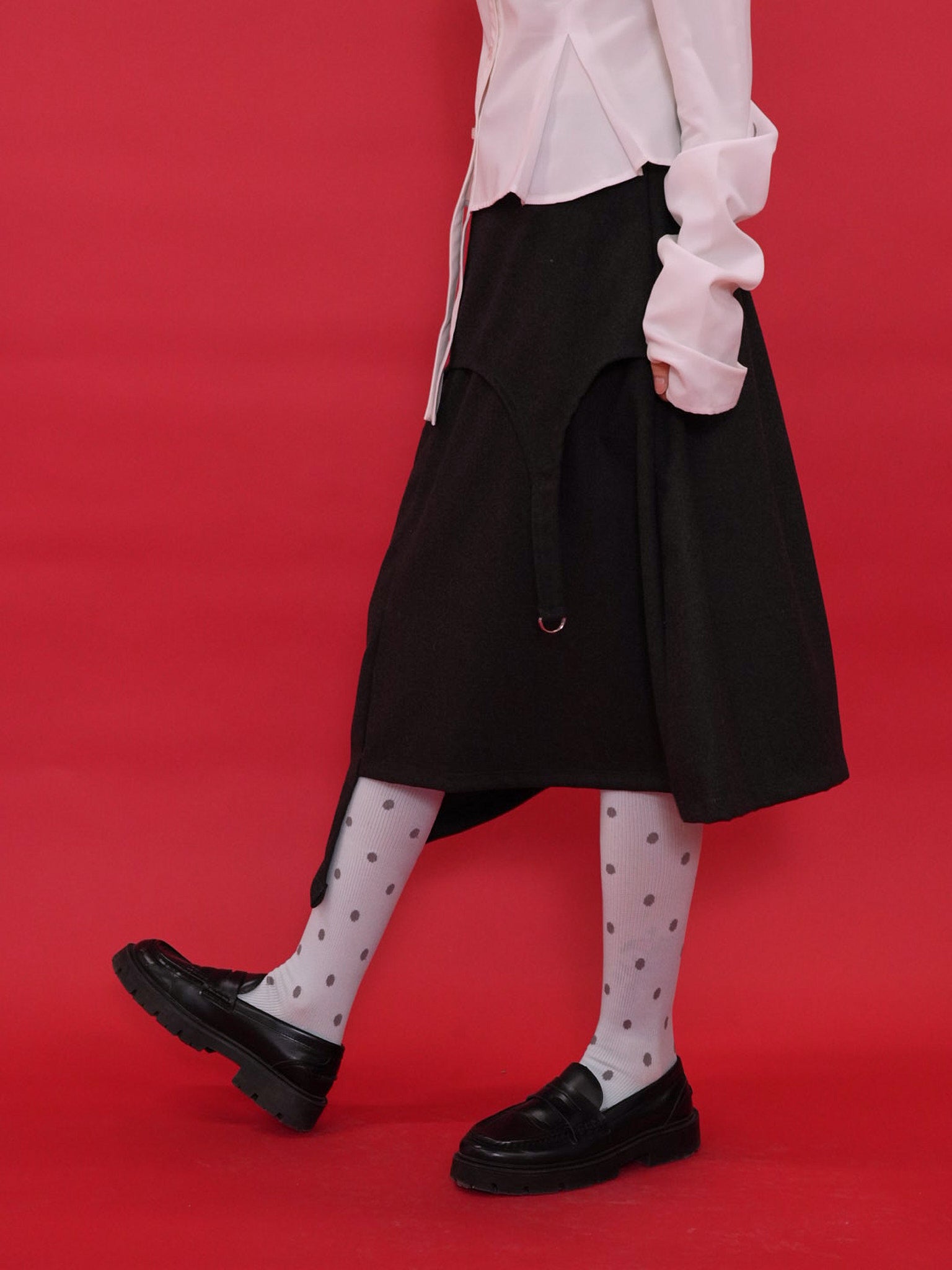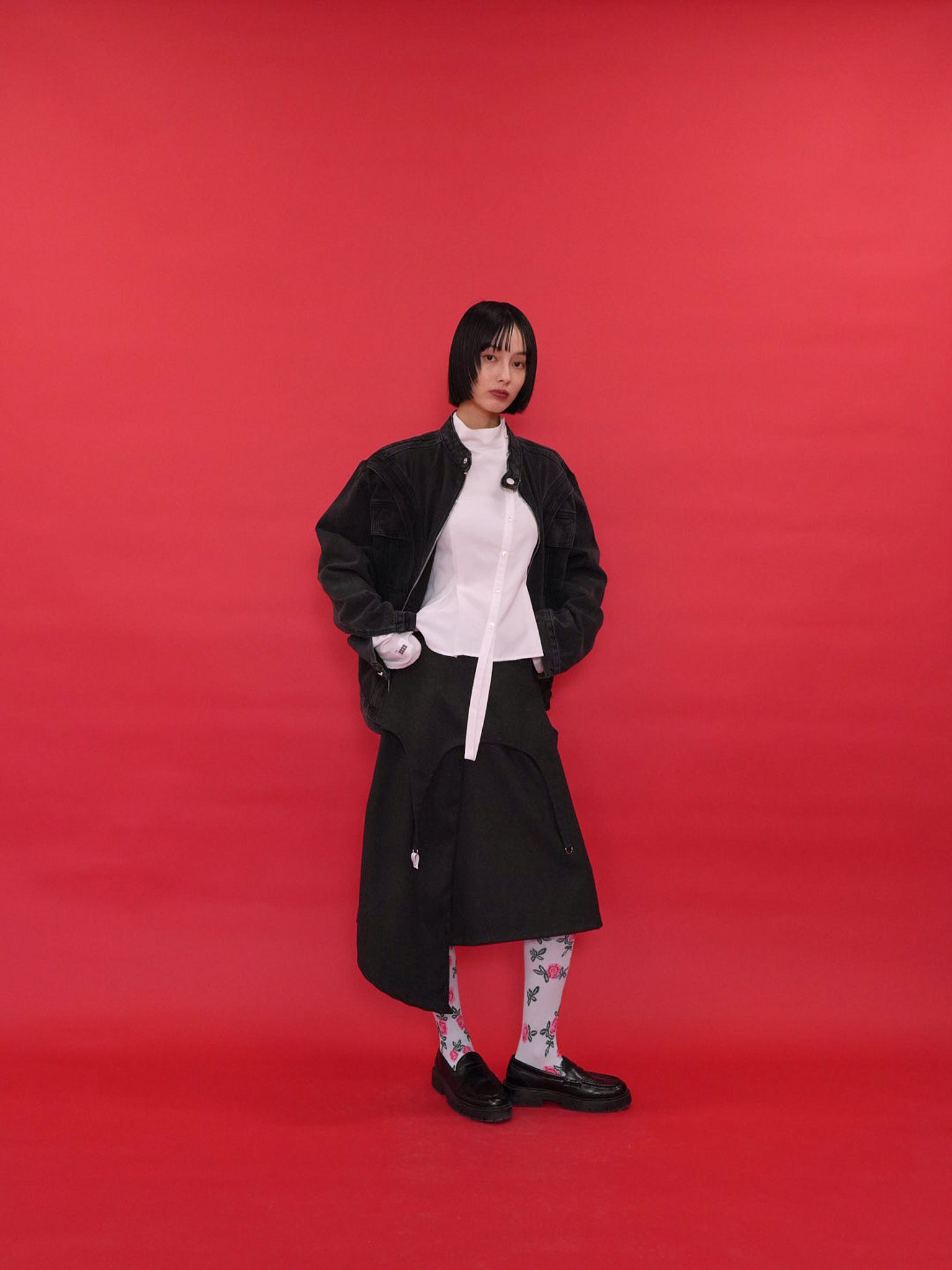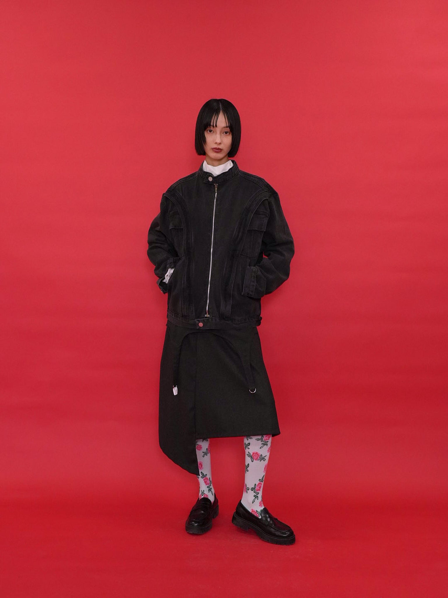シンプルなトップスを合わせるだけでモード感を引き上げます。
