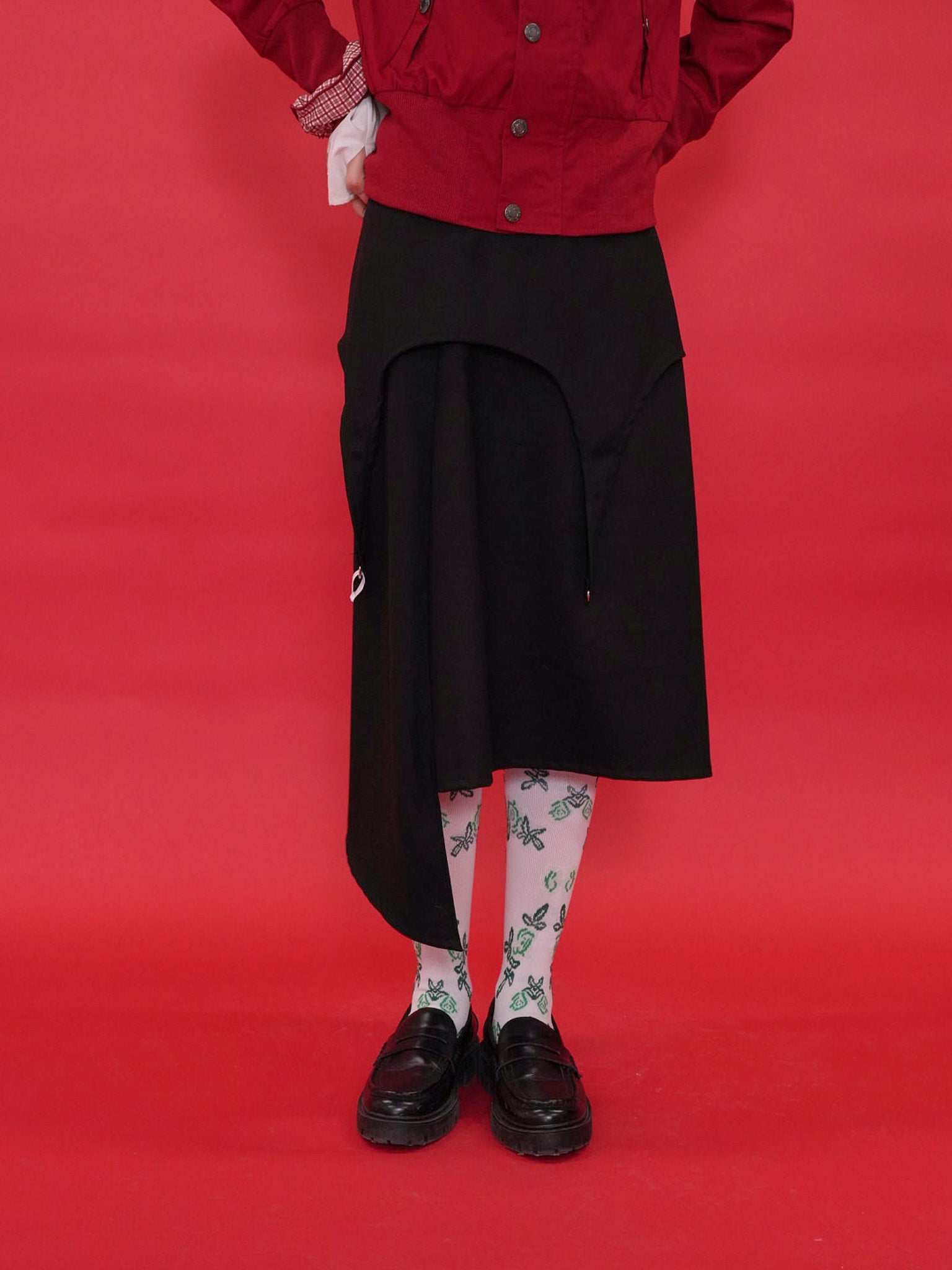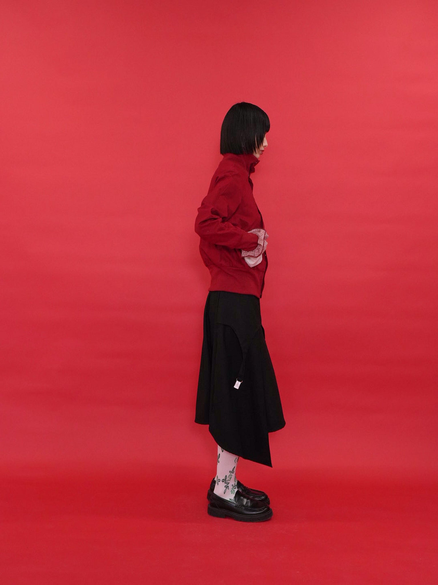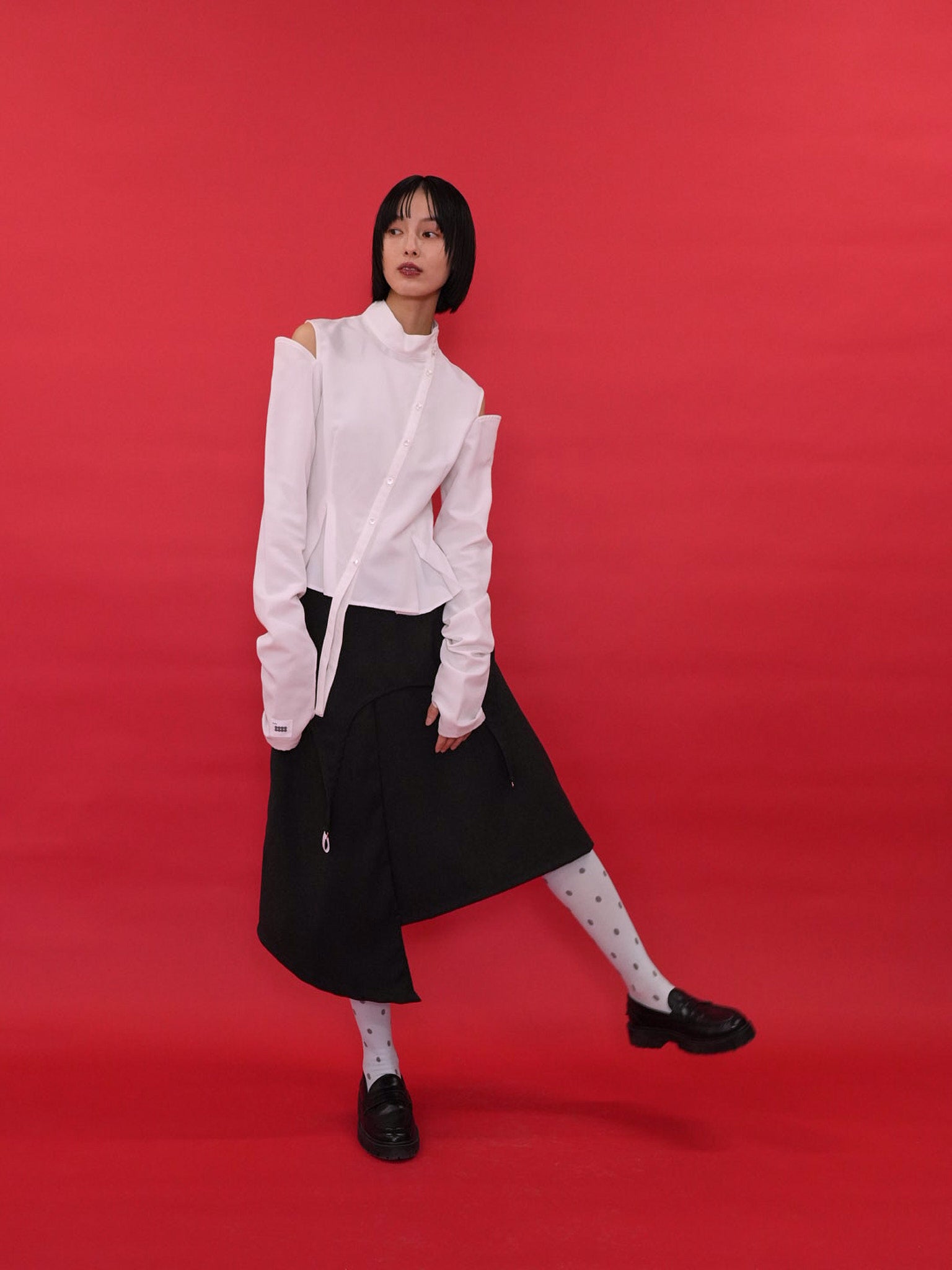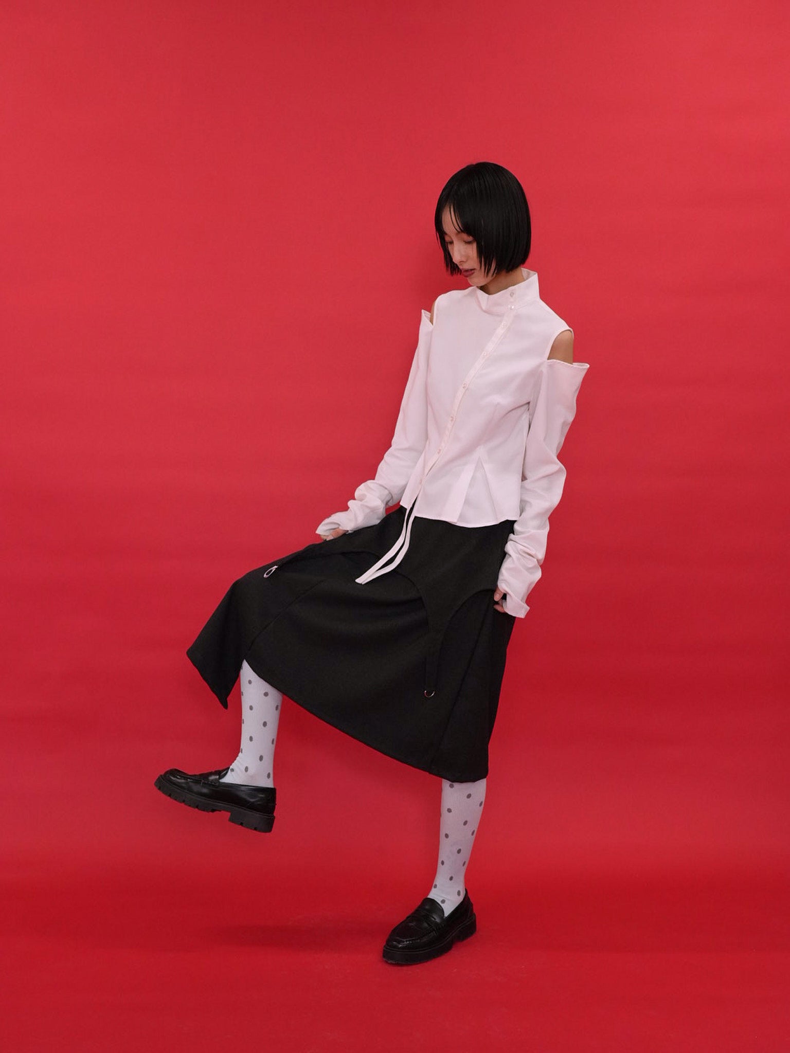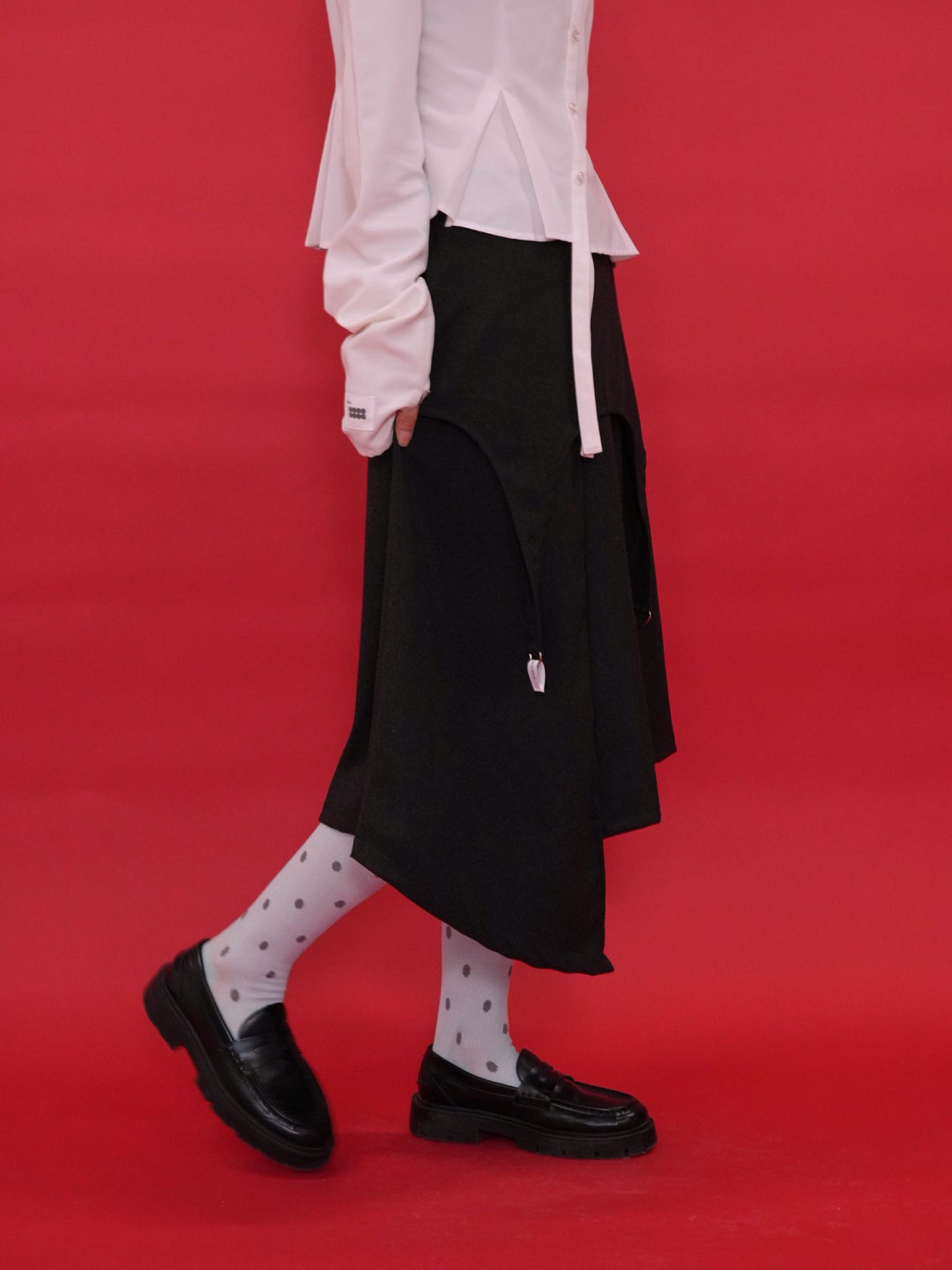 シンプルなトップスを合わせるだけでモード感を引き上げます。