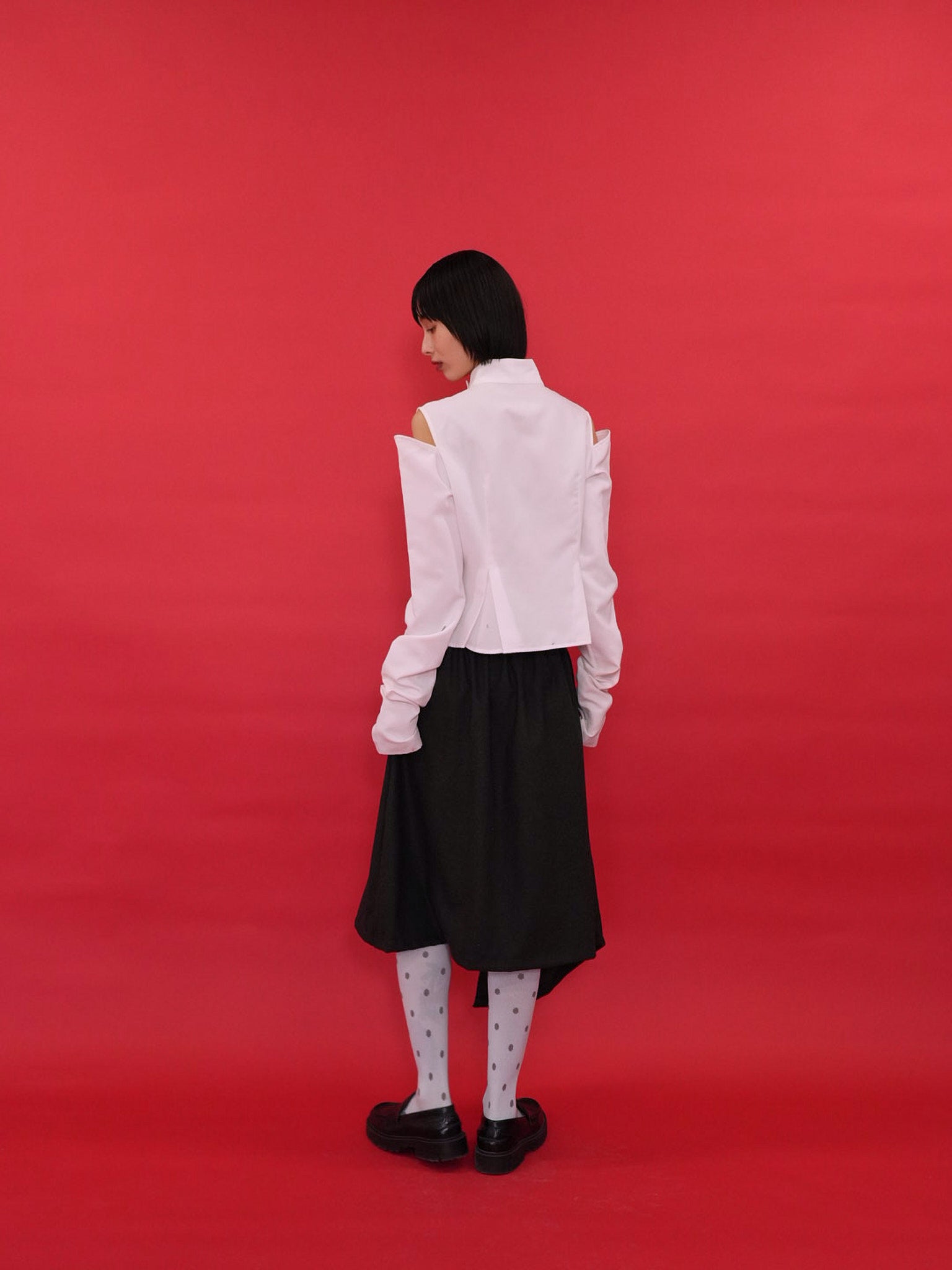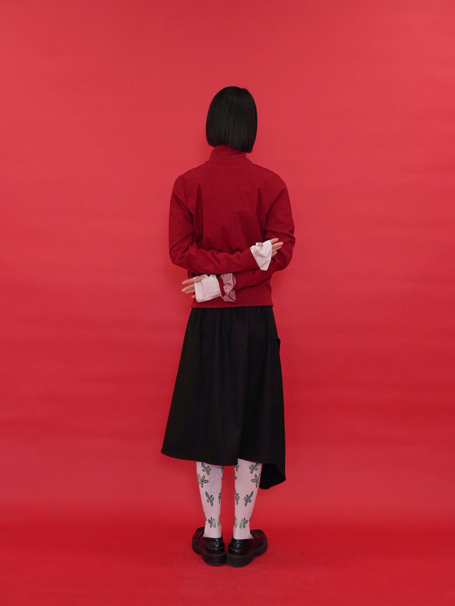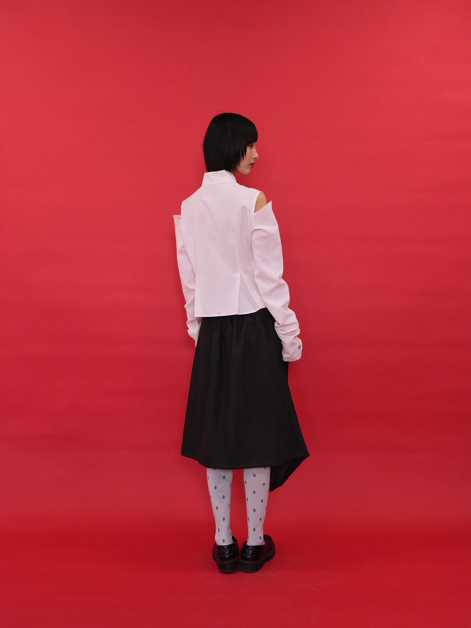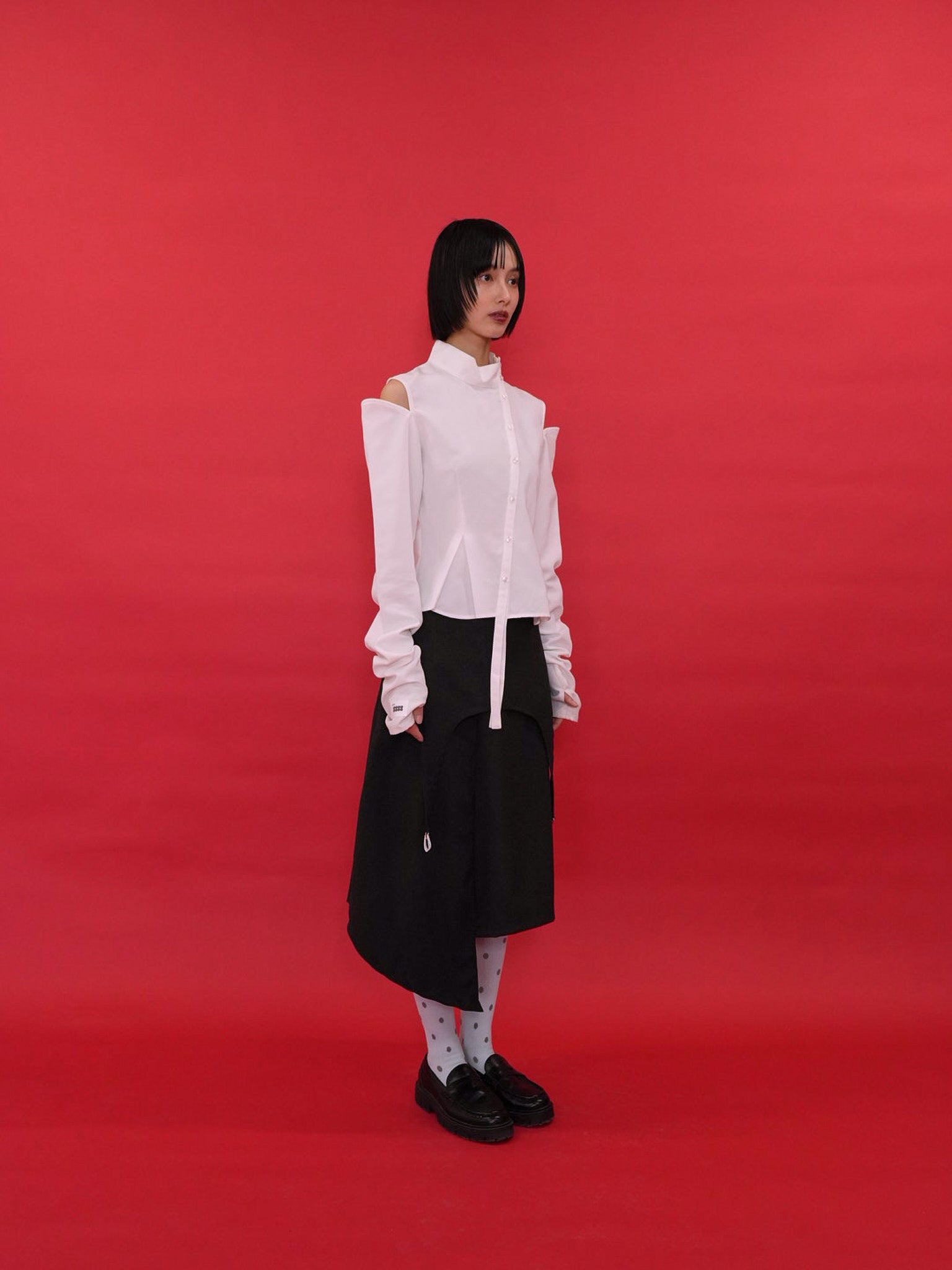 シンプルなトップスを合わせるだけでモード感を引き上げます。