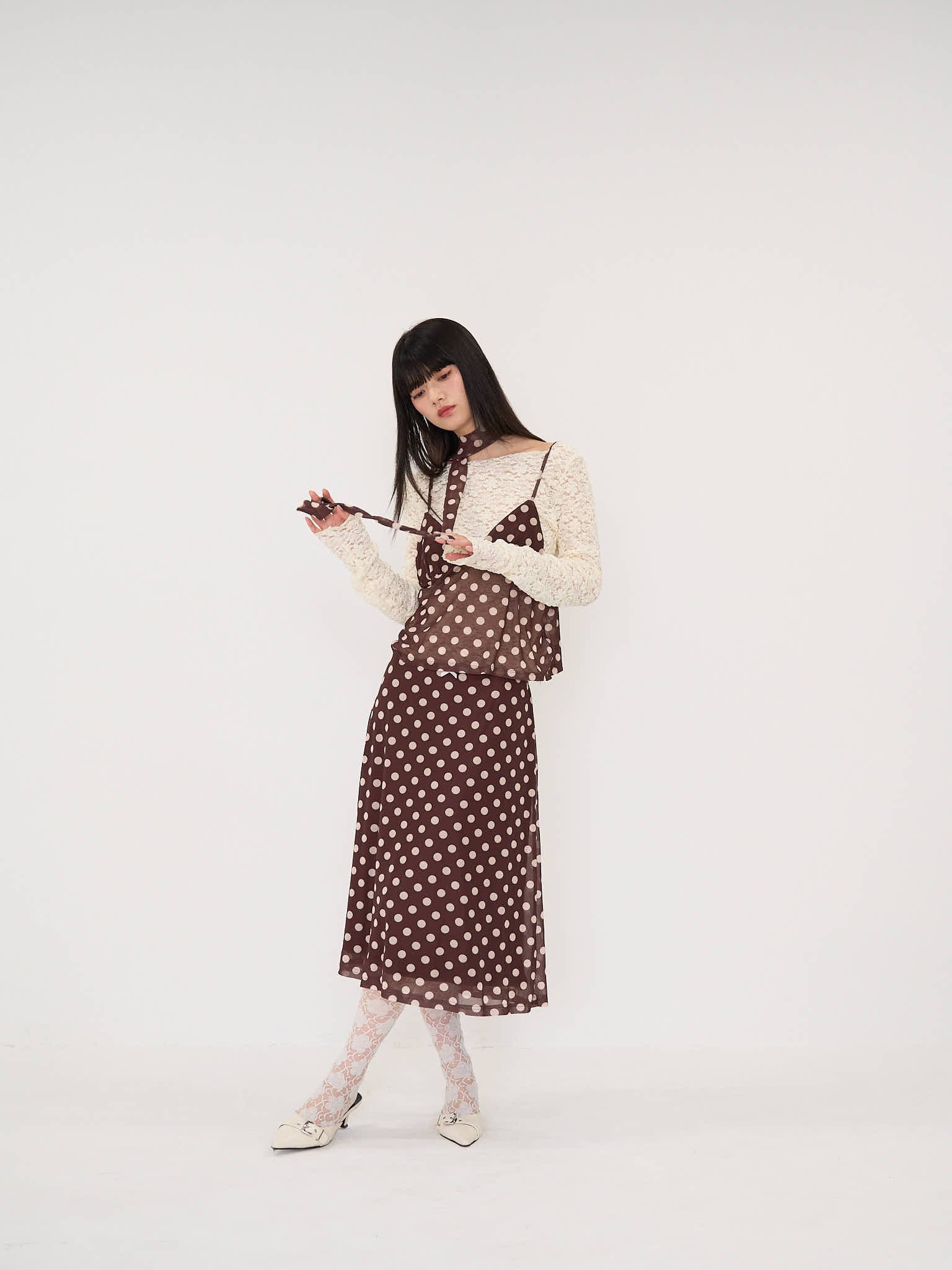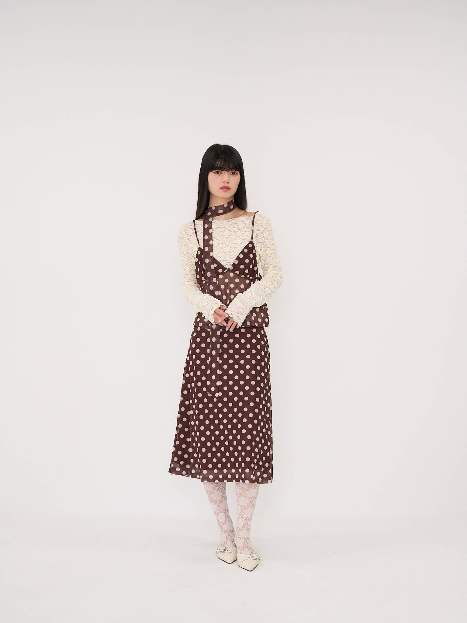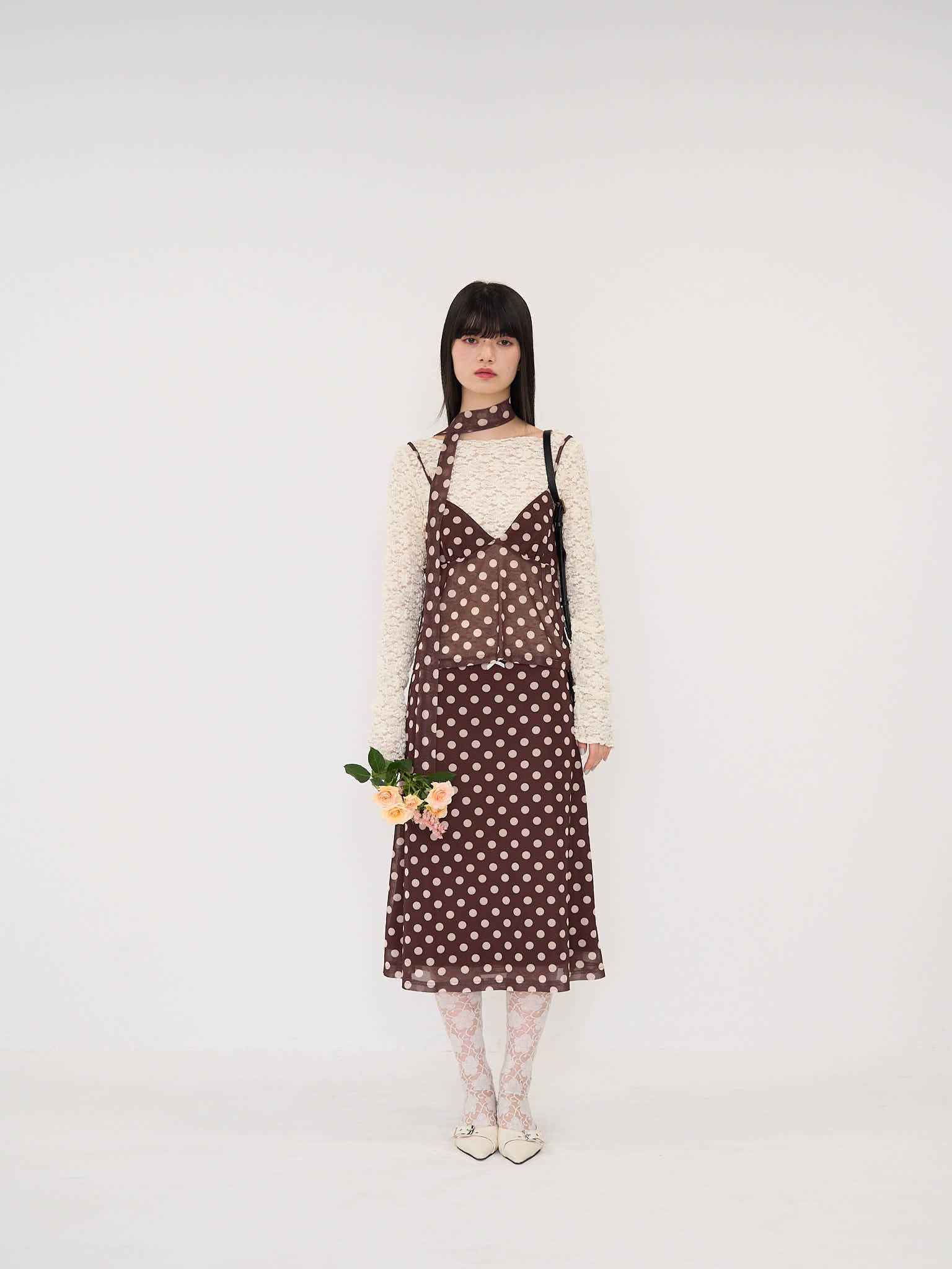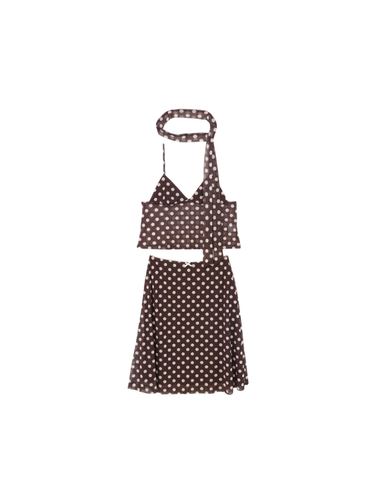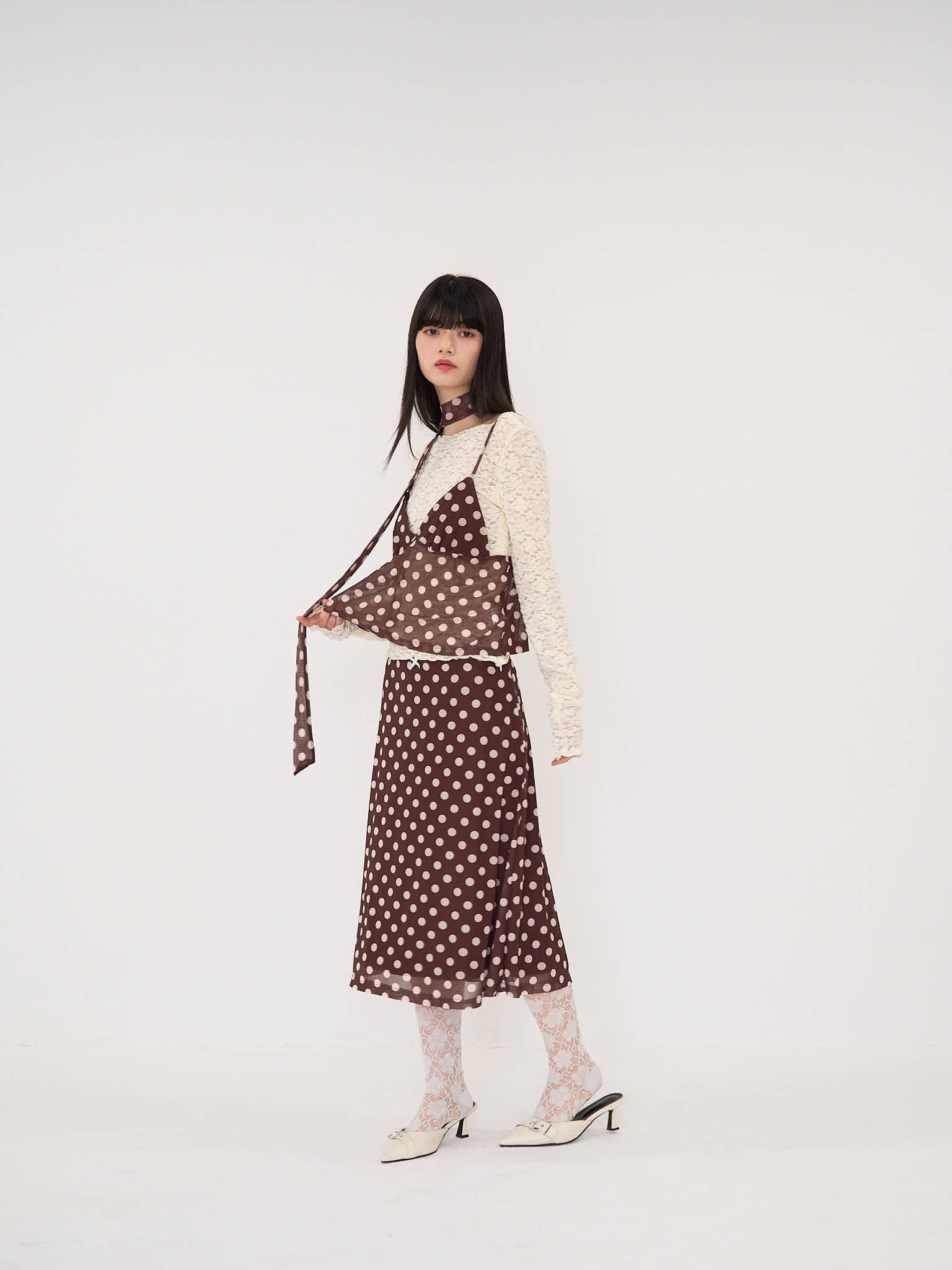 ドット柄が印象的なセパレートセット。トップスは胸元のカットデザインと細ストラップがアクセントになり、程よい抜け感を演出。スカートはすっきりとしたシルエットでバランスよく着こなせるデザイン。セットアップとしてはもちろん、それぞれ単体でもコーディネートしやすい一着。