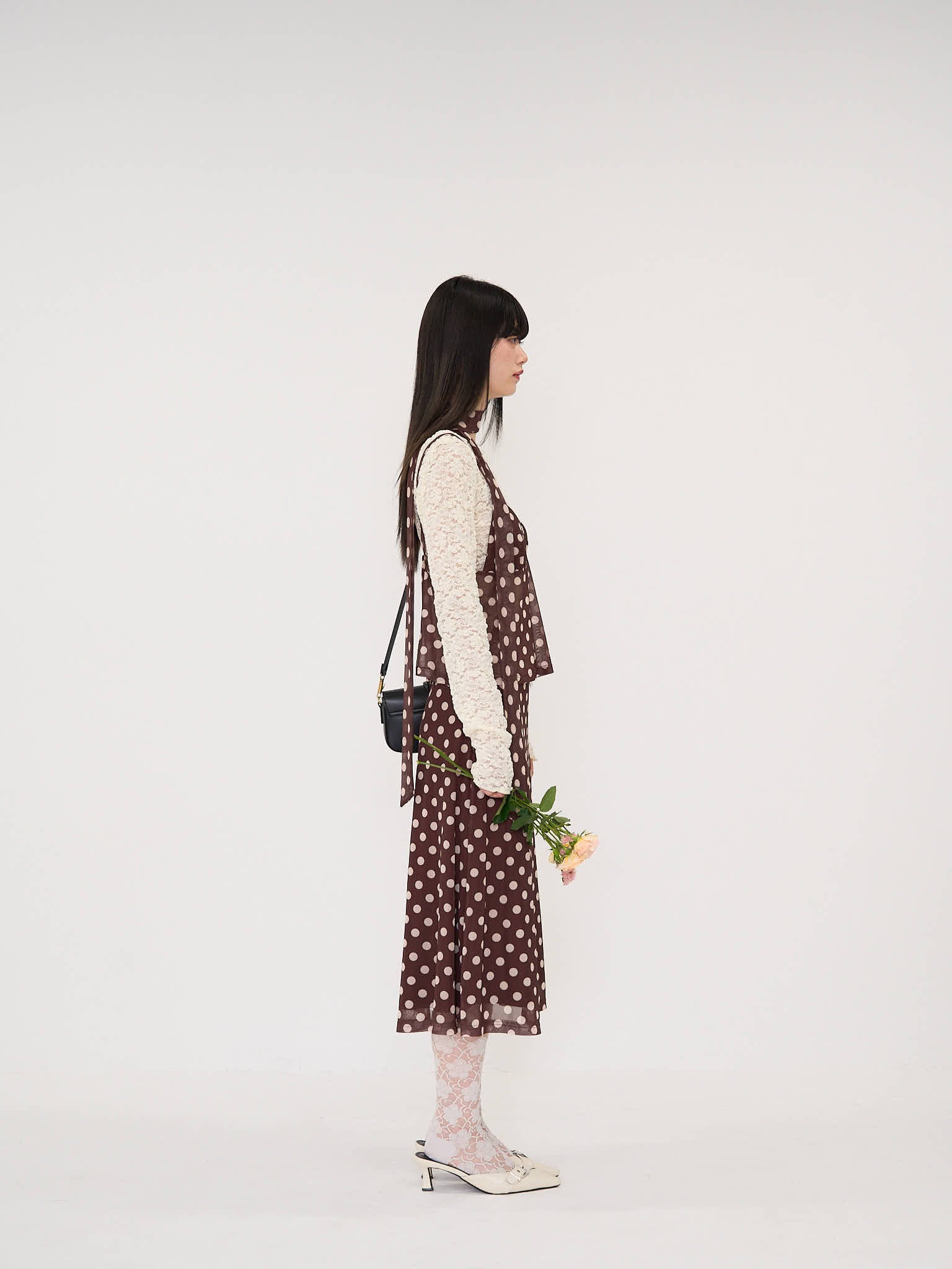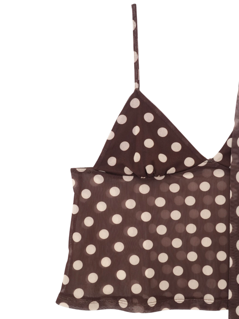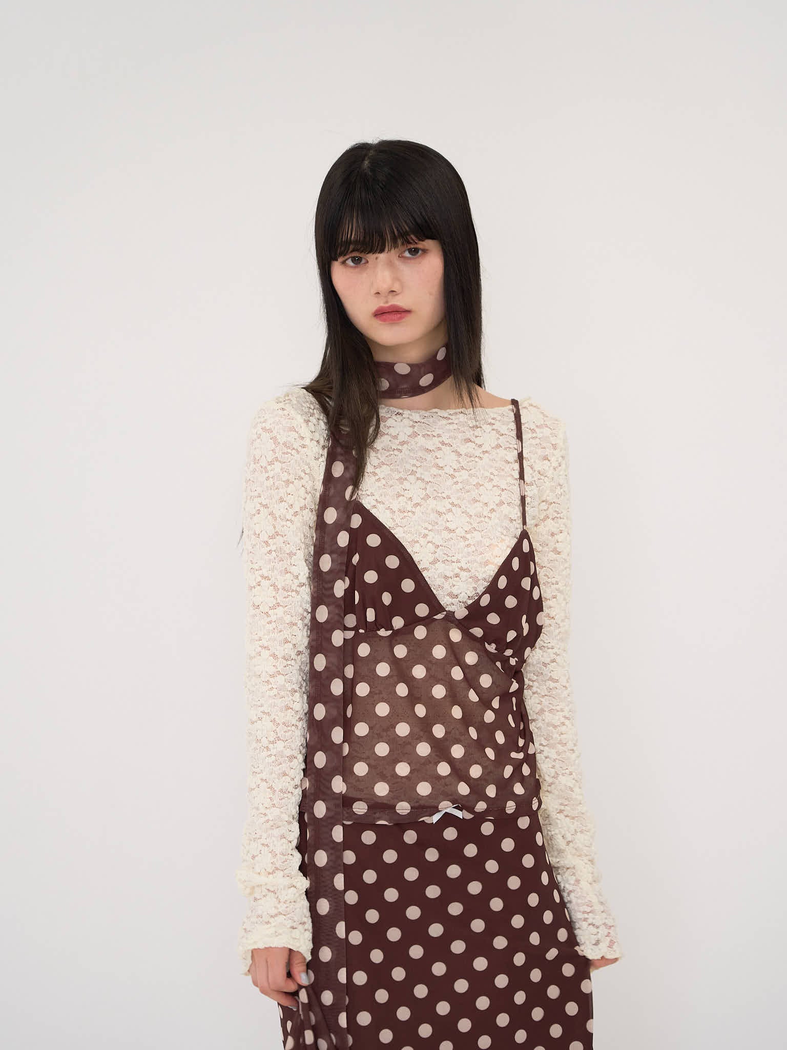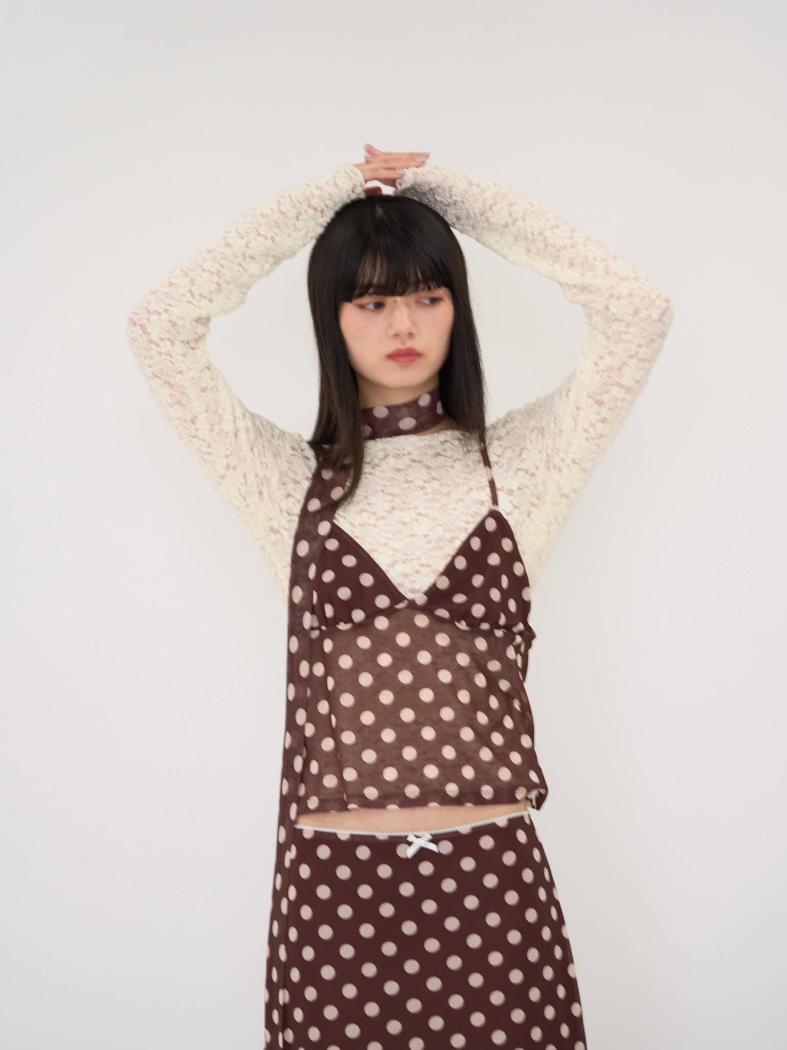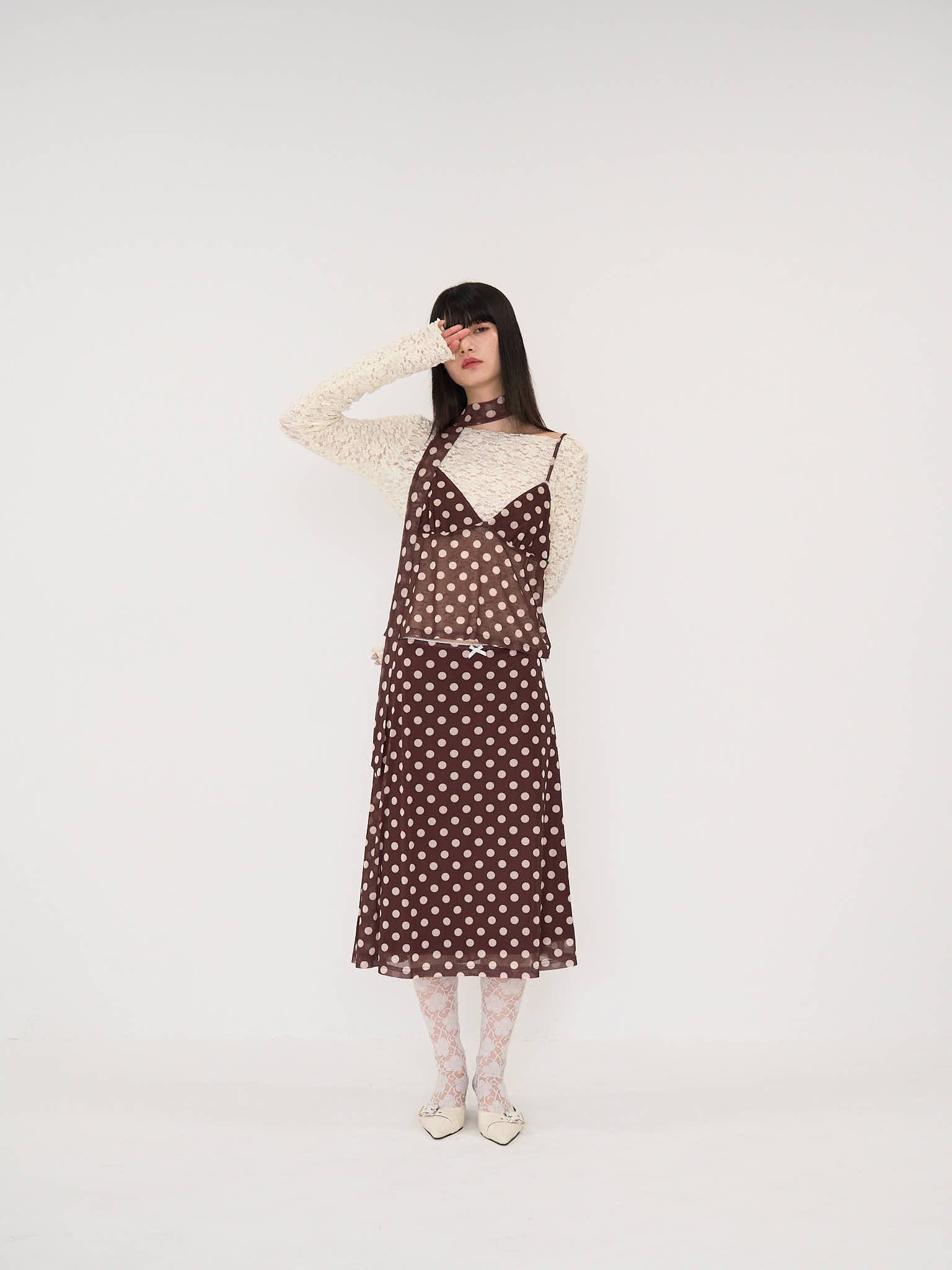 ドット柄が印象的なセパレートセット。トップスは胸元のカットデザインと細ストラップがアクセントになり、程よい抜け感を演出。スカートはすっきりとしたシルエットでバランスよく着こなせるデザイン。セットアップとしてはもちろん、それぞれ単体でもコーディネートしやすい一着。