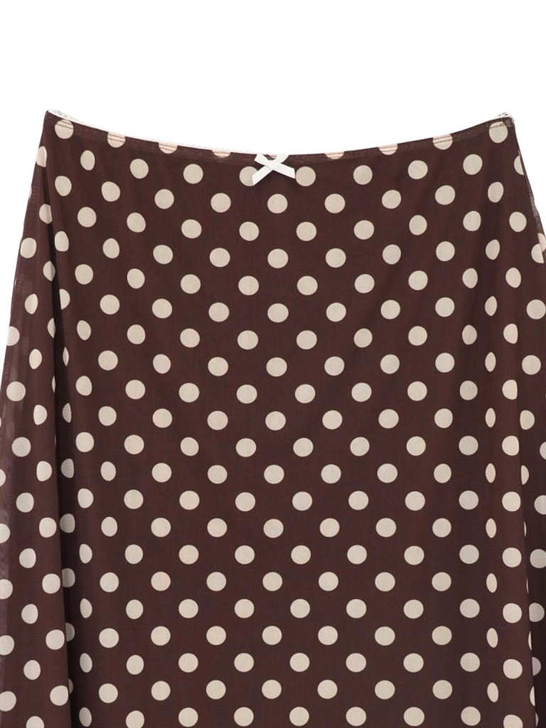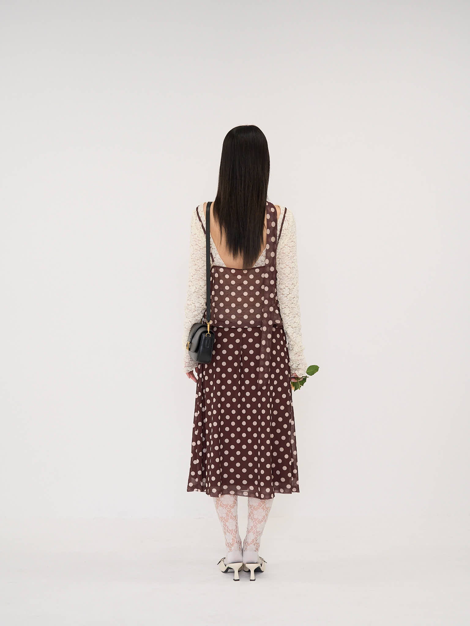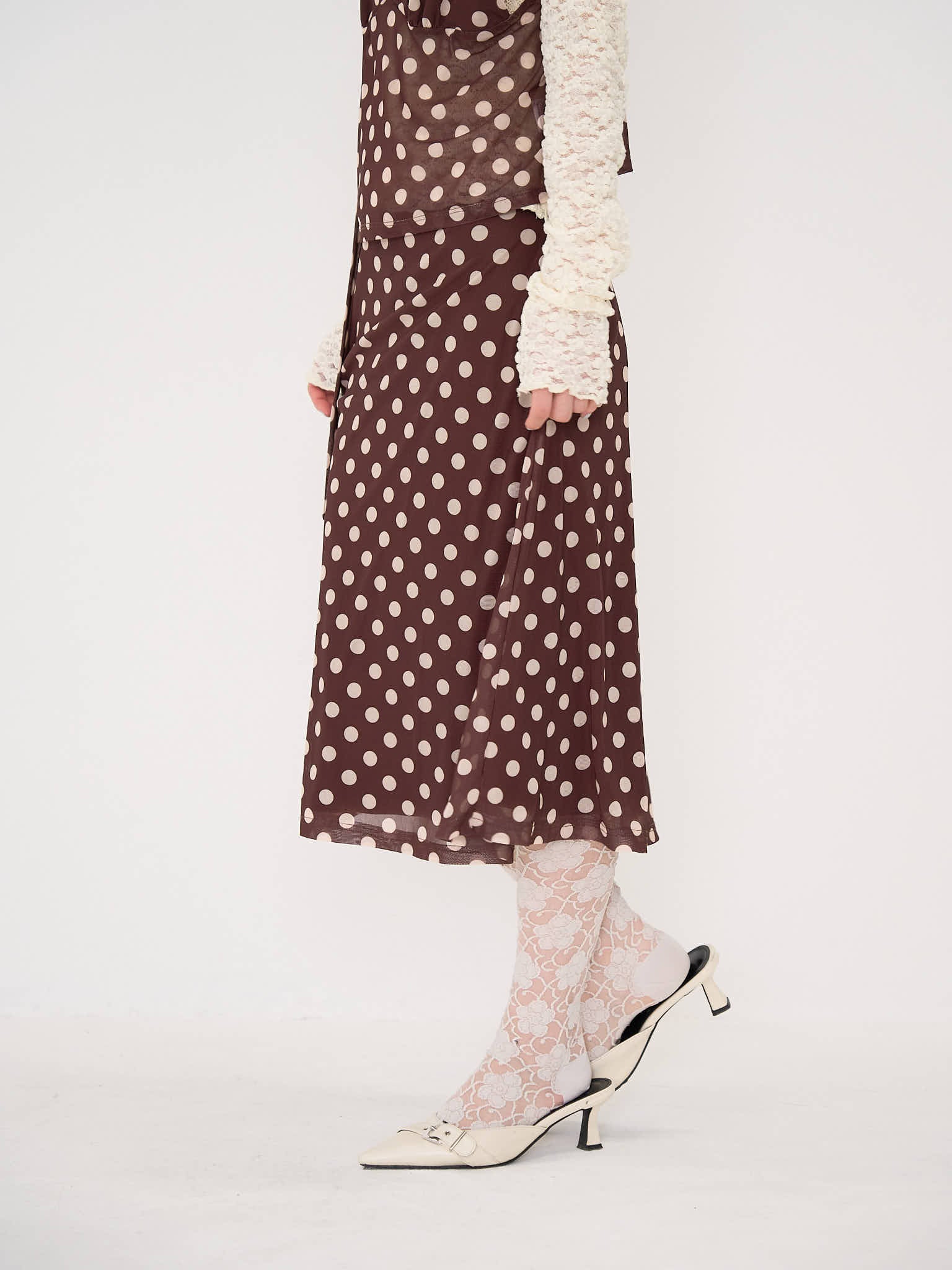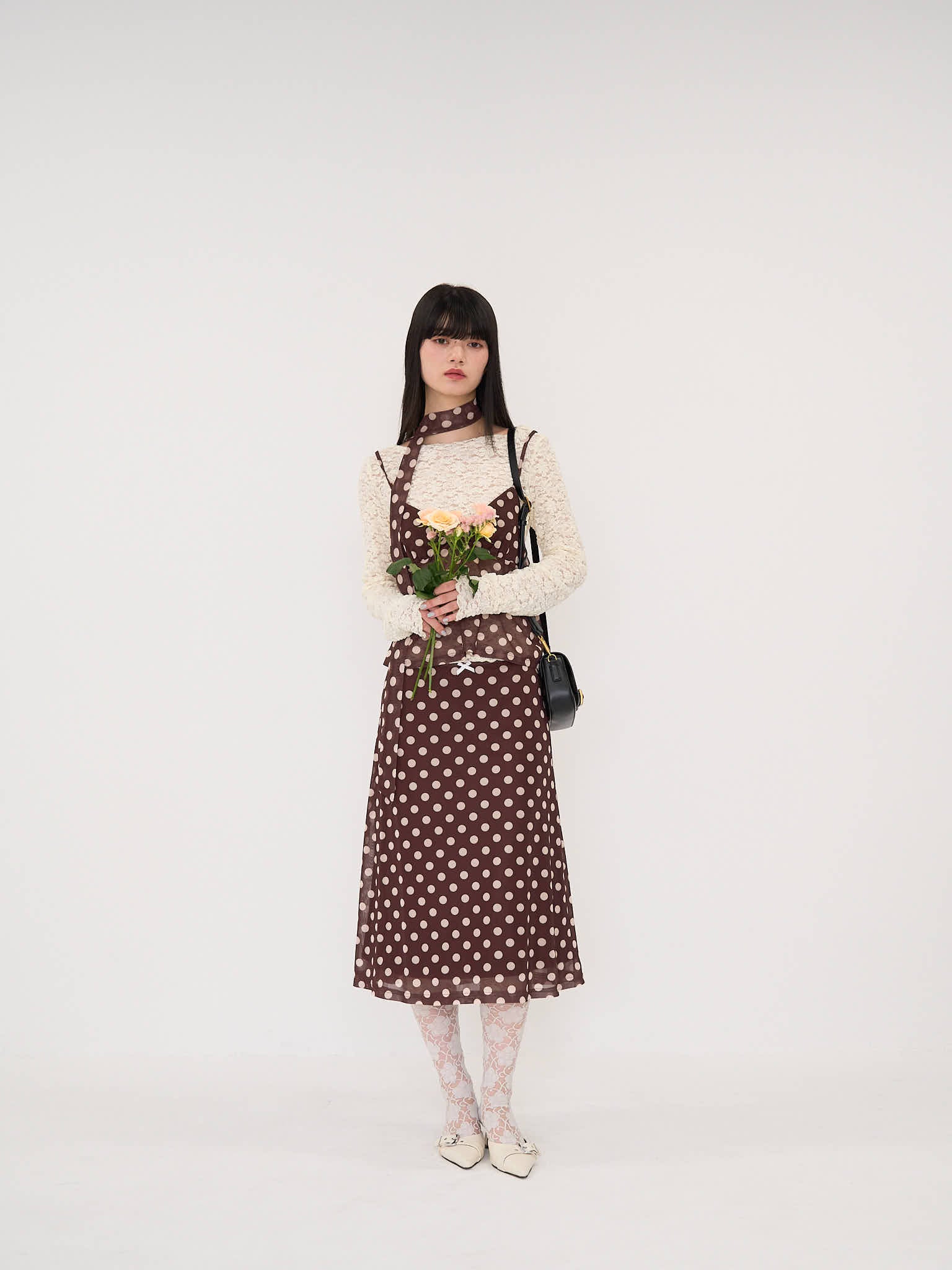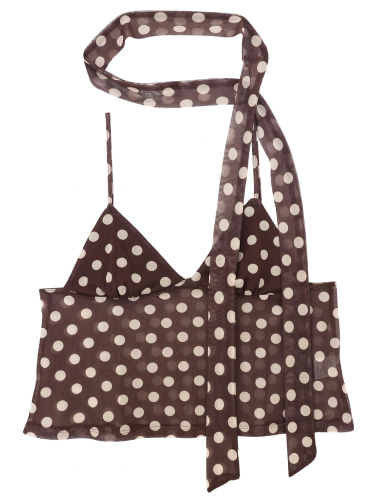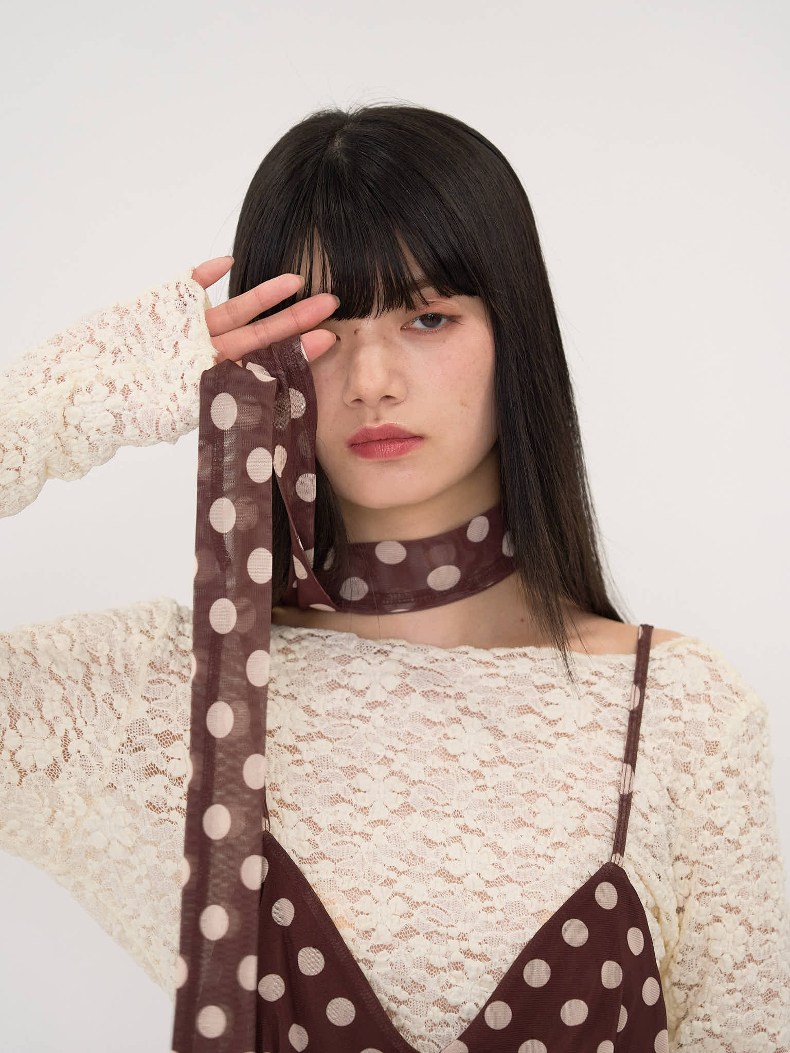 ドット柄が印象的なセパレートセット。トップスは胸元のカットデザインと細ストラップがアクセントになり、程よい抜け感を演出。スカートはすっきりとしたシルエットでバランスよく着こなせるデザイン。セットアップとしてはもちろん、それぞれ単体でもコーディネートしやすい一着。