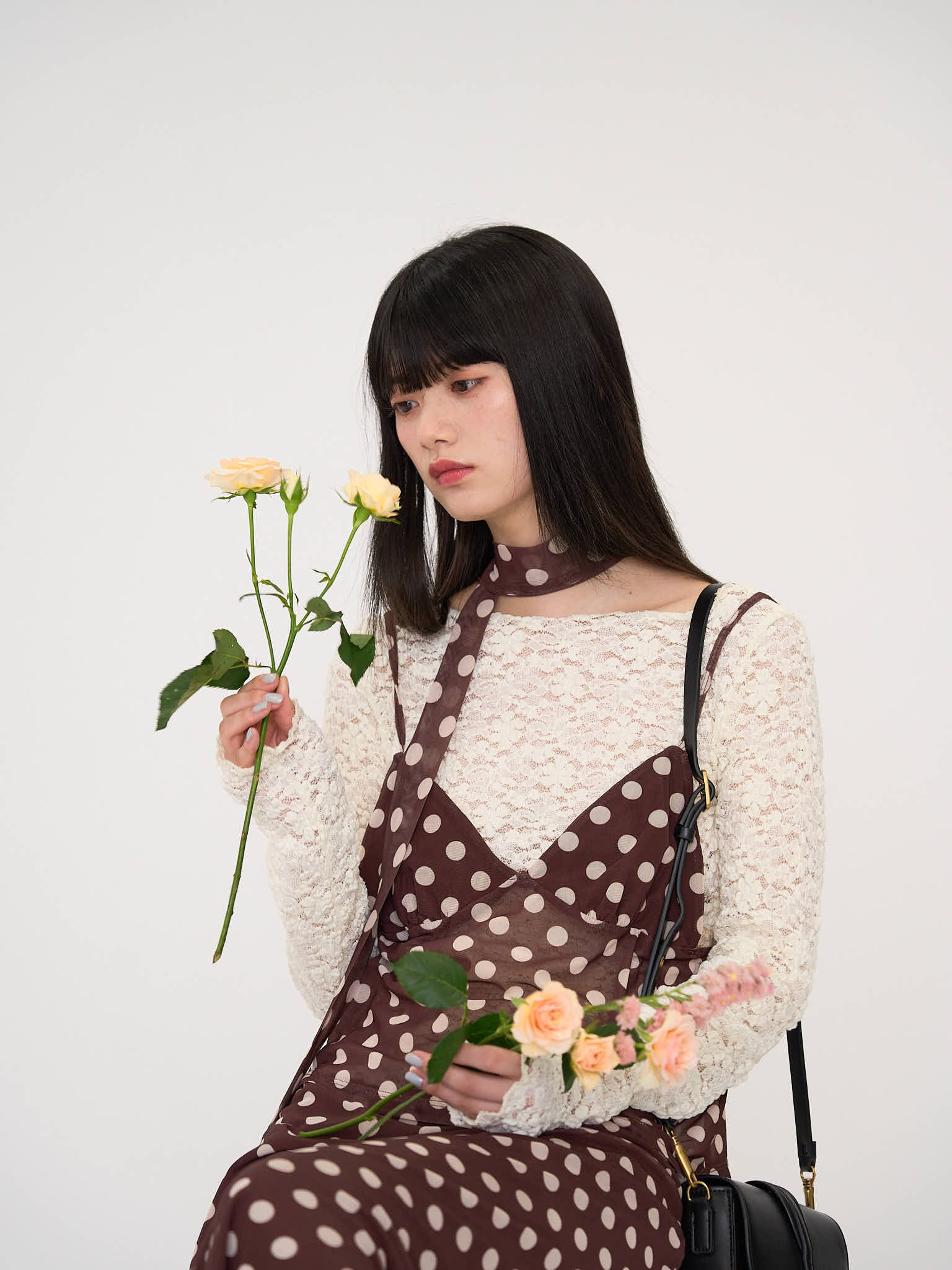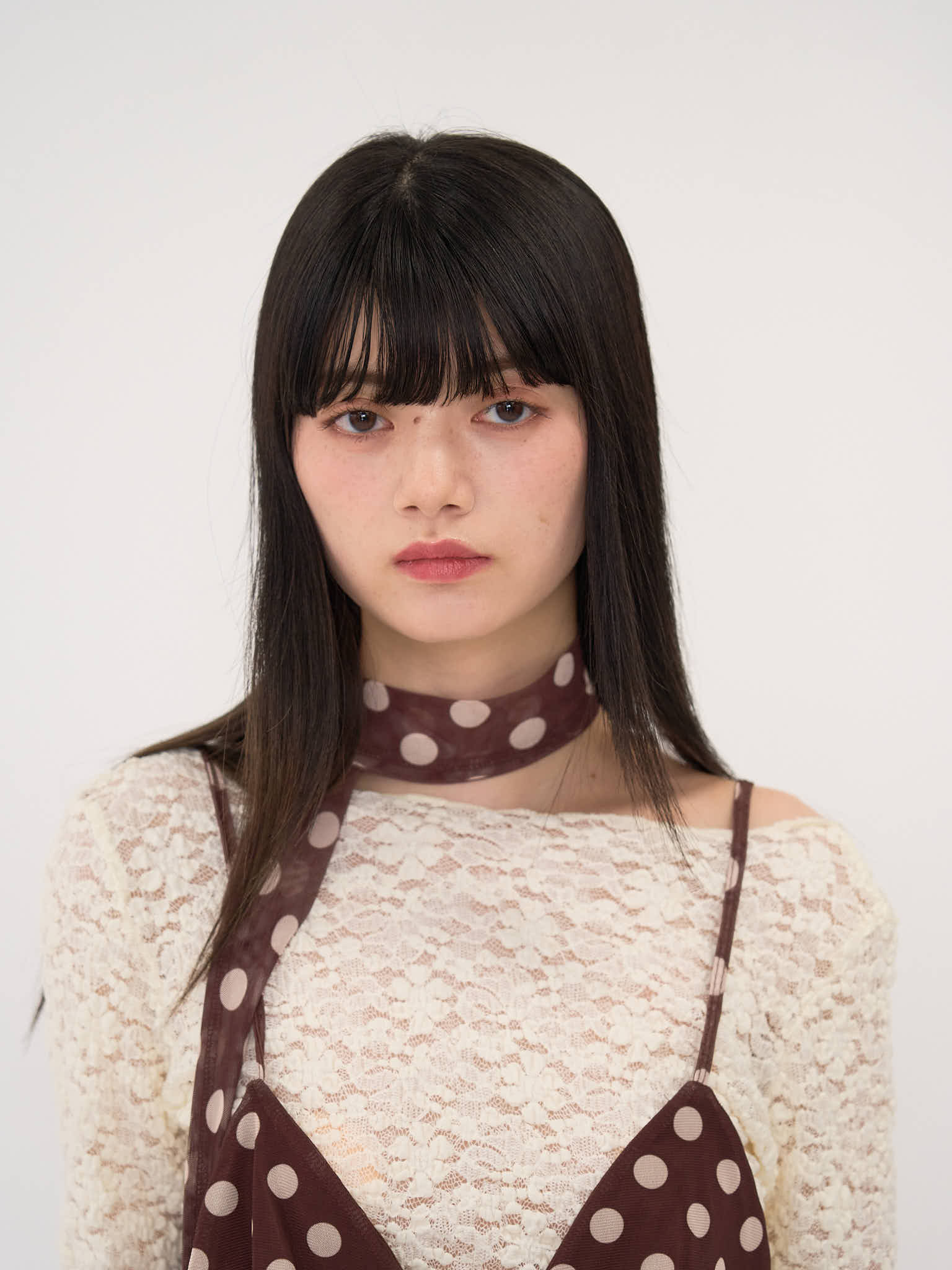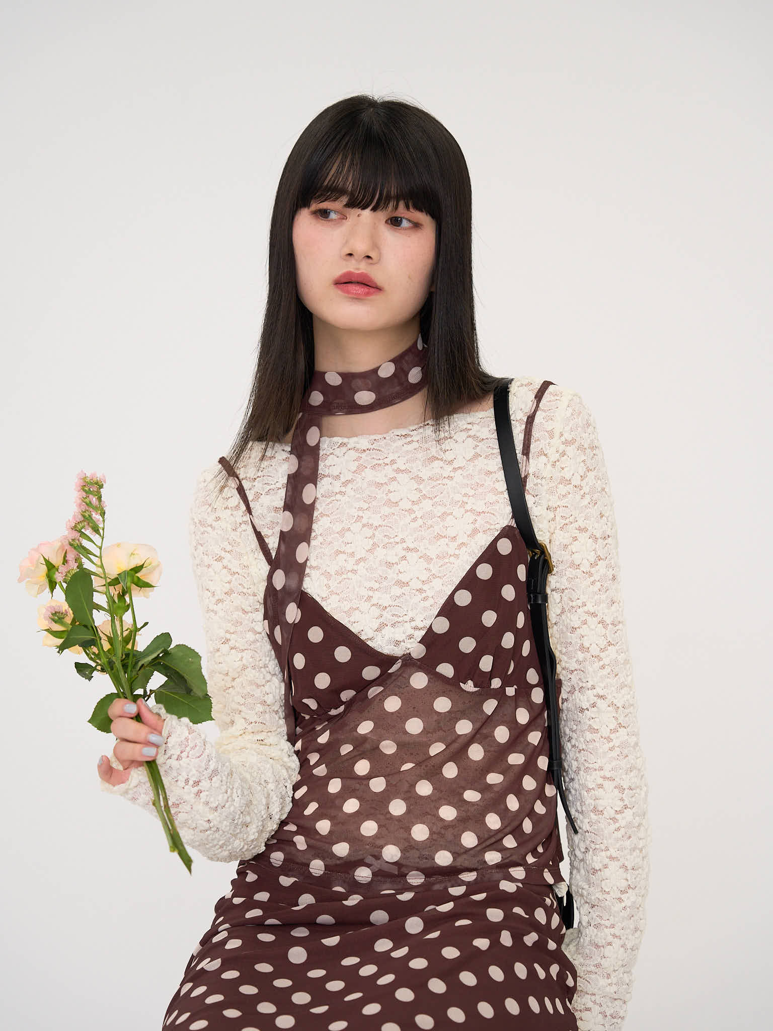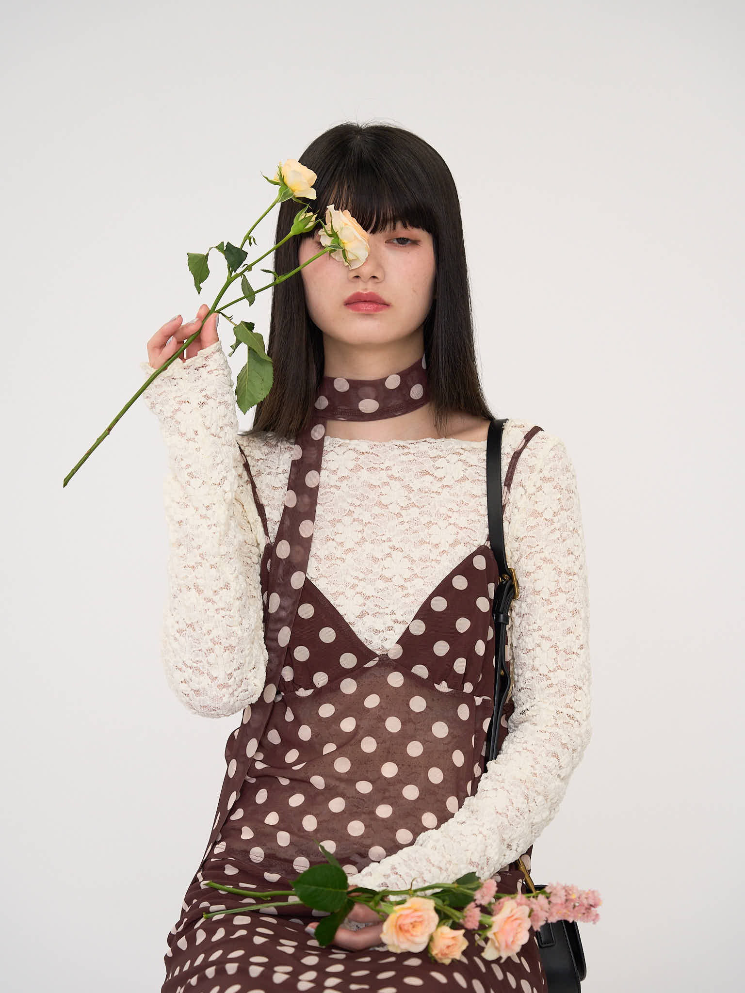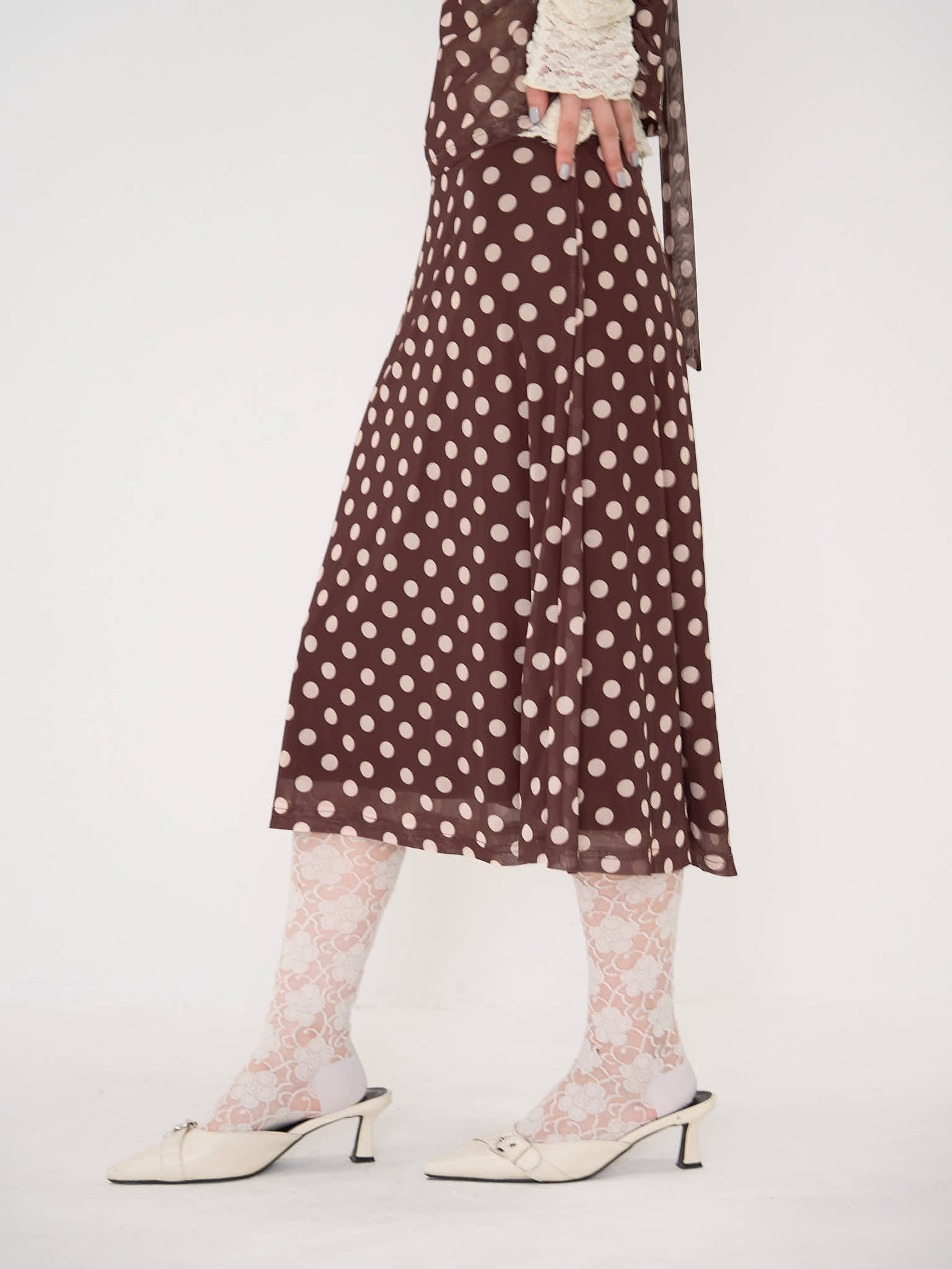 ドット柄が印象的なセパレートセット。トップスは胸元のカットデザインと細ストラップがアクセントになり、程よい抜け感を演出。スカートはすっきりとしたシルエットでバランスよく着こなせるデザイン。セットアップとしてはもちろん、それぞれ単体でもコーディネートしやすい一着。