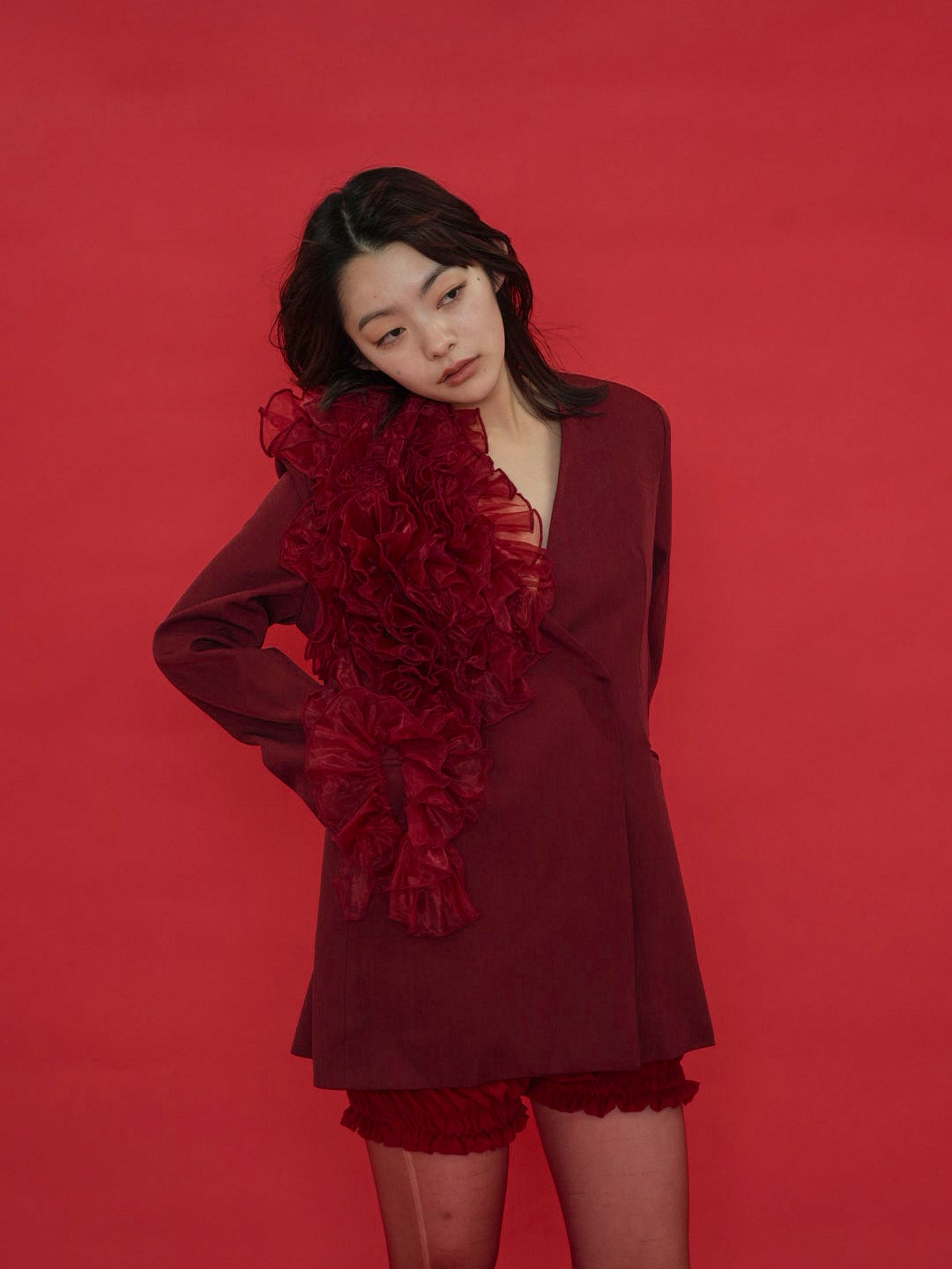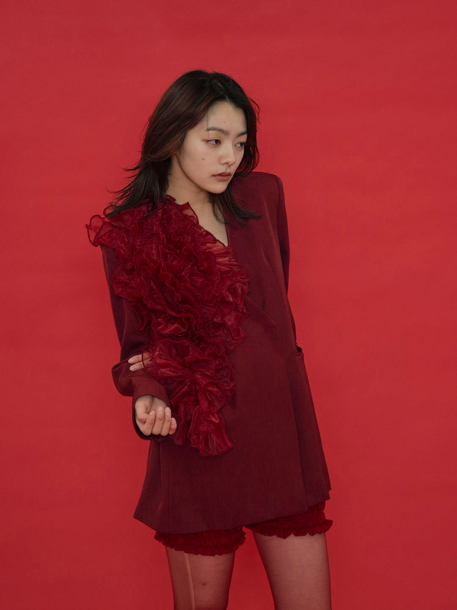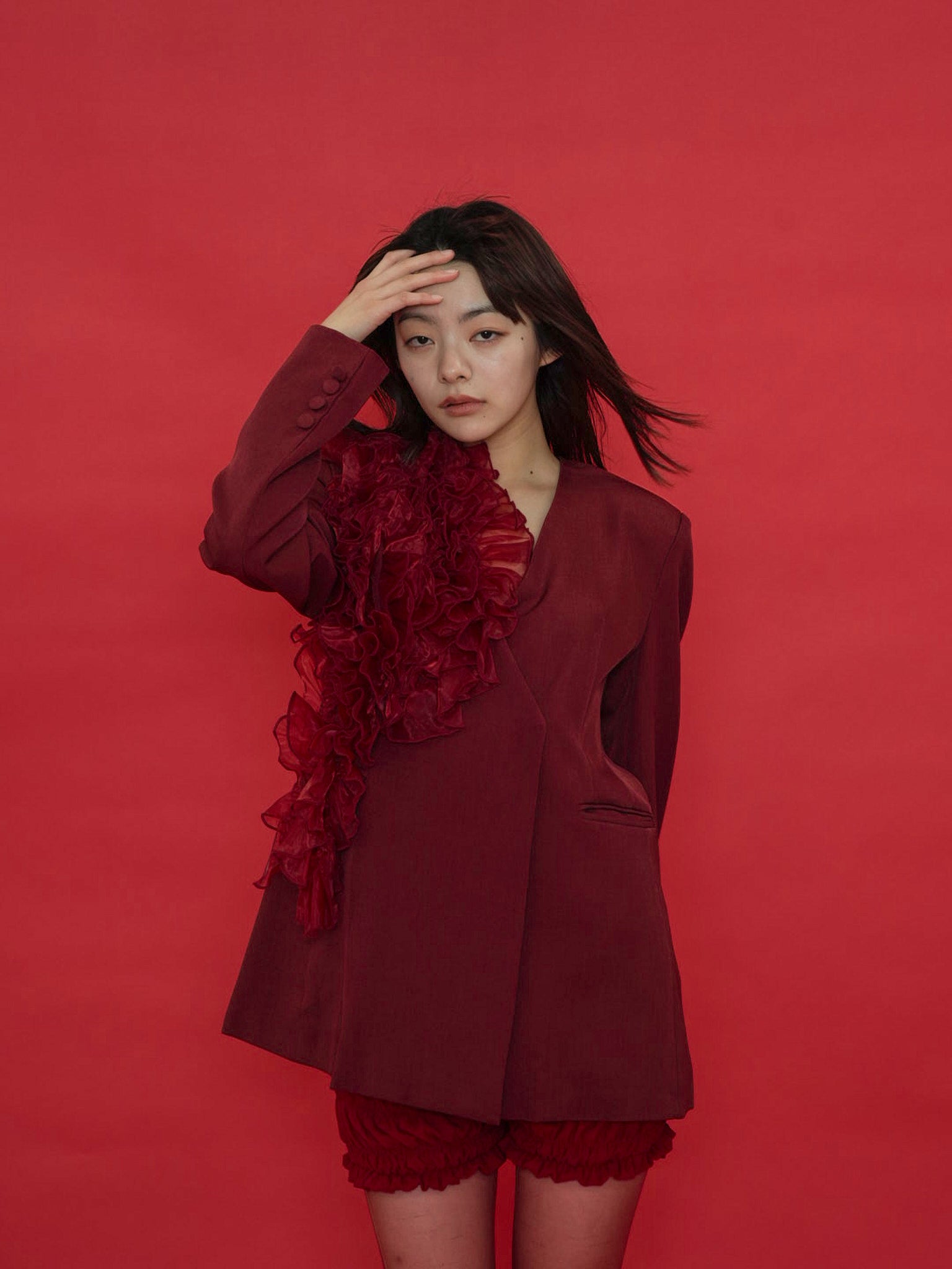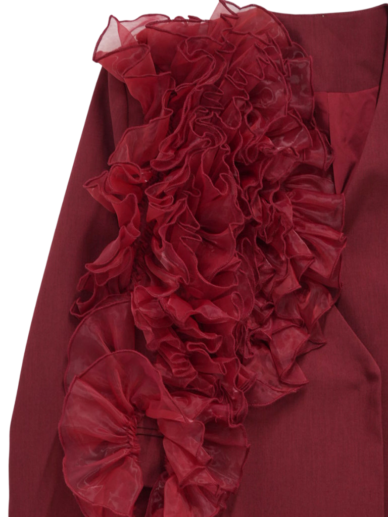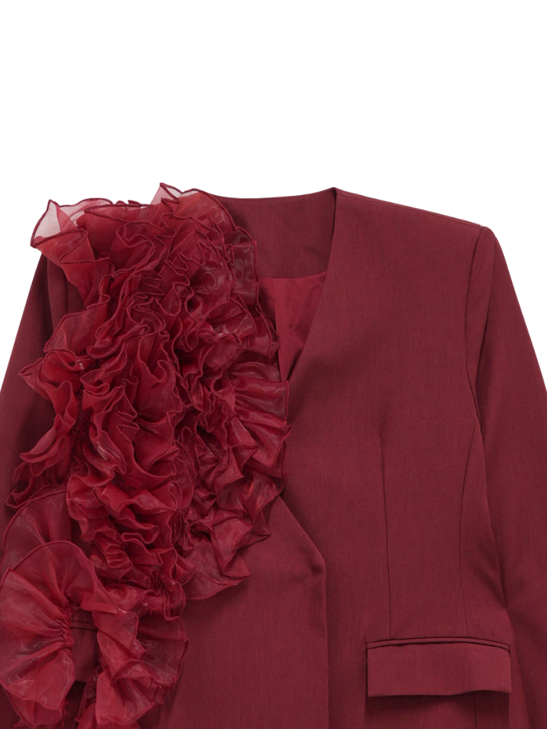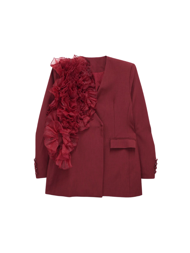 大胆にあしらわれたフリルディテールが印象的なデザインジャケット。テーラードベースの端正なシルエットに、アートピースのような立体装飾を融合。羽織るだけでスタイリングに緊張感と華やかさを与え、特別な存在感を放つ一着。