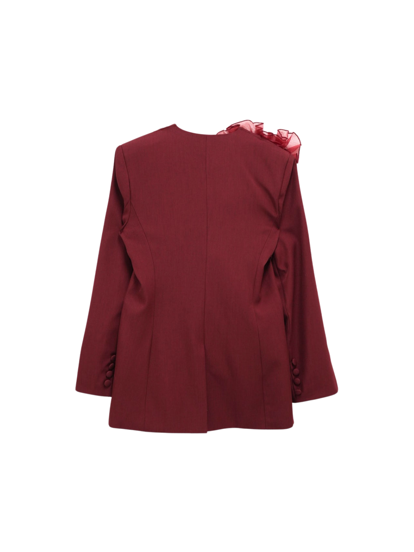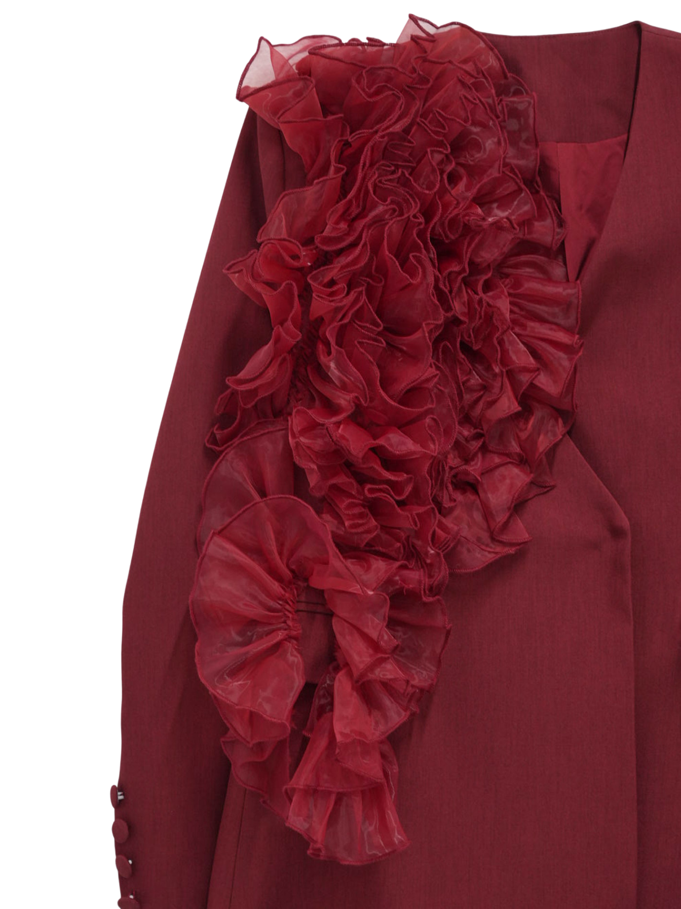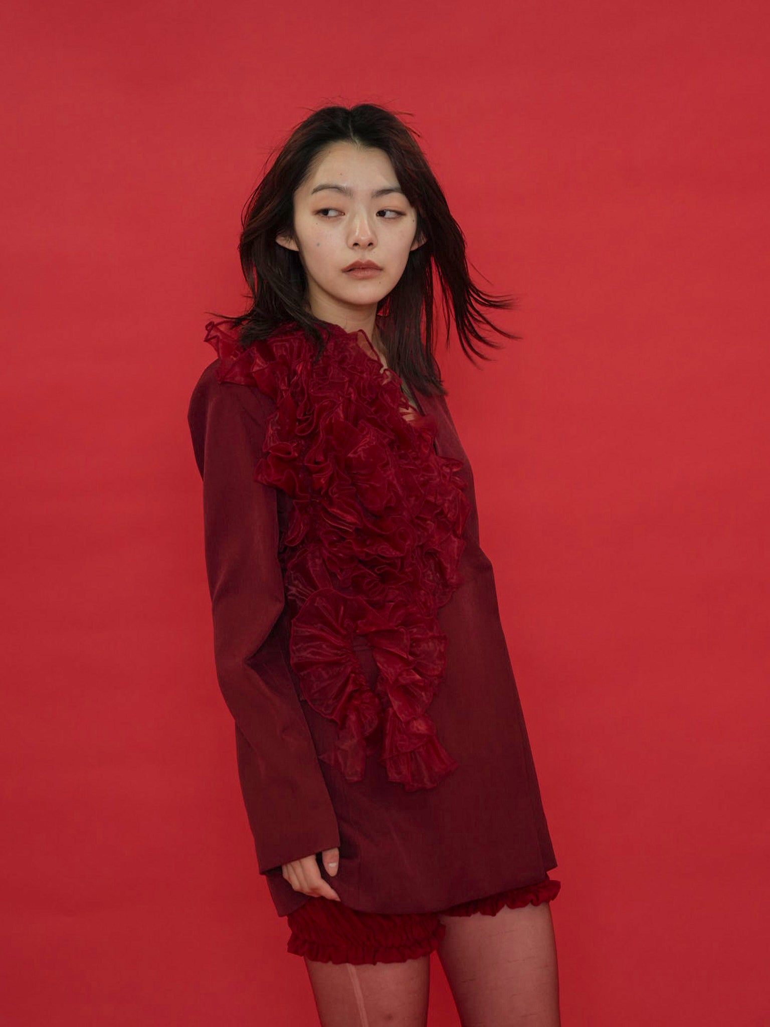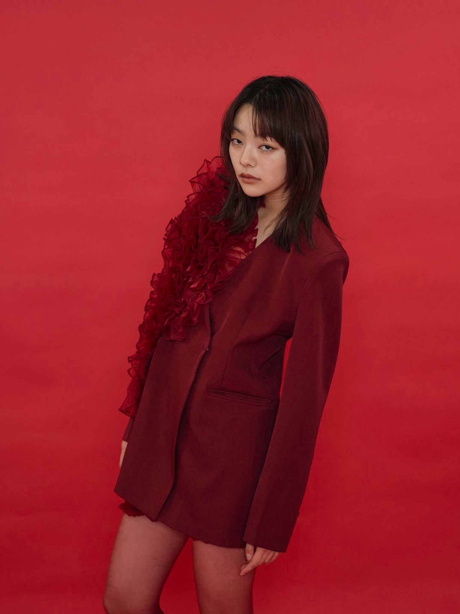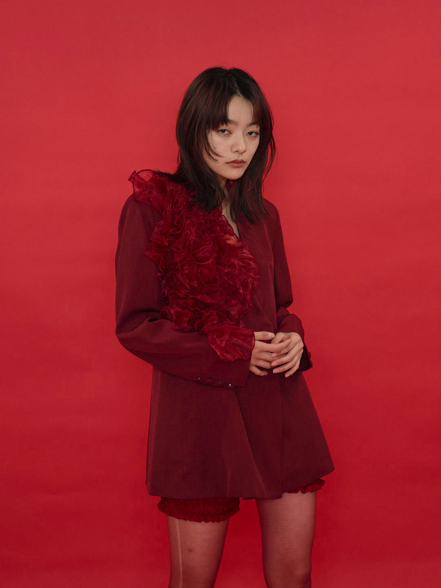 大胆にあしらわれたフリルディテールが印象的なデザインジャケット。テーラードベースの端正なシルエットに、アートピースのような立体装飾を融合。羽織るだけでスタイリングに緊張感と華やかさを与え、特別な存在感を放つ一着。