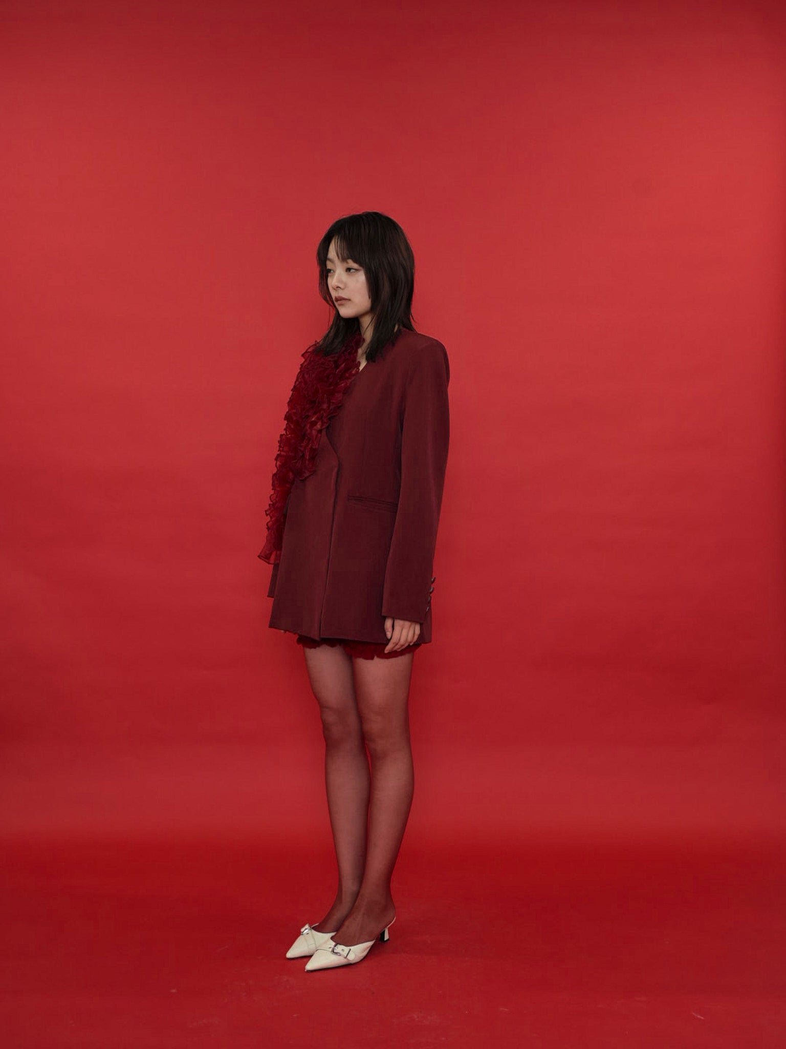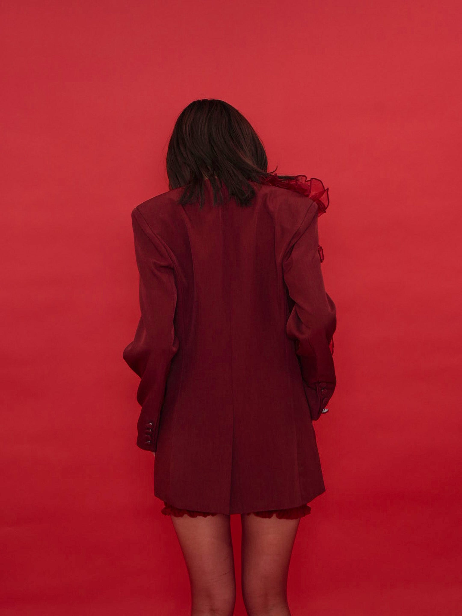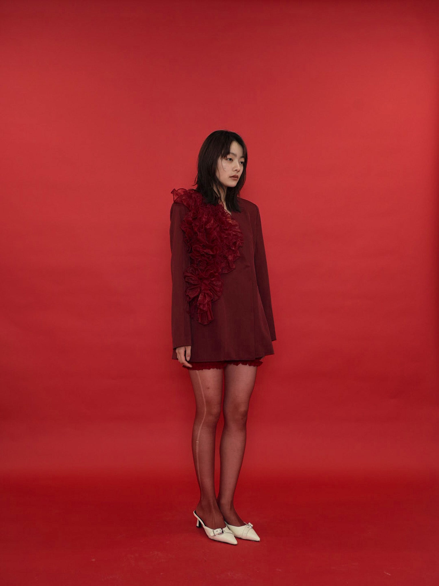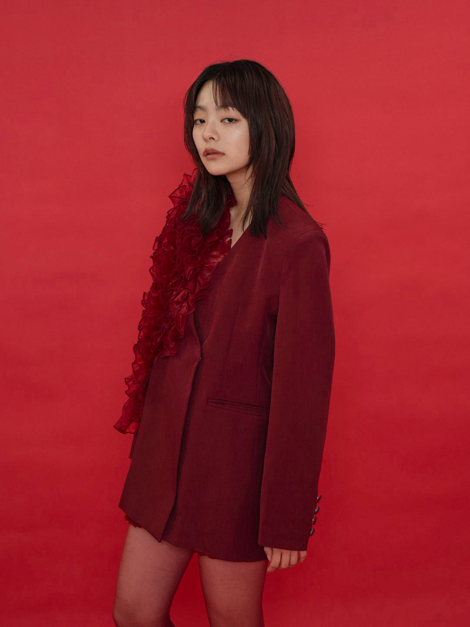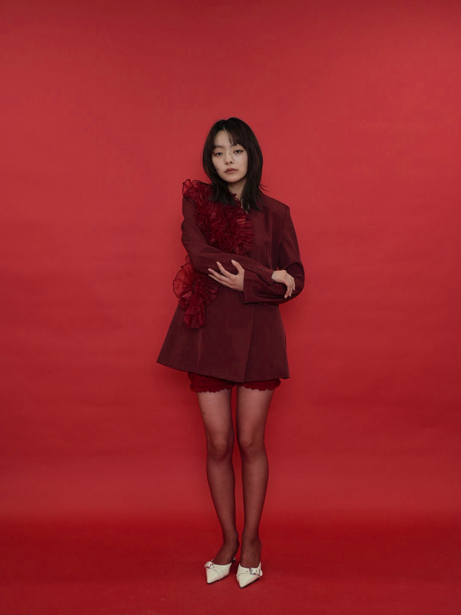 大胆にあしらわれたフリルディテールが印象的なデザインジャケット。テーラードベースの端正なシルエットに、アートピースのような立体装飾を融合。羽織るだけでスタイリングに緊張感と華やかさを与え、特別な存在感を放つ一着。