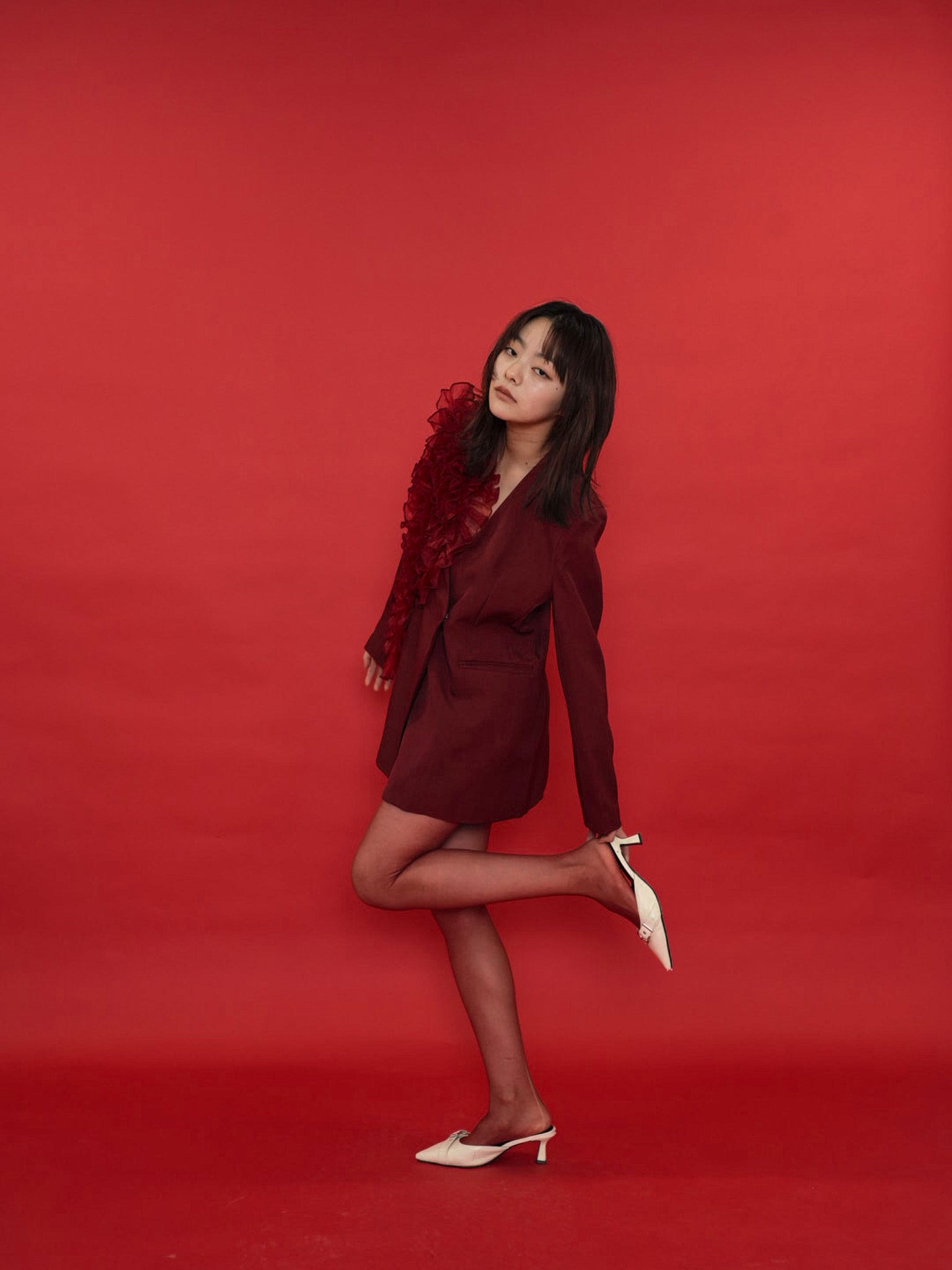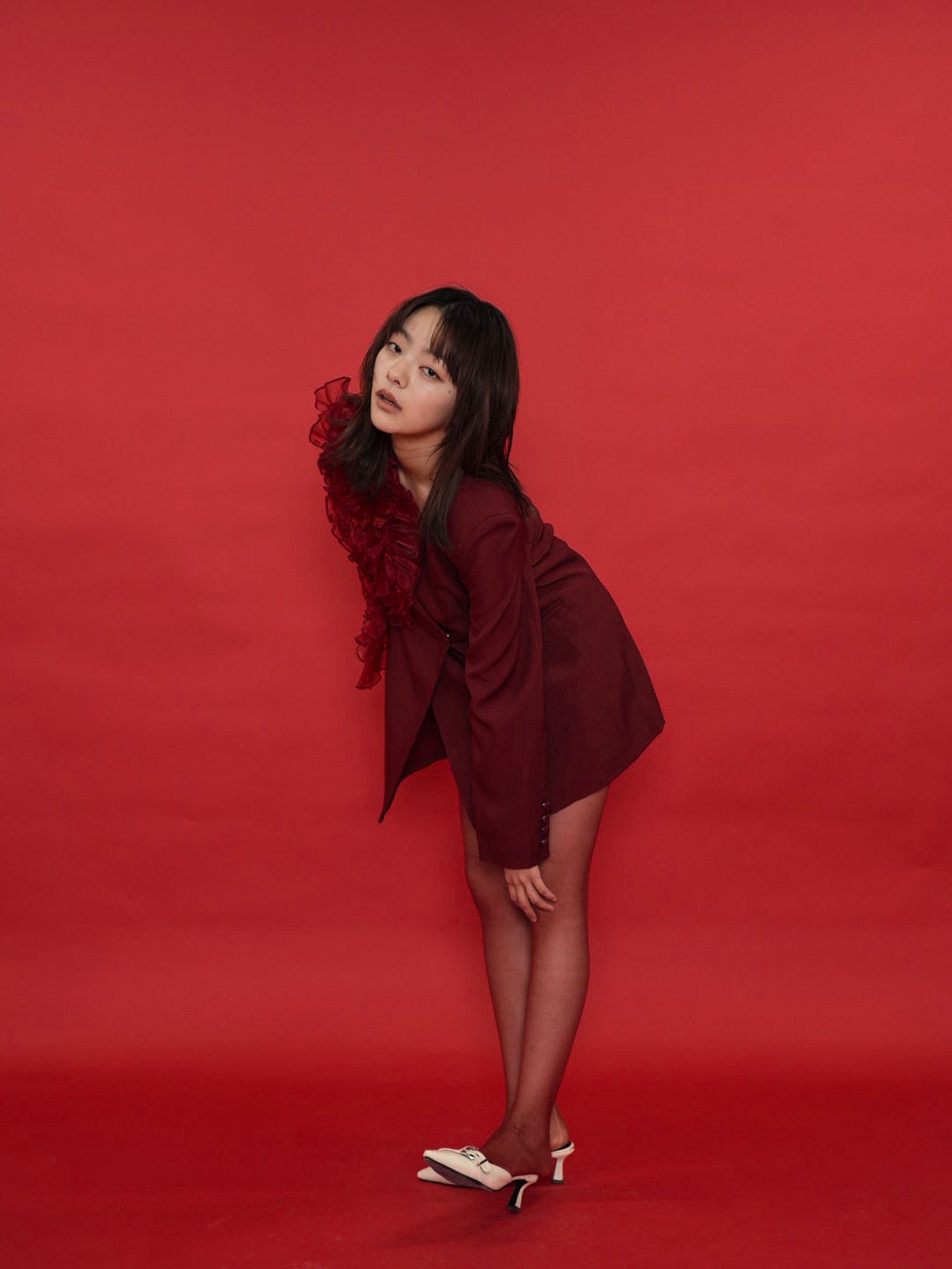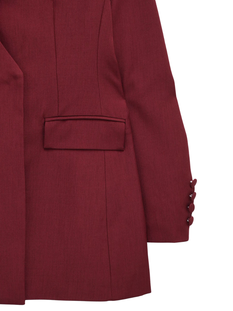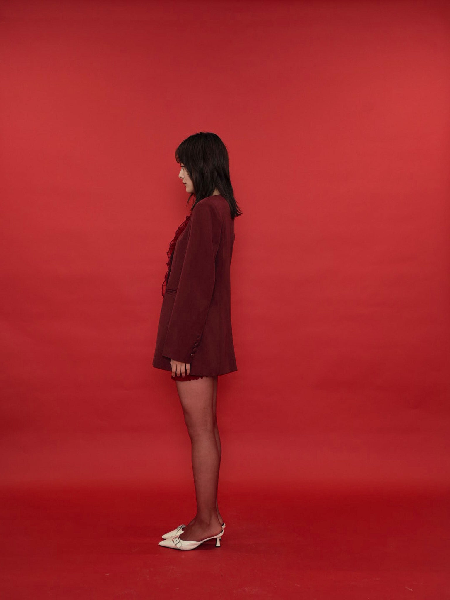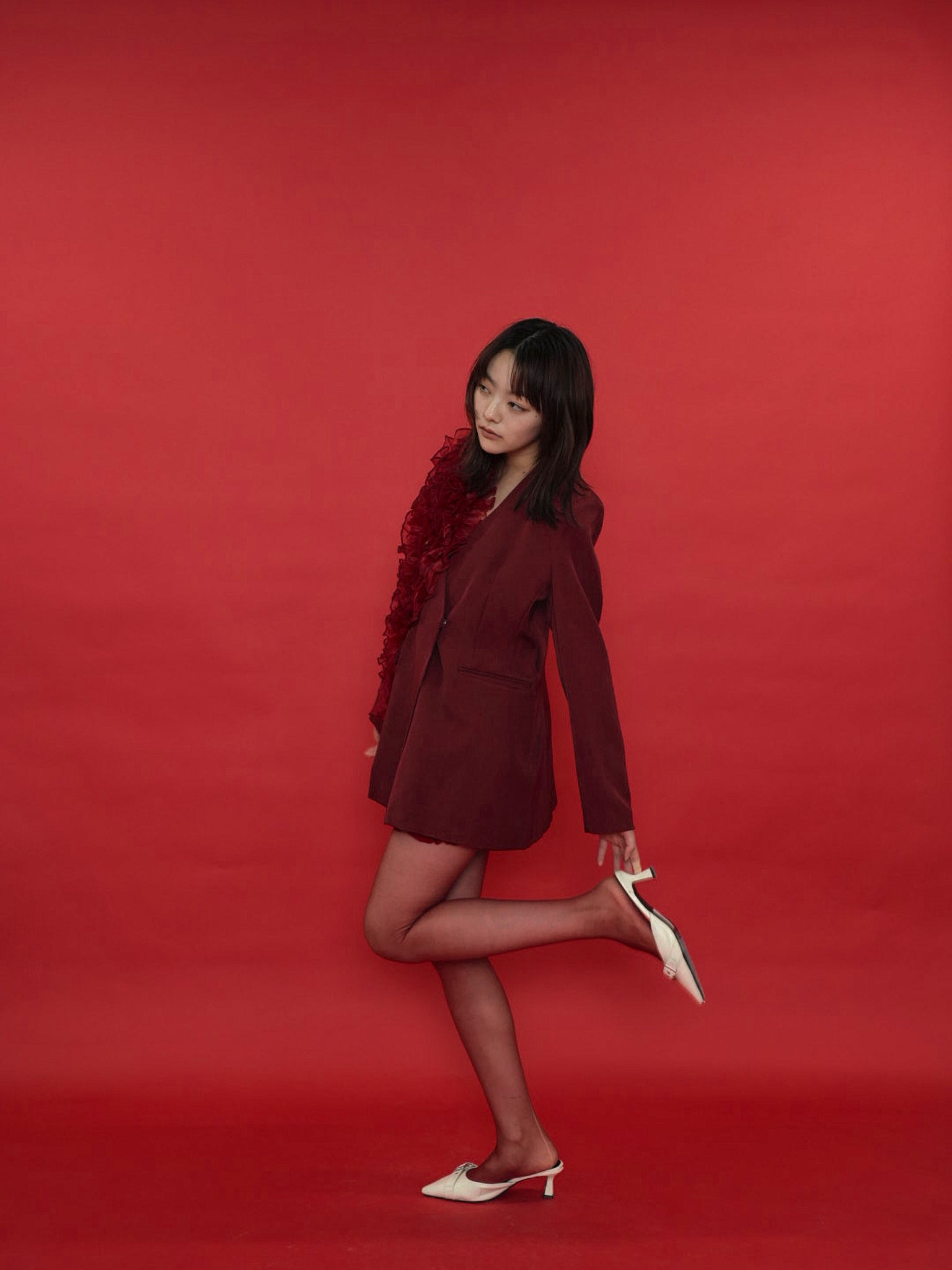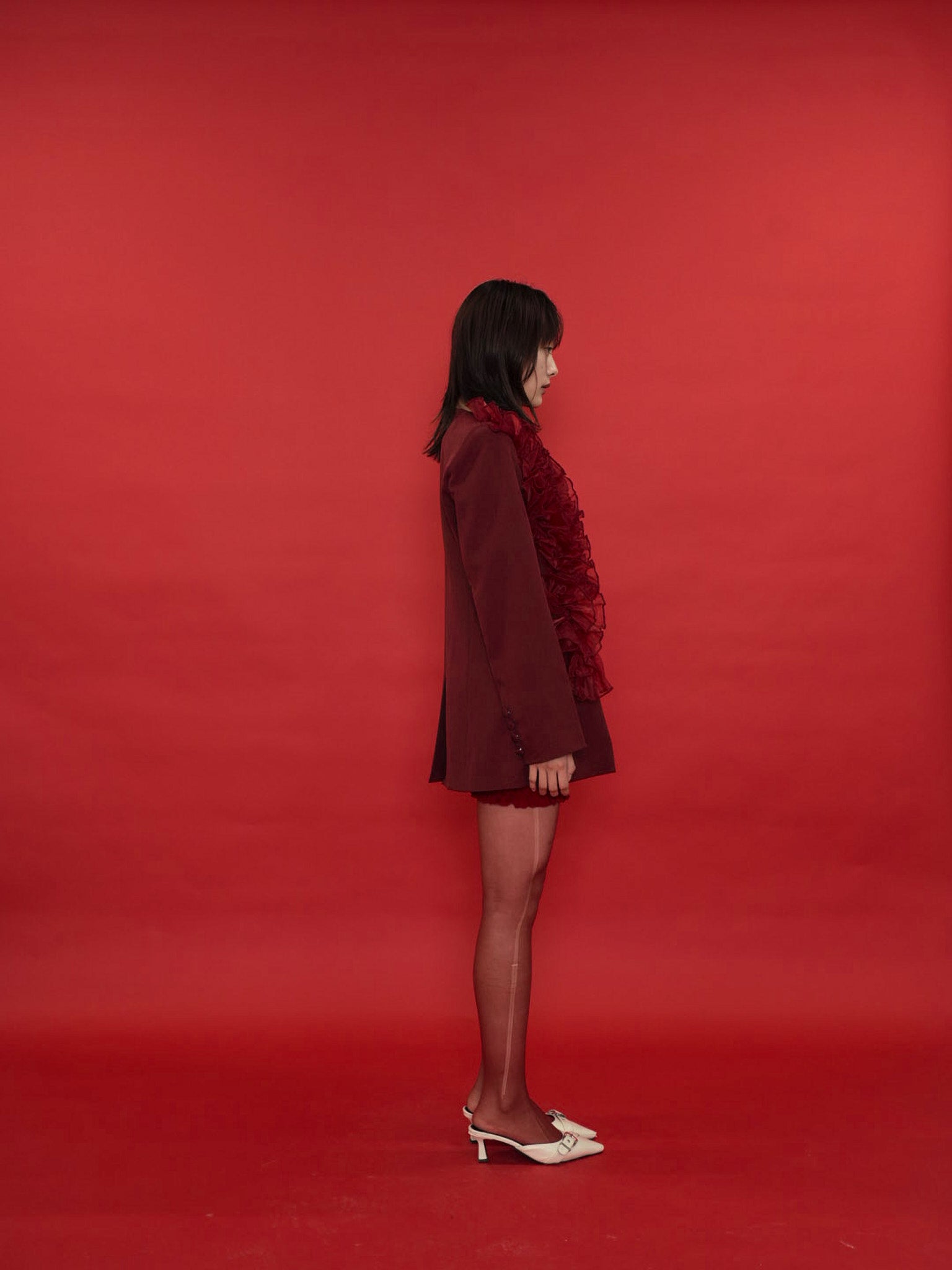 大胆にあしらわれたフリルディテールが印象的なデザインジャケット。テーラードベースの端正なシルエットに、アートピースのような立体装飾を融合。羽織るだけでスタイリングに緊張感と華やかさを与え、特別な存在感を放つ一着。