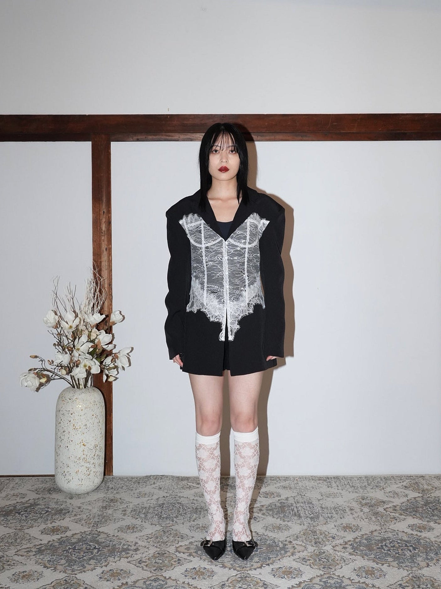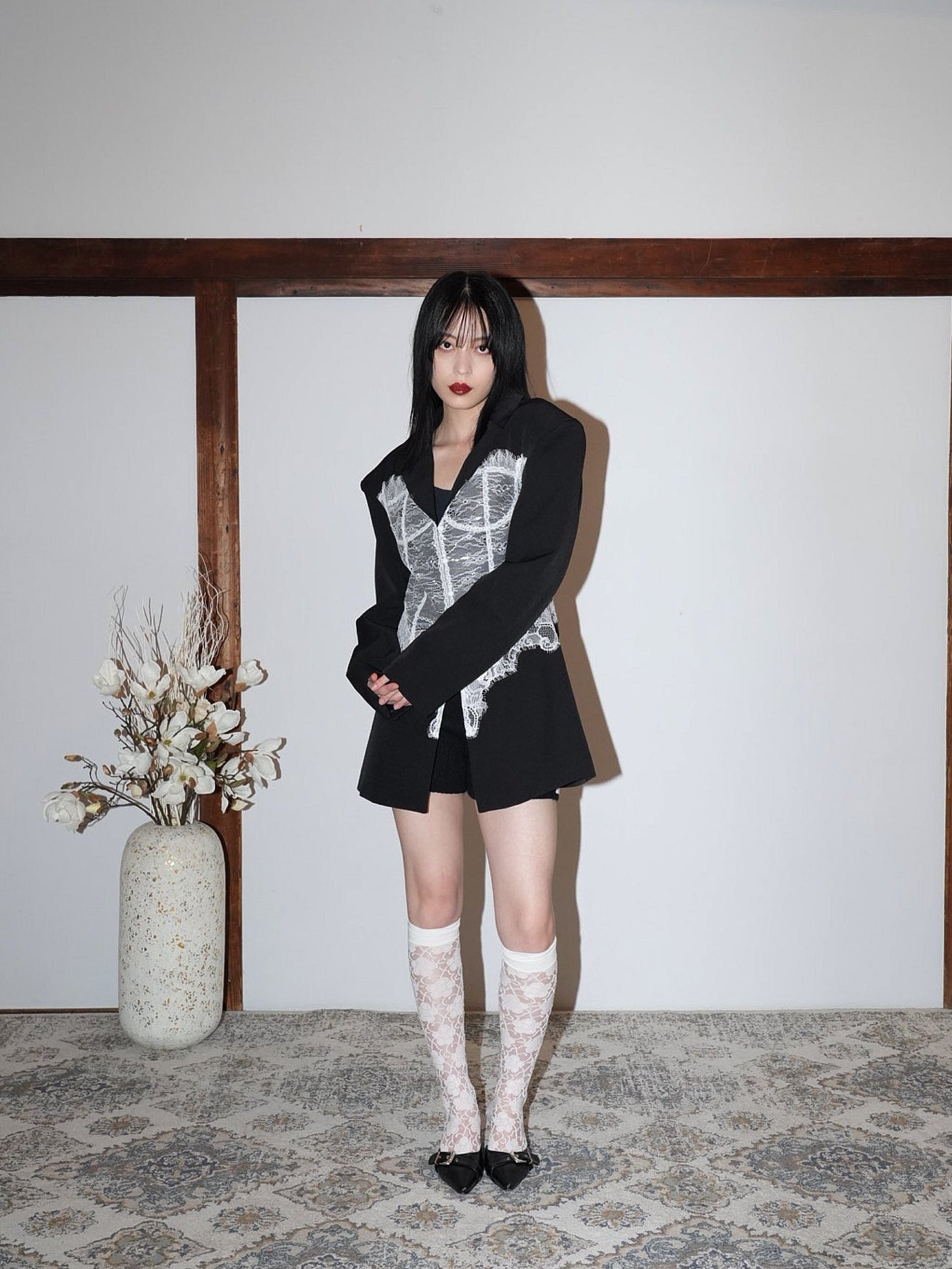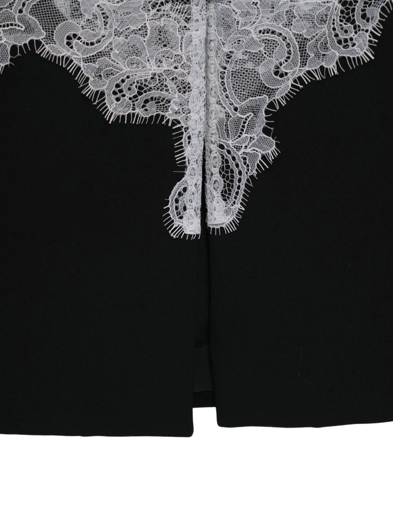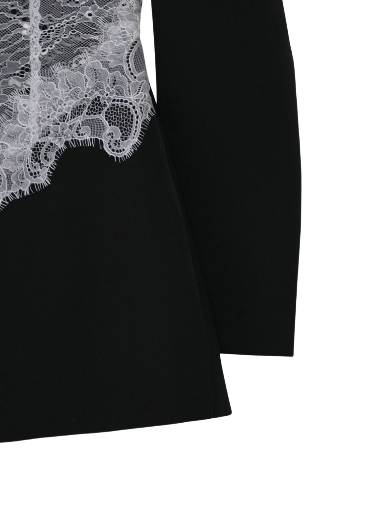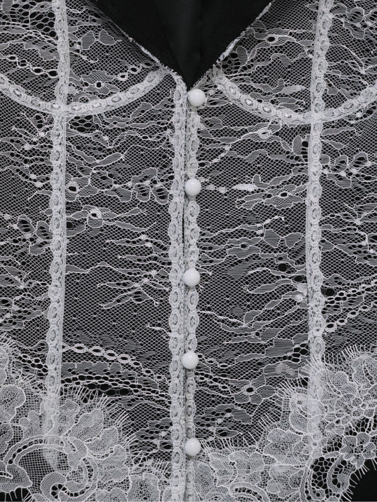 繊細なホワイトレースを大胆に重ねたモードな一着。