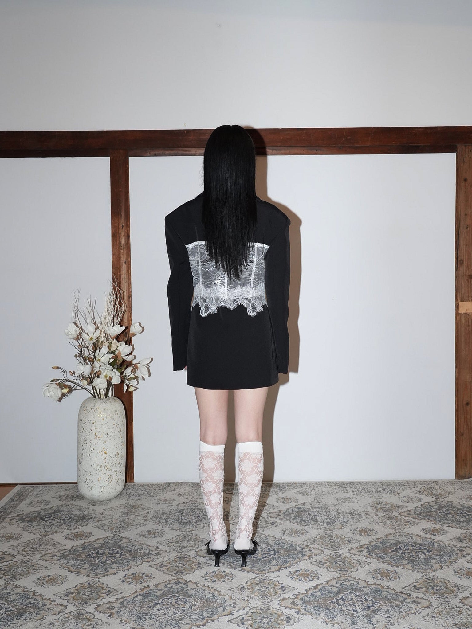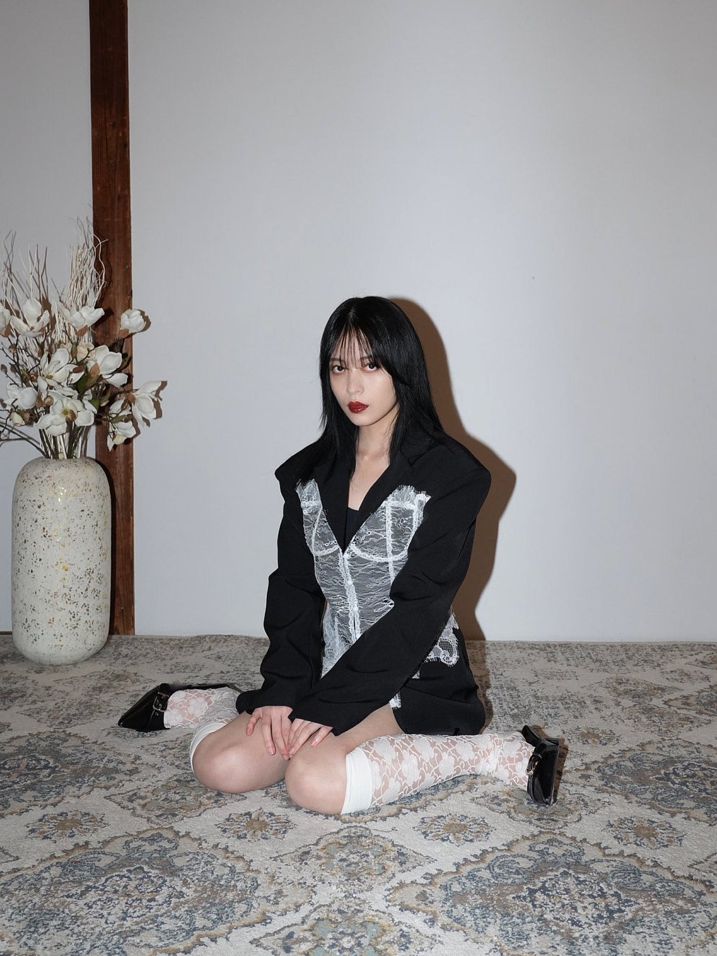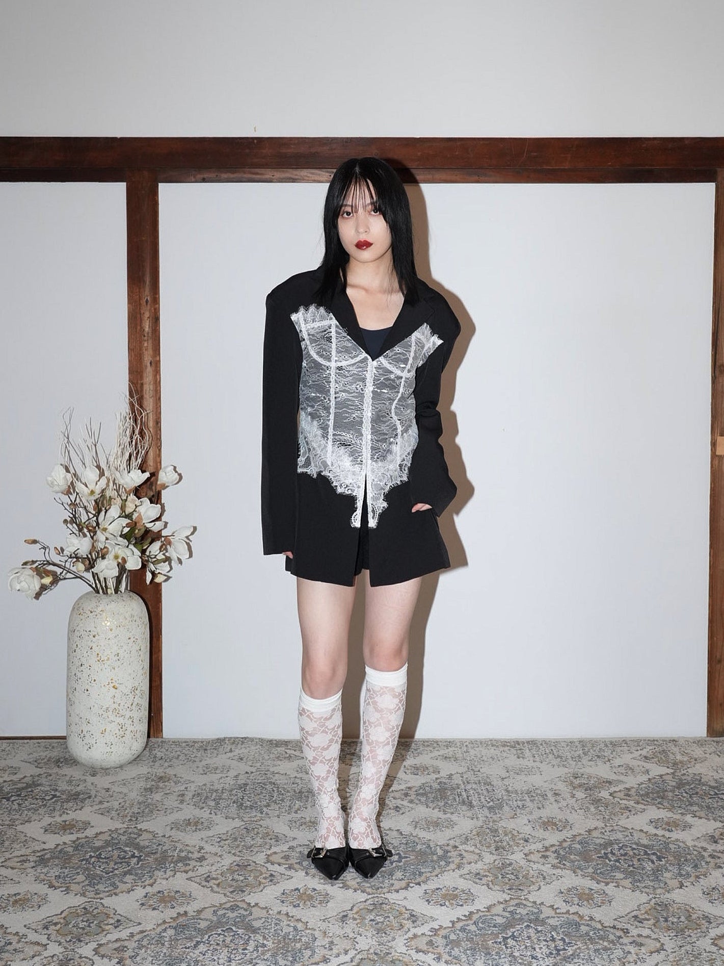 繊細なホワイトレースを大胆に重ねたモードな一着。