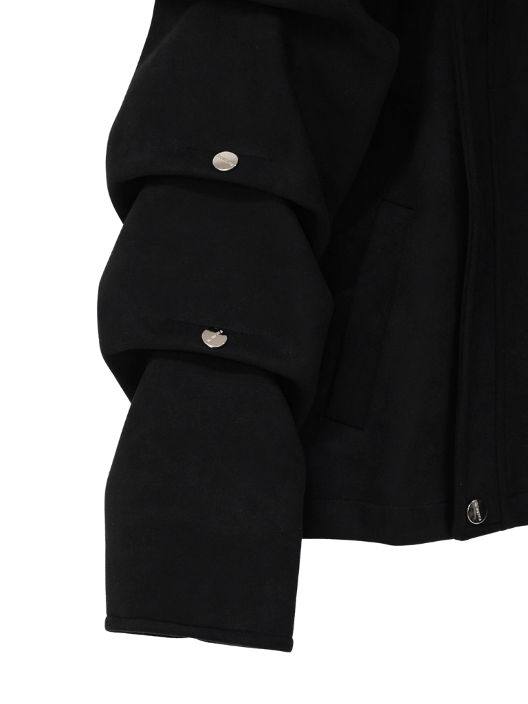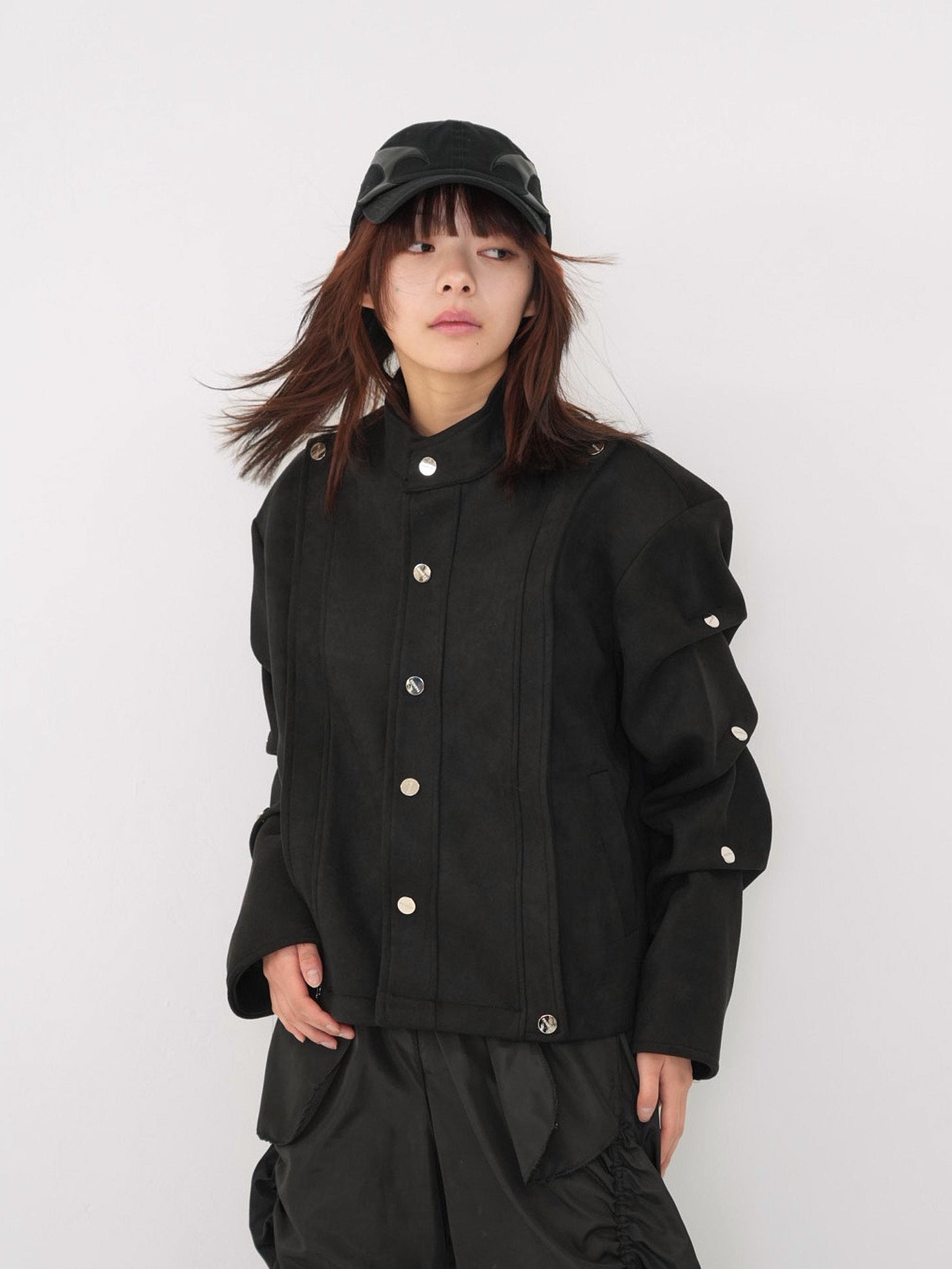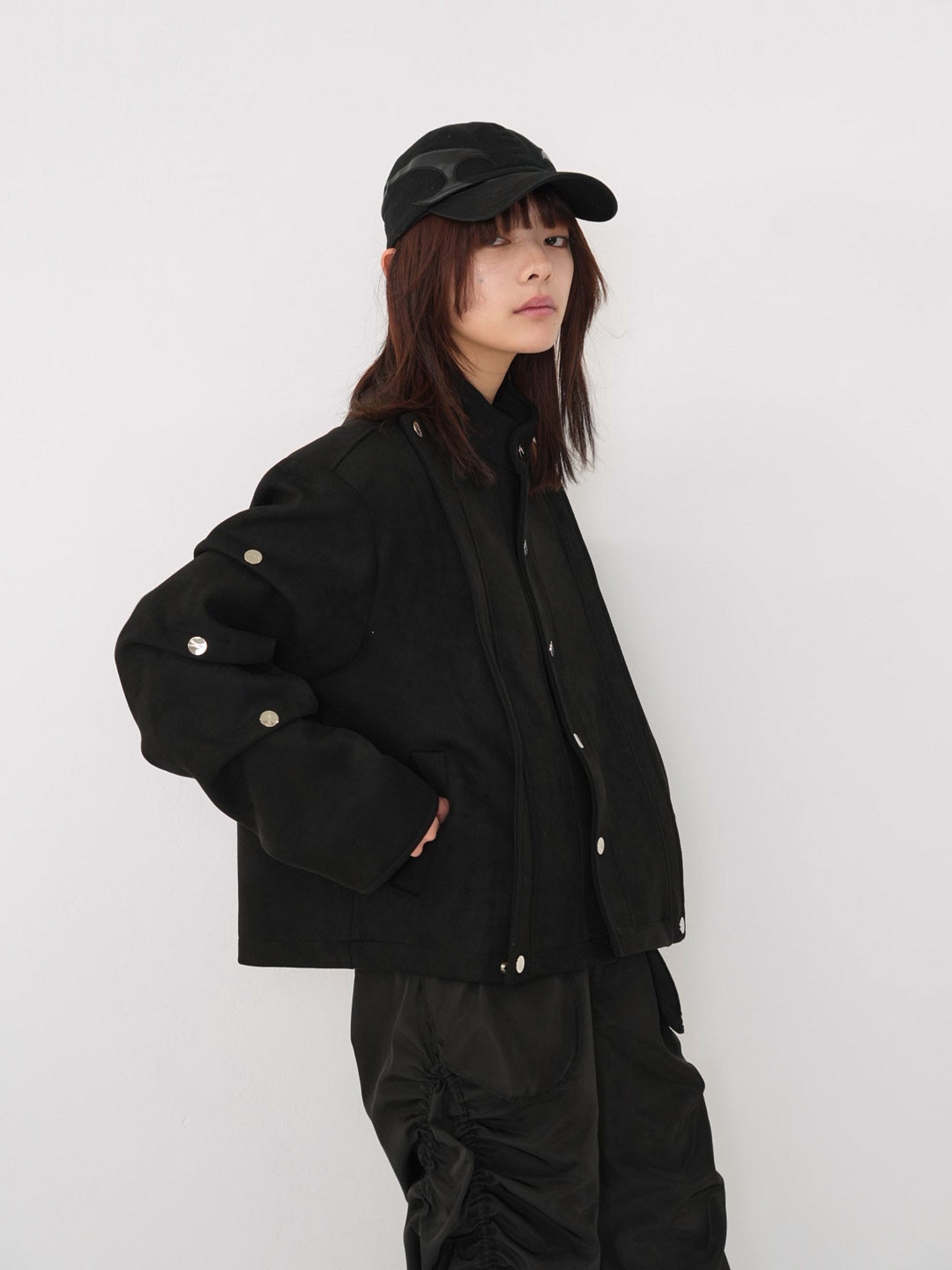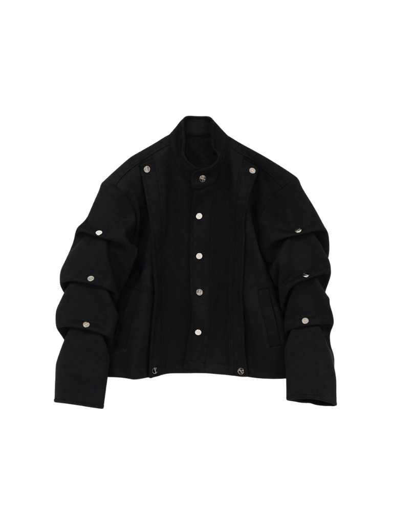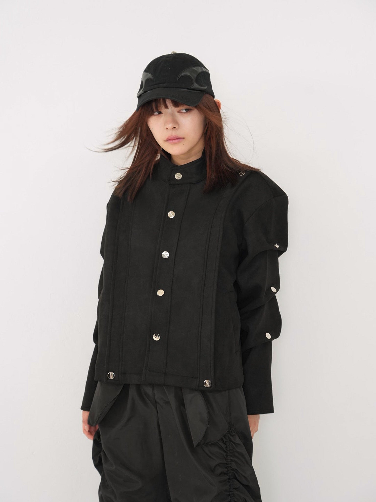立体感のある構築的なシルエットが特徴のショート丈アウター。フロントのメタルボタンが程よいアクセントになり、ミニマルながら存在感のある仕上がり。袖部分のディテールが動きを加え、羽織るだけでスタイリングを引き締める一着。