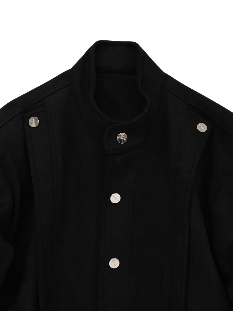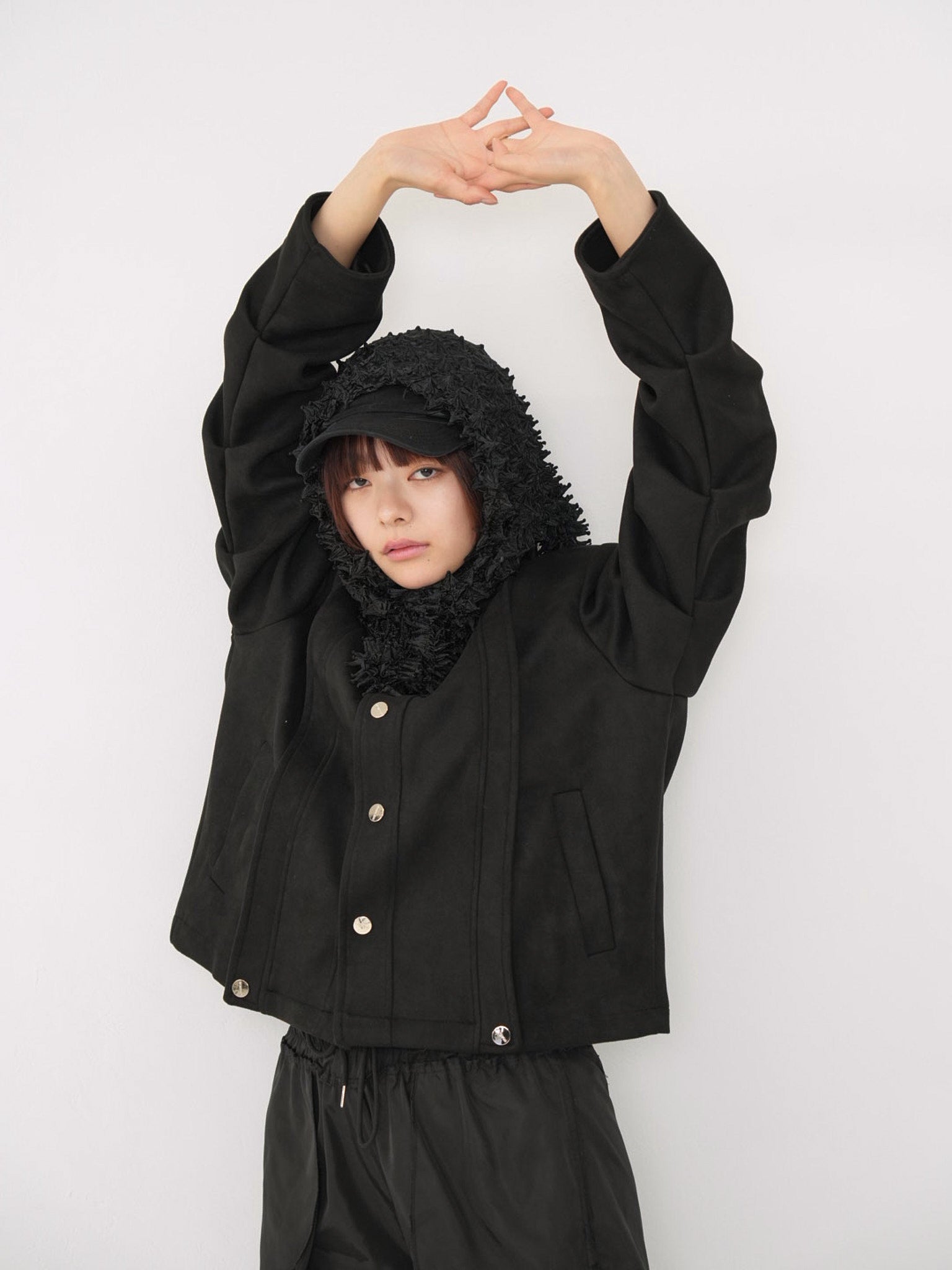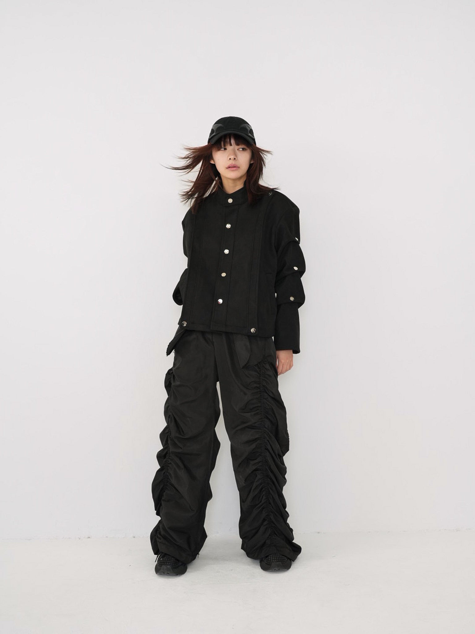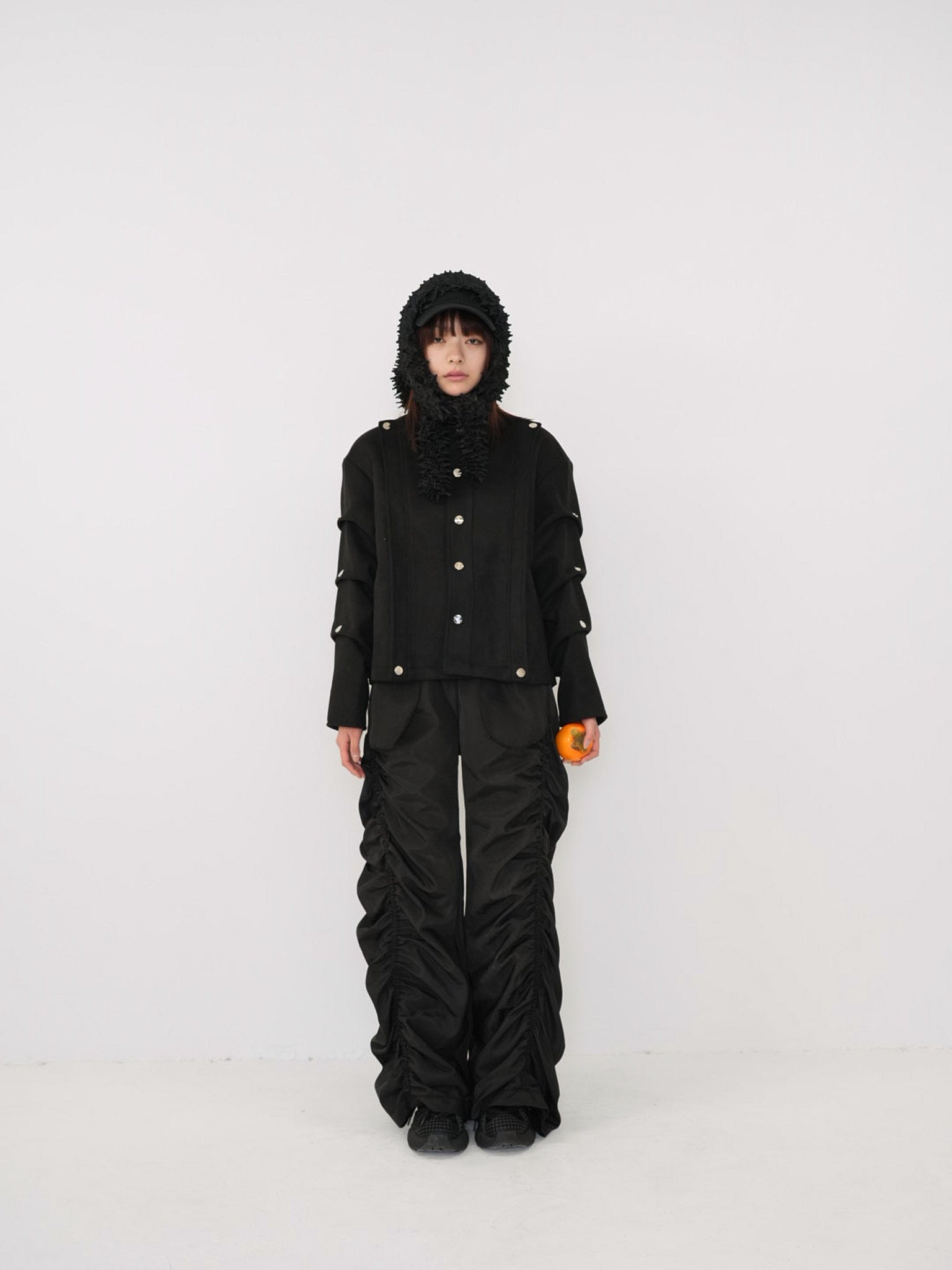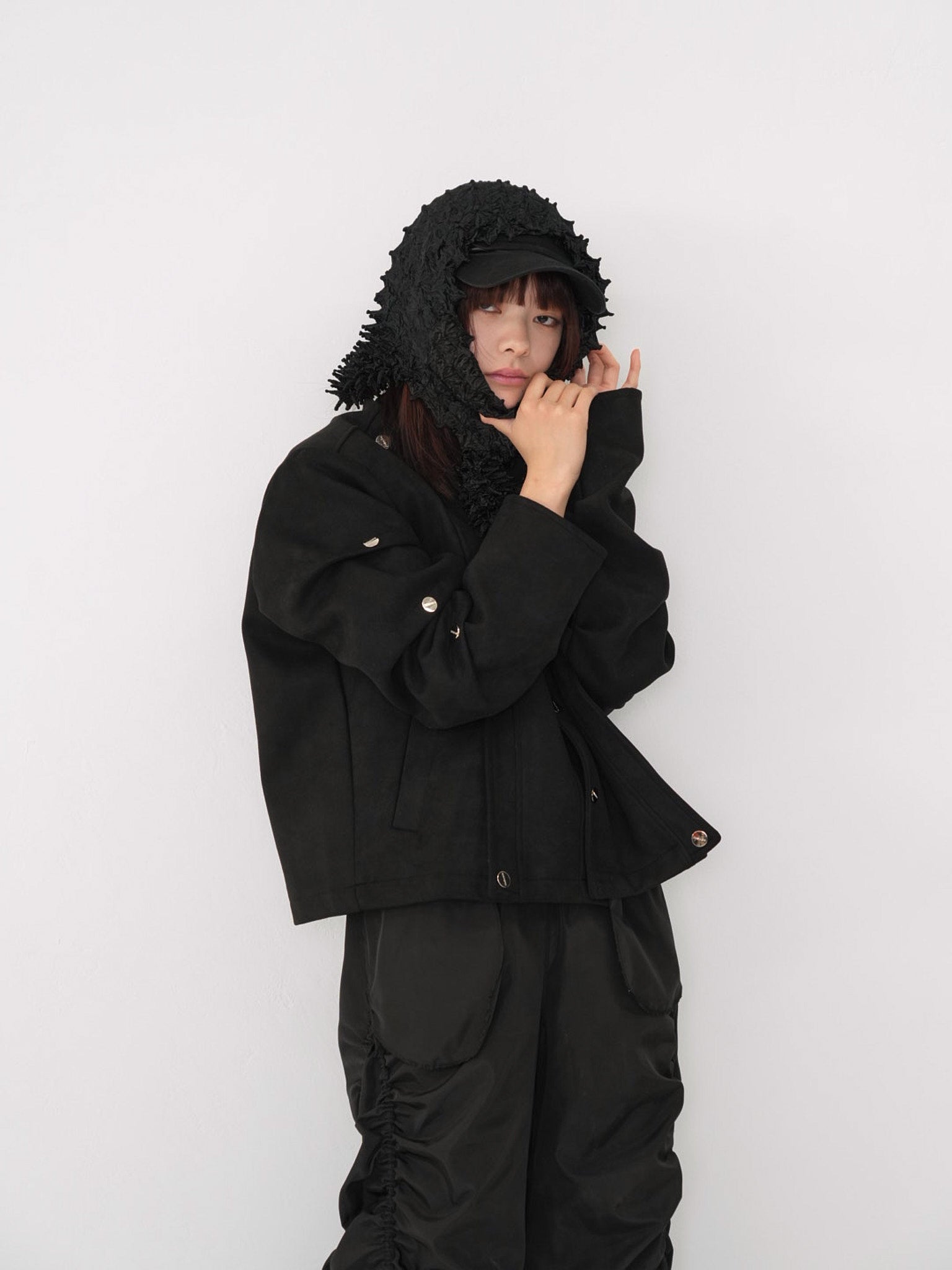 立体感のある構築的なシルエットが特徴のショート丈アウター。フロントのメタルボタンが程よいアクセントになり、ミニマルながら存在感のある仕上がり。袖部分のディテールが動きを加え、羽織るだけでスタイリングを引き締める一着。