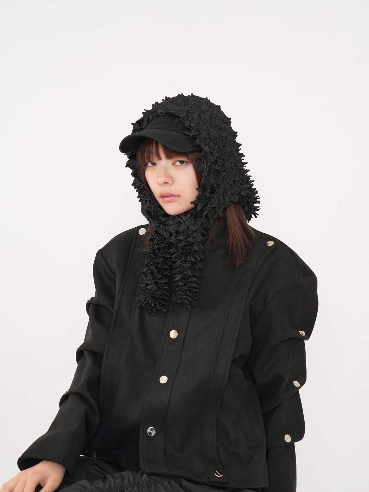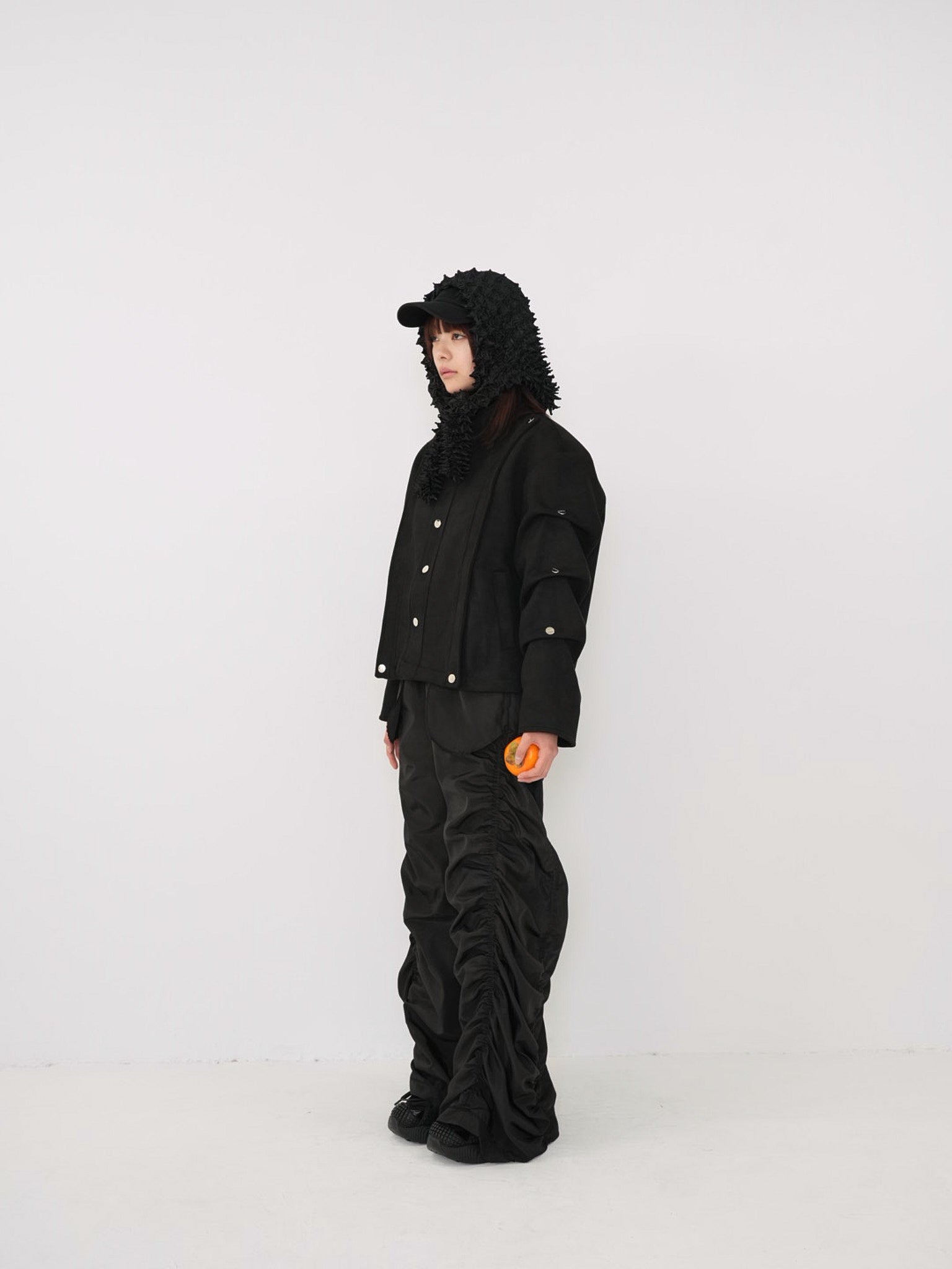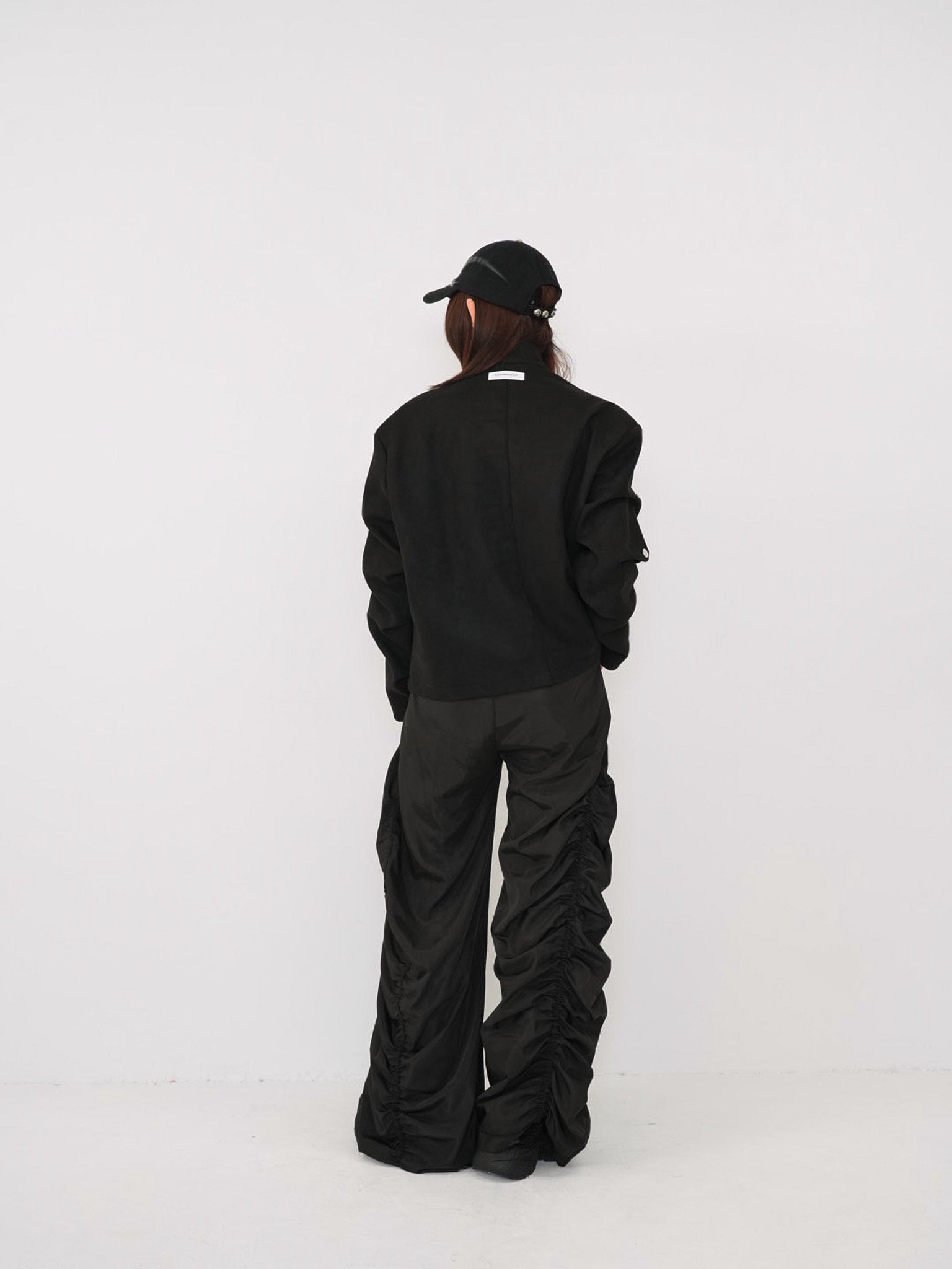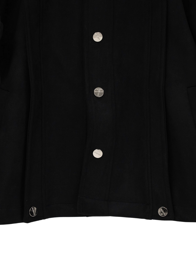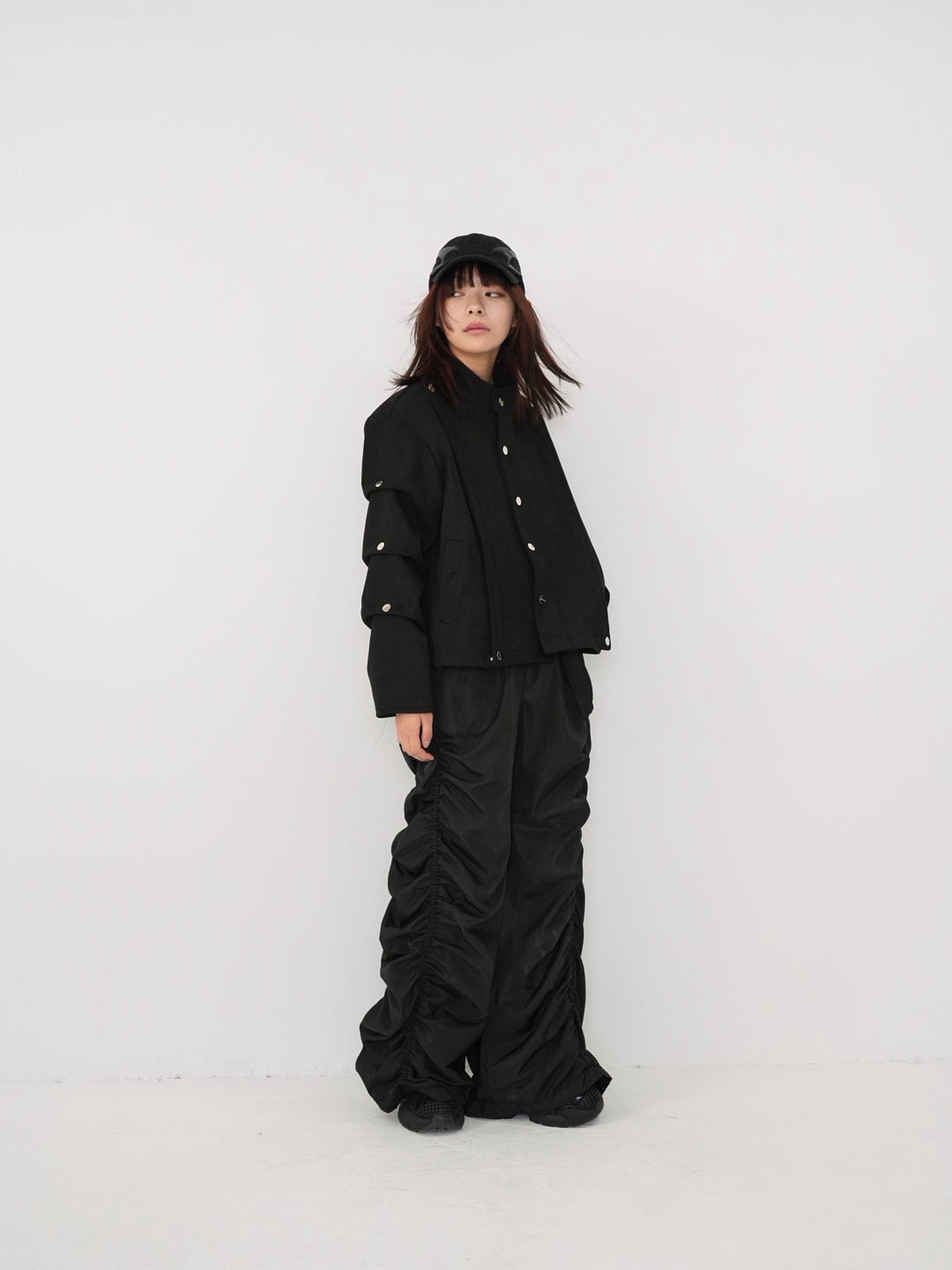 立体感のある構築的なシルエットが特徴のショート丈アウター。フロントのメタルボタンが程よいアクセントになり、ミニマルながら存在感のある仕上がり。袖部分のディテールが動きを加え、羽織るだけでスタイリングを引き締める一着。