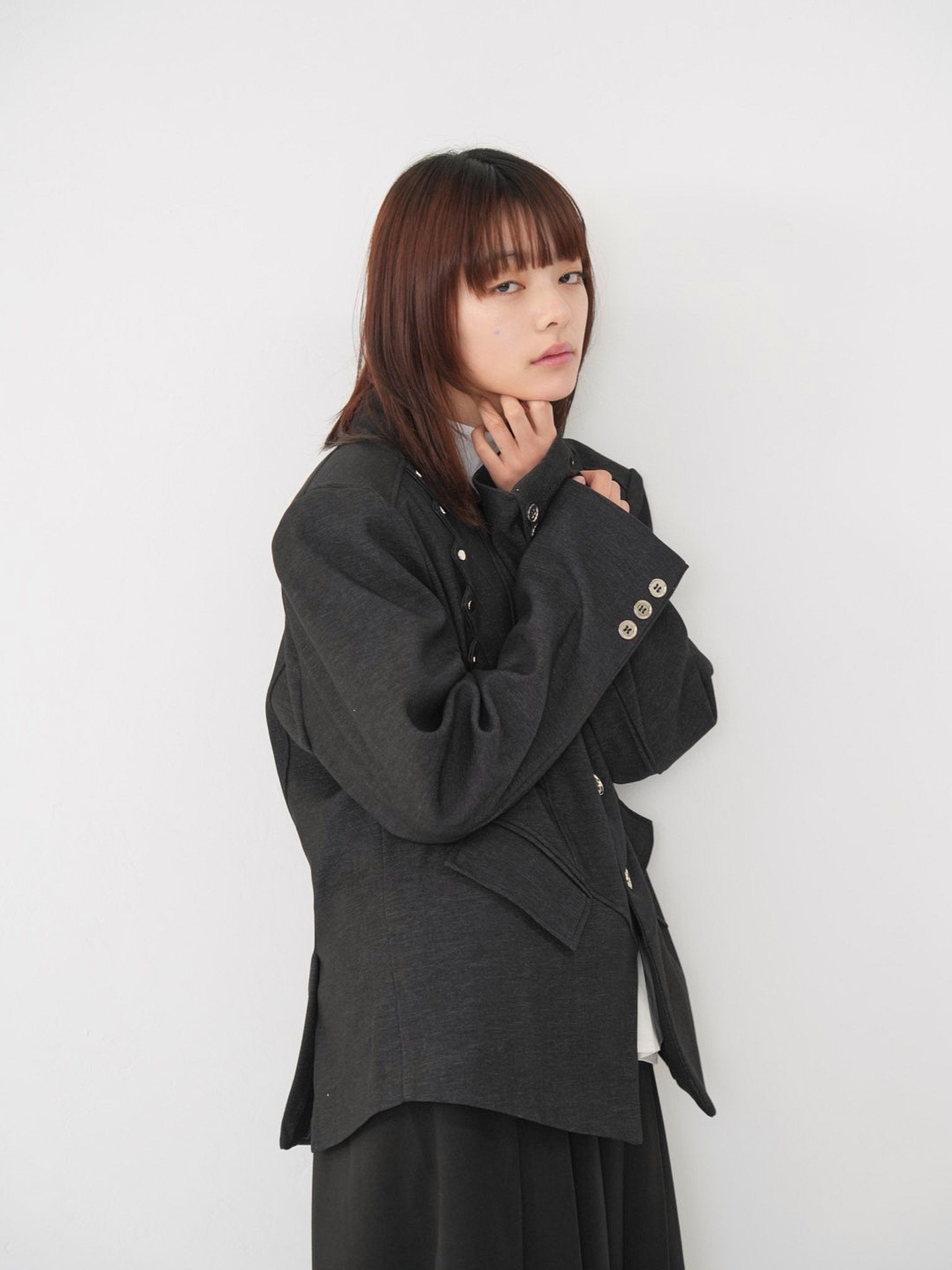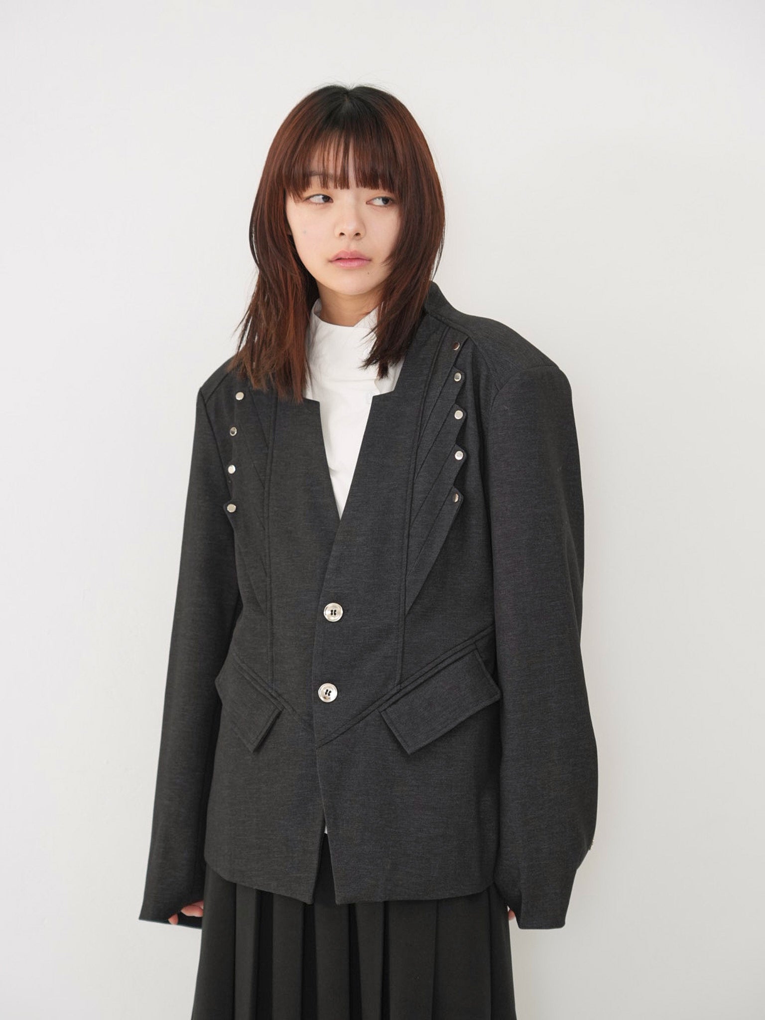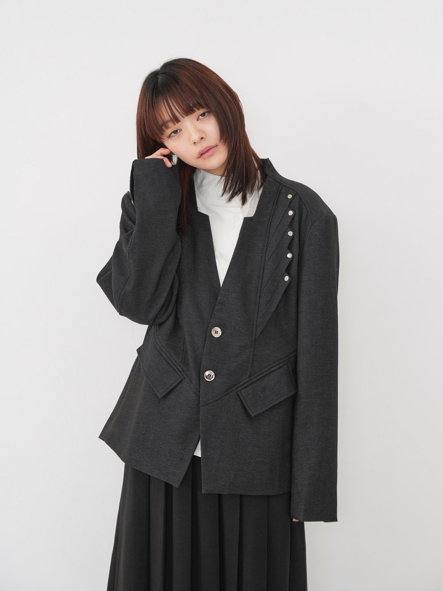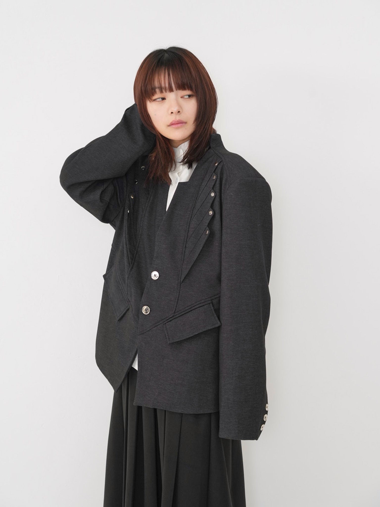 構築的なフォルムと計算されたレイヤードデザインが特徴のアウター。フロントのディテールが視線を縦に流し、自然とスタイルアップを叶える。シャープさの中に余白を残し、着る人の個性を引き立てる一着。
