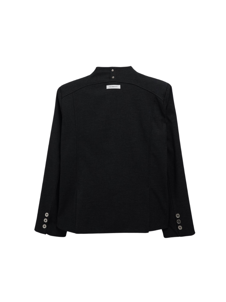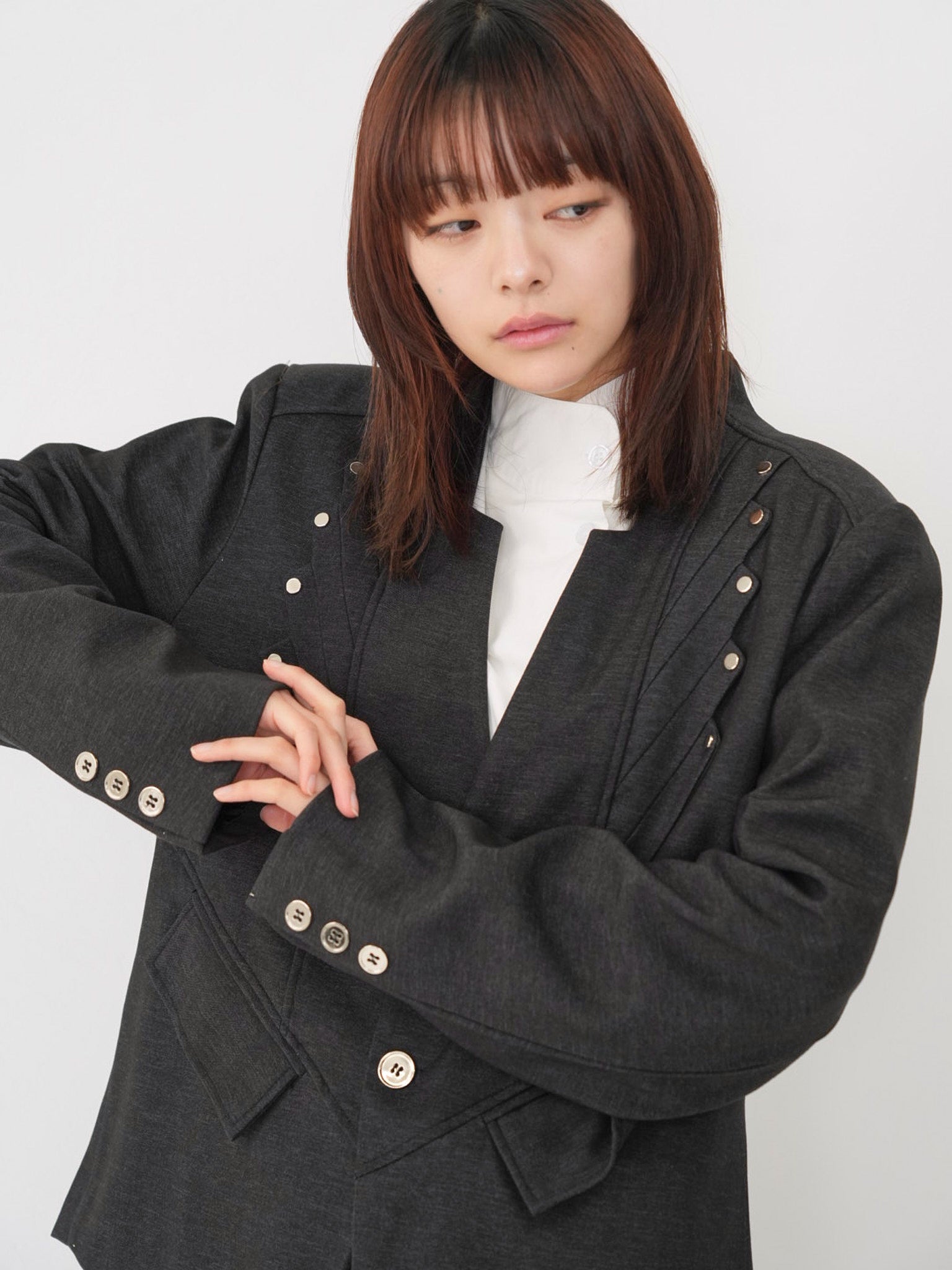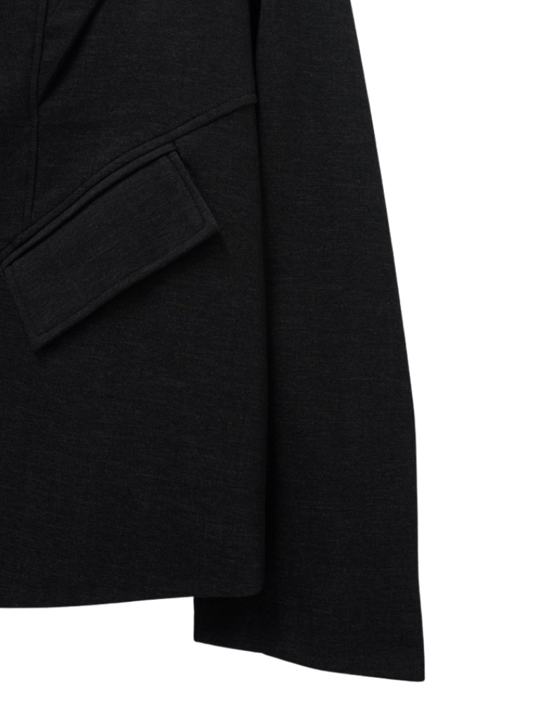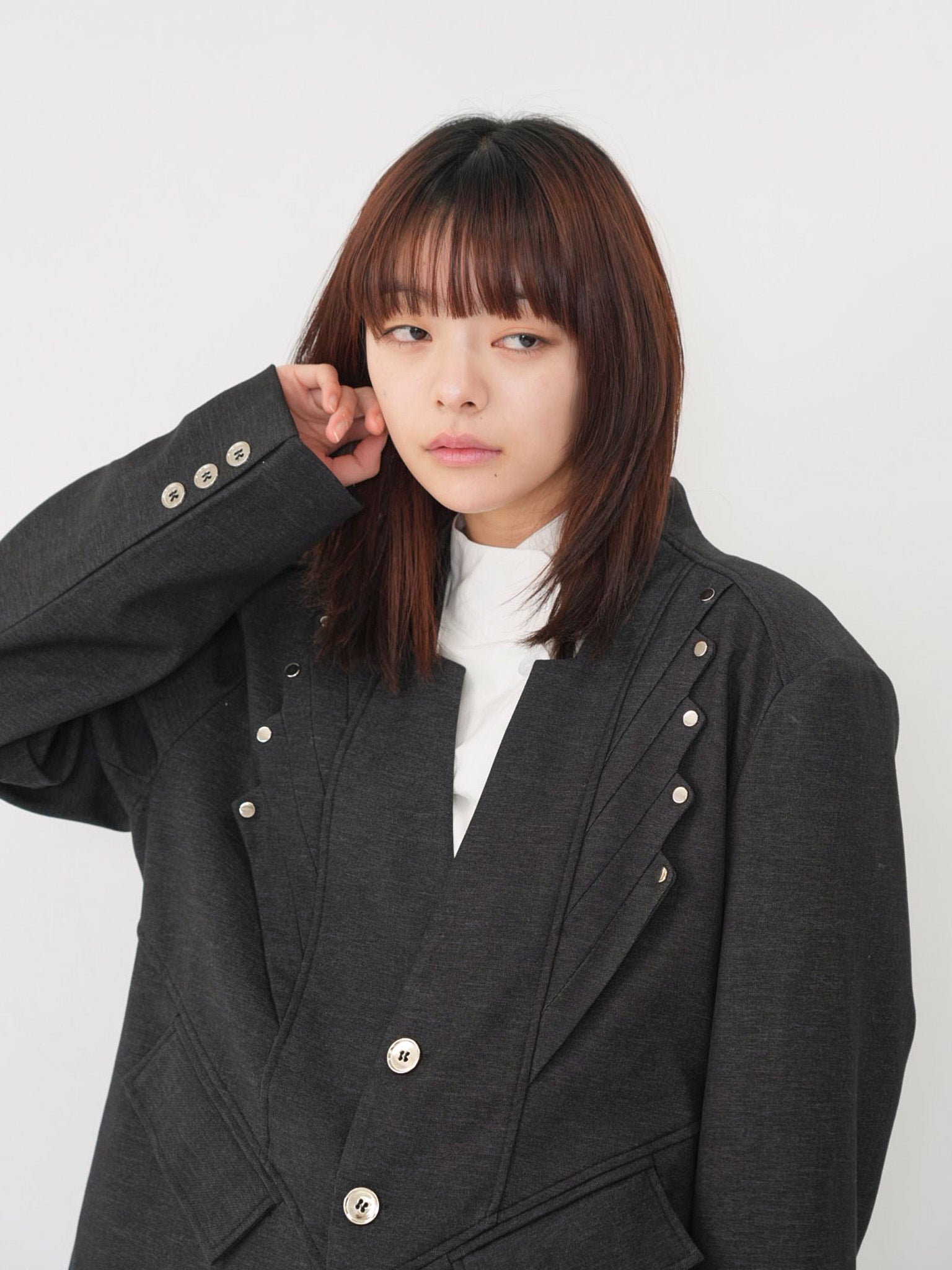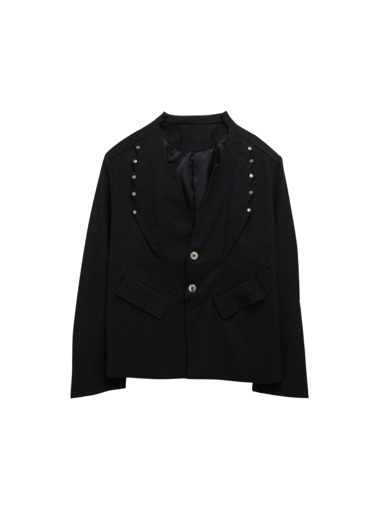 構築的なフォルムと計算されたレイヤードデザインが特徴のアウター。フロントのディテールが視線を縦に流し、自然とスタイルアップを叶える。シャープさの中に余白を残し、着る人の個性を引き立てる一着。