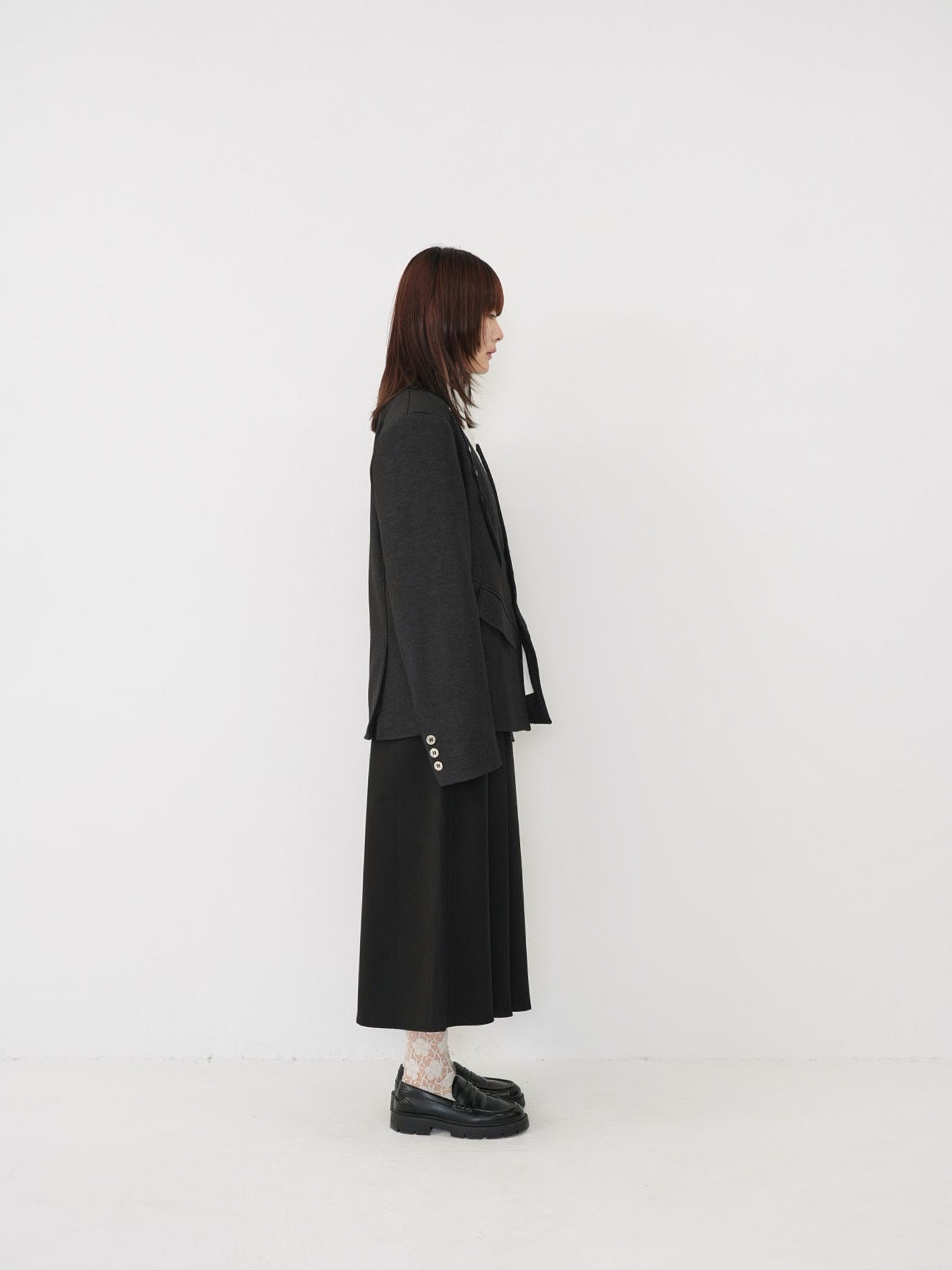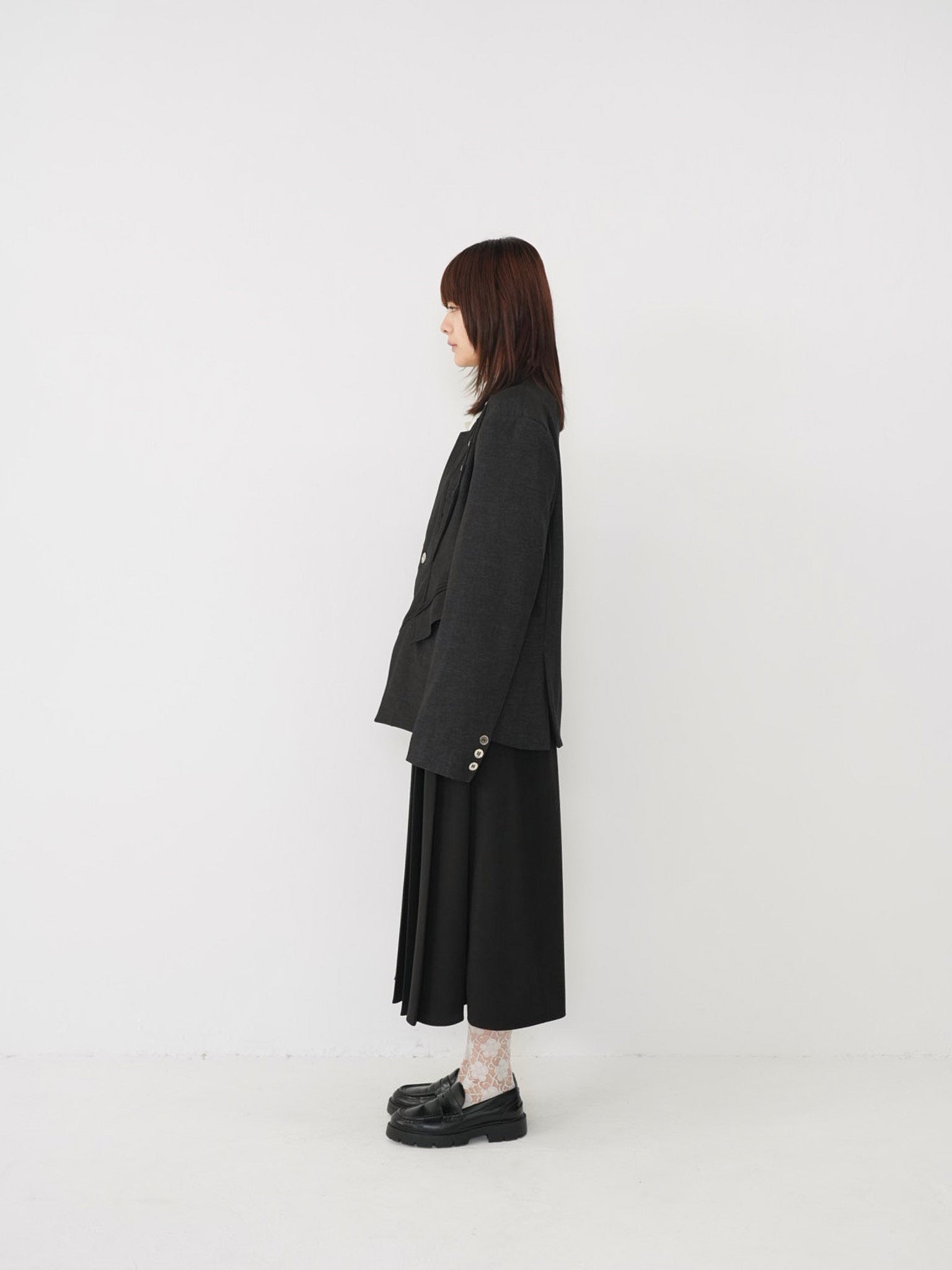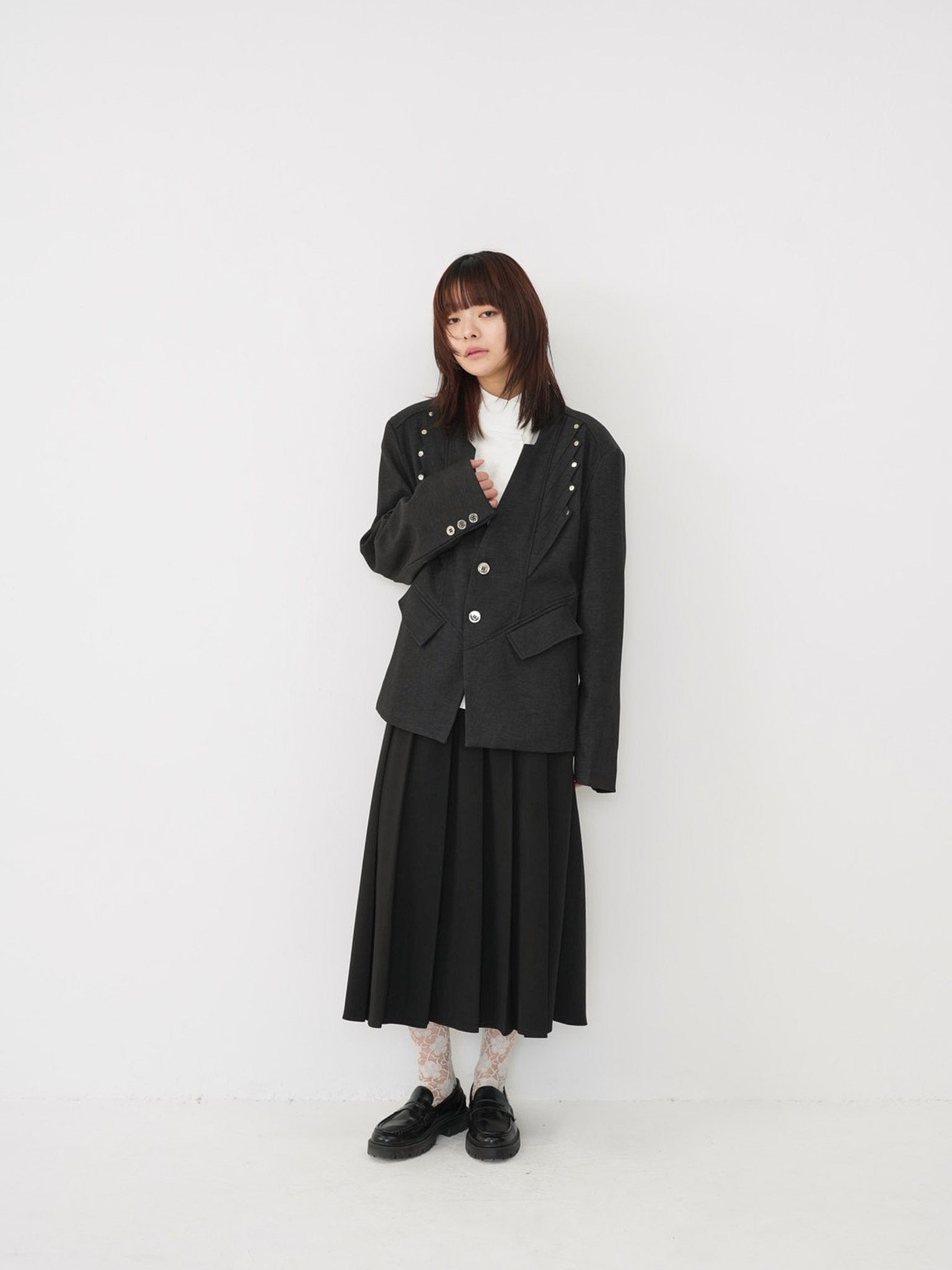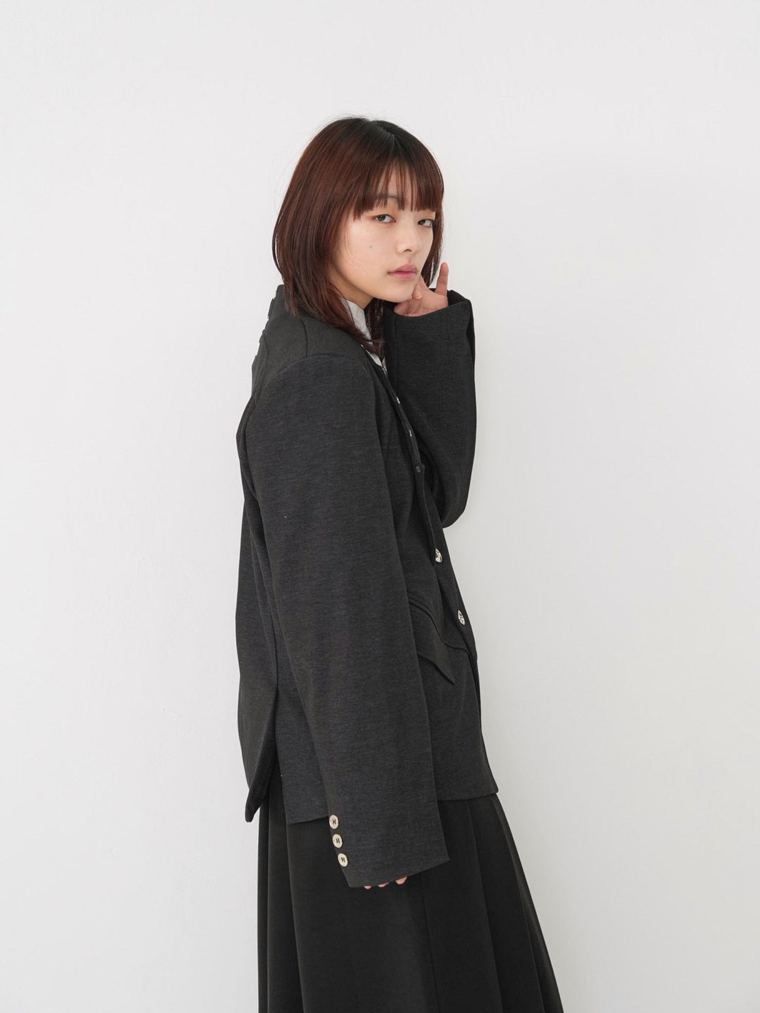 構築的なフォルムと計算されたレイヤードデザインが特徴のアウター。フロントのディテールが視線を縦に流し、自然とスタイルアップを叶える。シャープさの中に余白を残し、着る人の個性を引き立てる一着。