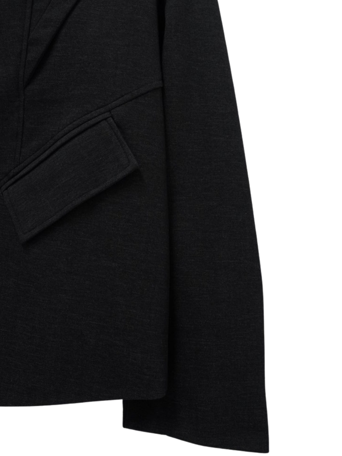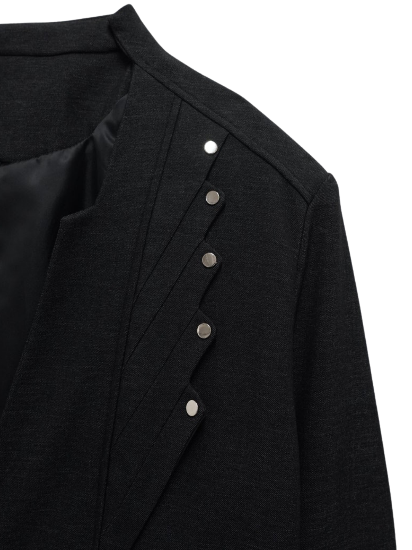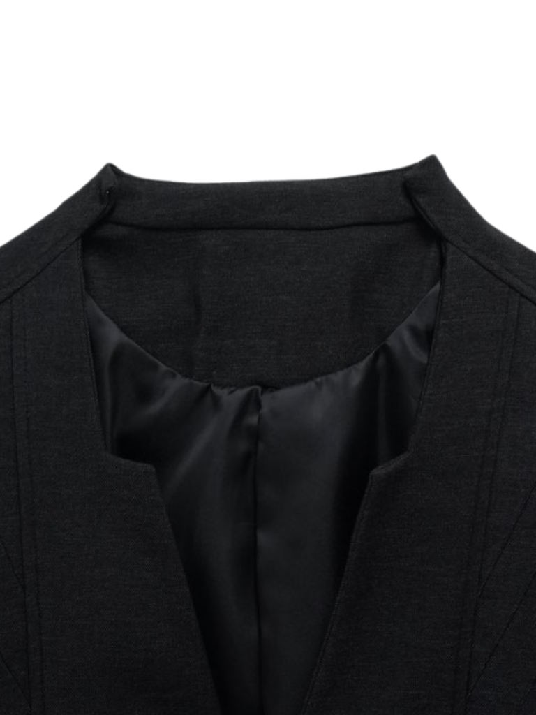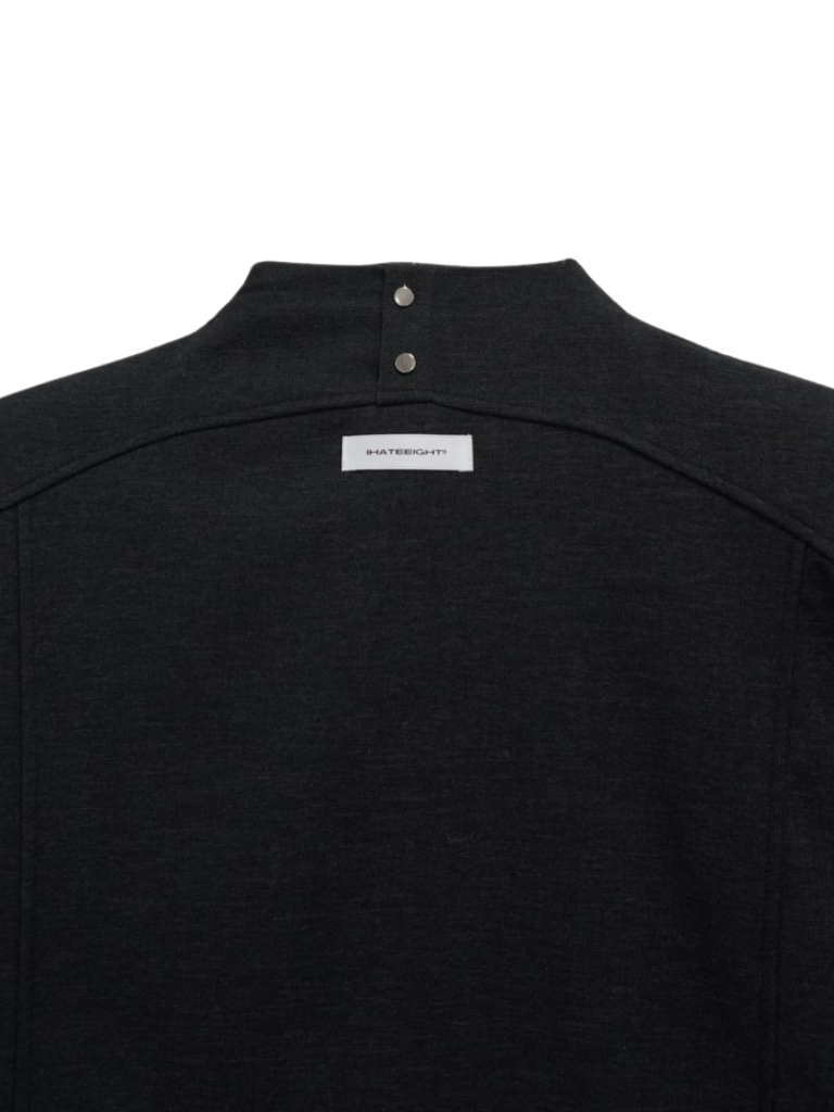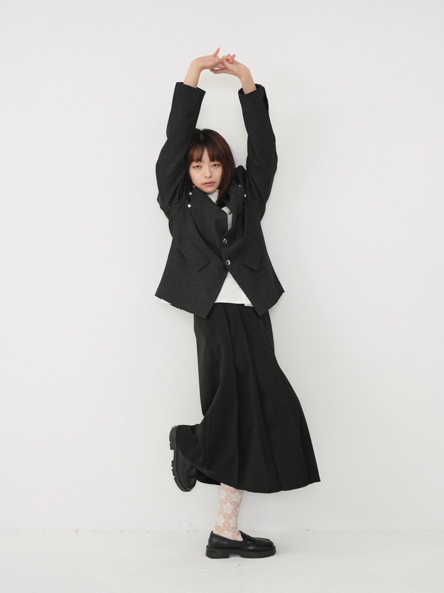 構築的なフォルムと計算されたレイヤードデザインが特徴のアウター。フロントのディテールが視線を縦に流し、自然とスタイルアップを叶える。シャープさの中に余白を残し、着る人の個性を引き立てる一着。