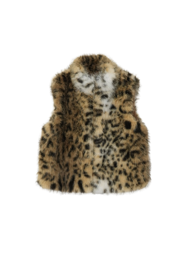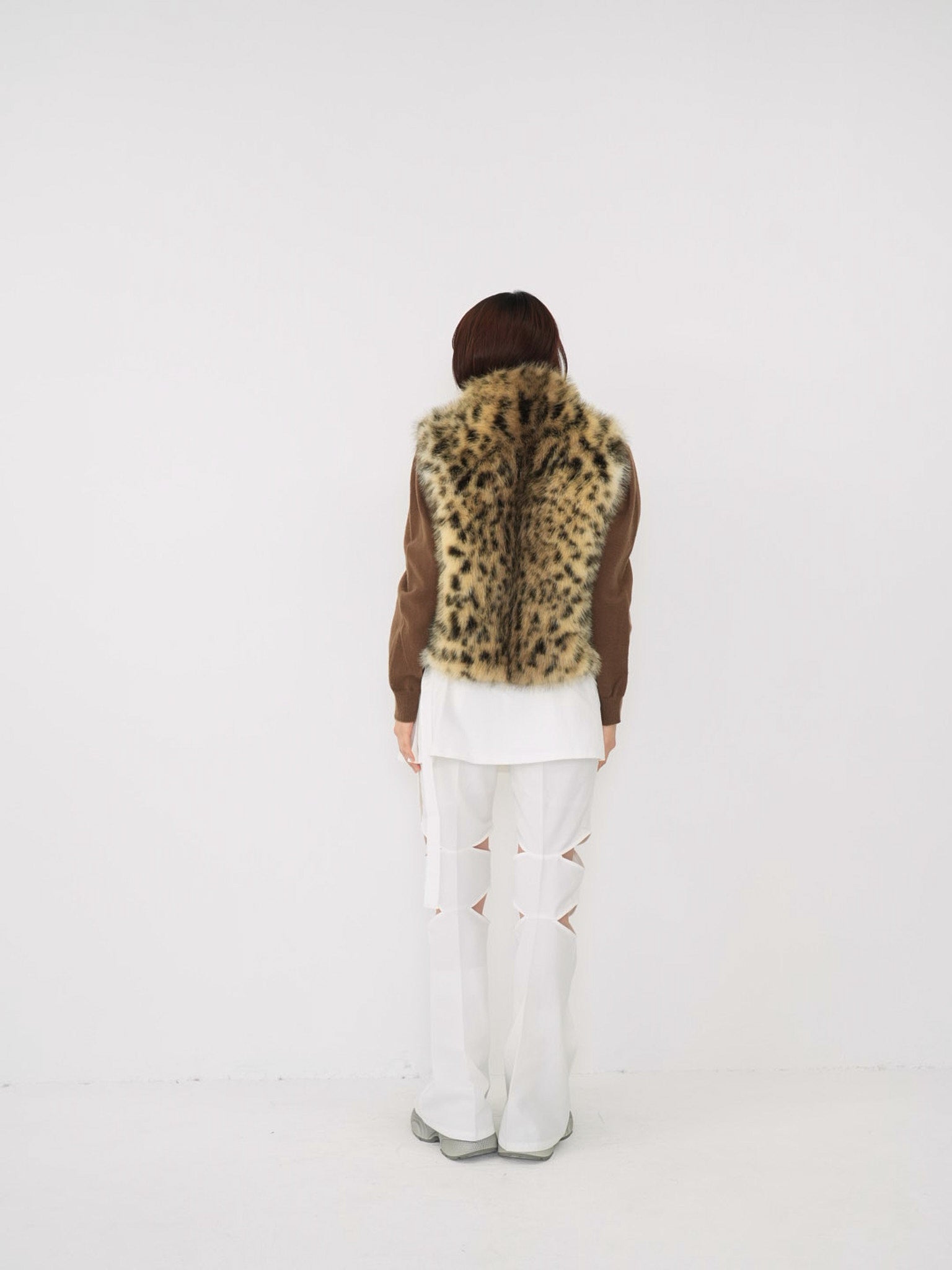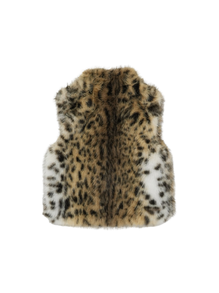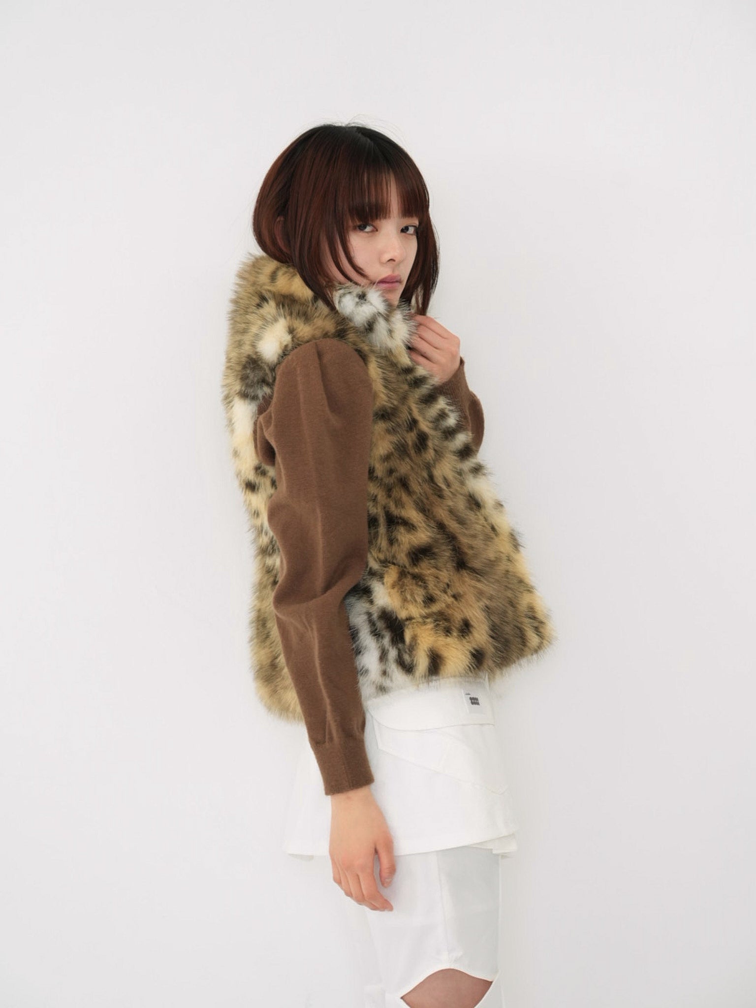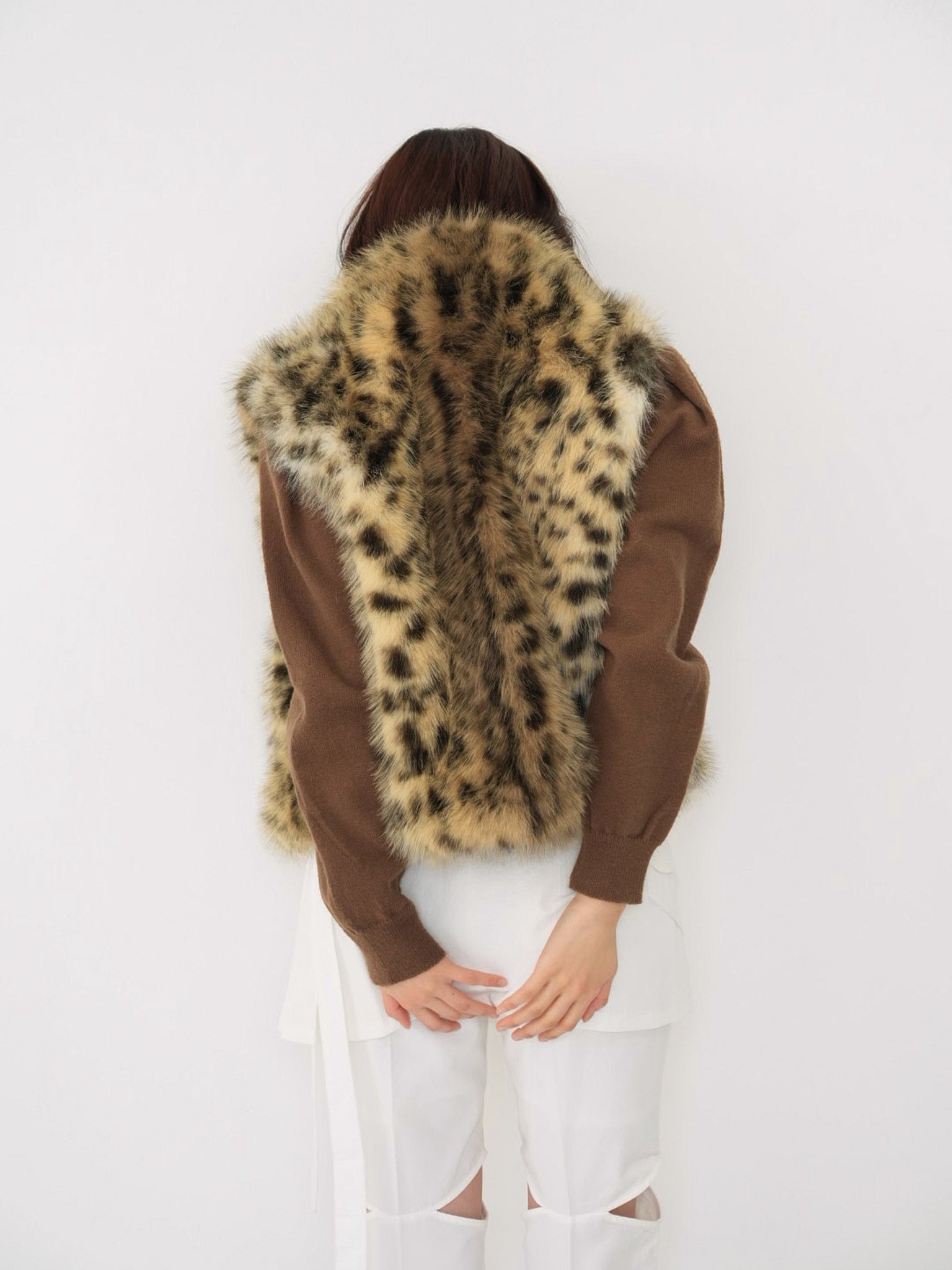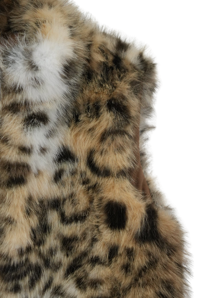 毛足のあるフェイクファー素材を使用したノースリーブアウター。立体感のあるアニマル調の柄がコーディネートの主役になり、羽織るだけで強い印象を残す。秋冬に特化した存在感のある一着で、シンプルなスタイリングにエッジと遊び心を加えます。