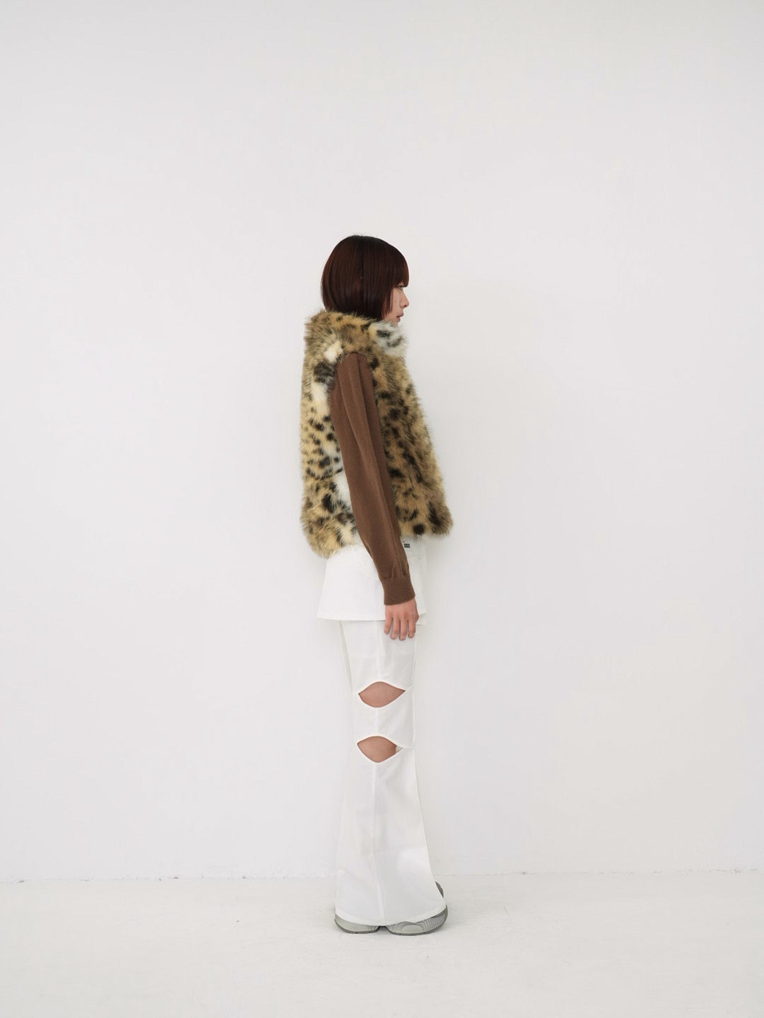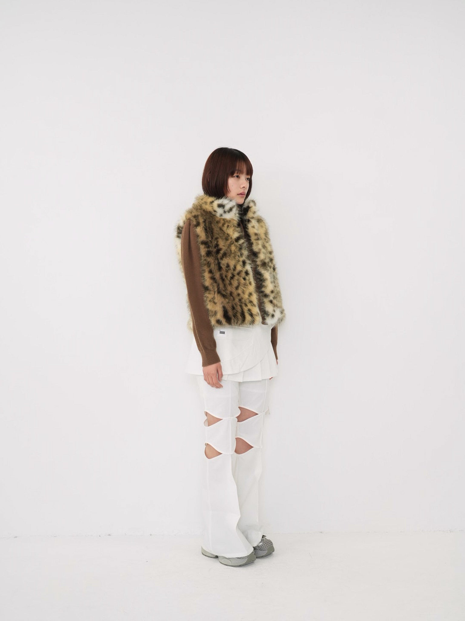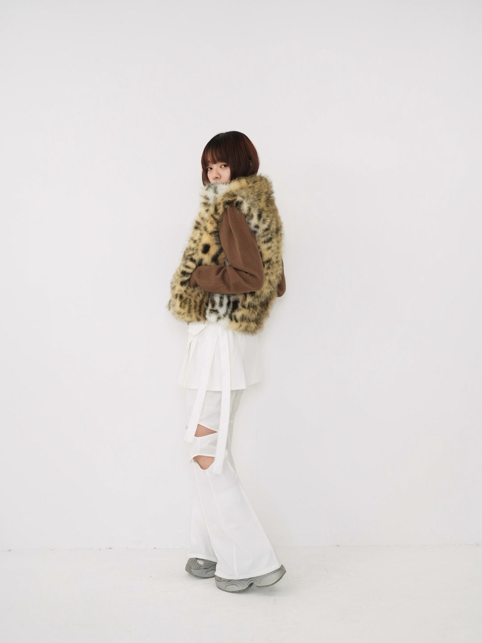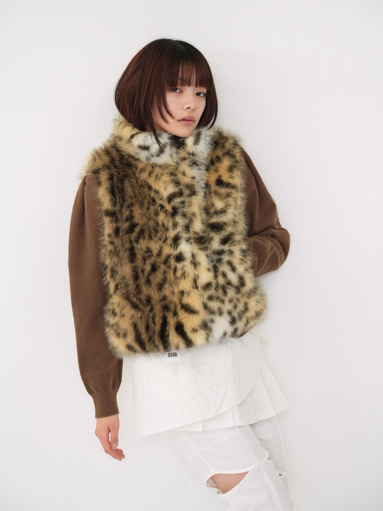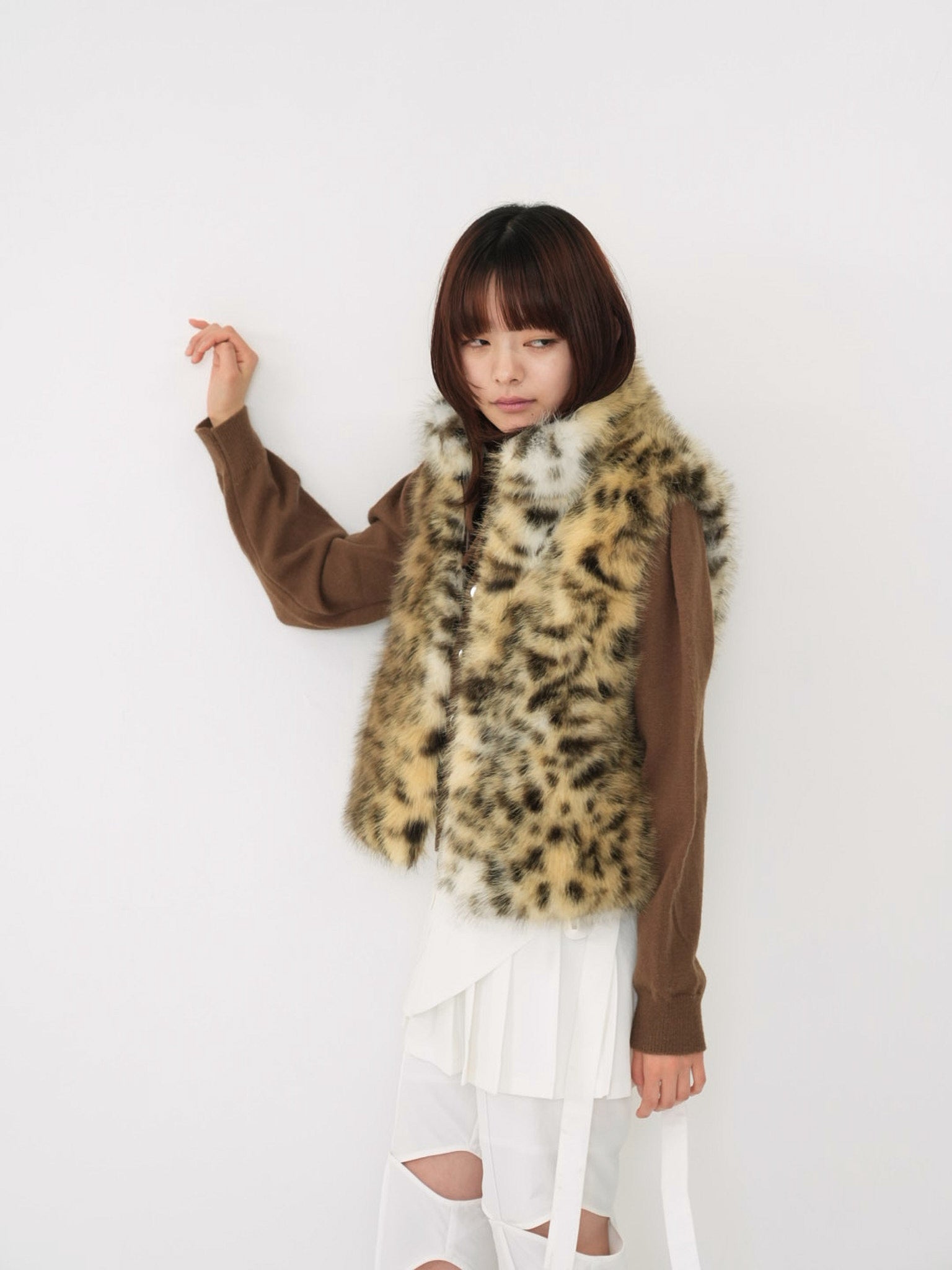 毛足のあるフェイクファー素材を使用したノースリーブアウター。立体感のあるアニマル調の柄がコーディネートの主役になり、羽織るだけで強い印象を残す。秋冬に特化した存在感のある一着で、シンプルなスタイリングにエッジと遊び心を加えます。