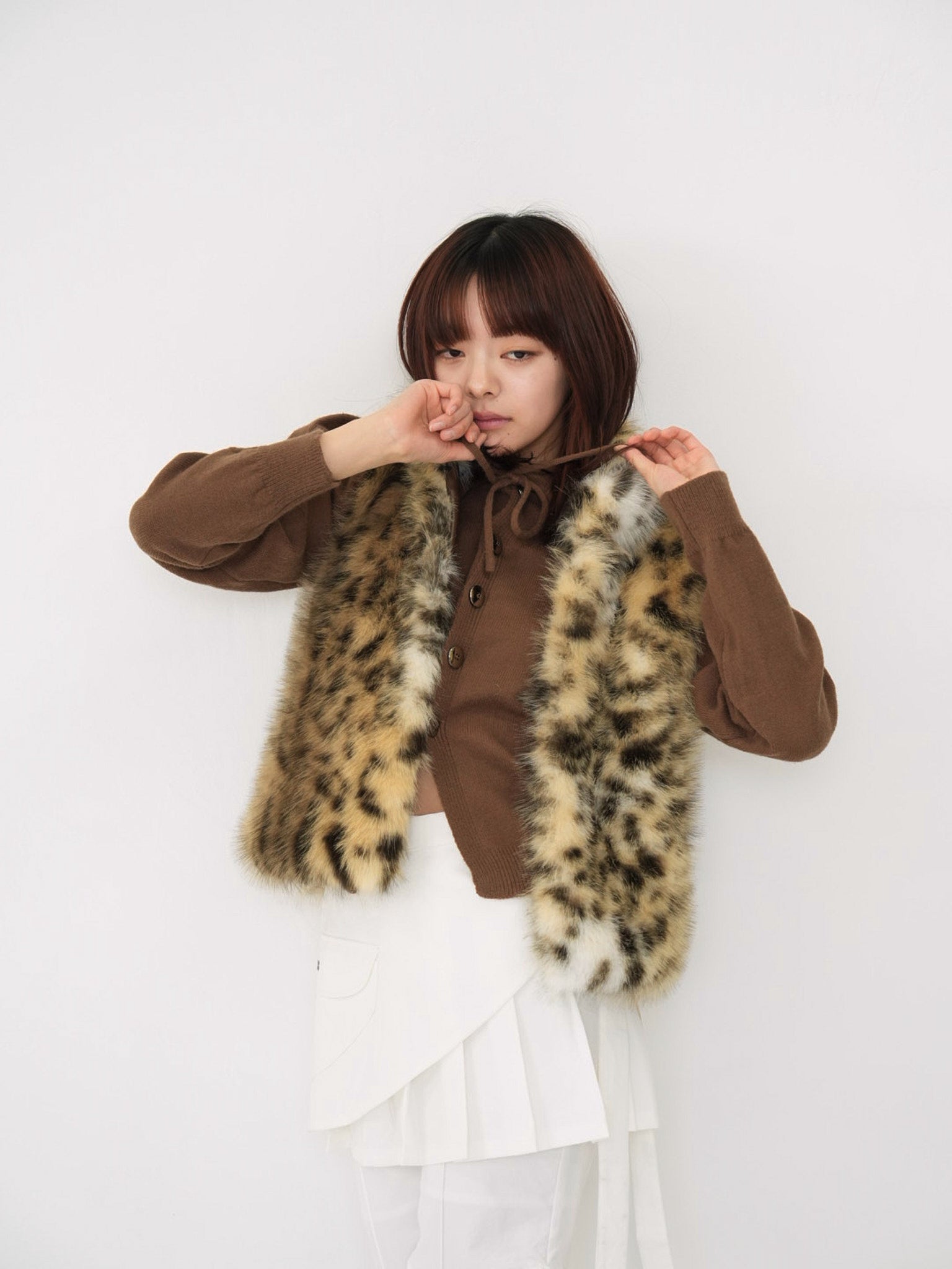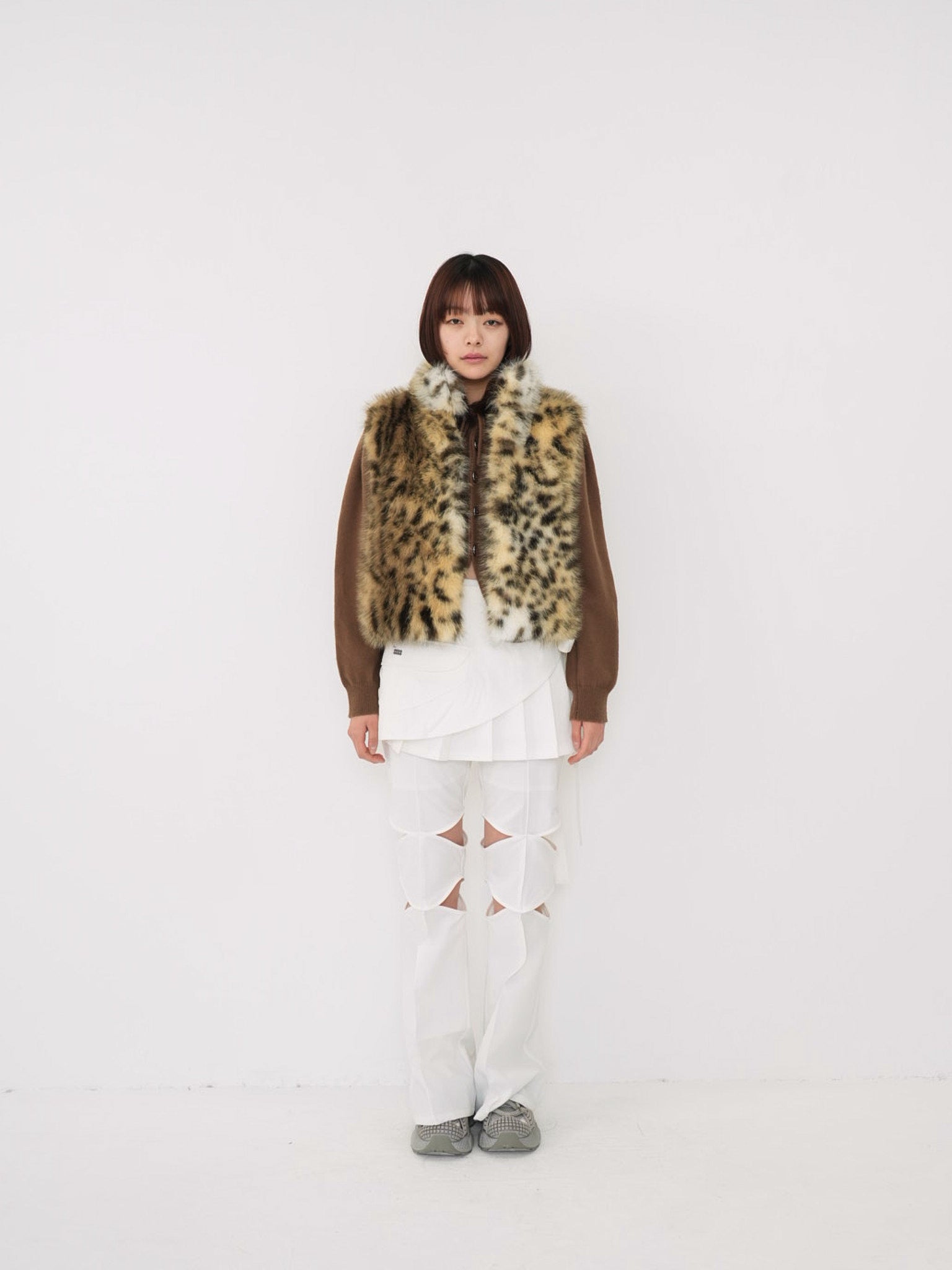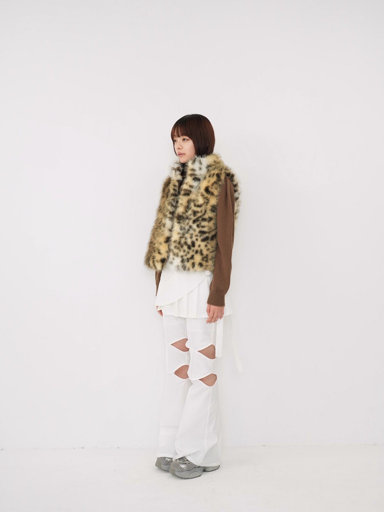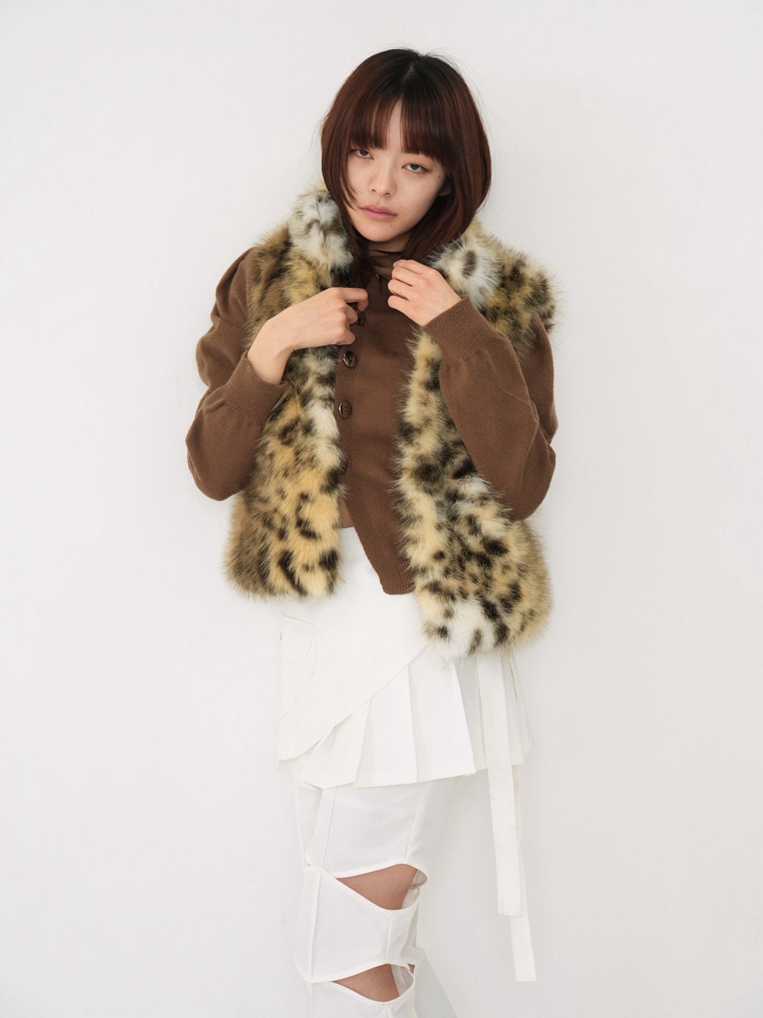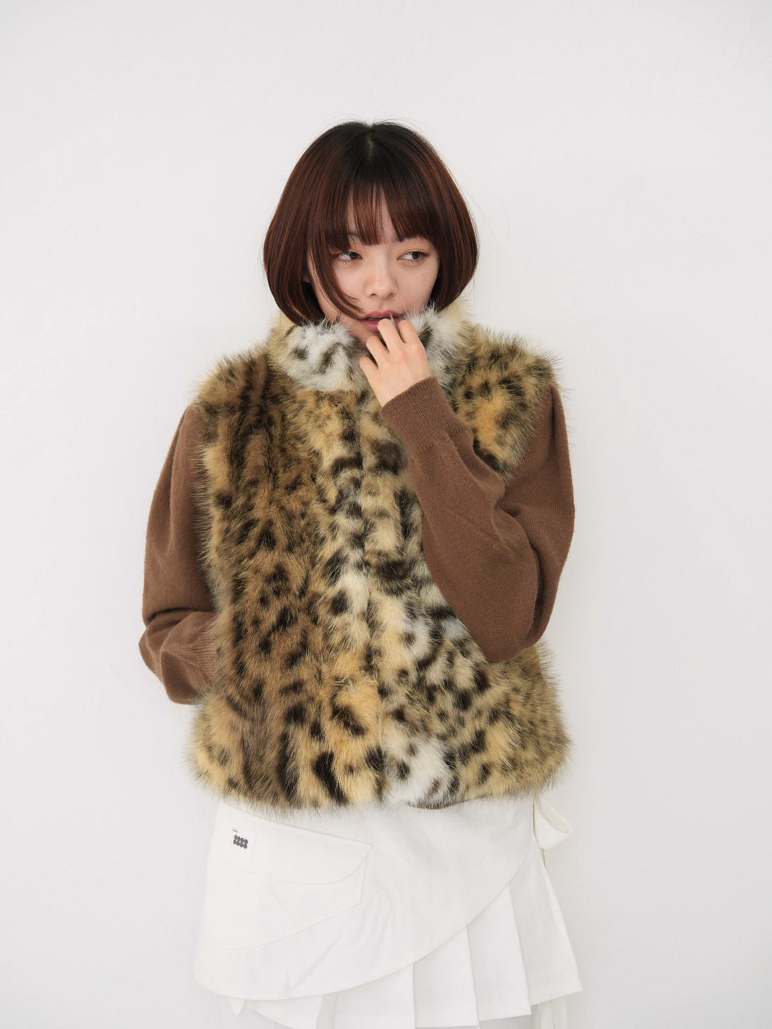 毛足のあるフェイクファー素材を使用したノースリーブアウター。立体感のあるアニマル調の柄がコーディネートの主役になり、羽織るだけで強い印象を残す。秋冬に特化した存在感のある一着で、シンプルなスタイリングにエッジと遊び心を加えます。