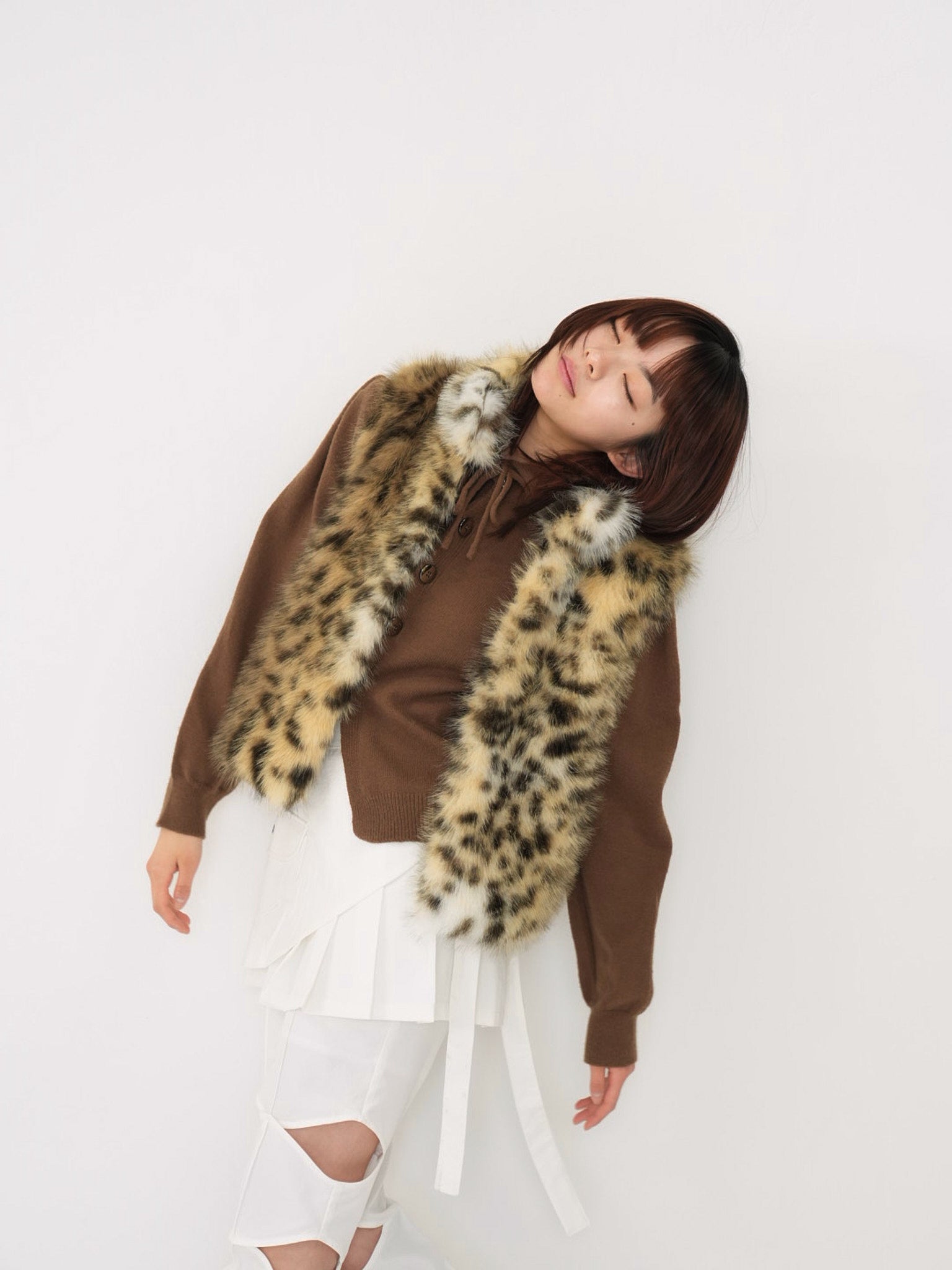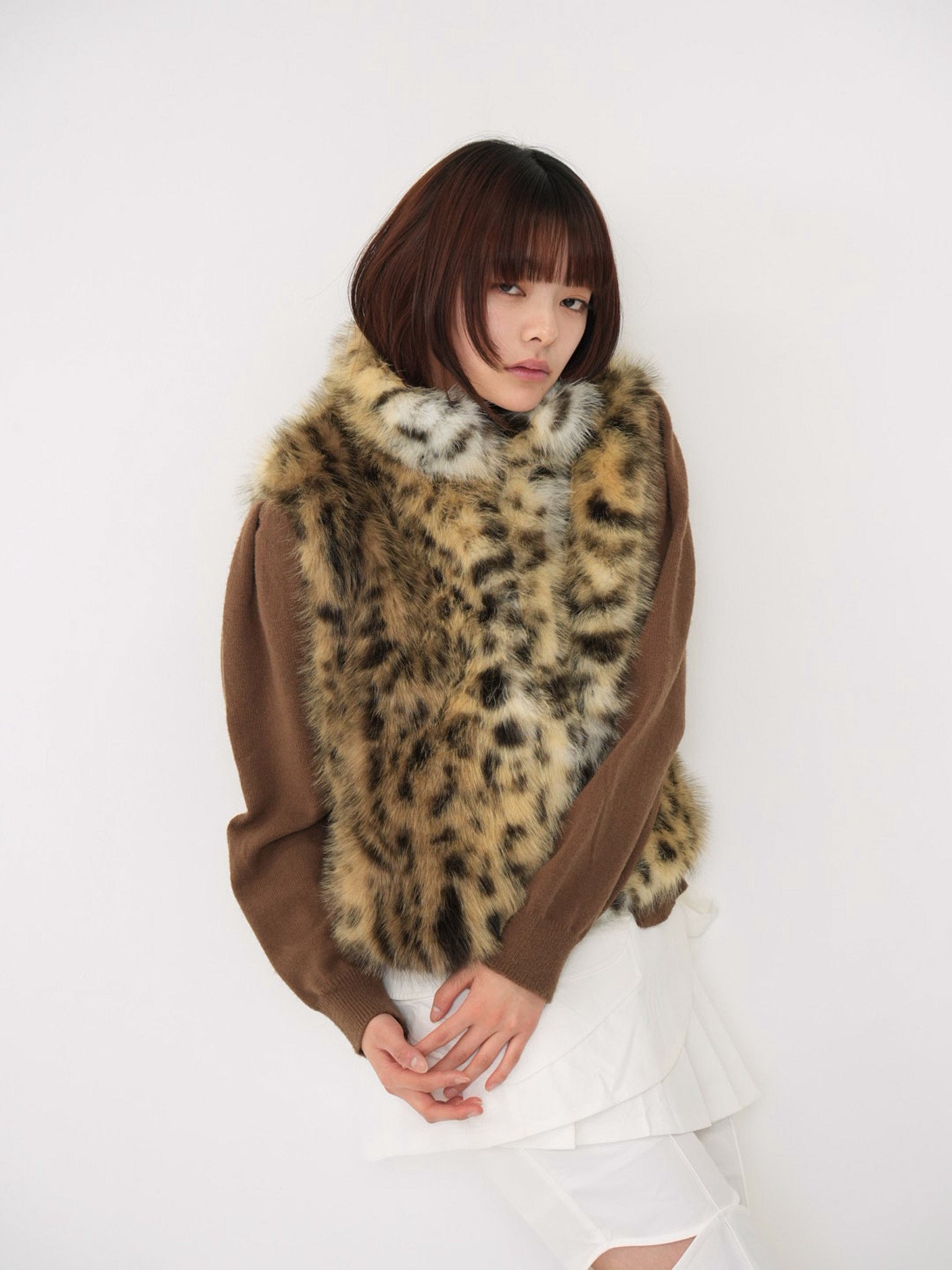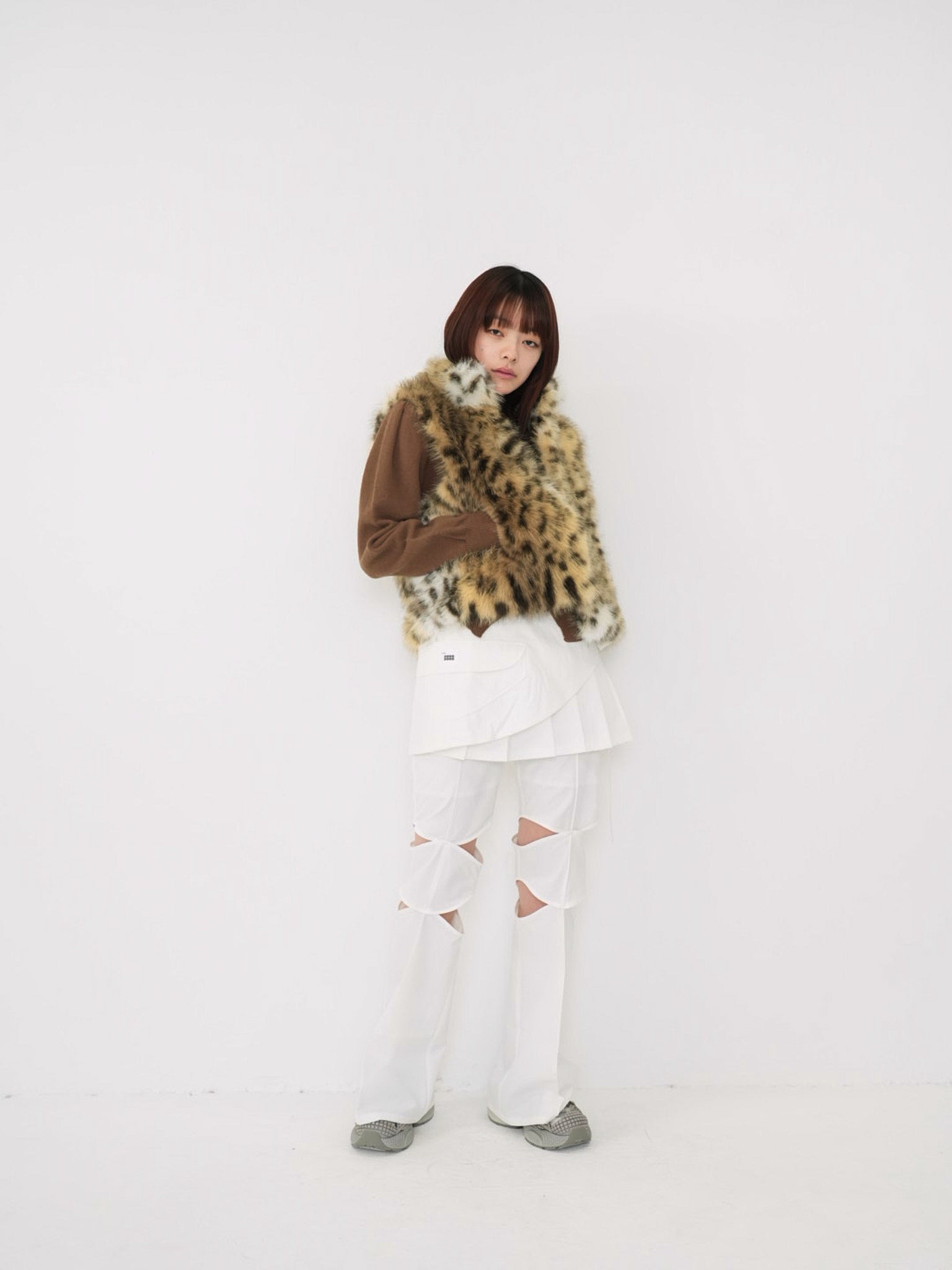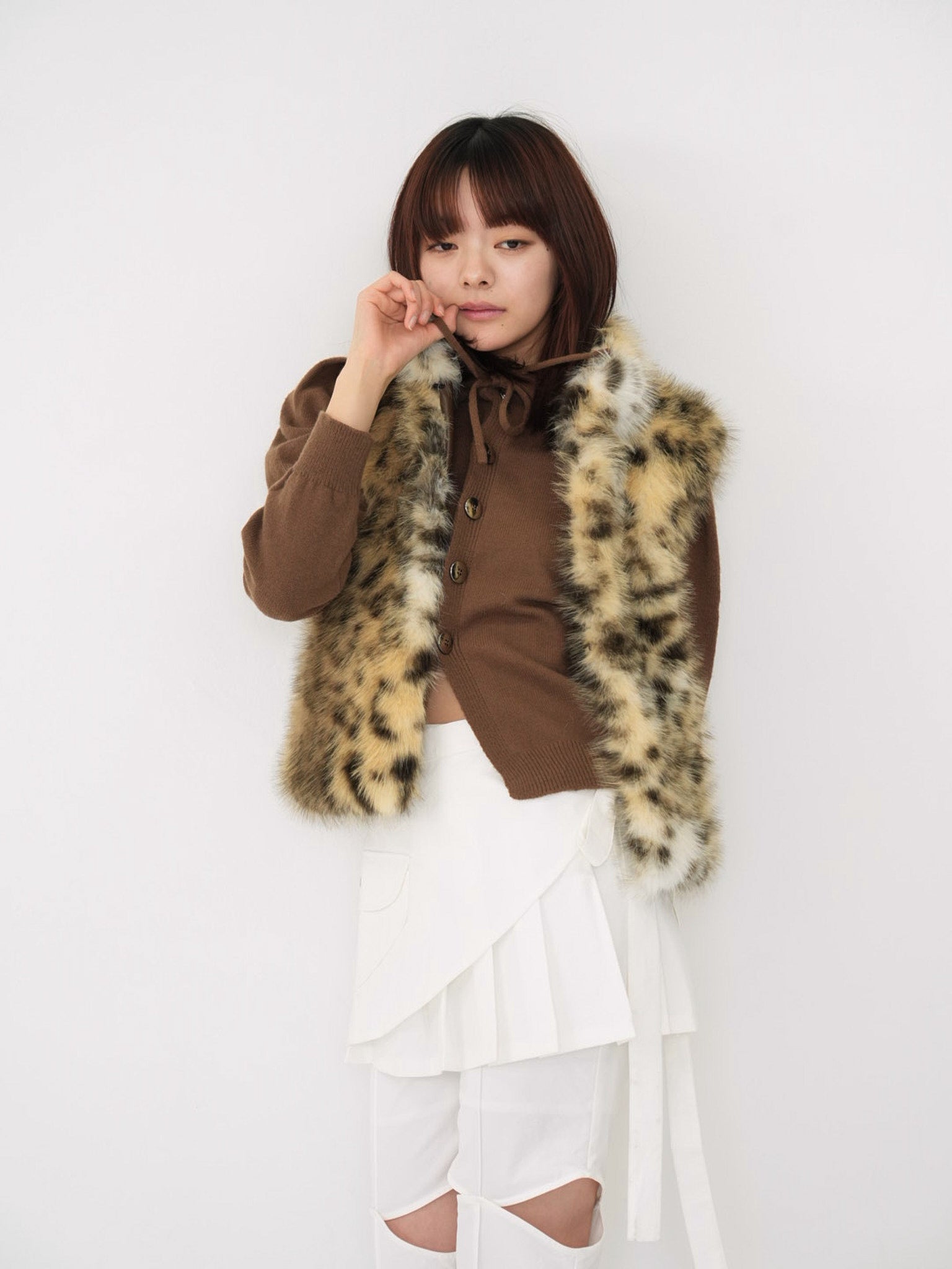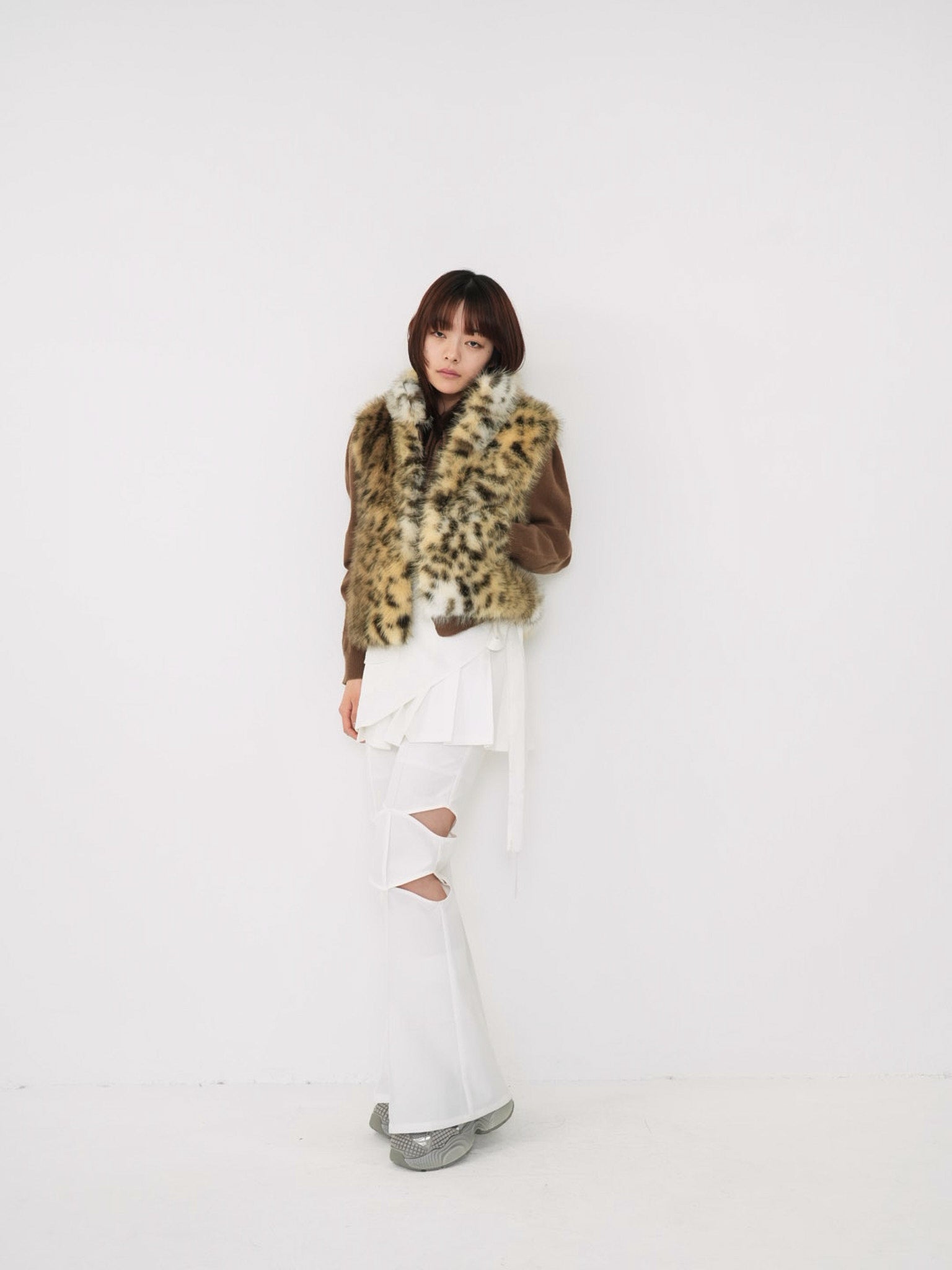 毛足のあるフェイクファー素材を使用したノースリーブアウター。立体感のあるアニマル調の柄がコーディネートの主役になり、羽織るだけで強い印象を残す。秋冬に特化した存在感のある一着で、シンプルなスタイリングにエッジと遊び心を加えます。