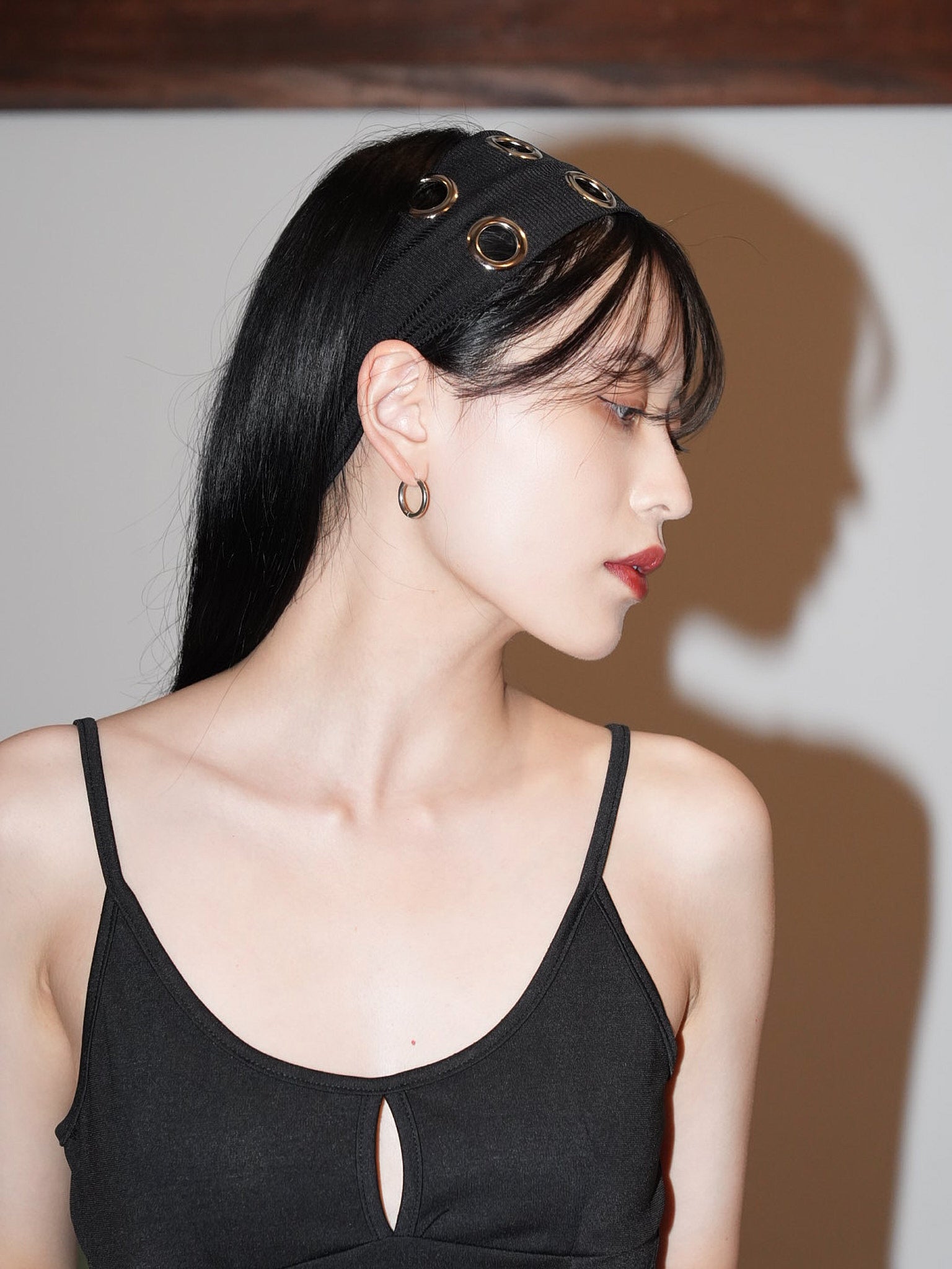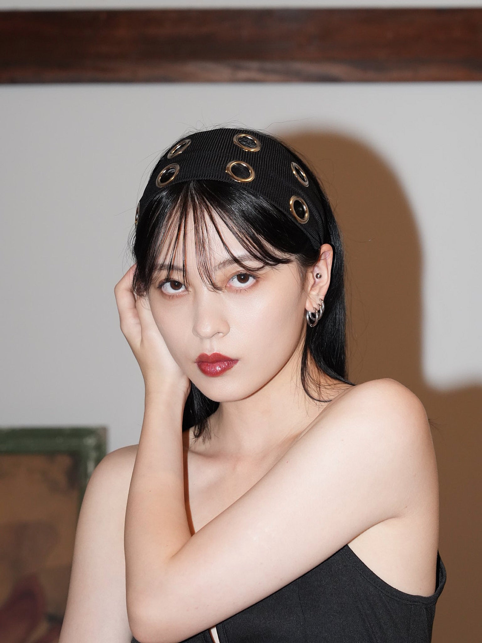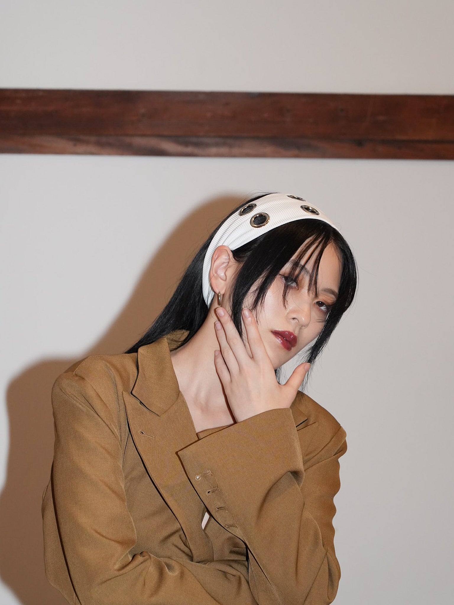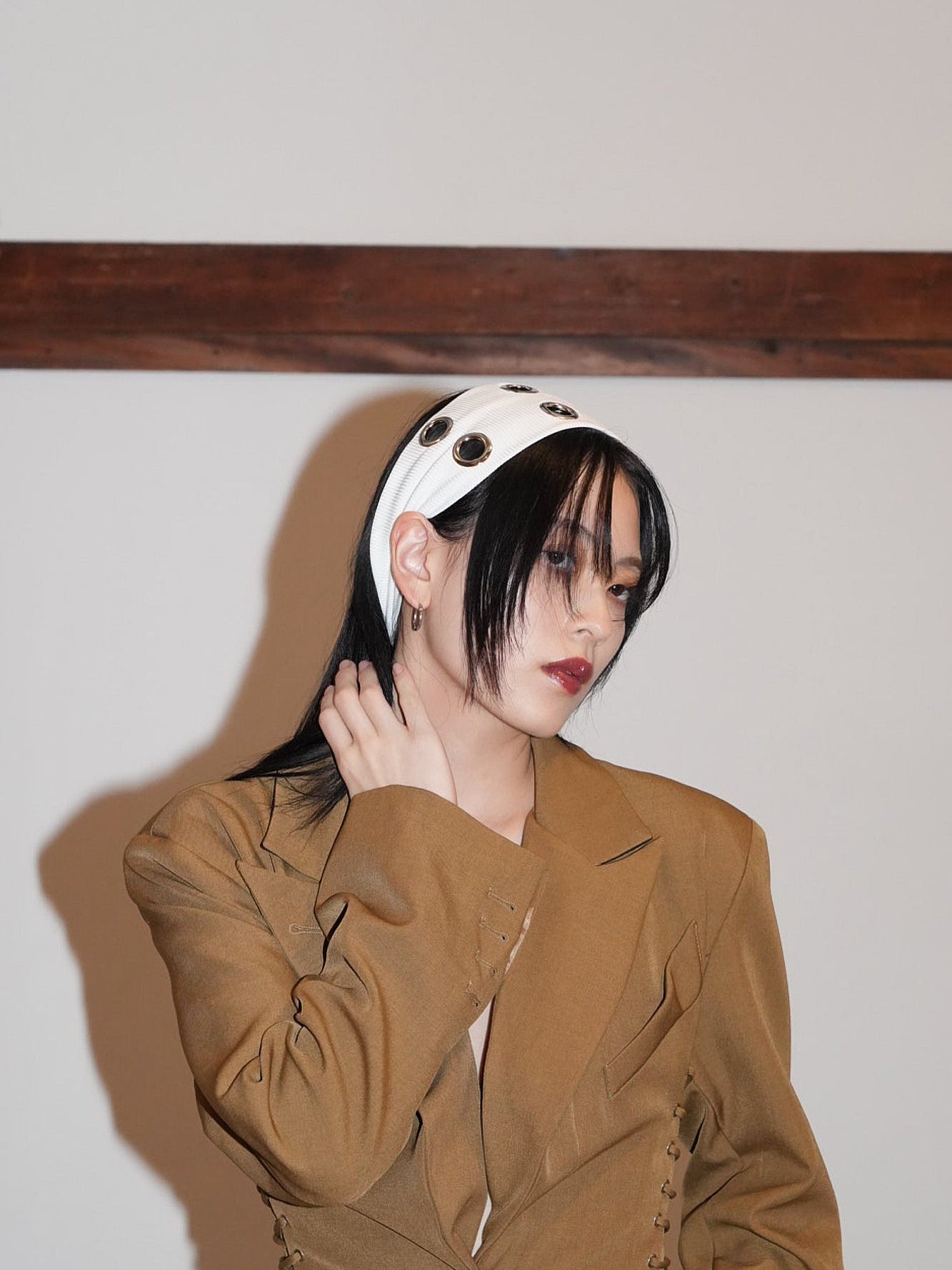 ボリュームヘアに映える太めのヘアバンドは、