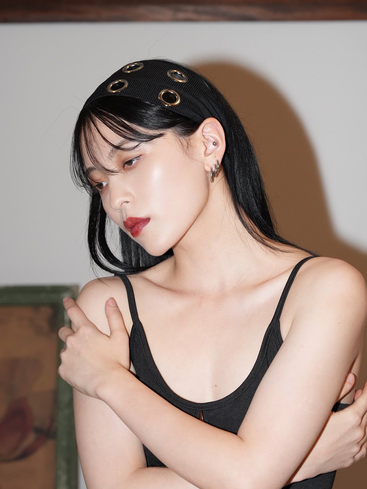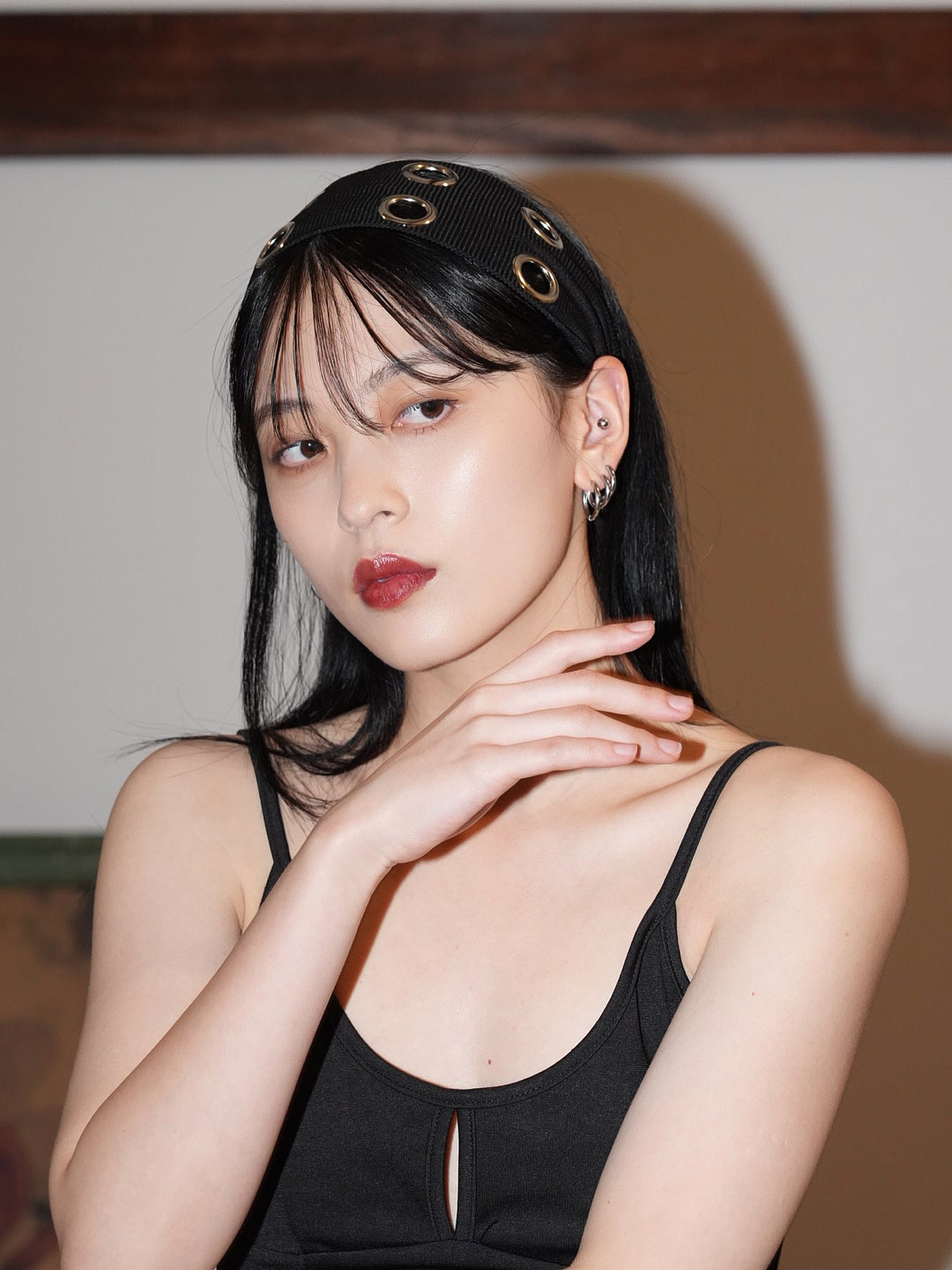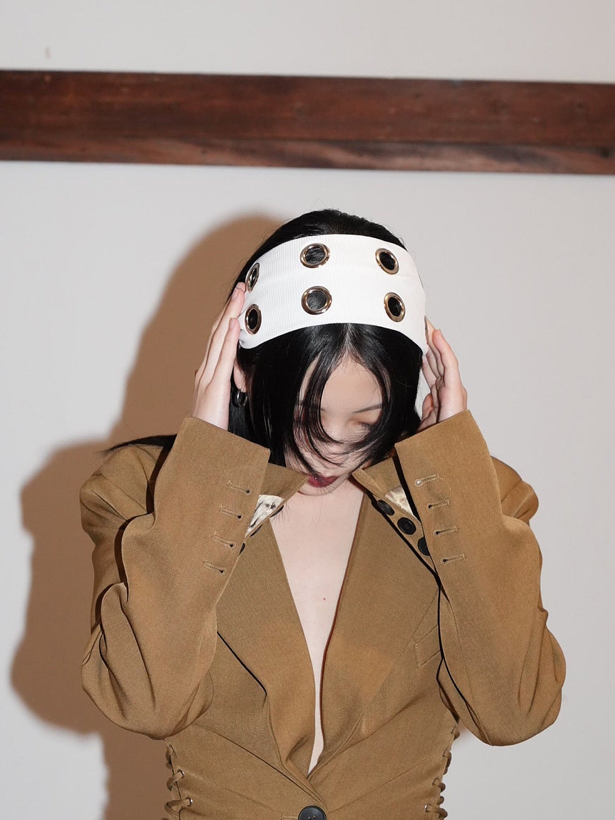 ボリュームヘアに映える太めのヘアバンドは、
