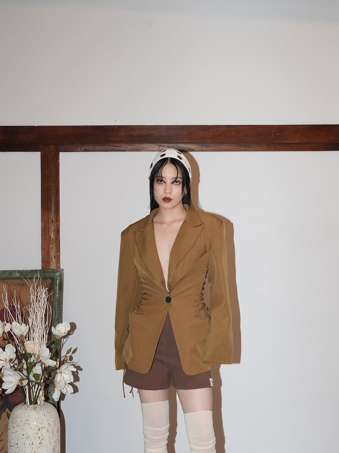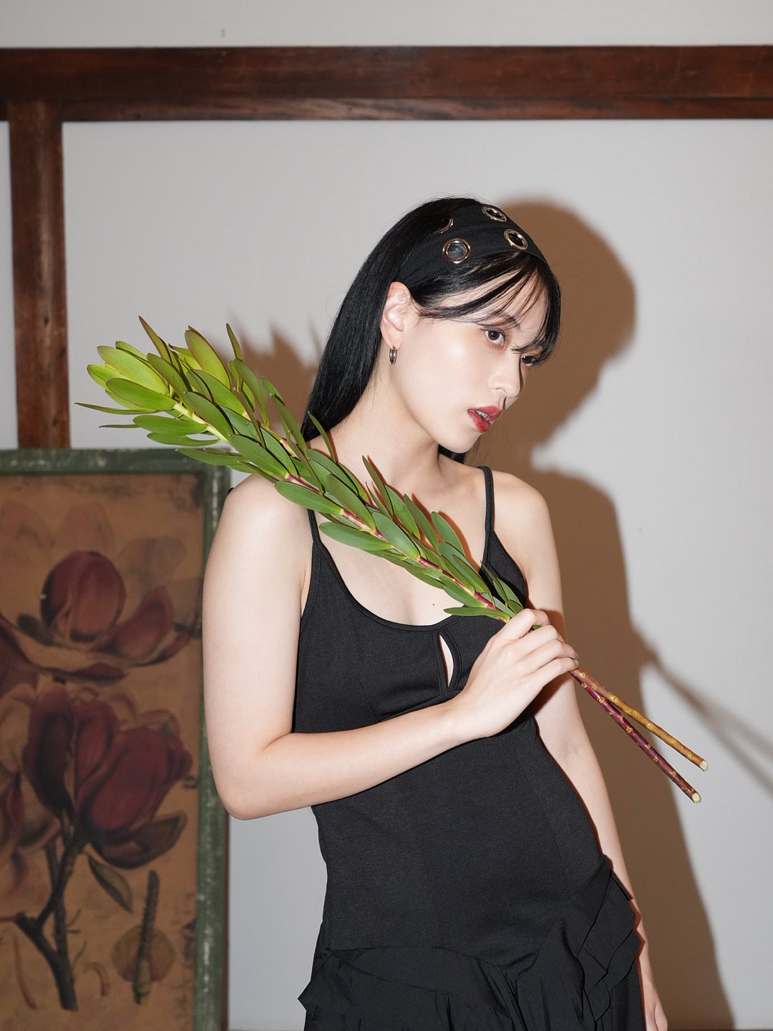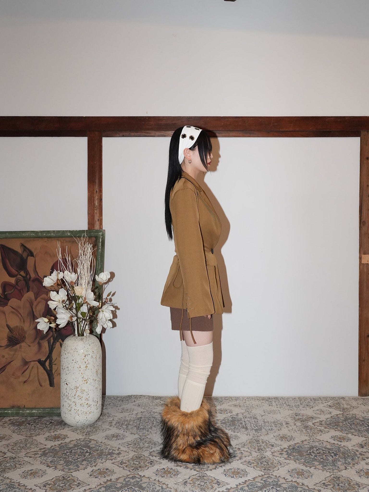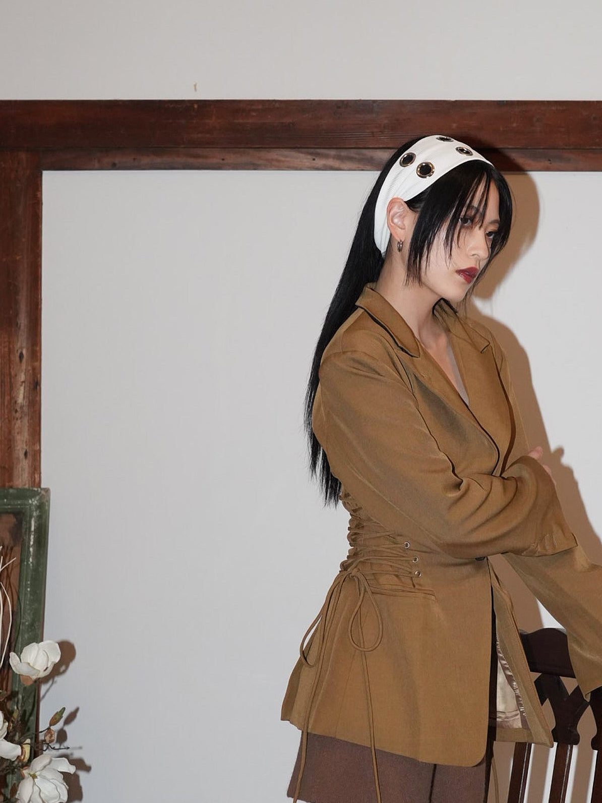 ボリュームヘアに映える太めのヘアバンドは、