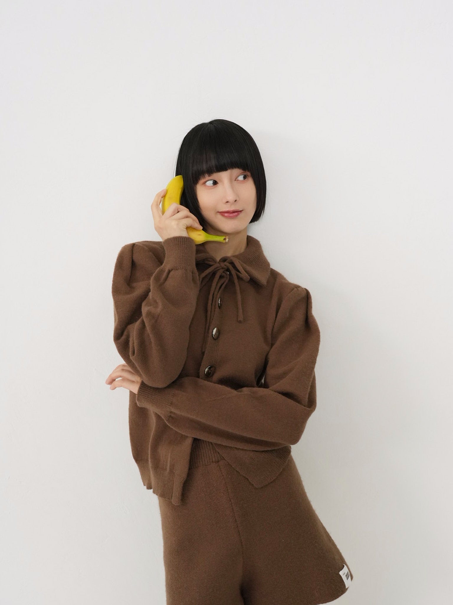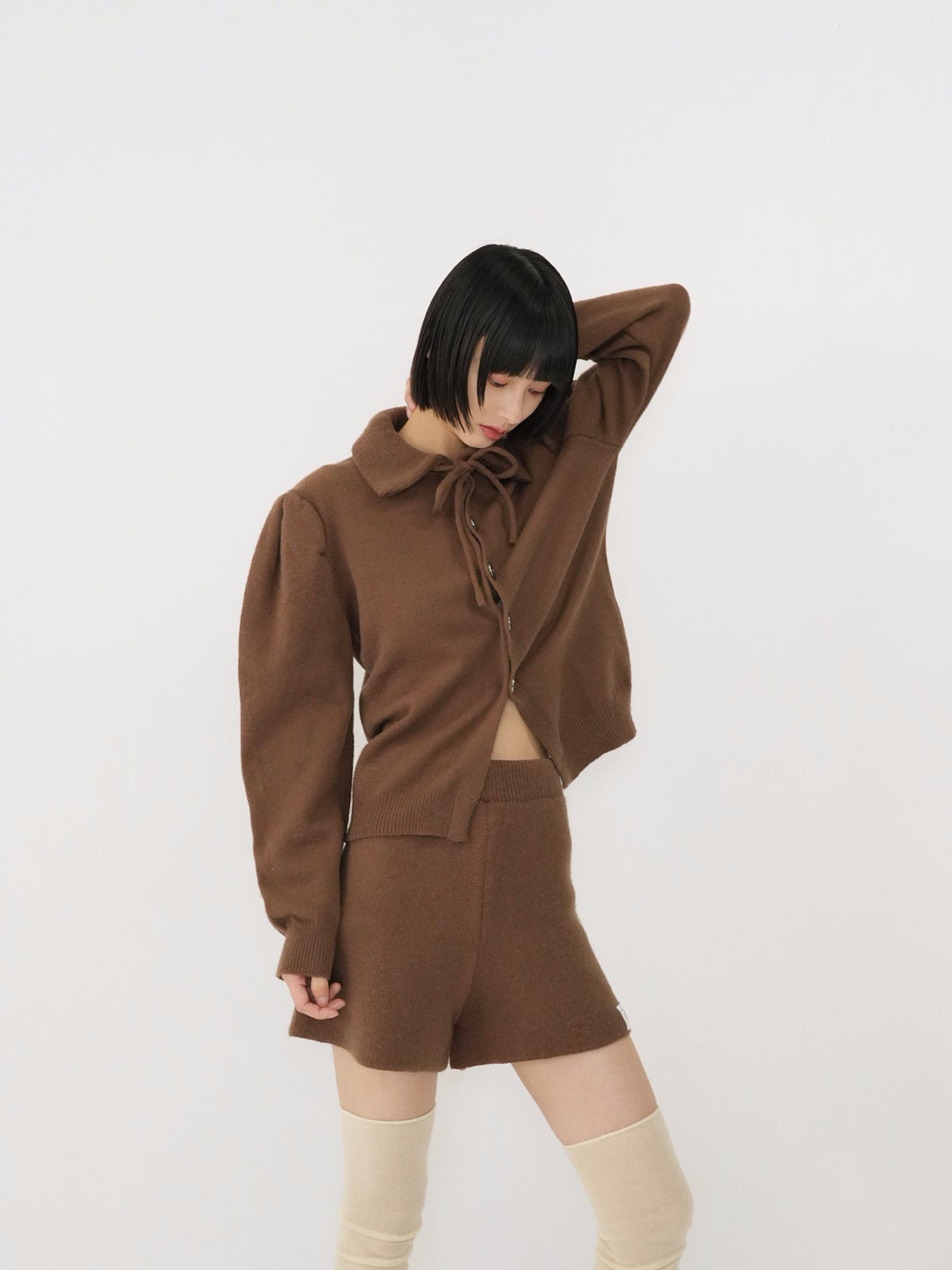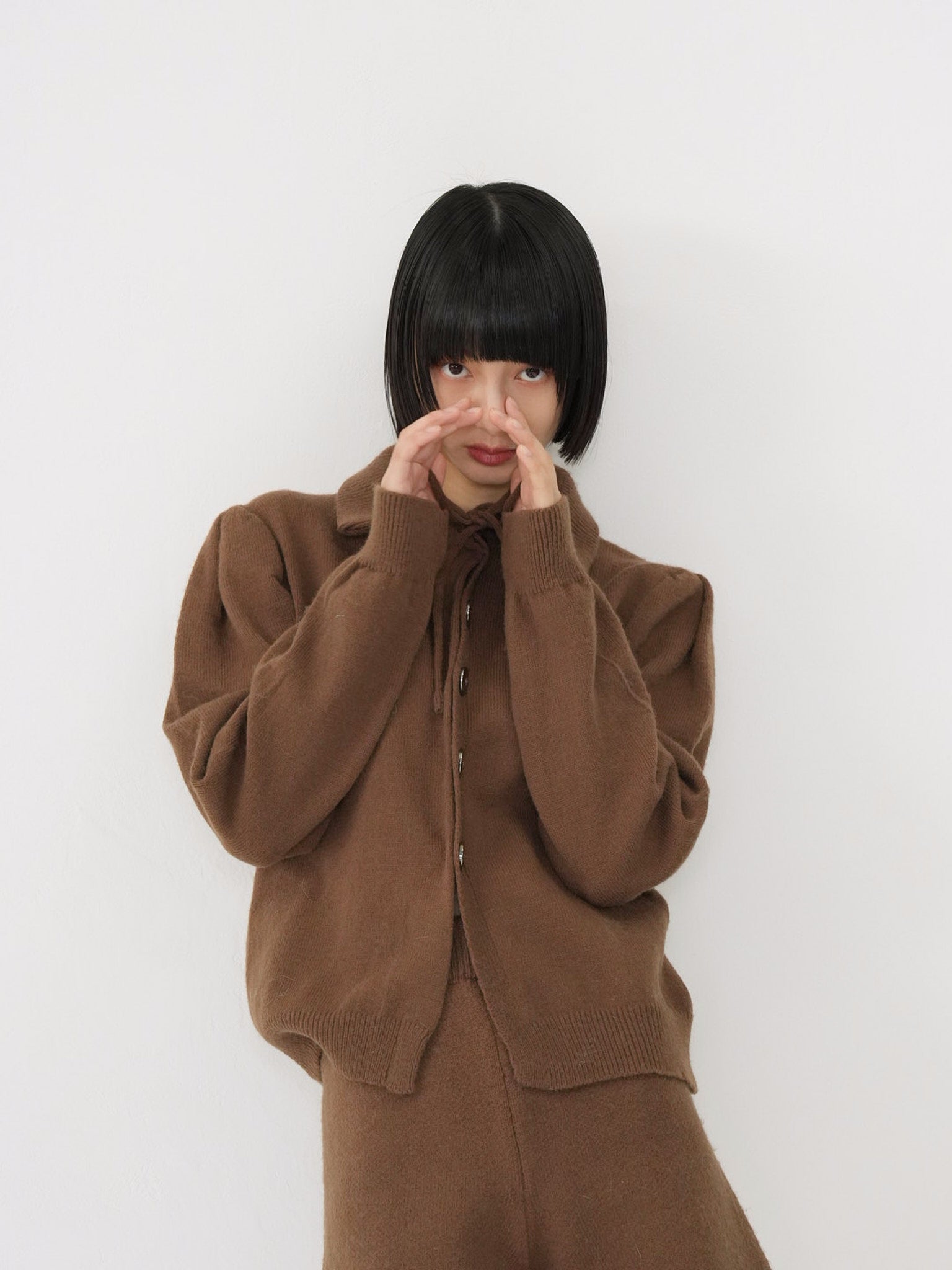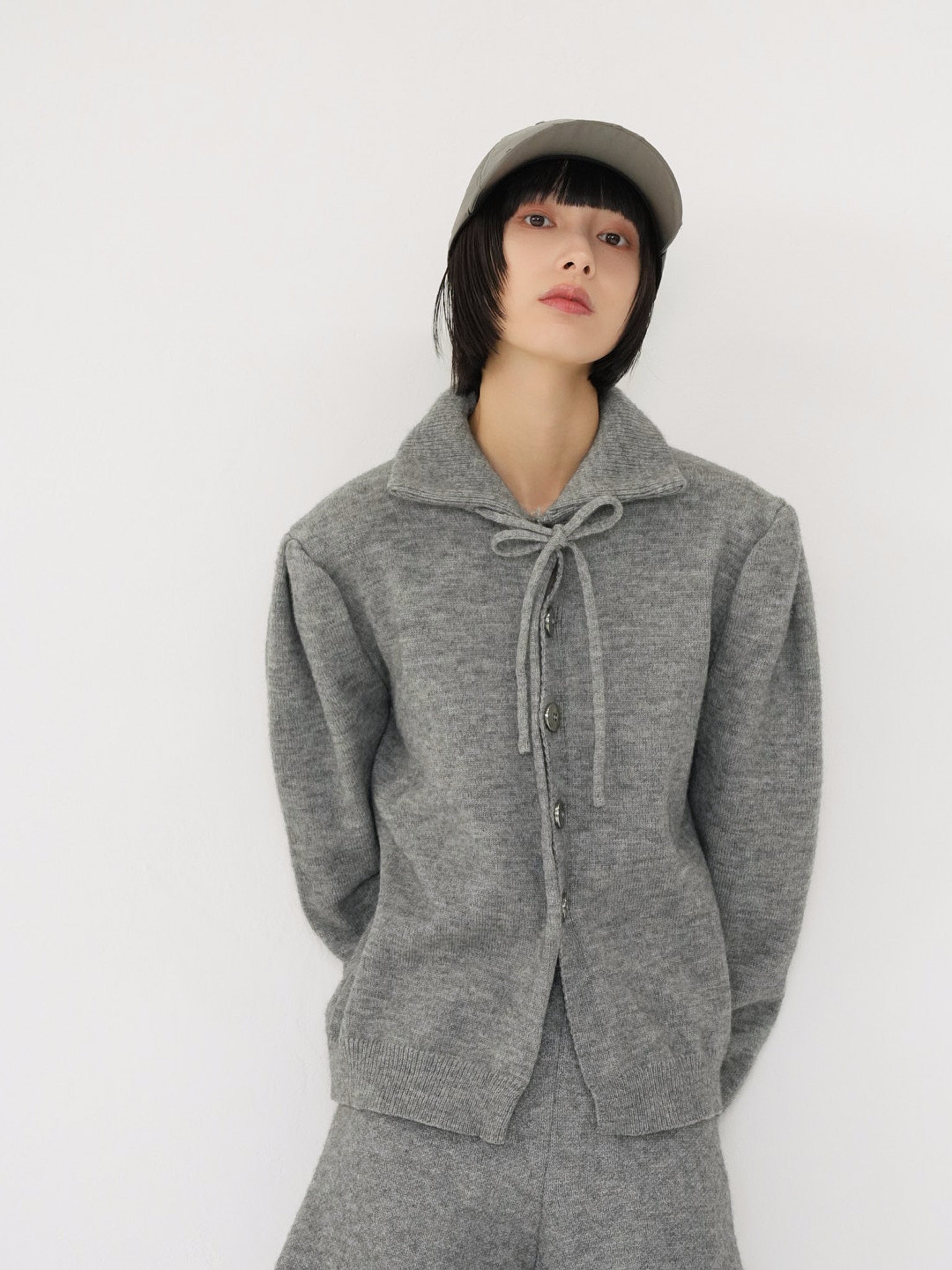 優しい肌触りのニット生地に首元のリボンがポイントのトップスとパンツのセットアップ。