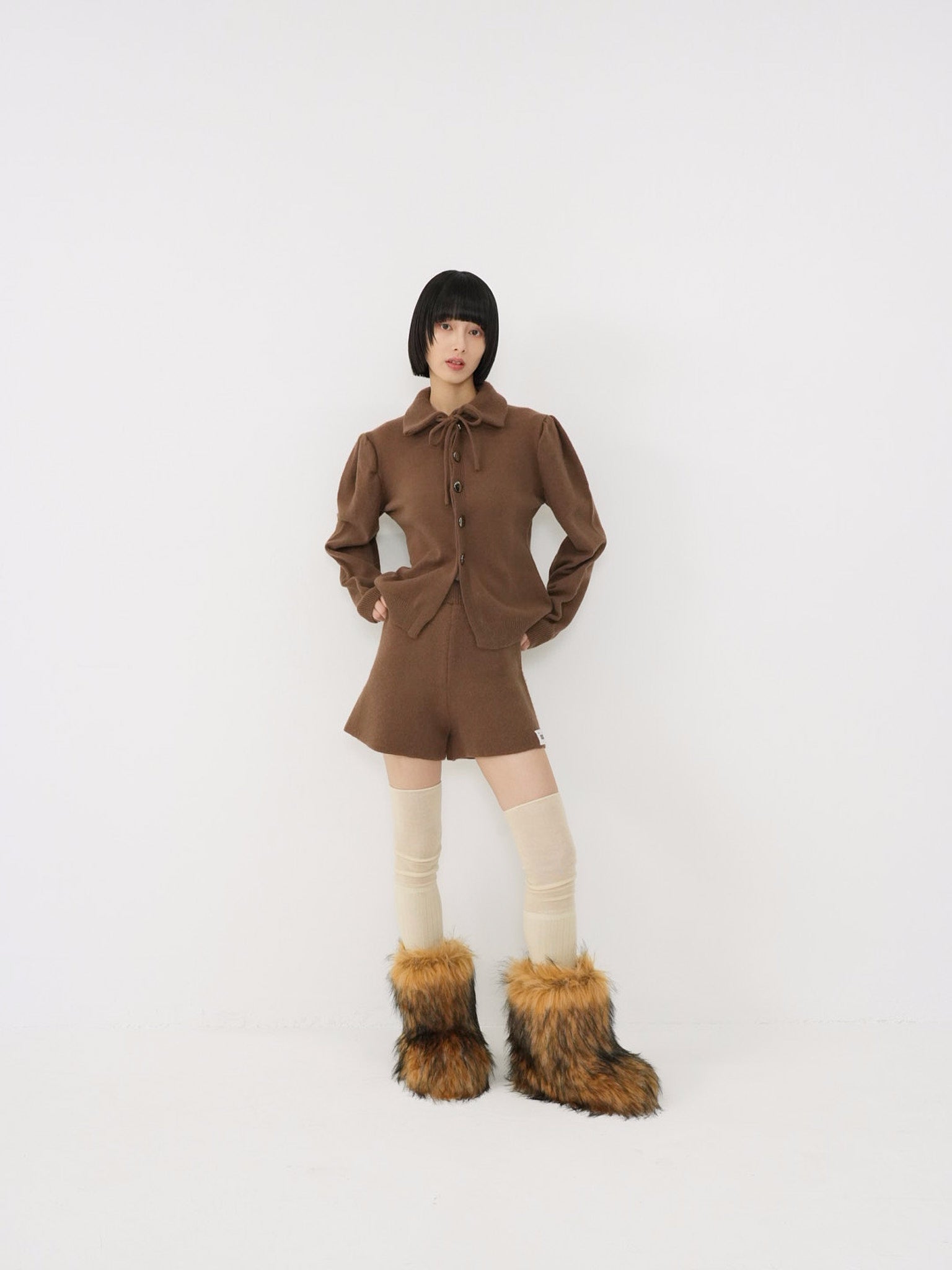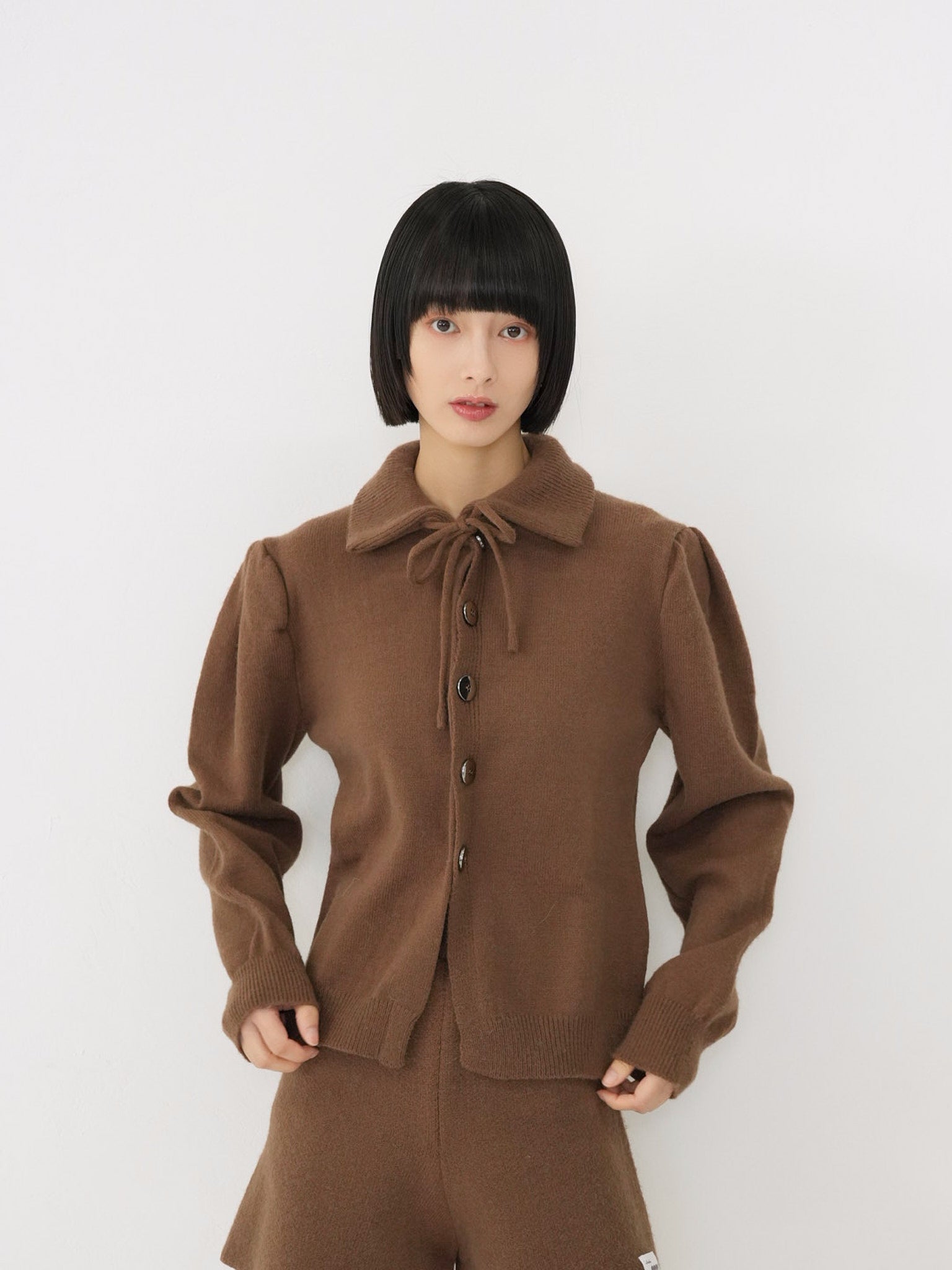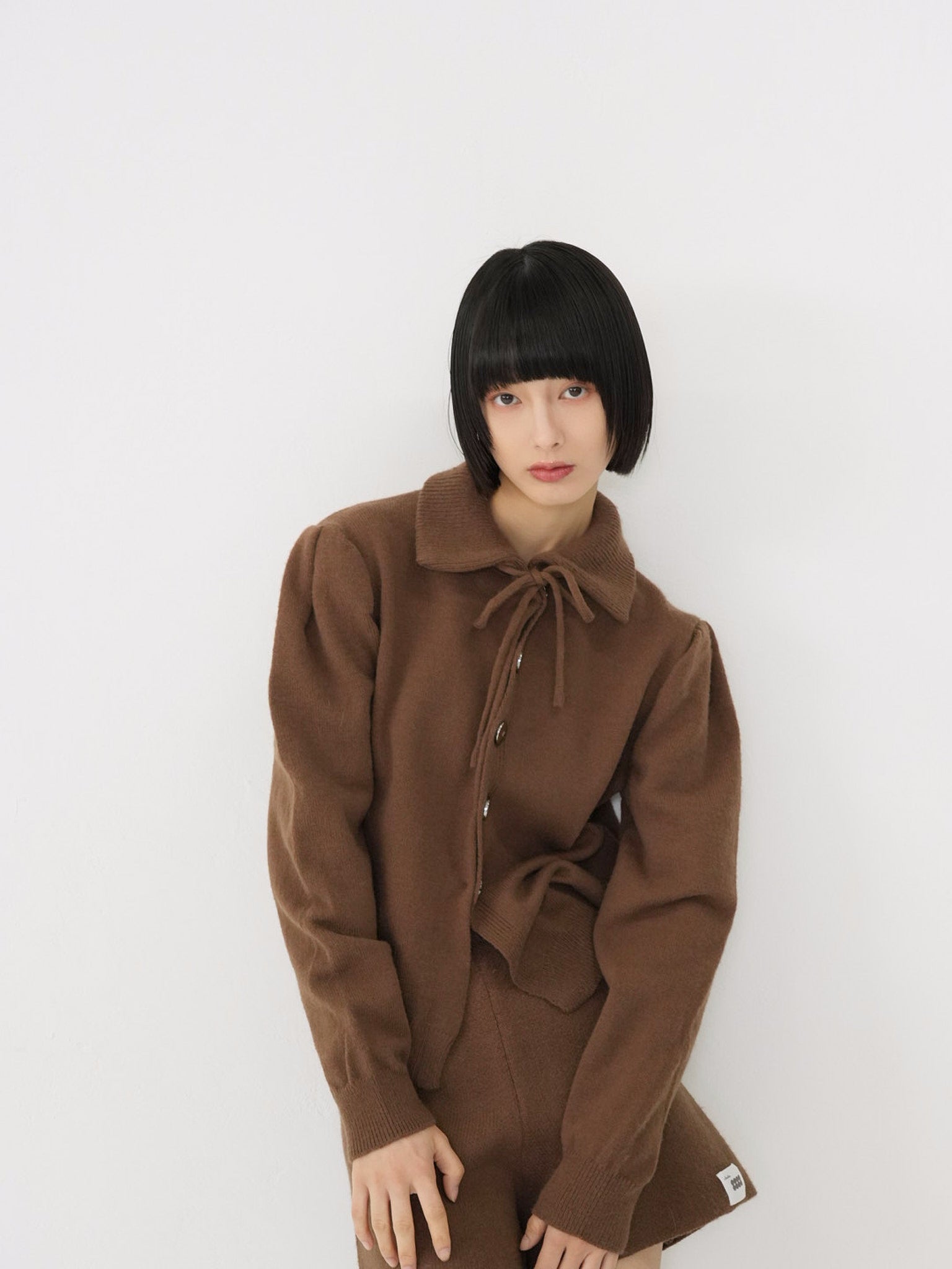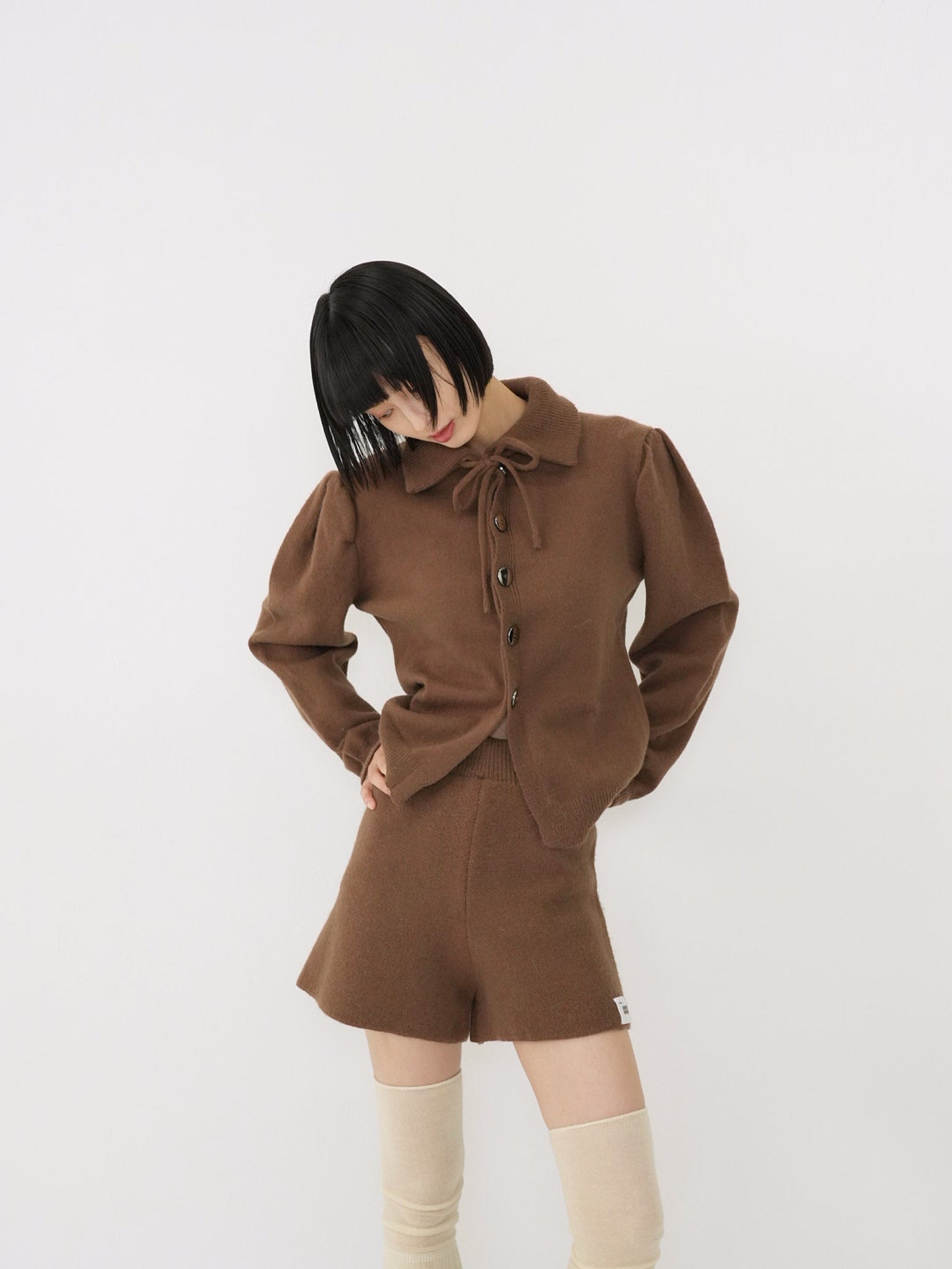 優しい肌触りのニット生地に首元のリボンがポイントのトップスとパンツのセットアップ。