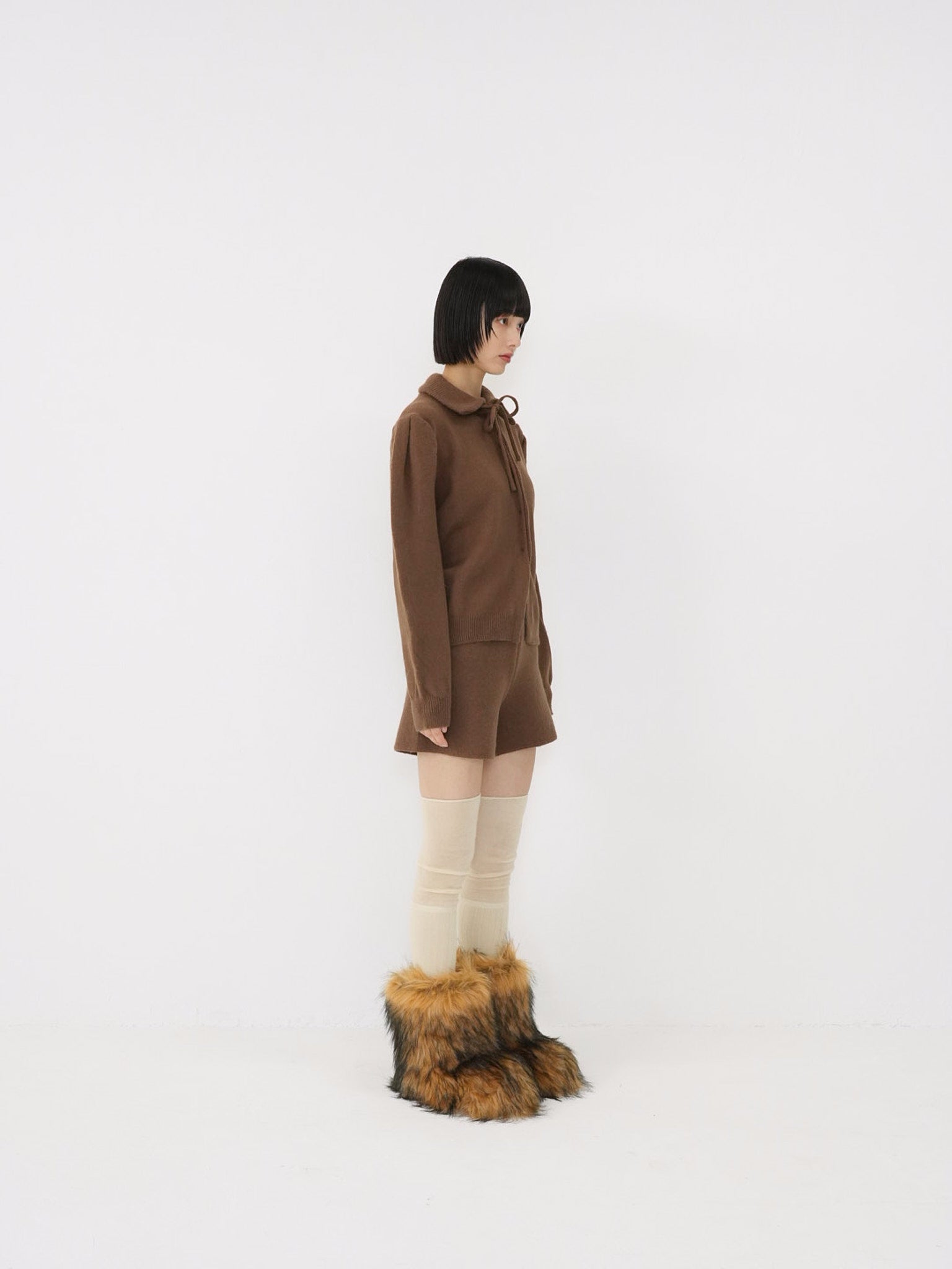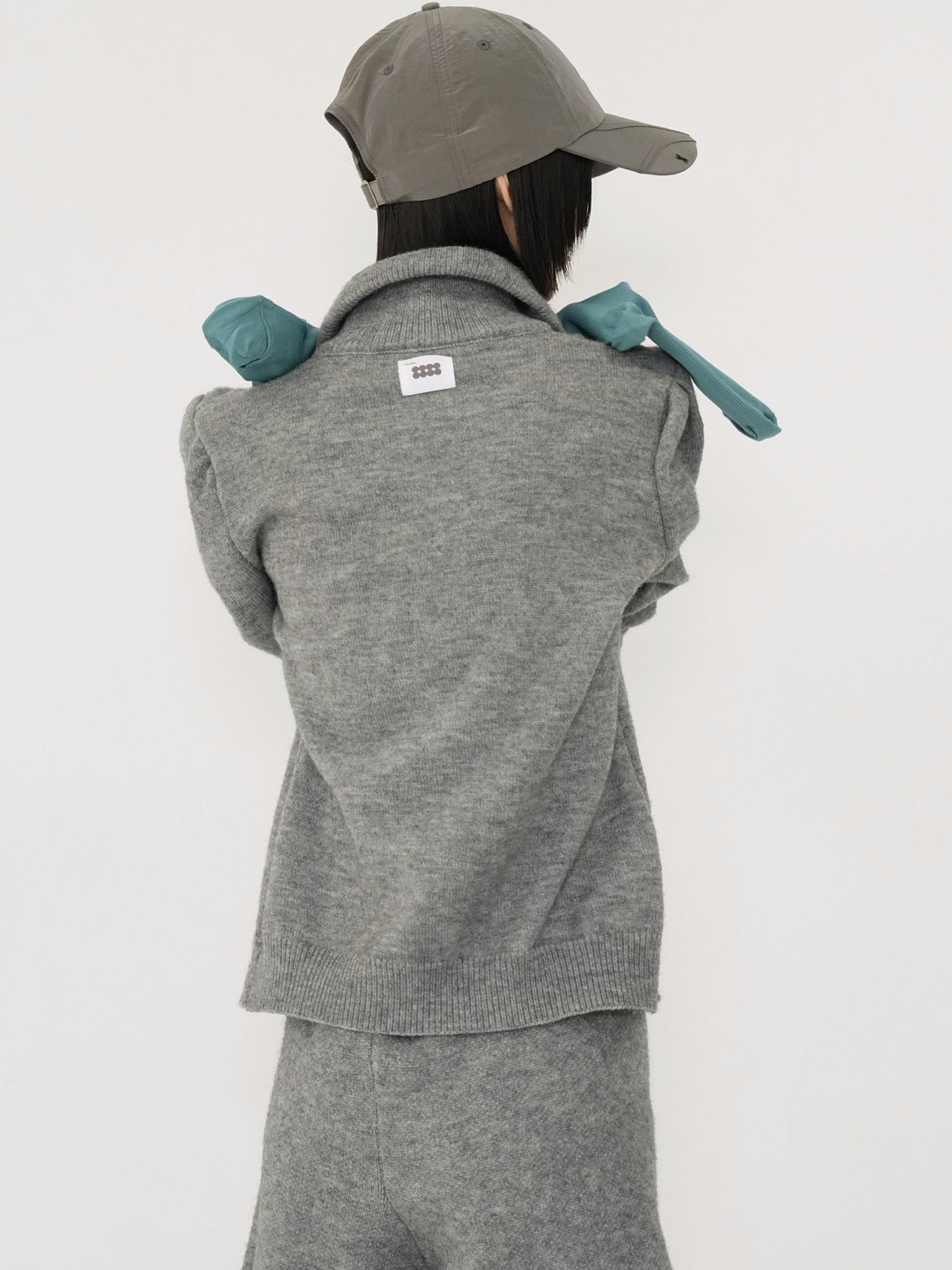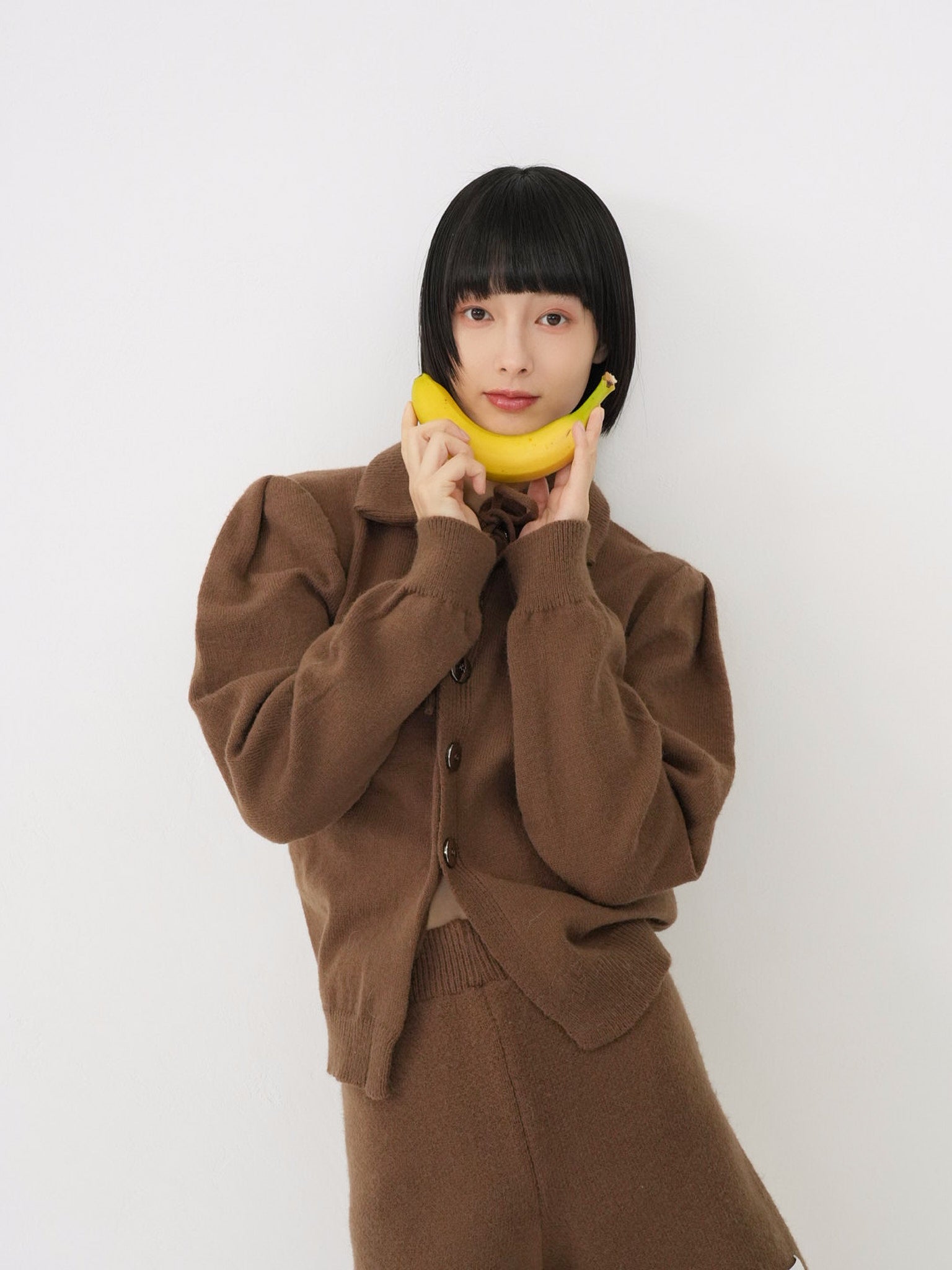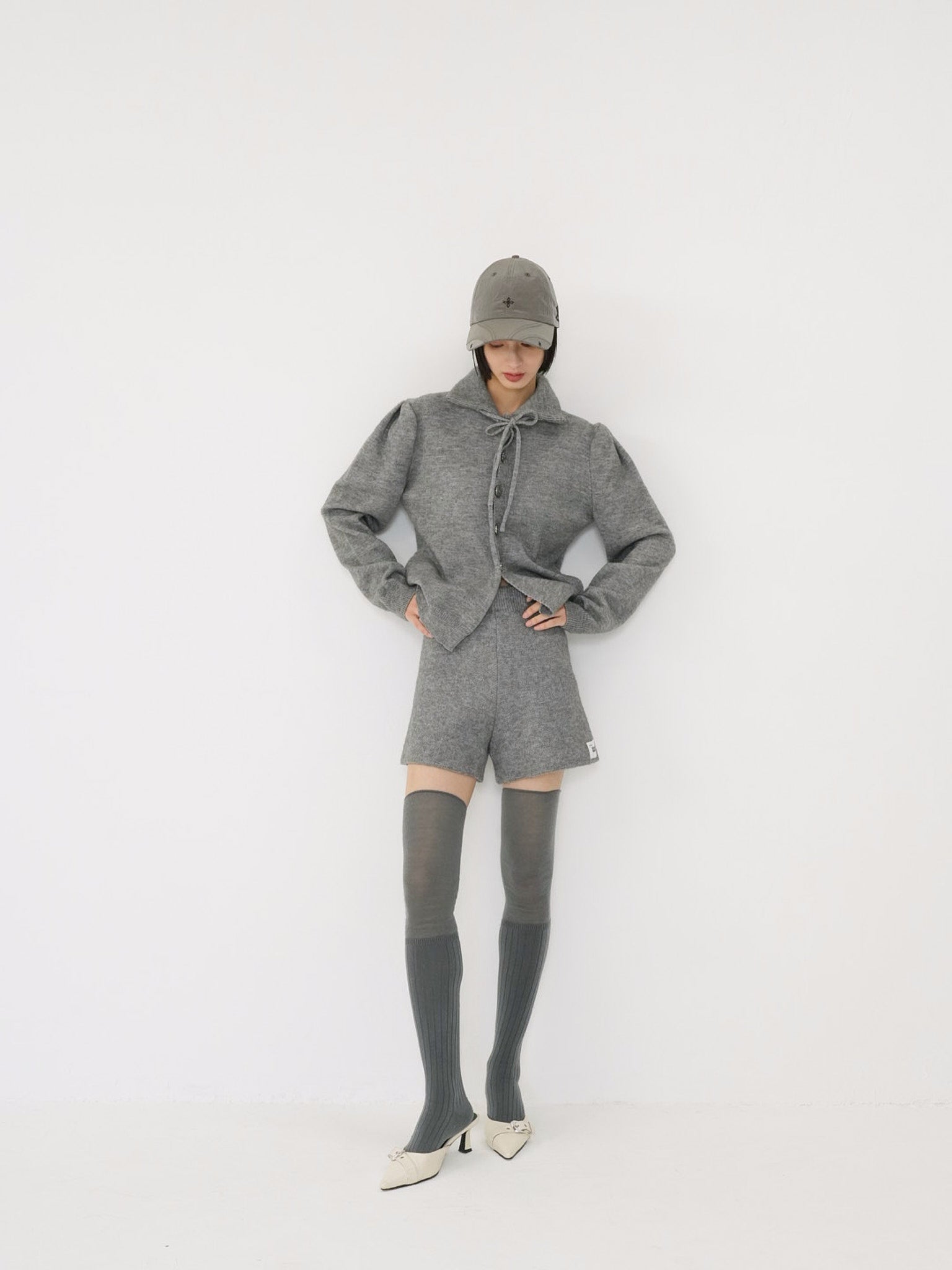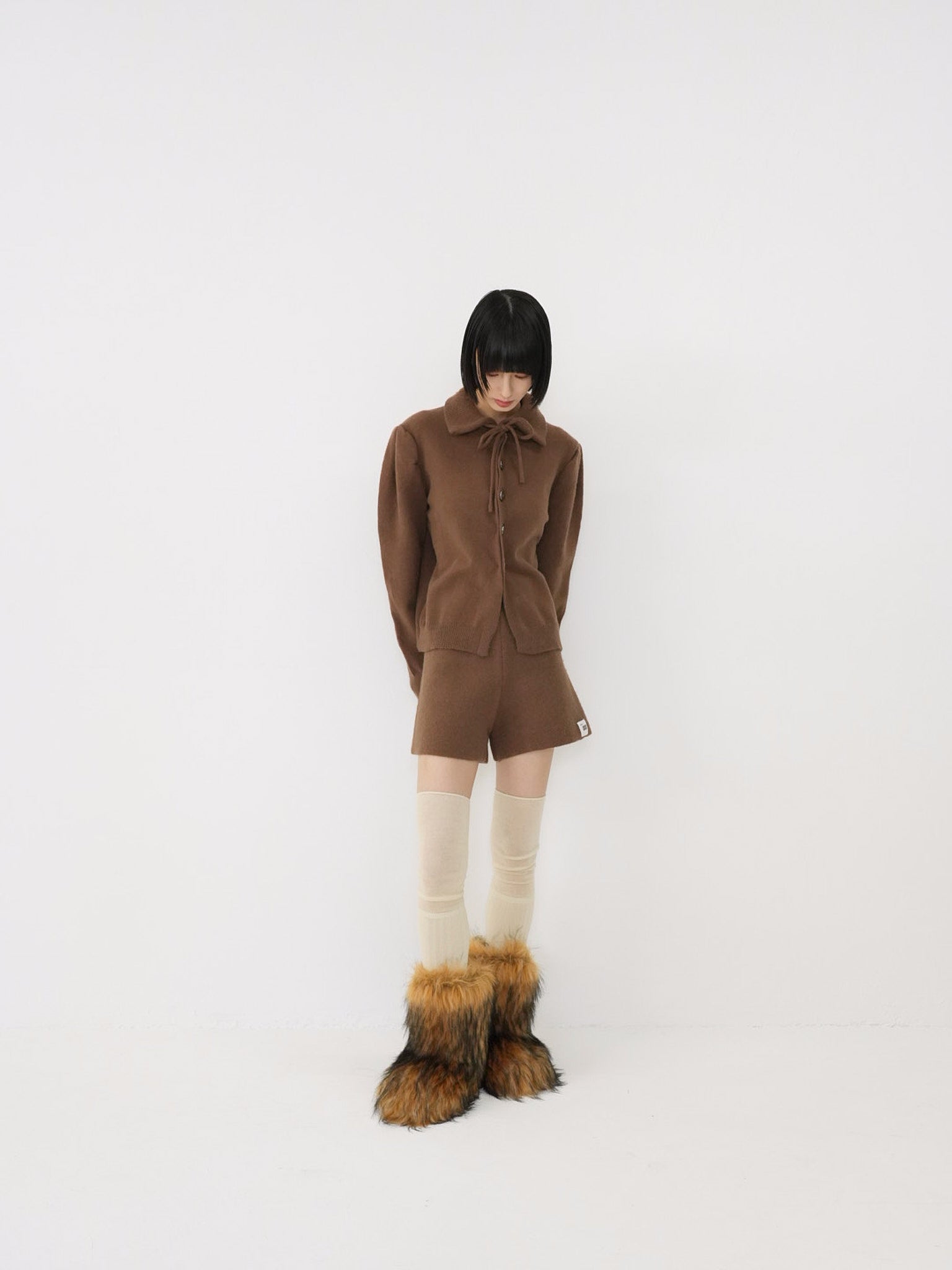 優しい肌触りのニット生地に首元のリボンがポイントのトップスとパンツのセットアップ。