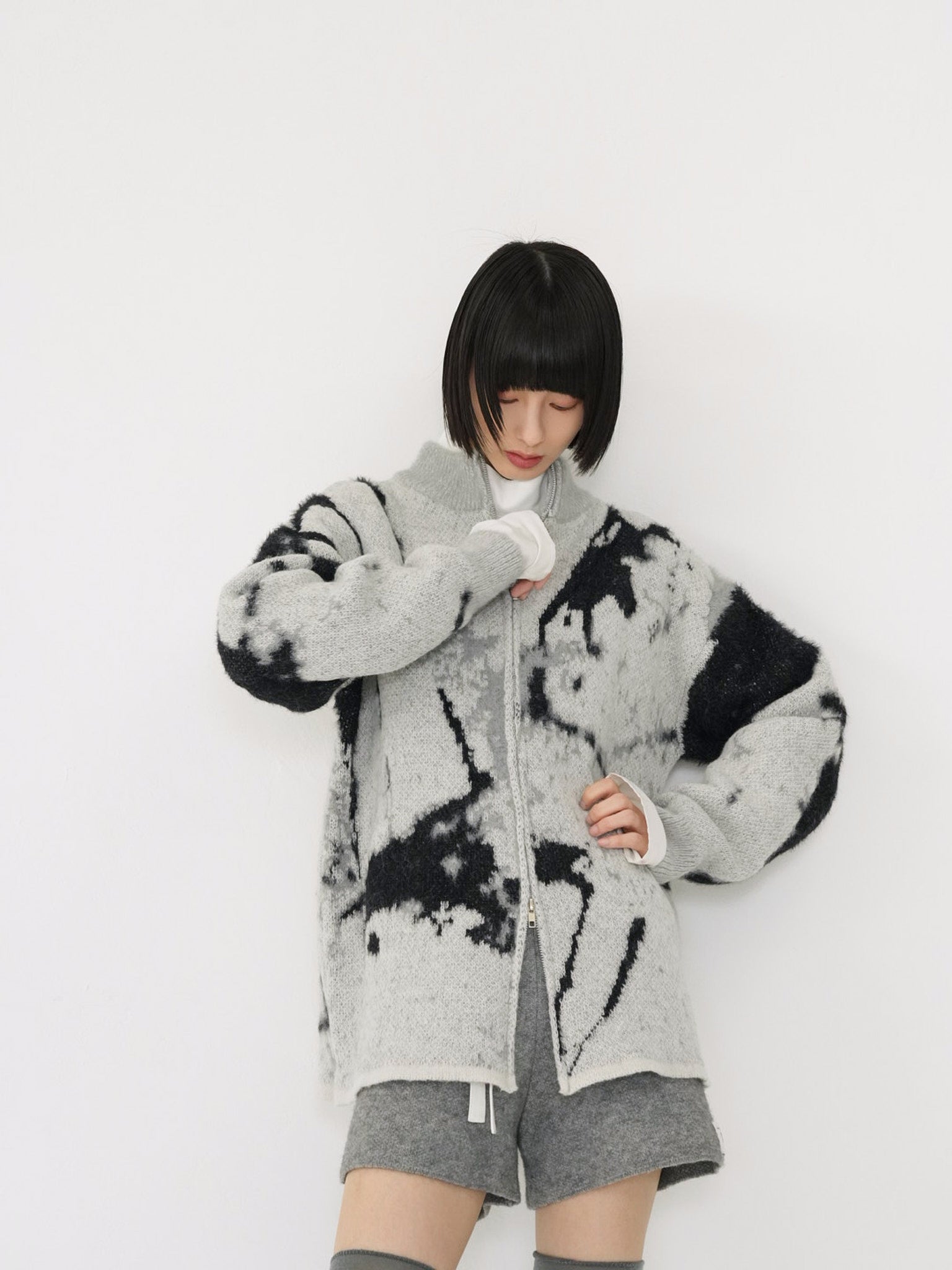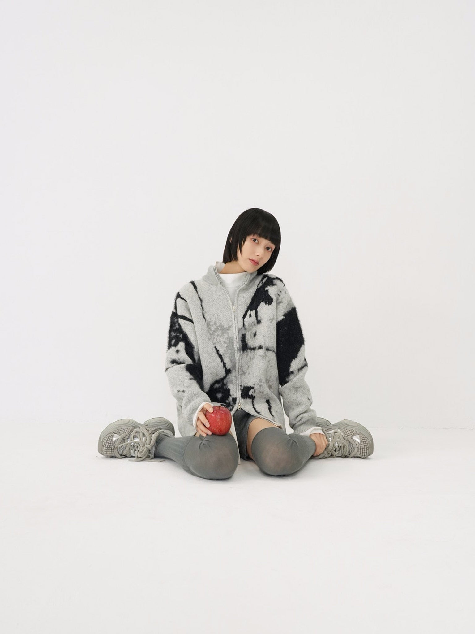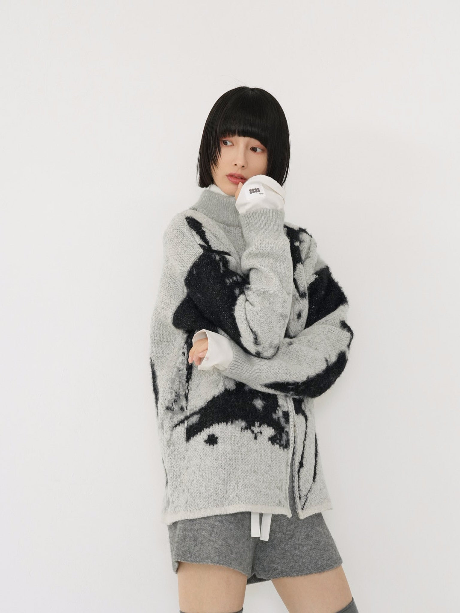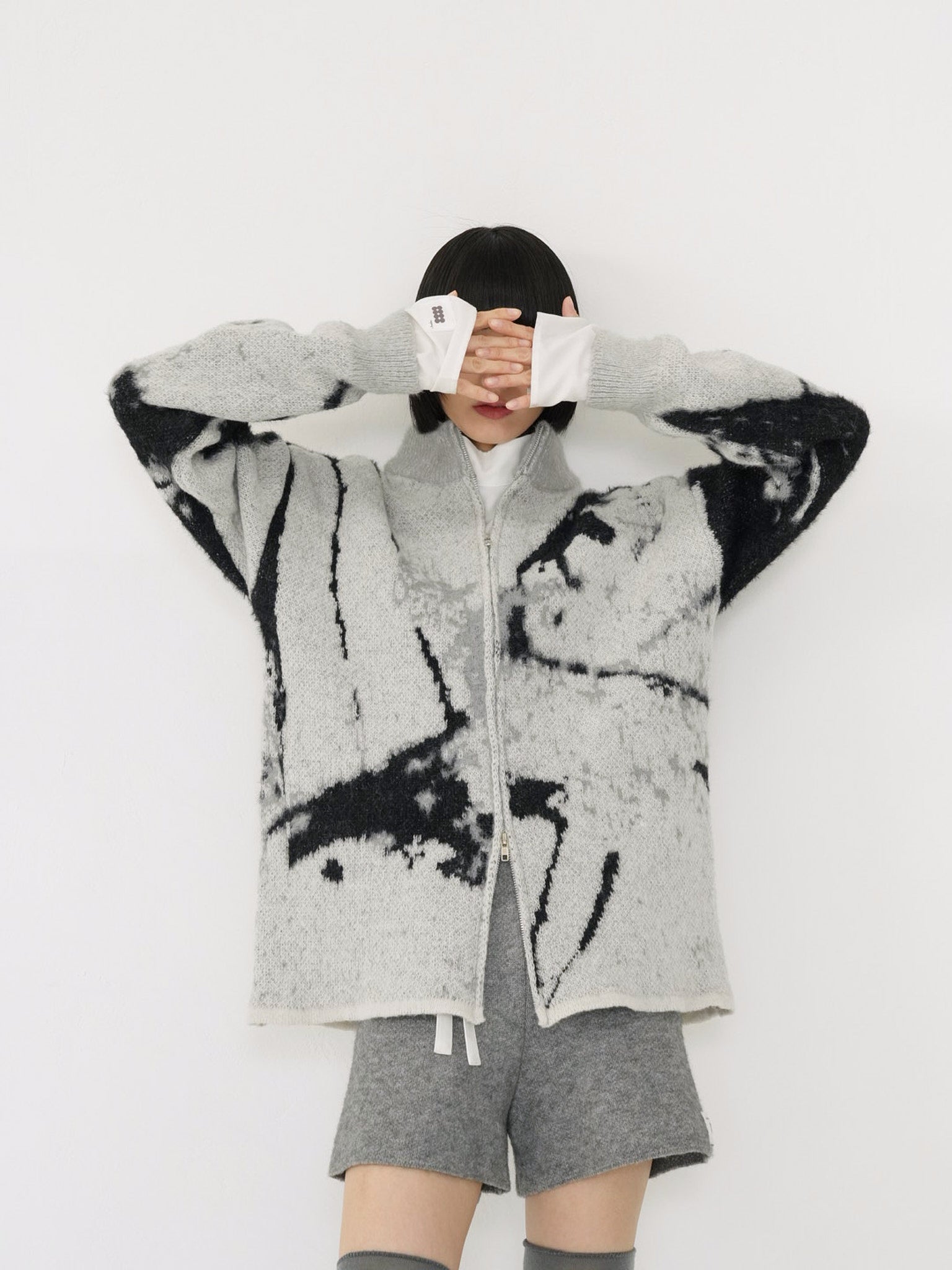 モノトーンの写真風グラフィックを大胆に編み込んだフルジップニット。