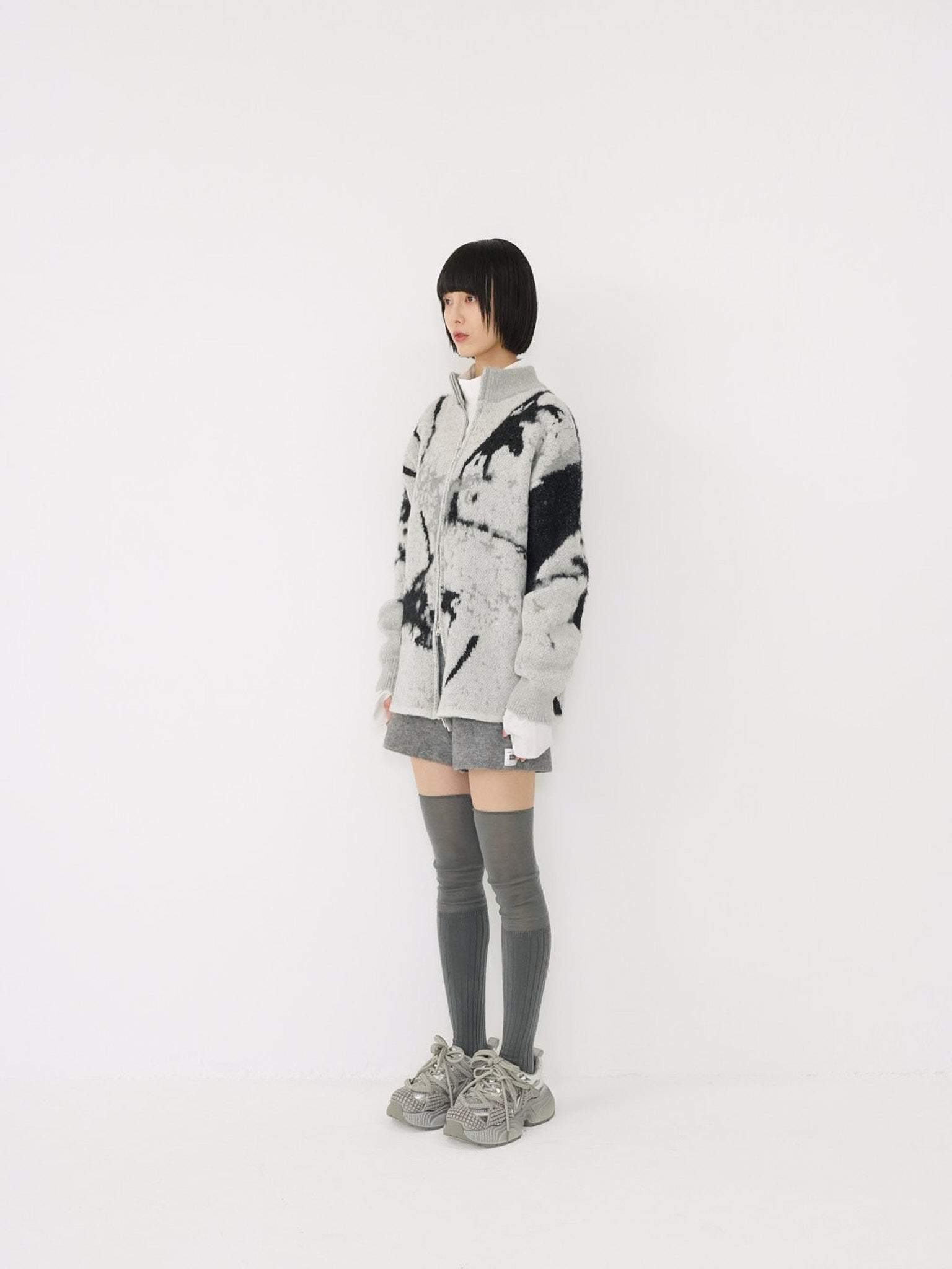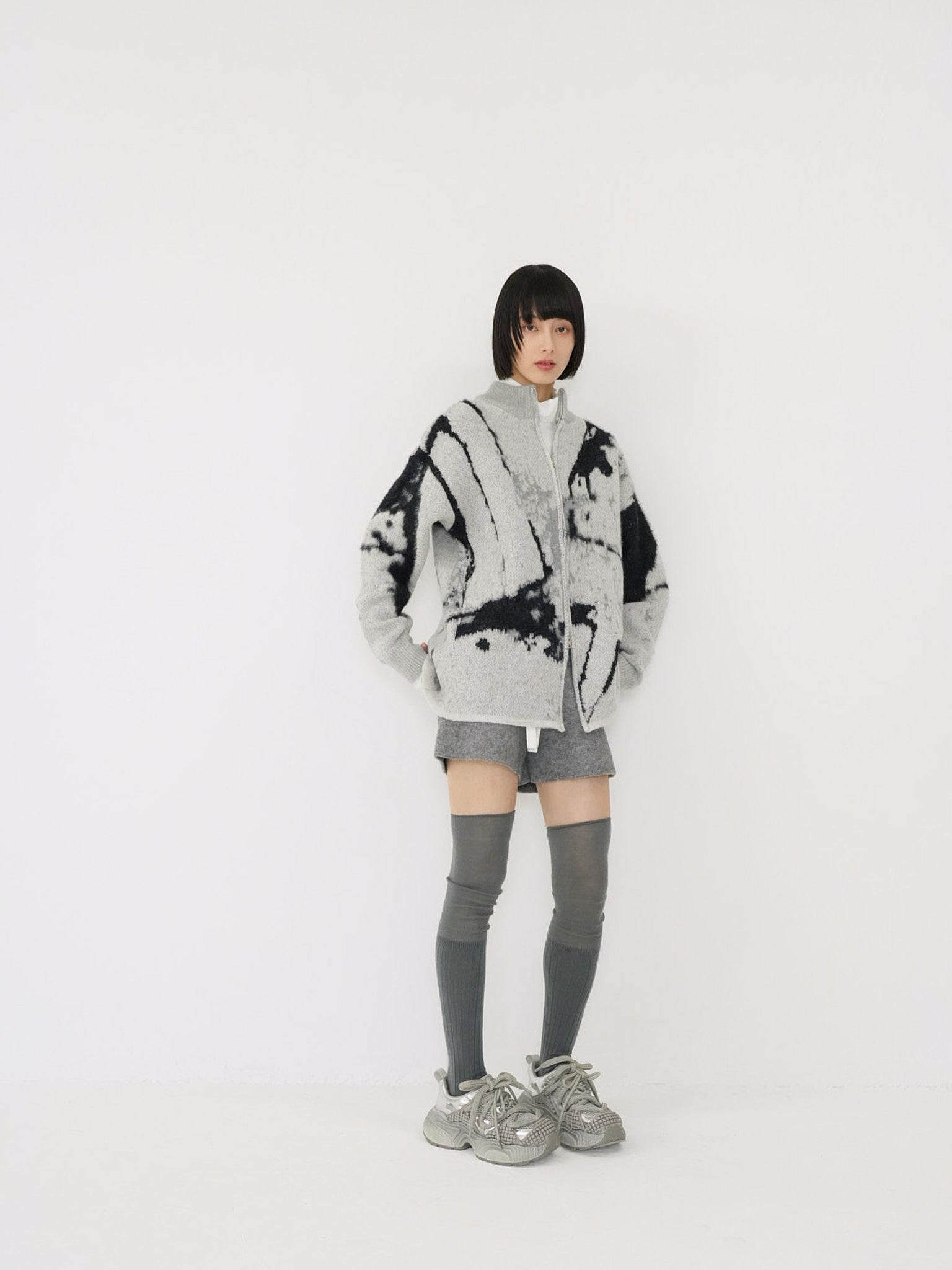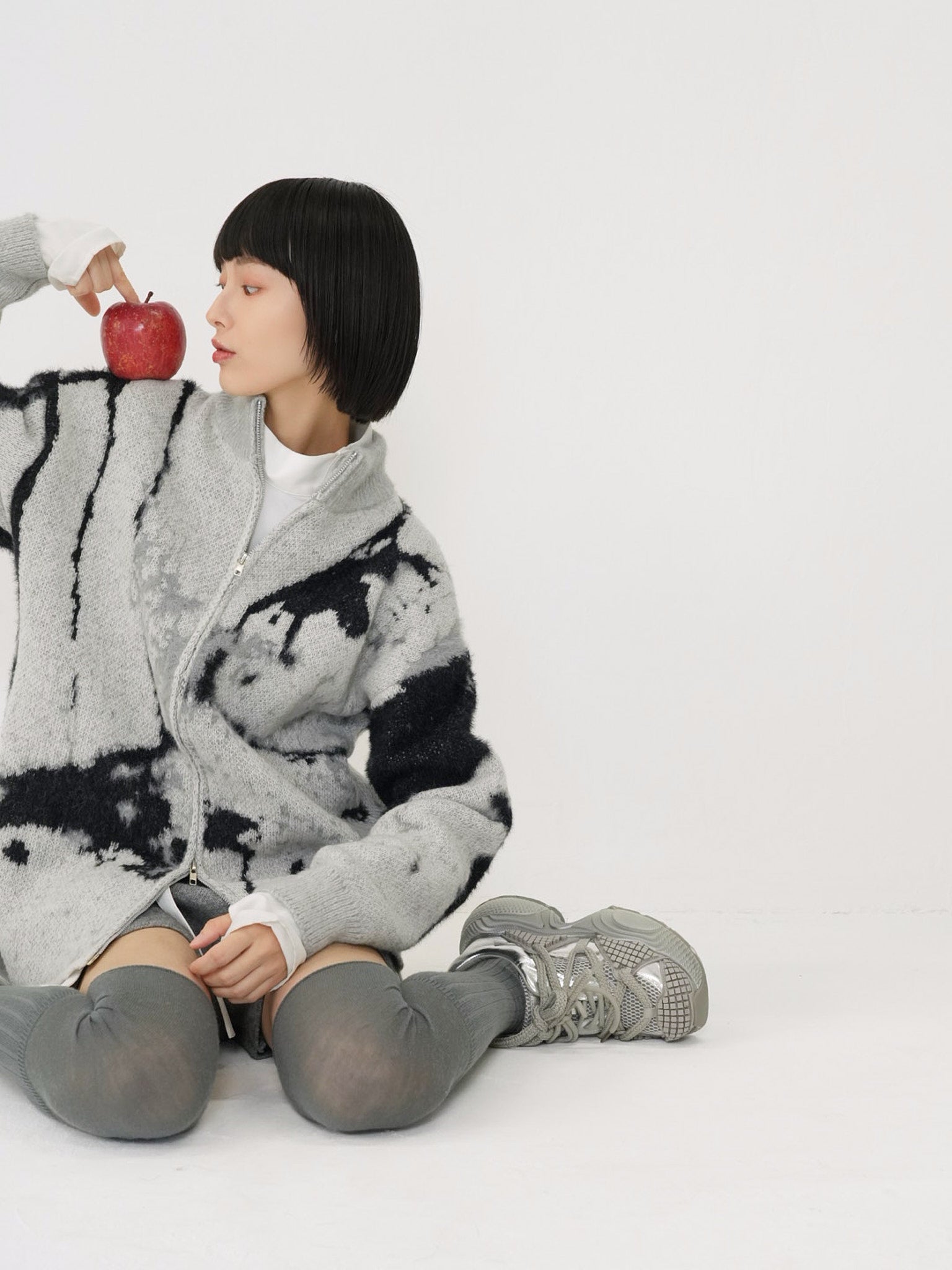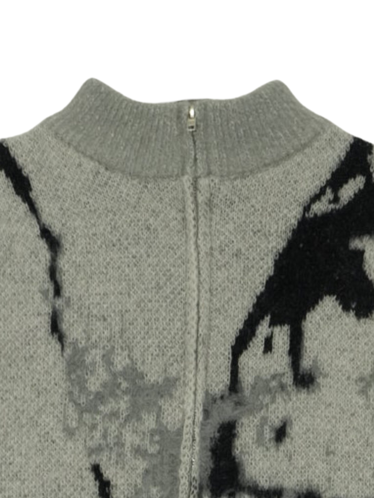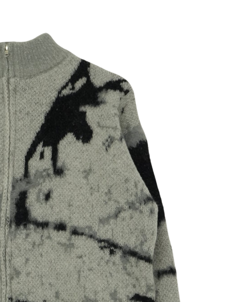 モノトーンの写真風グラフィックを大胆に編み込んだフルジップニット。