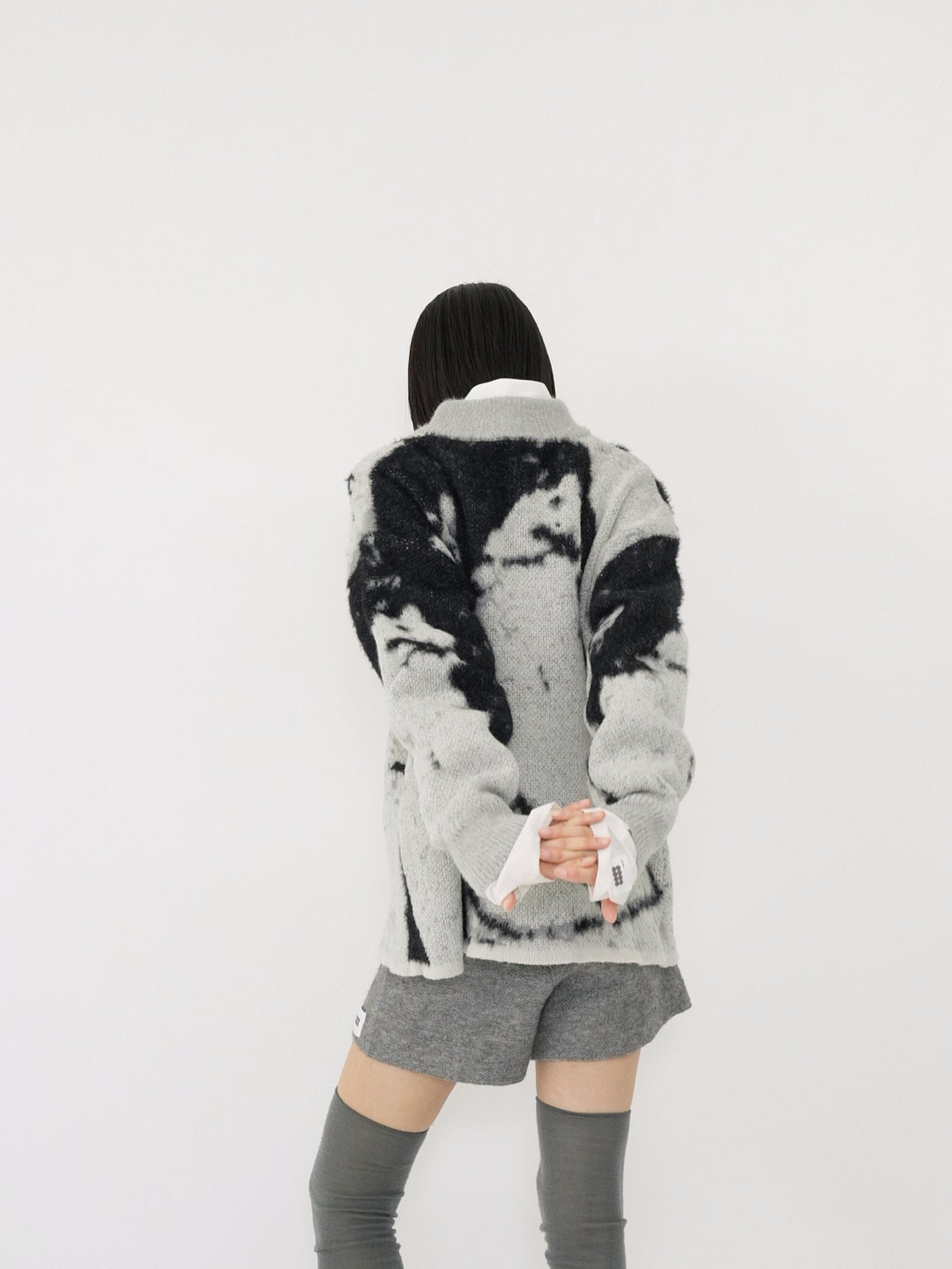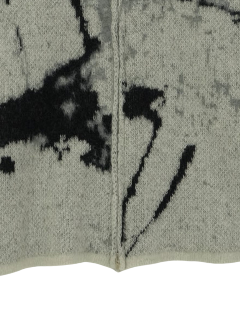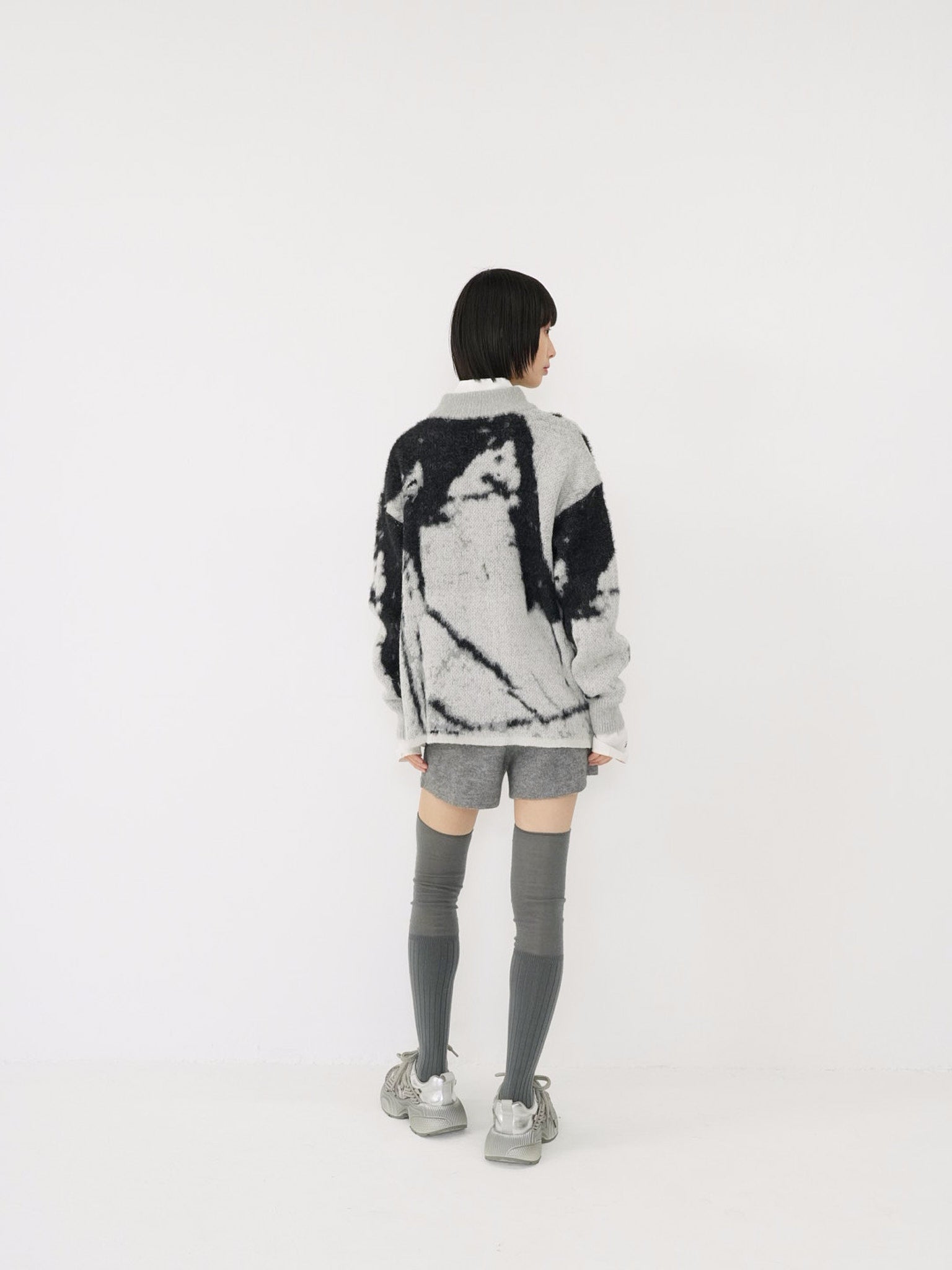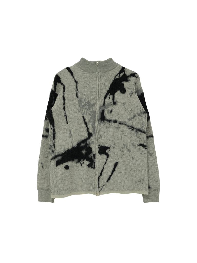 モノトーンの写真風グラフィックを大胆に編み込んだフルジップニット。