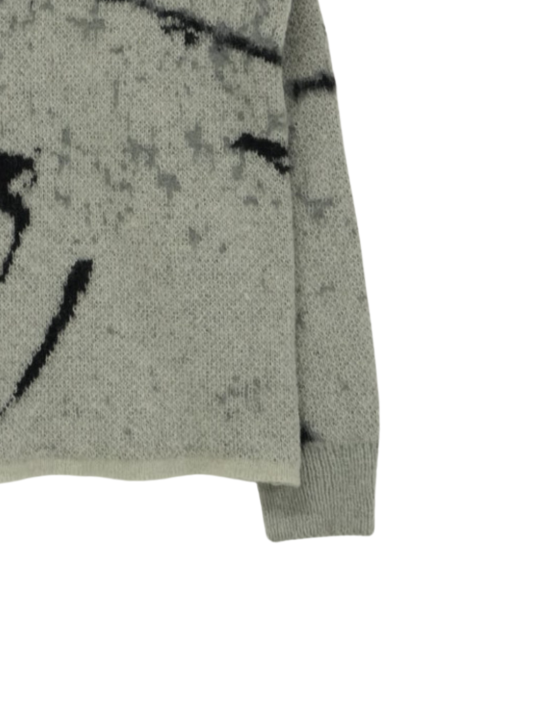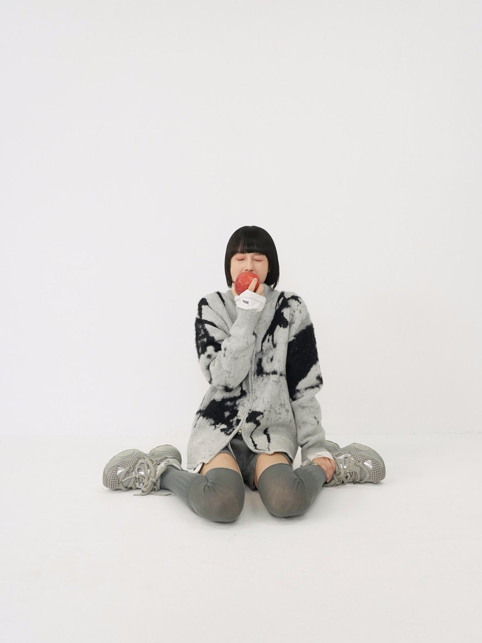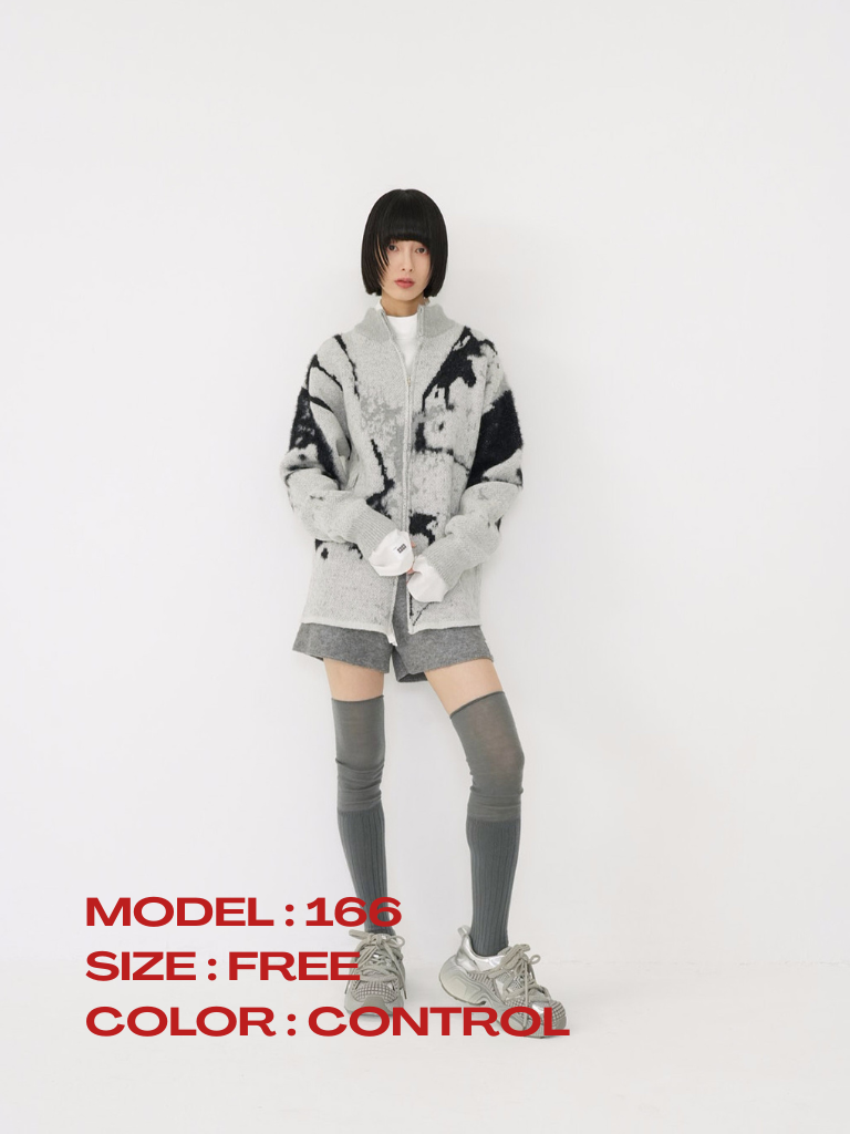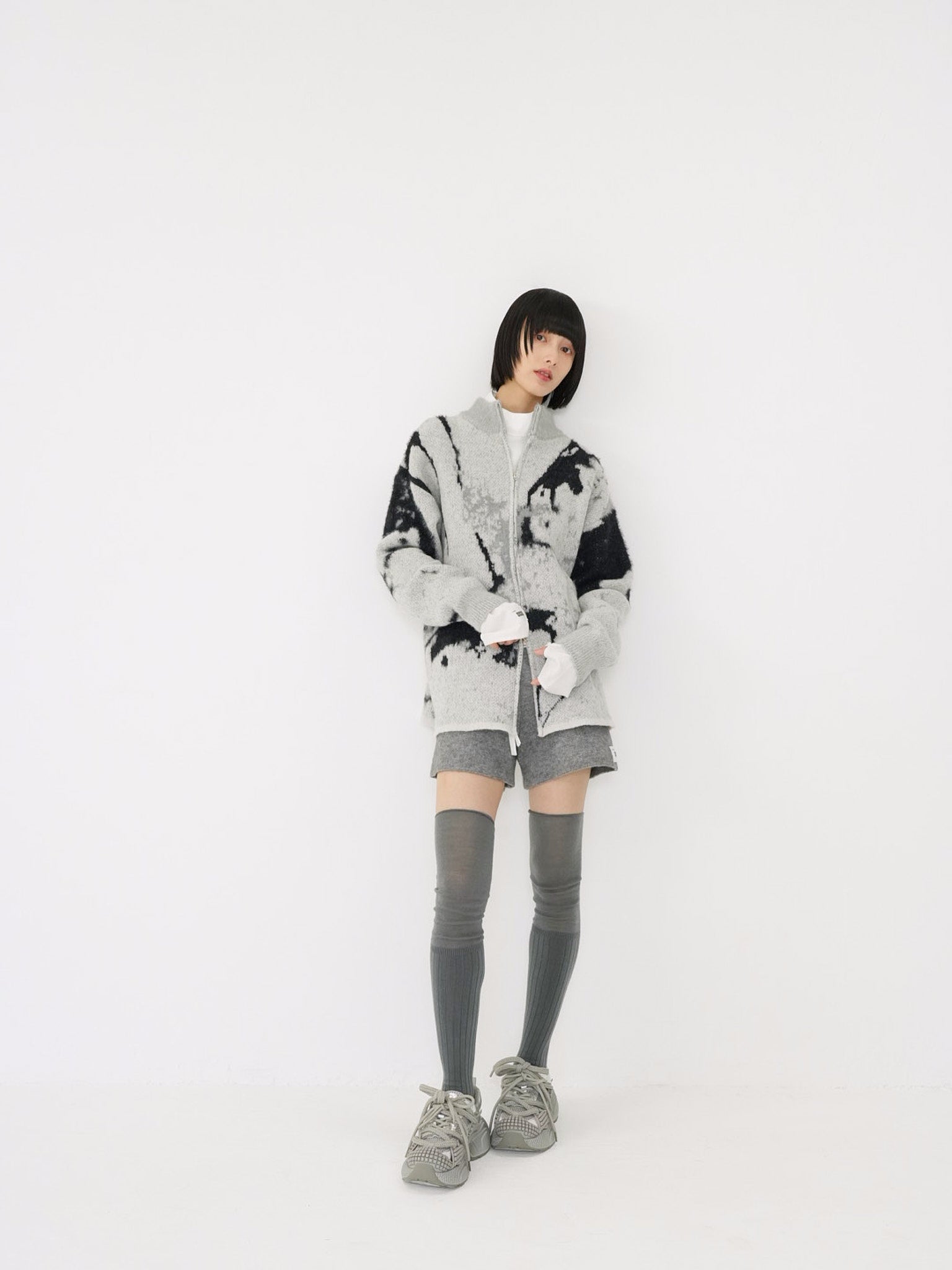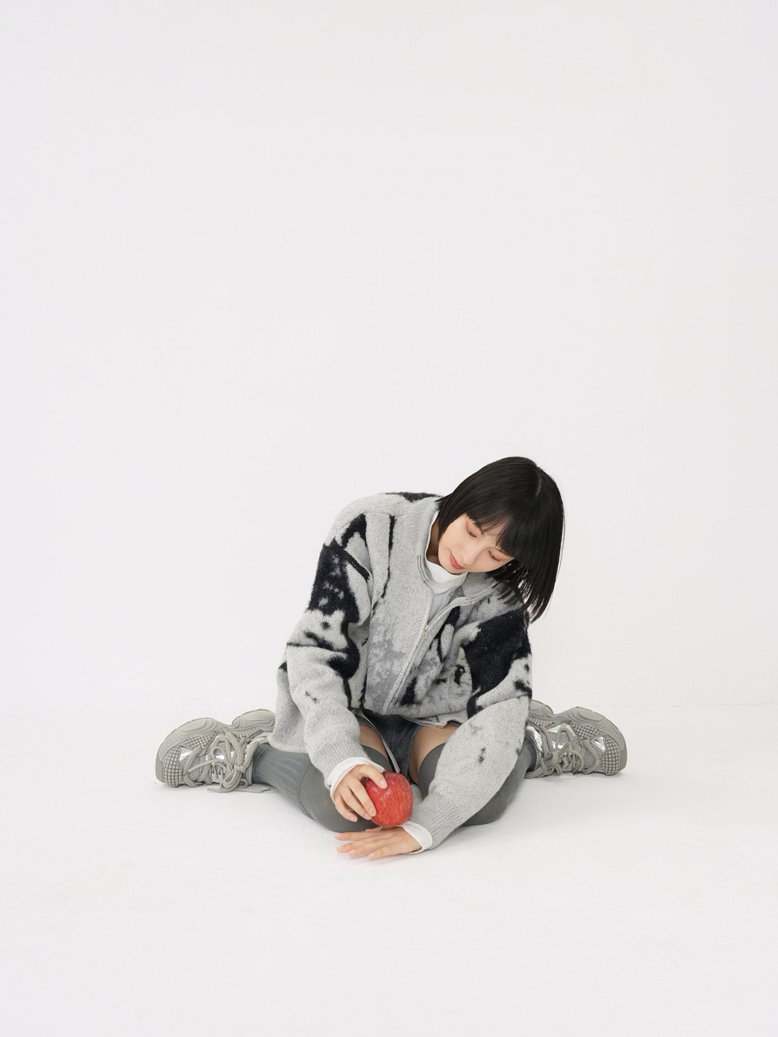 モノトーンの写真風グラフィックを大胆に編み込んだフルジップニット。