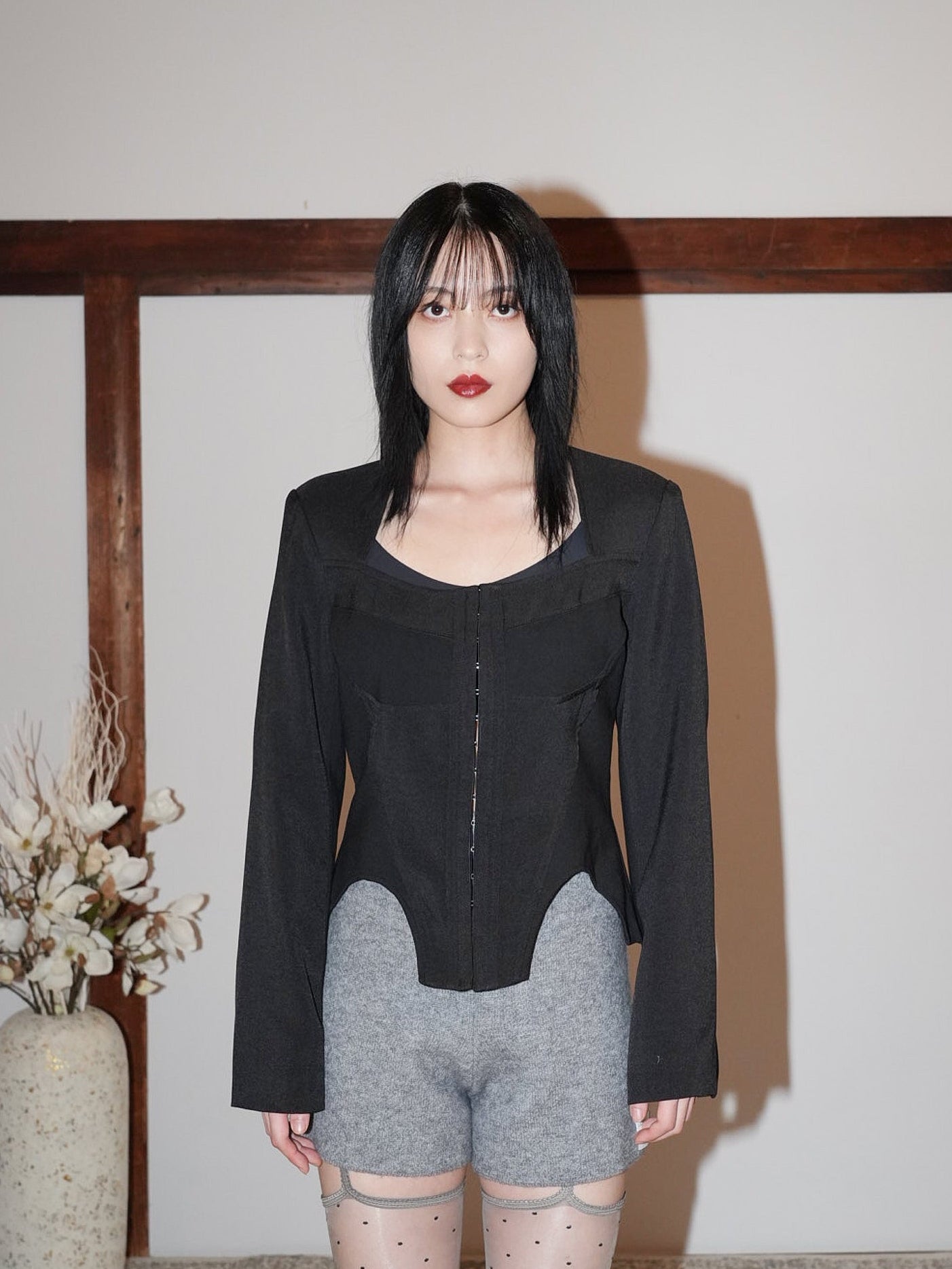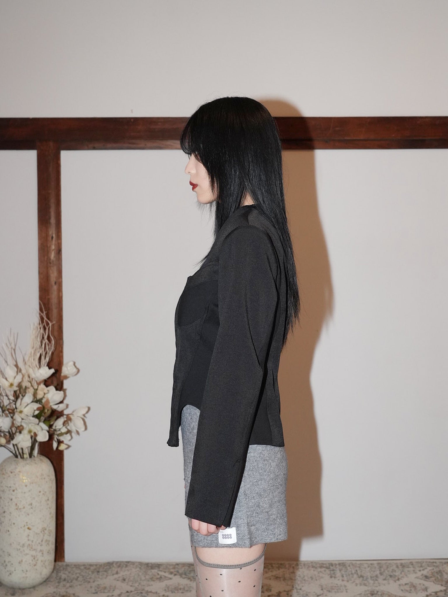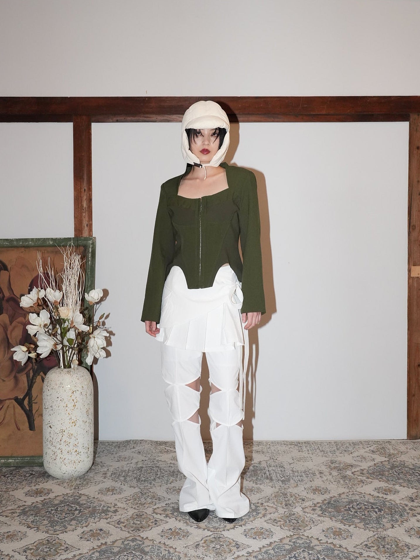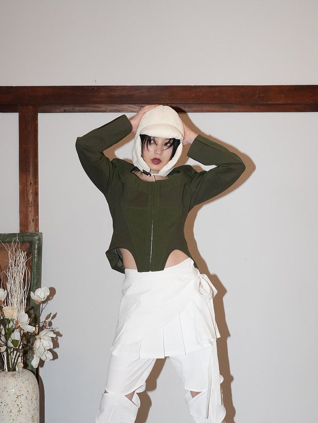 大胆なカッティングと構築的なシルエットが印象的なコルセット風トップス。