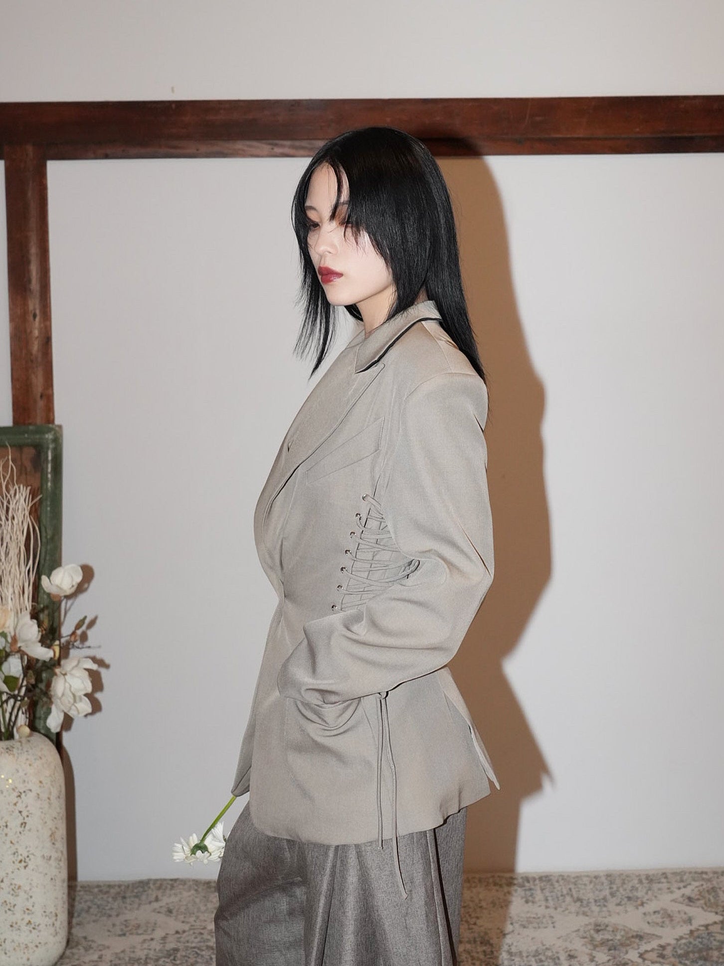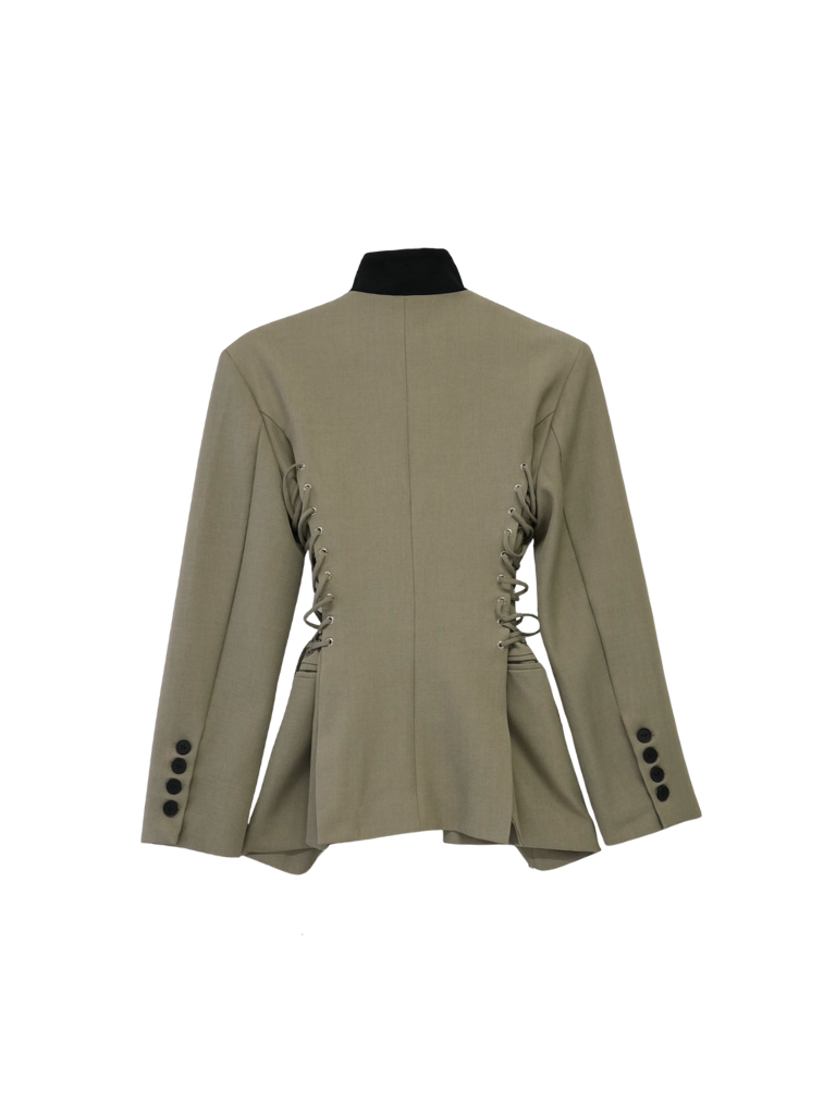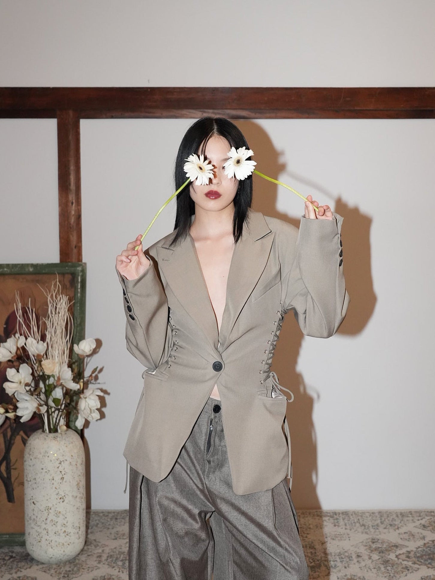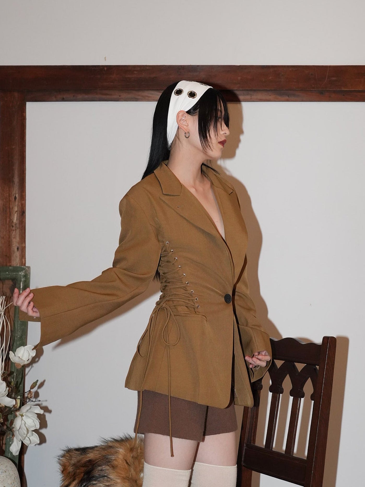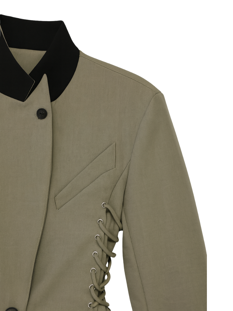 サイドの大胆なレースアップデザインが印象的なジャケット。
