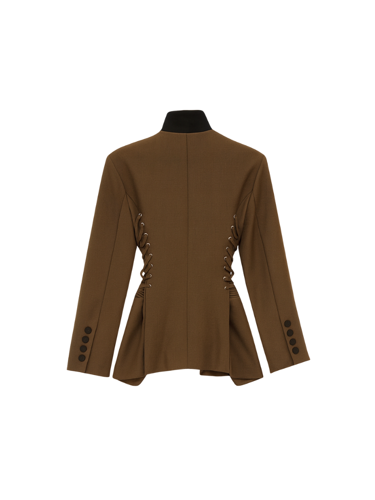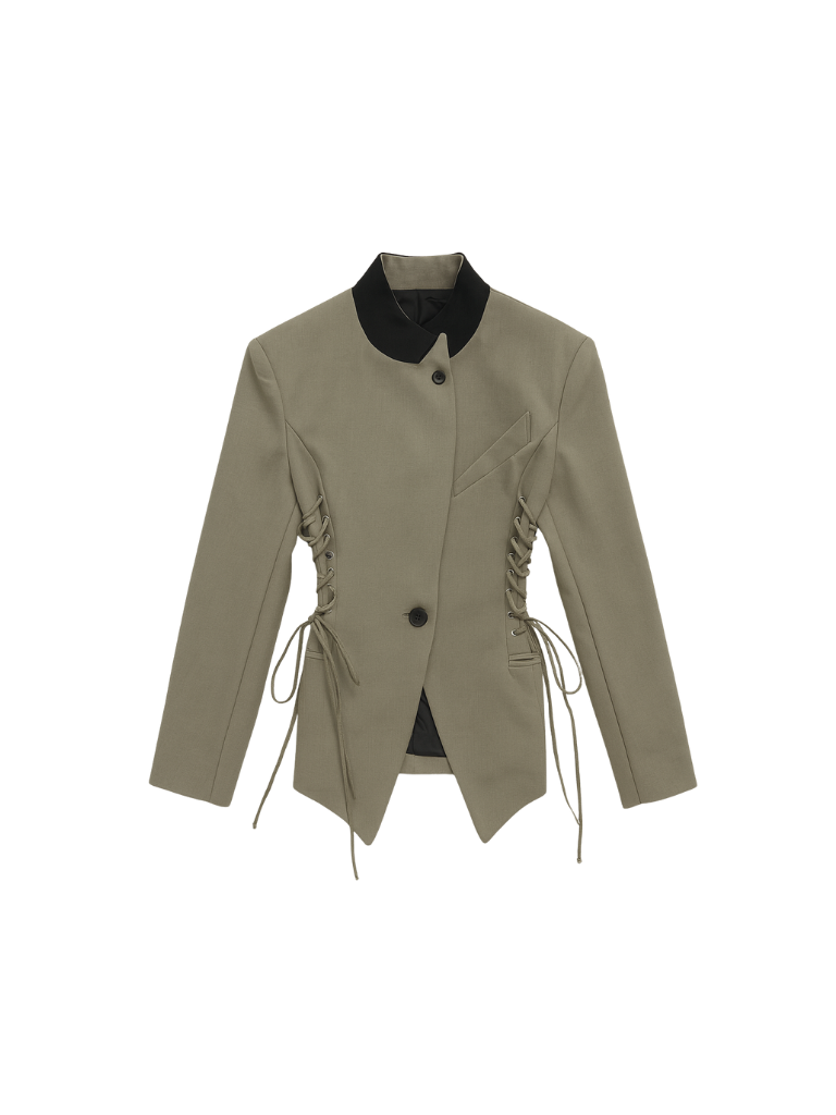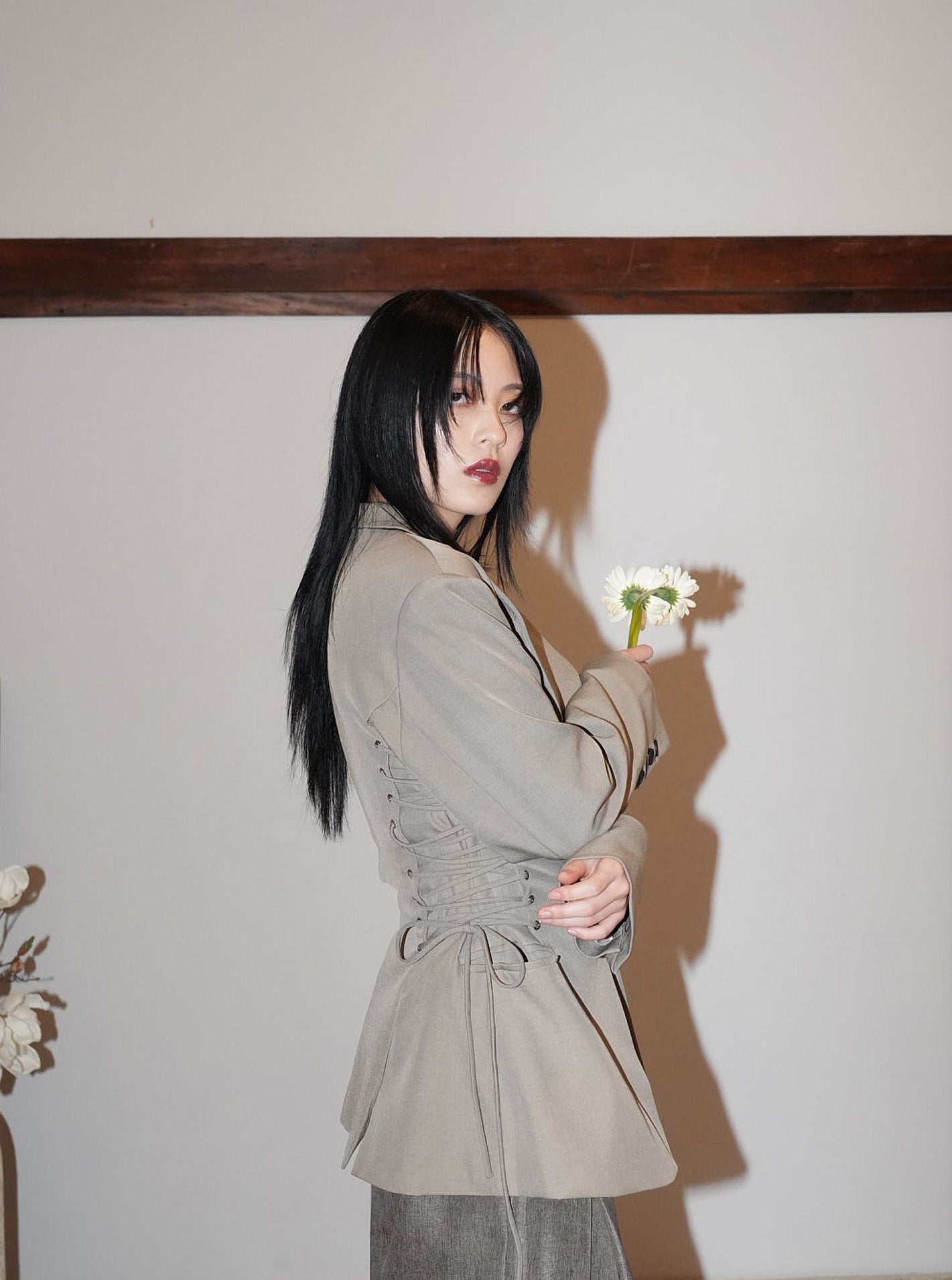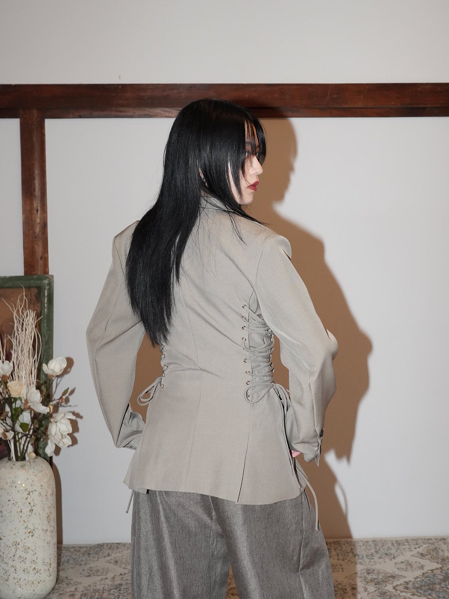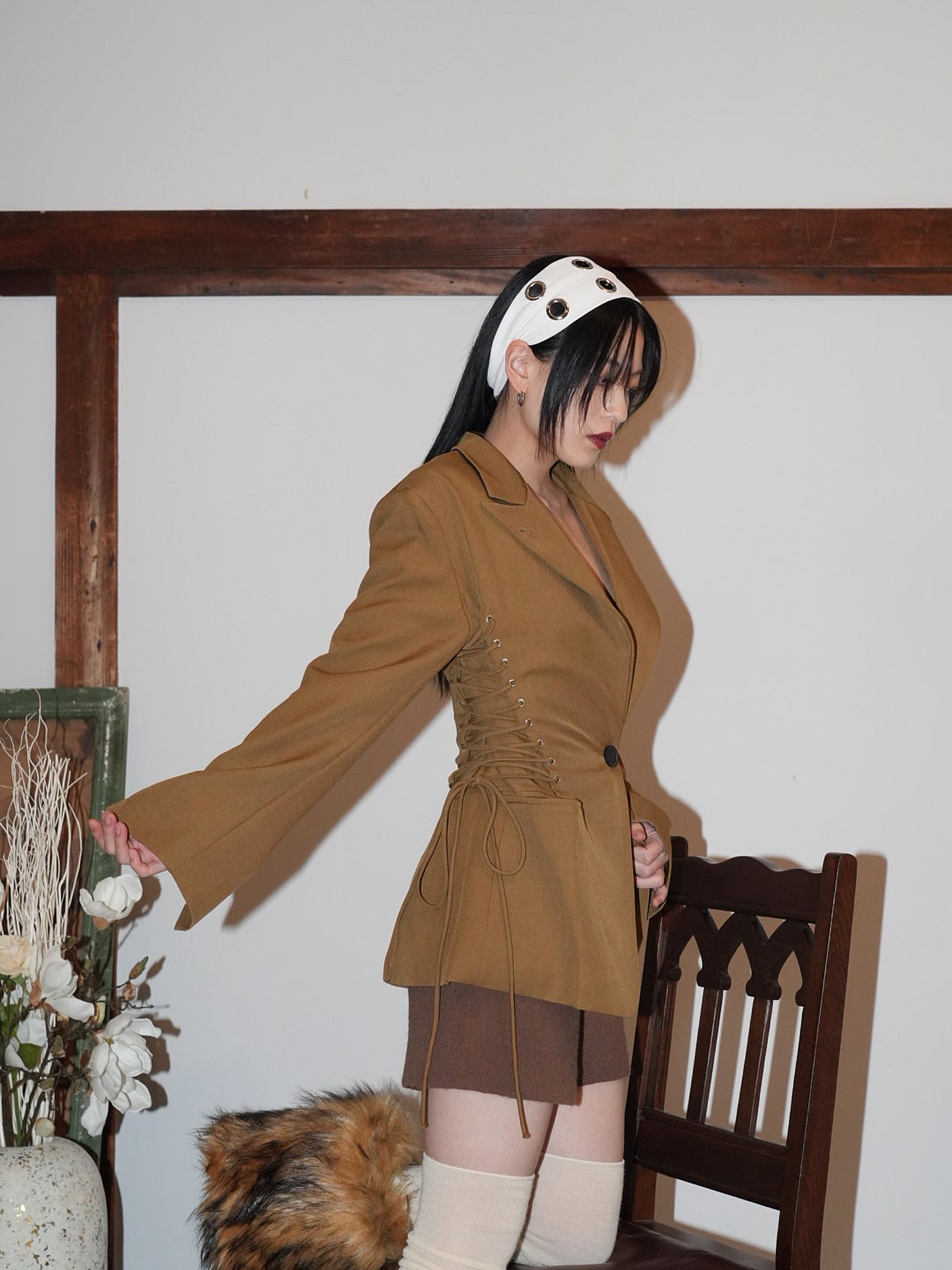 サイドの大胆なレースアップデザインが印象的なジャケット。