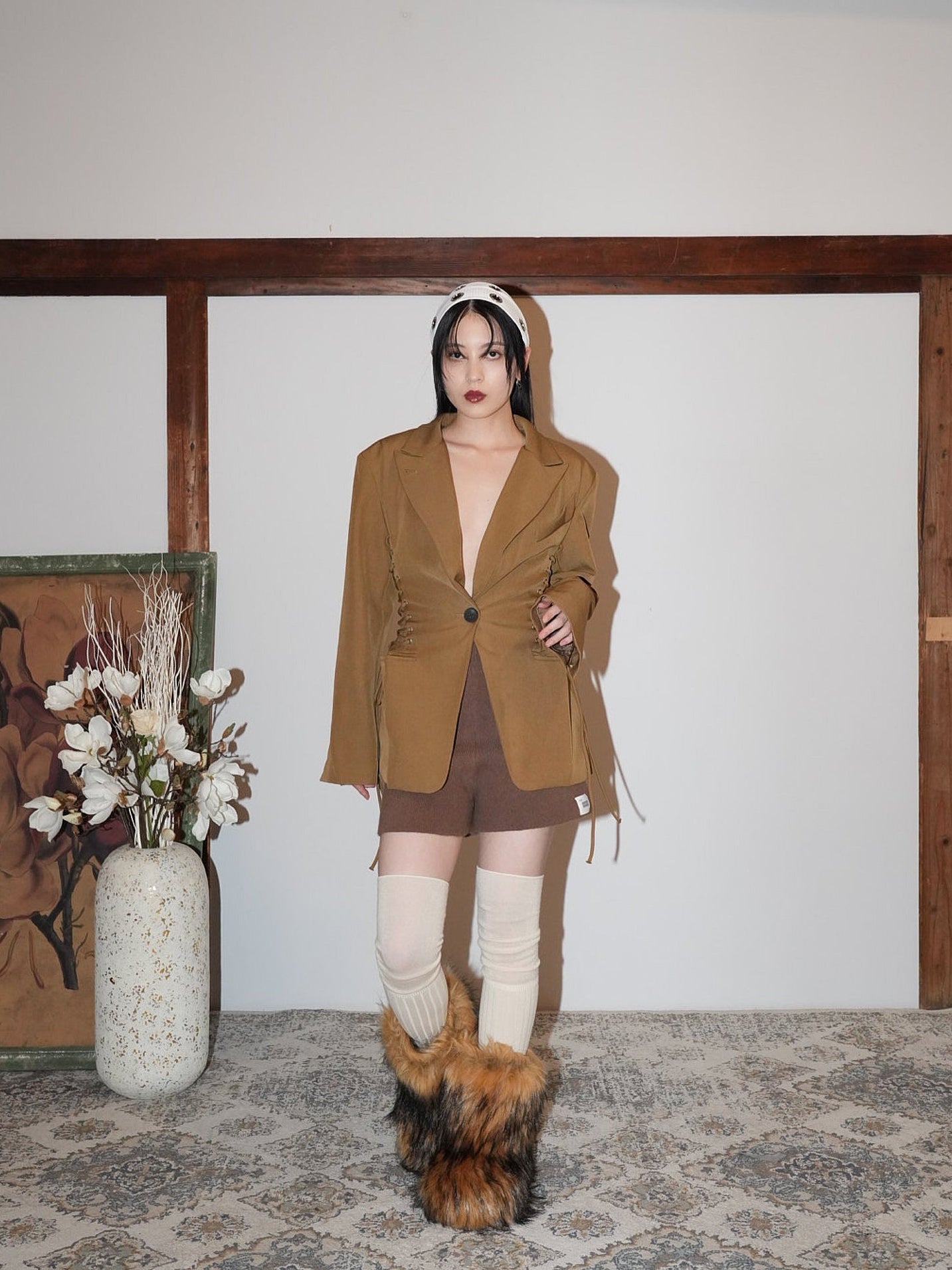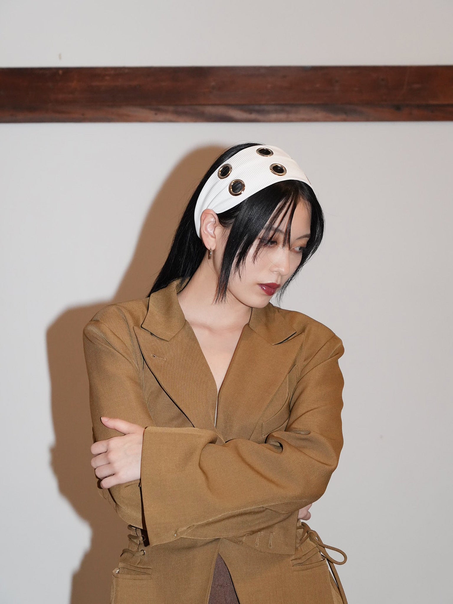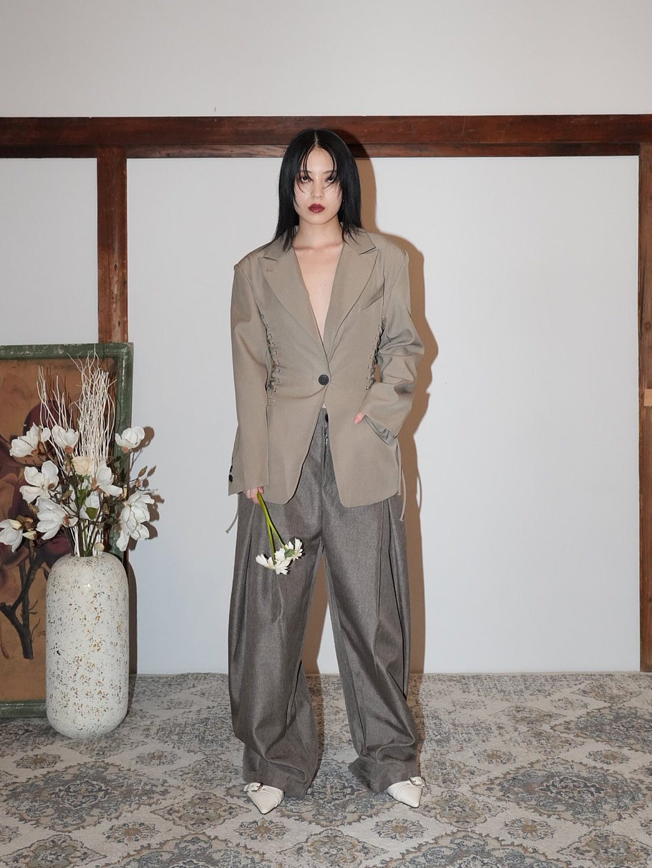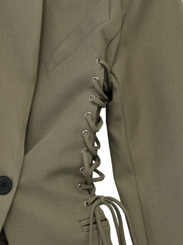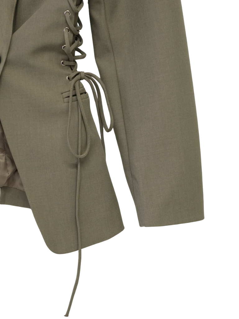 サイドの大胆なレースアップデザインが印象的なジャケット。