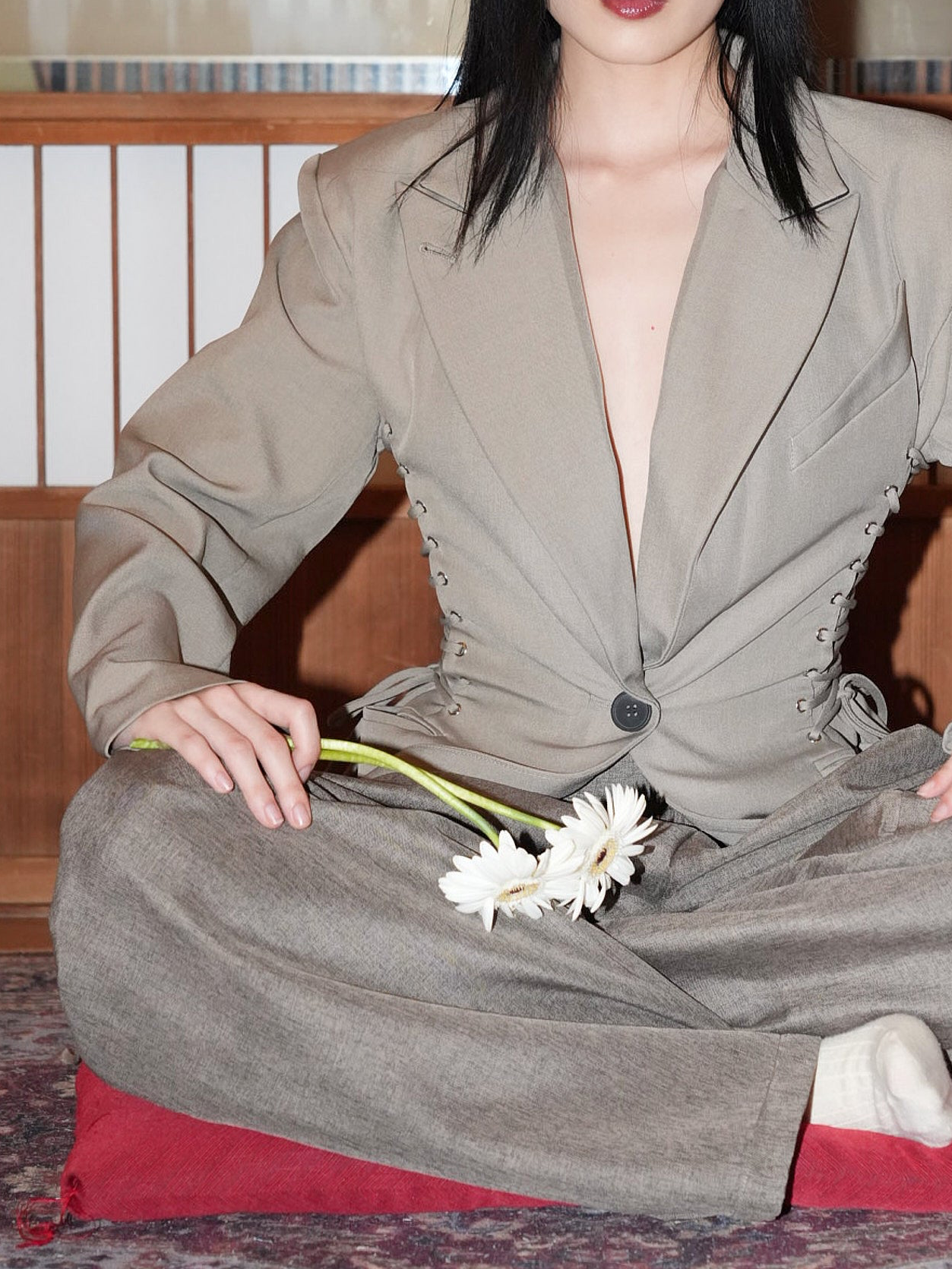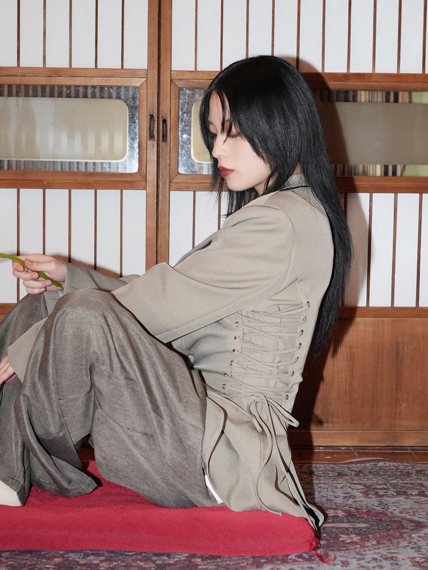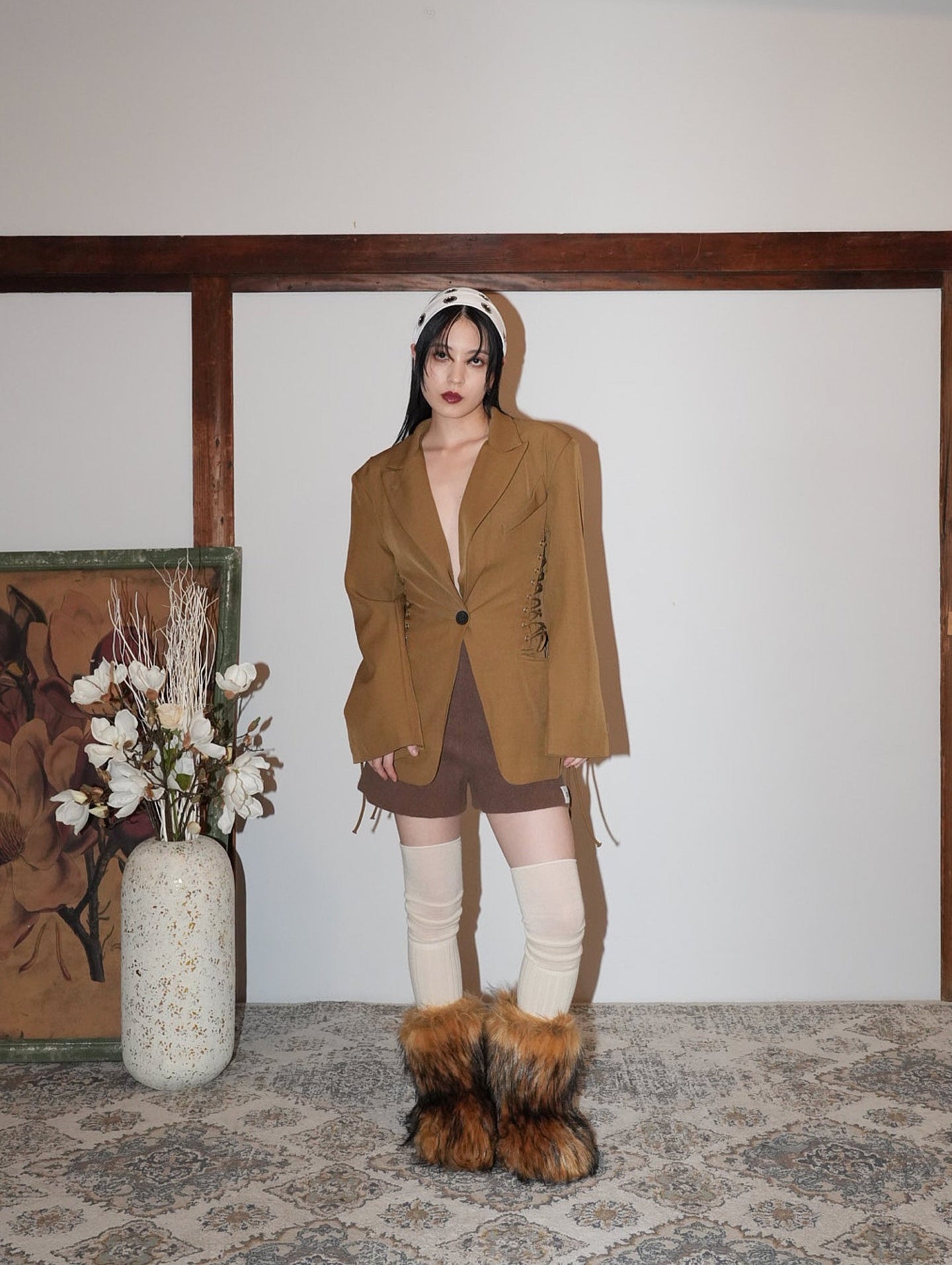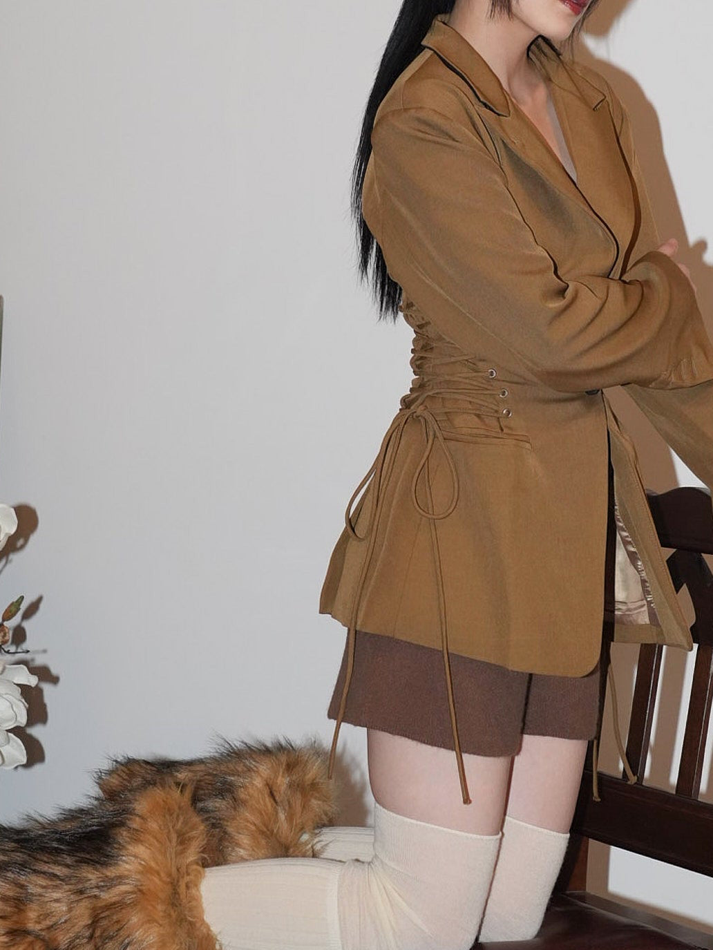 サイドの大胆なレースアップデザインが印象的なジャケット。