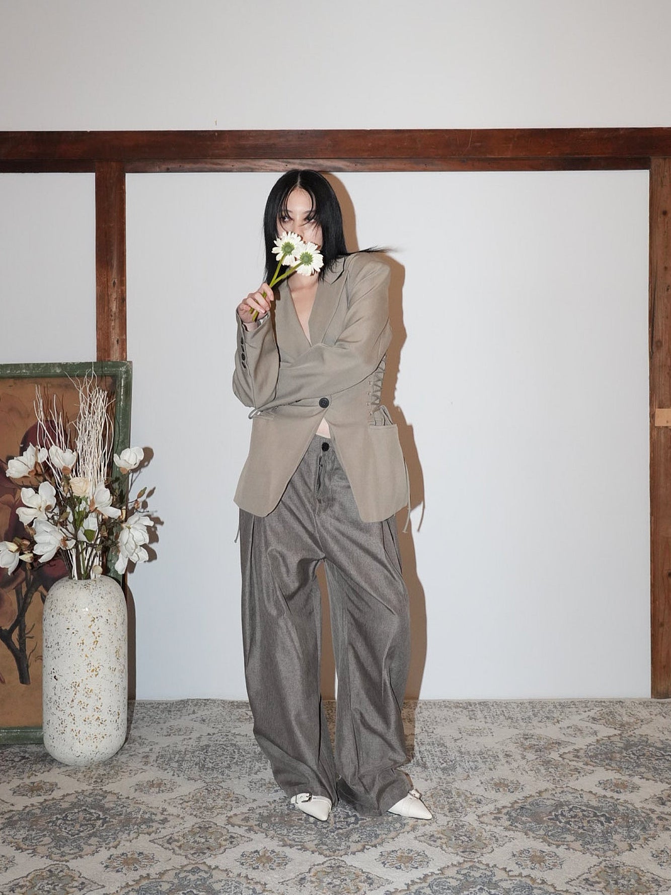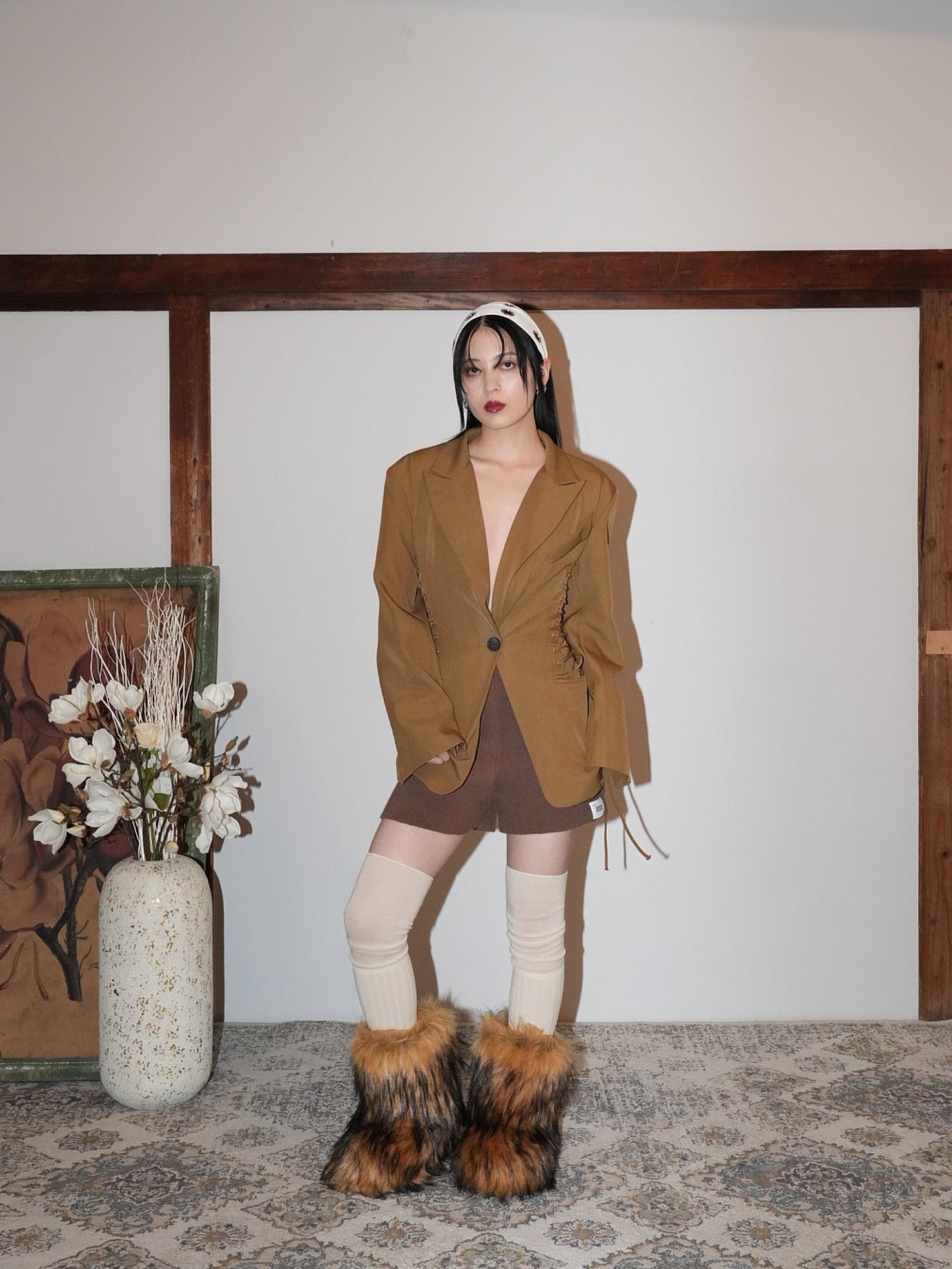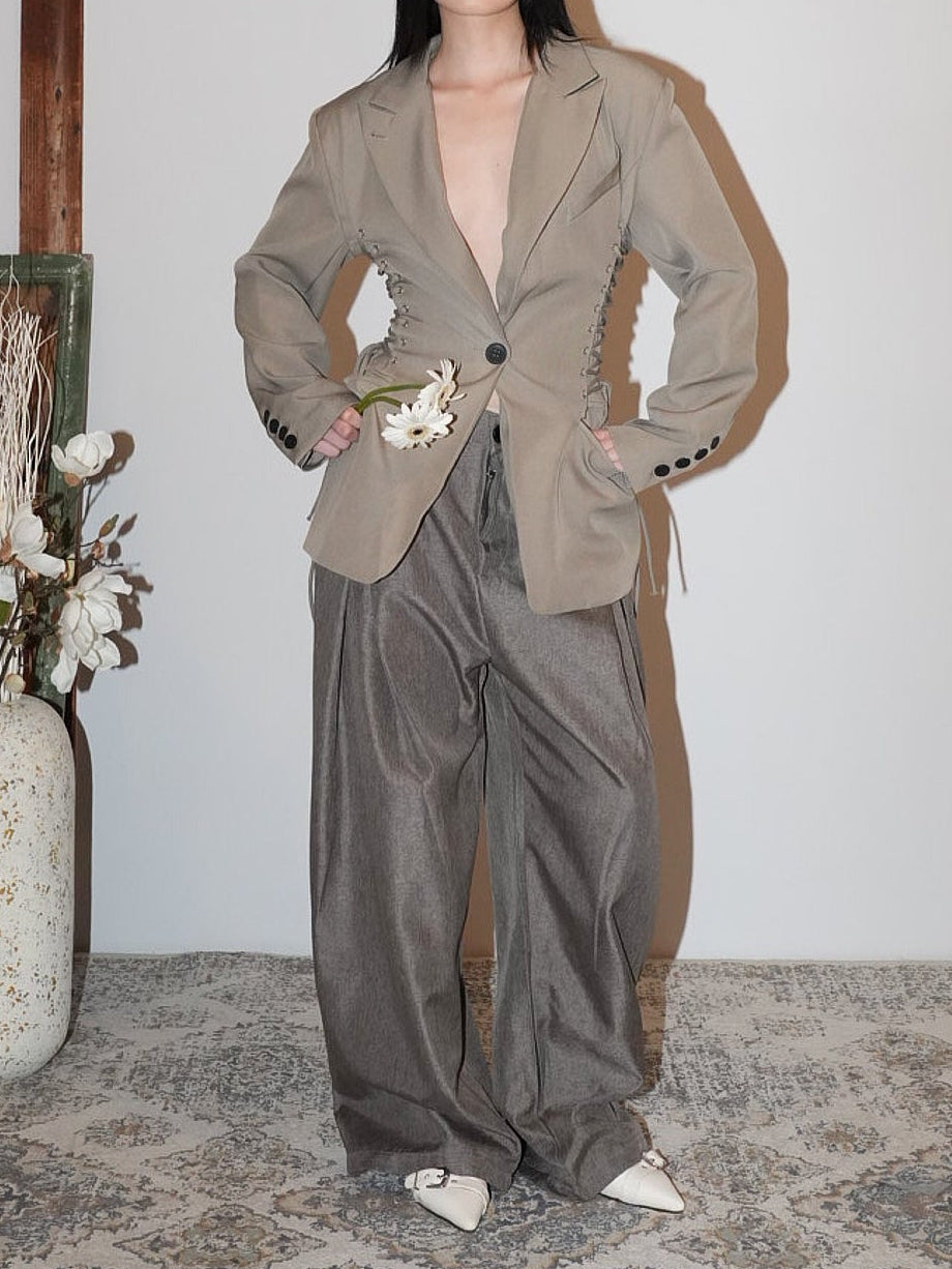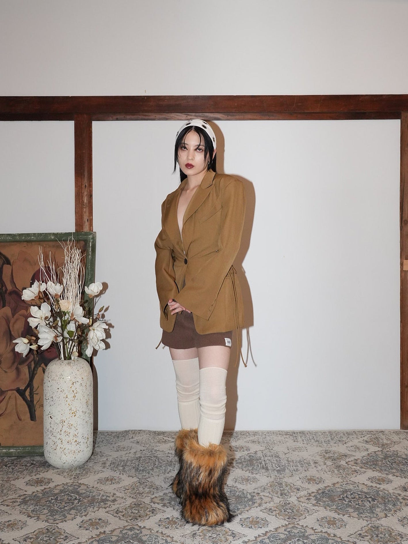 サイドの大胆なレースアップデザインが印象的なジャケット。