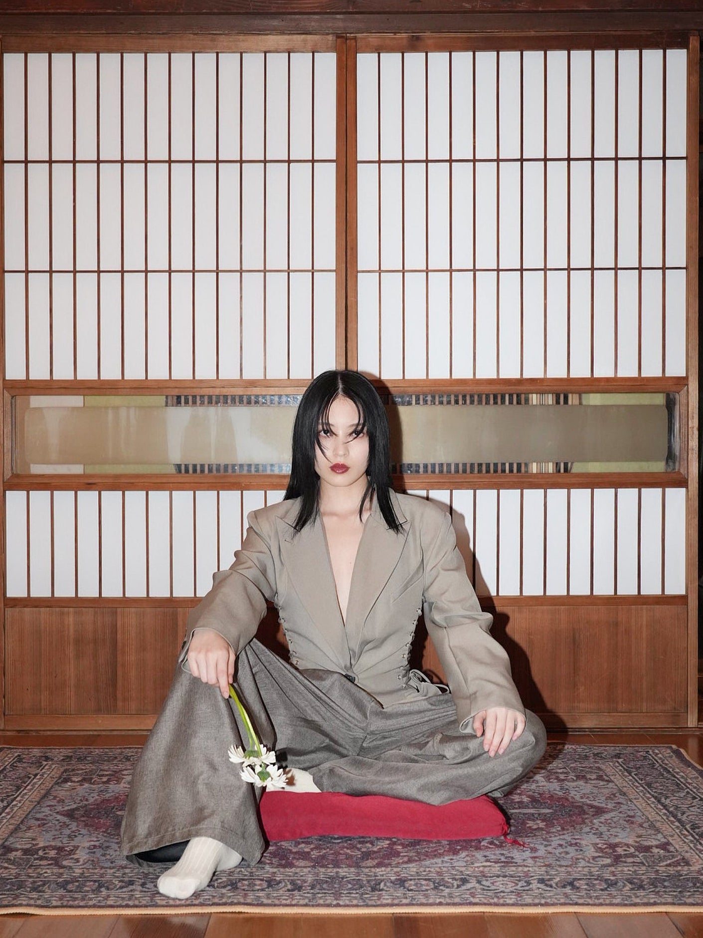襟元は閉じても着用でき、シャープでモードな印象に。