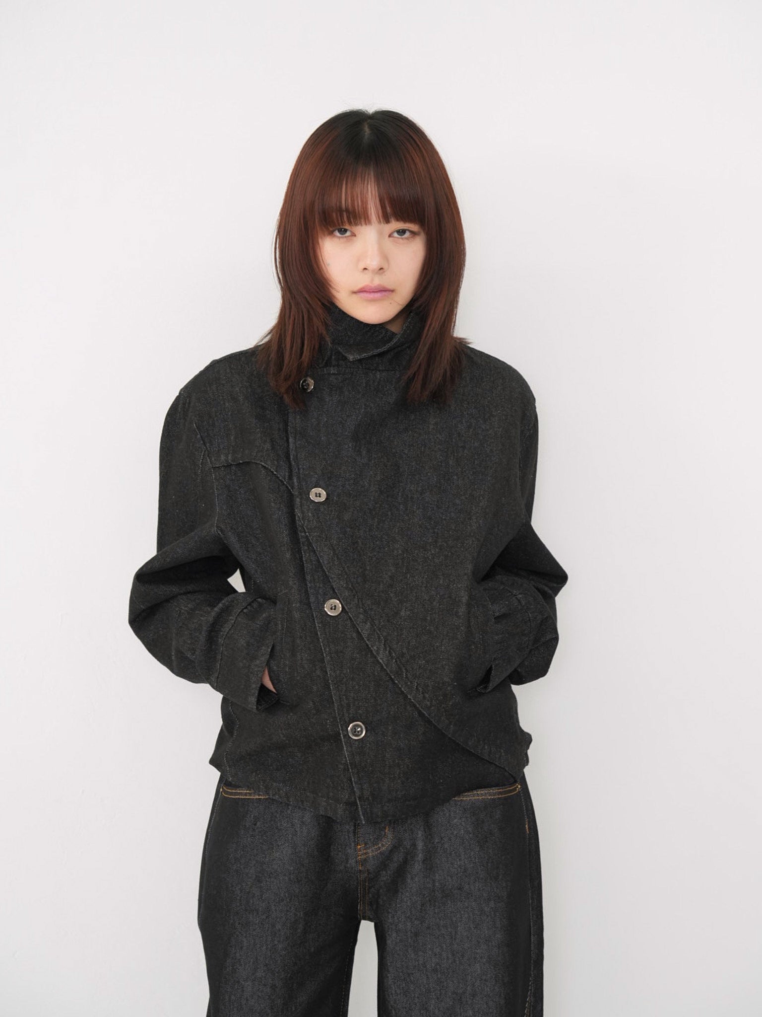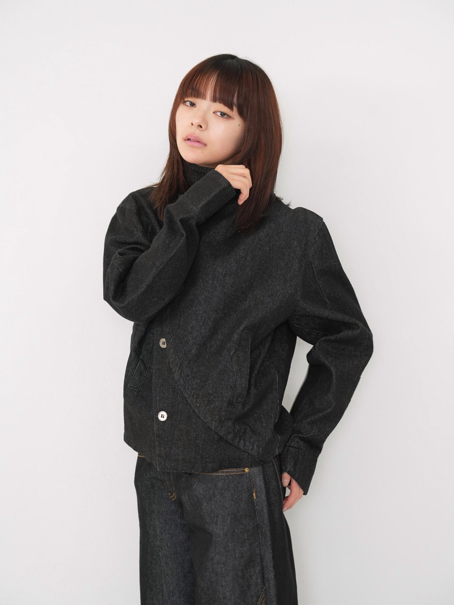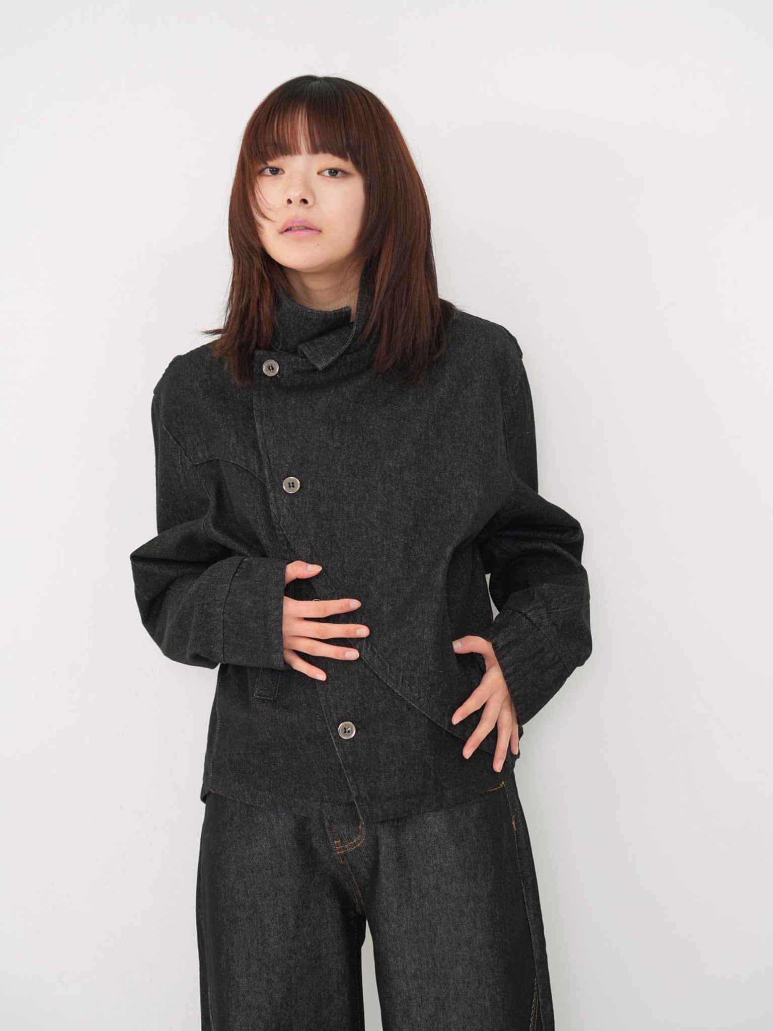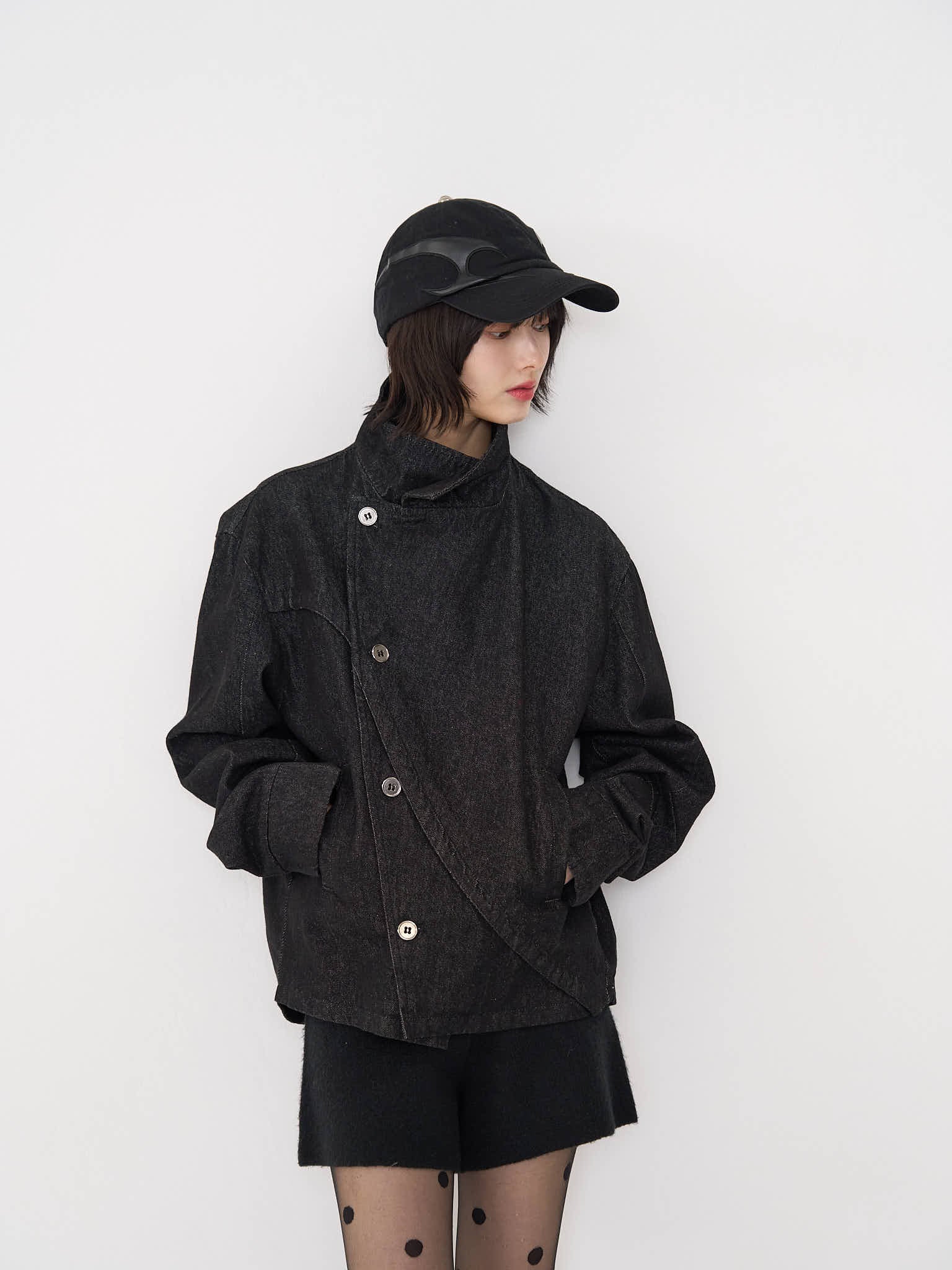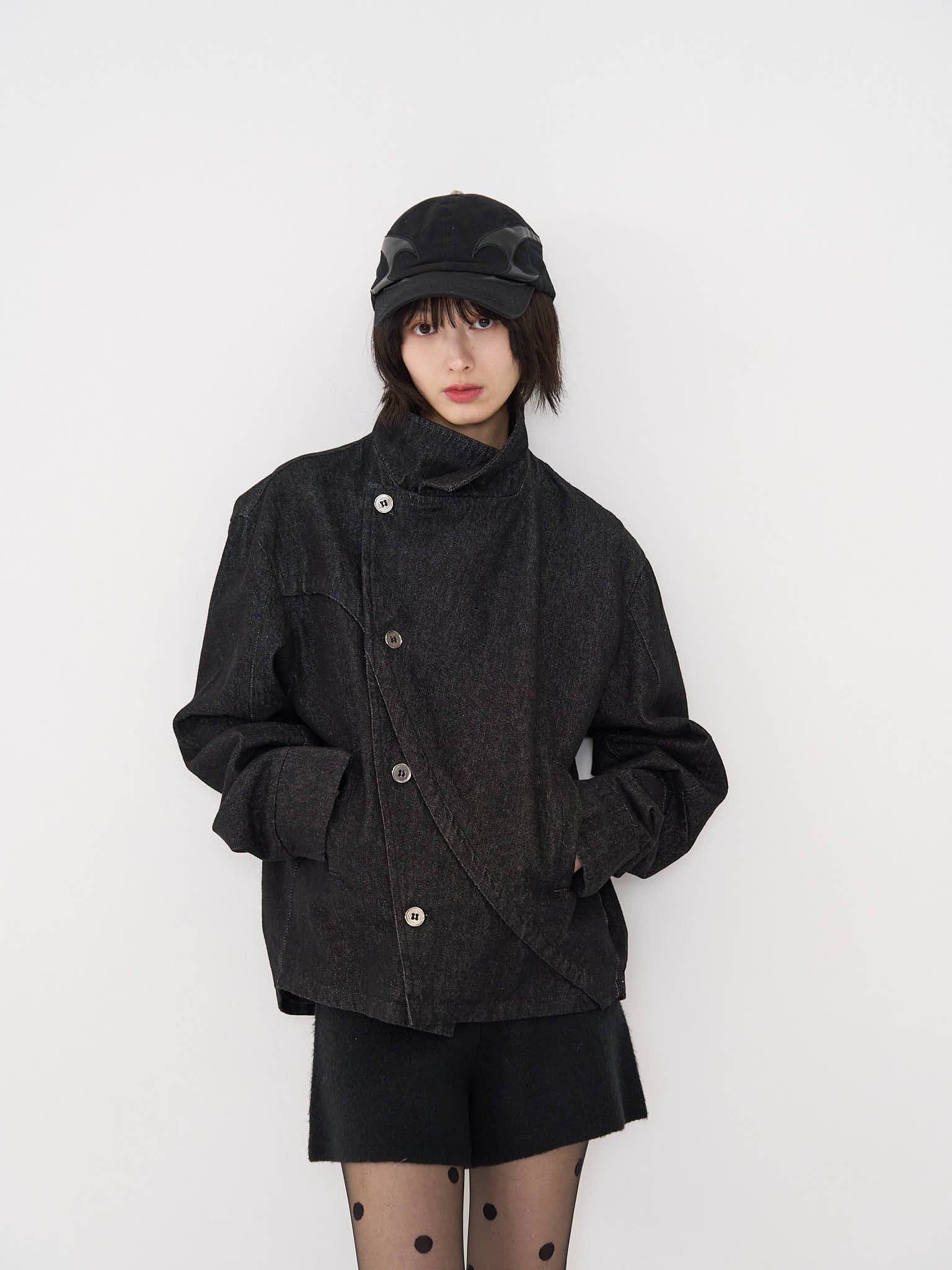 斜めに配されたボタンデザインが印象的なスタンドカラーアウター。コンパクトな丈感と程よく構築されたシルエットで、全体をシャープに引き締める。無駄を削ぎ落としたデザインながら、着るだけで強さと品を纏える一着。