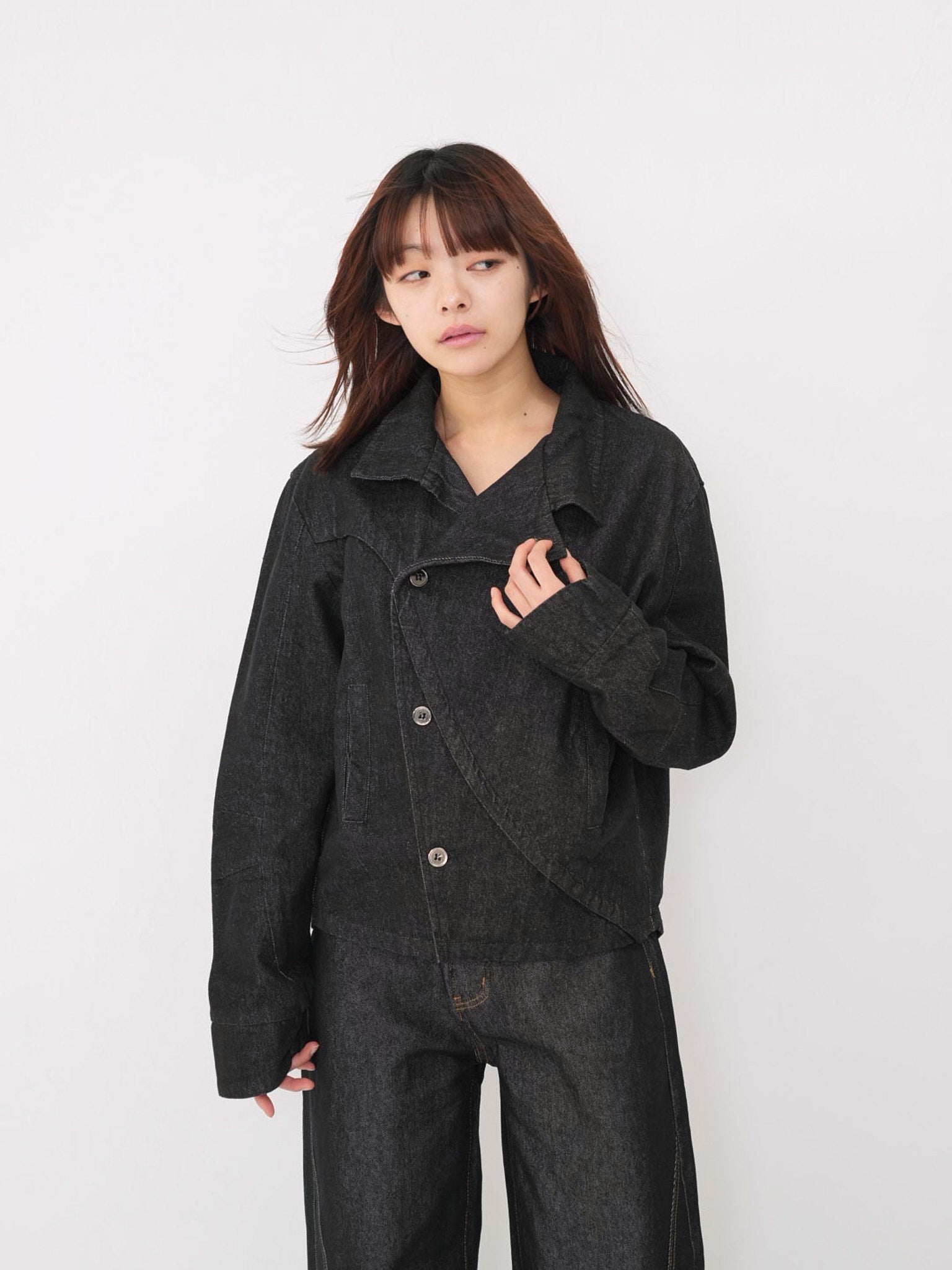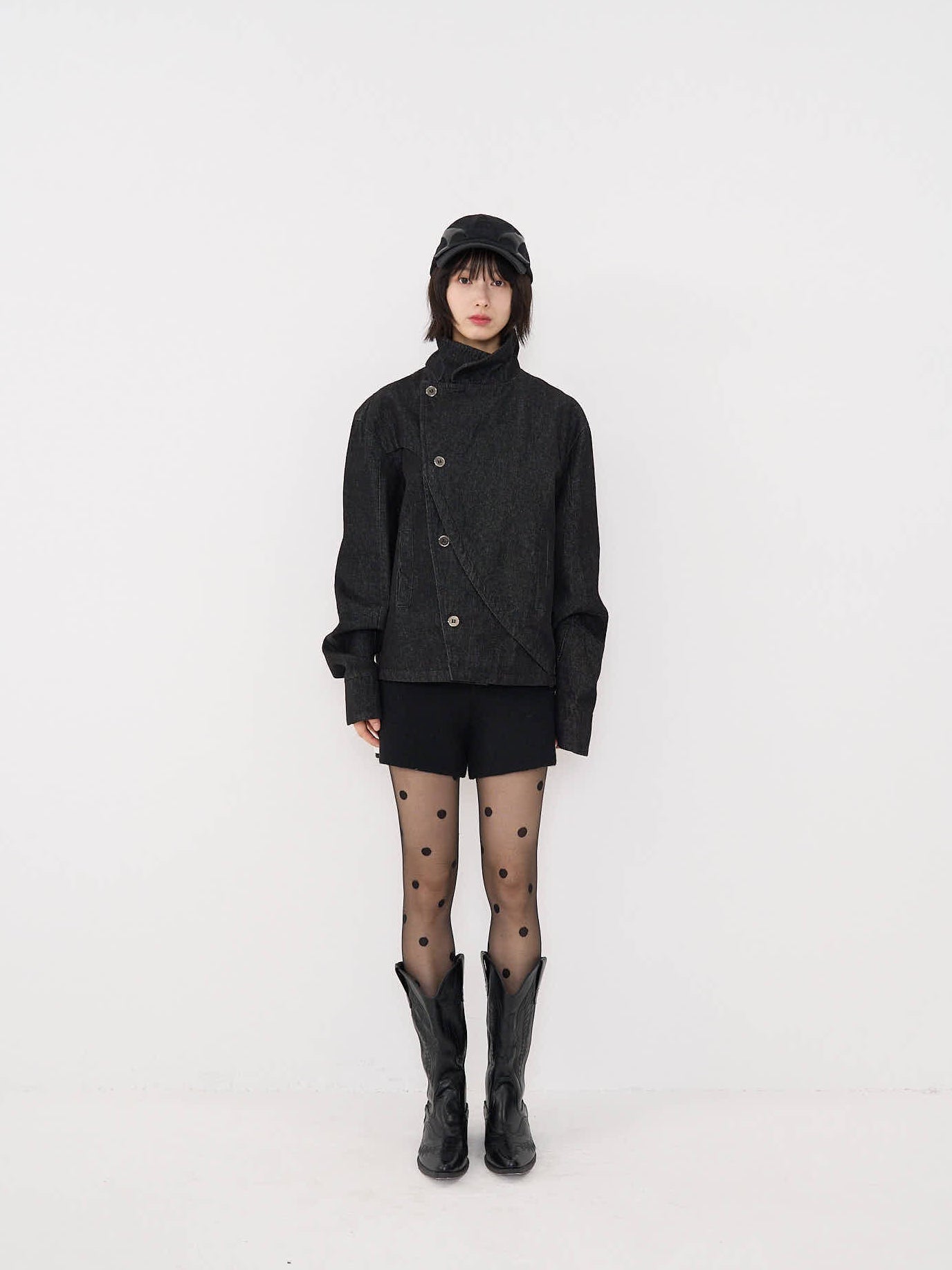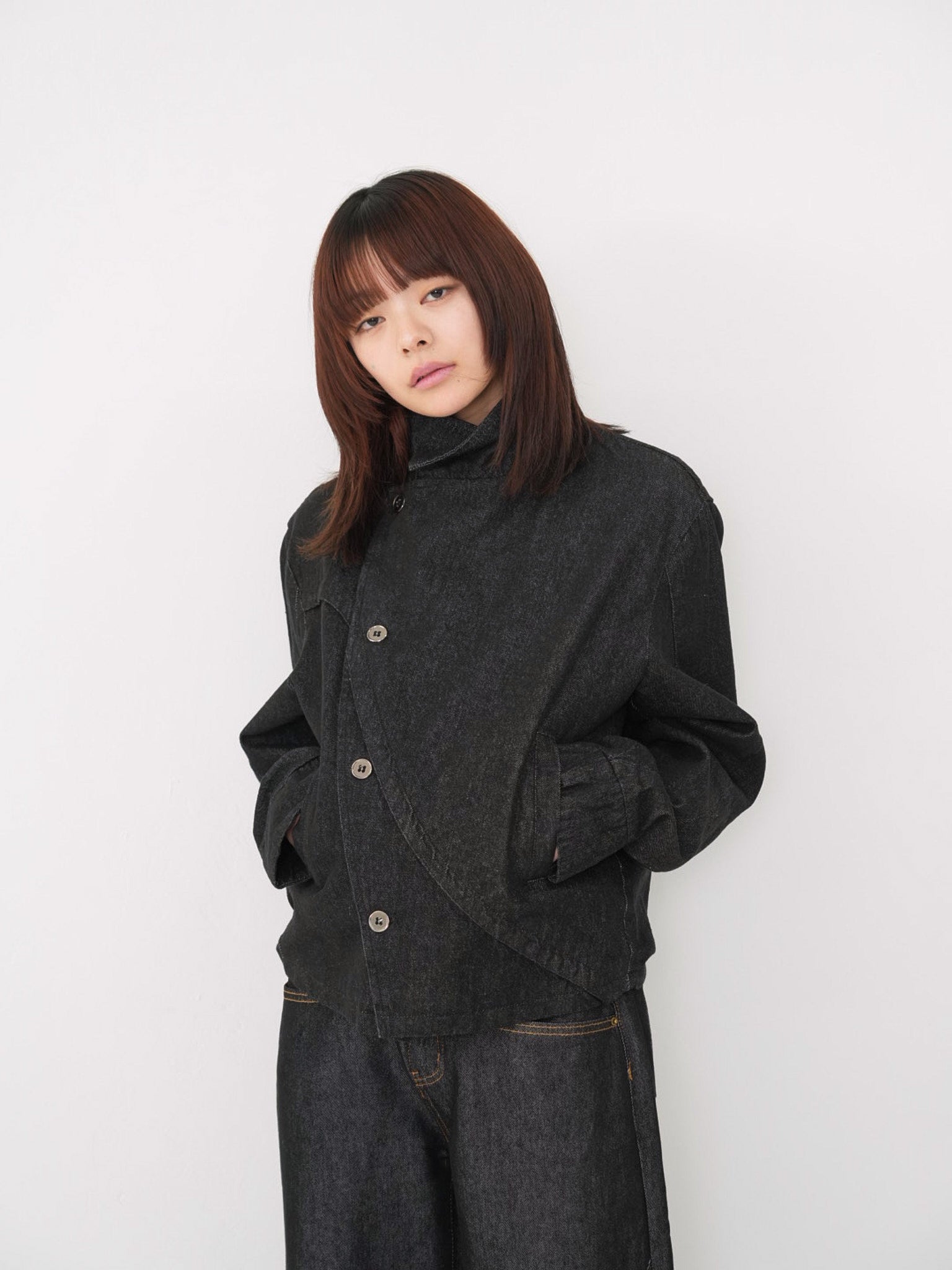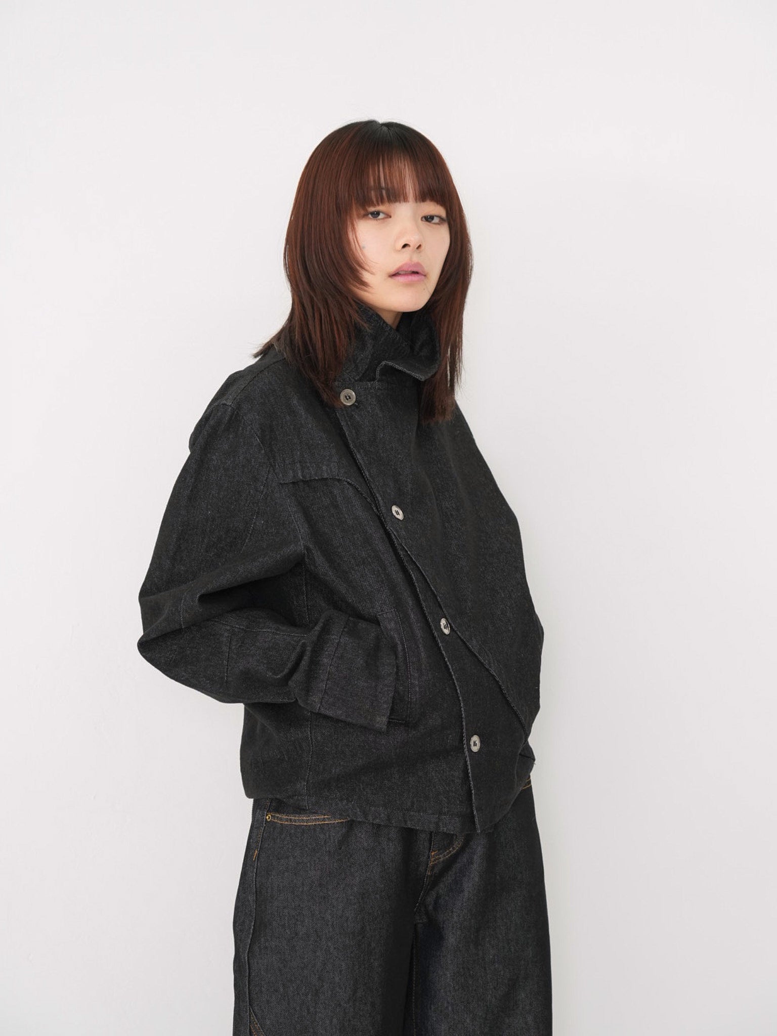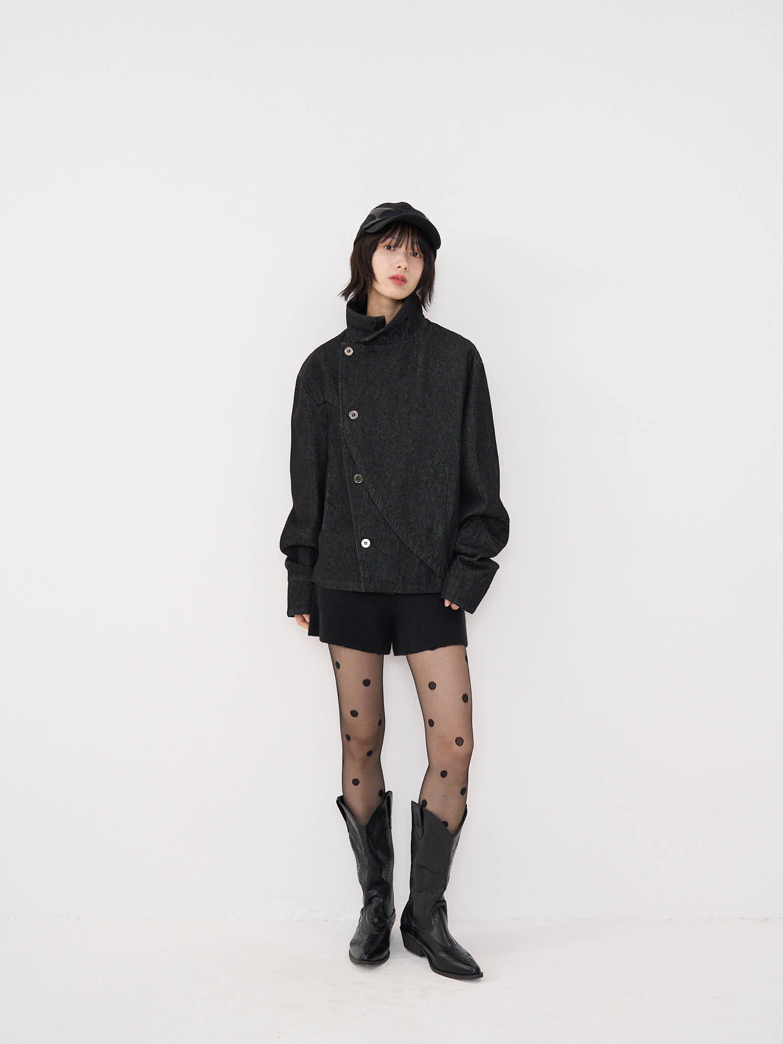 斜めに配されたボタンデザインが印象的なスタンドカラーアウター。コンパクトな丈感と程よく構築されたシルエットで、全体をシャープに引き締める。無駄を削ぎ落としたデザインながら、着るだけで強さと品を纏える一着。