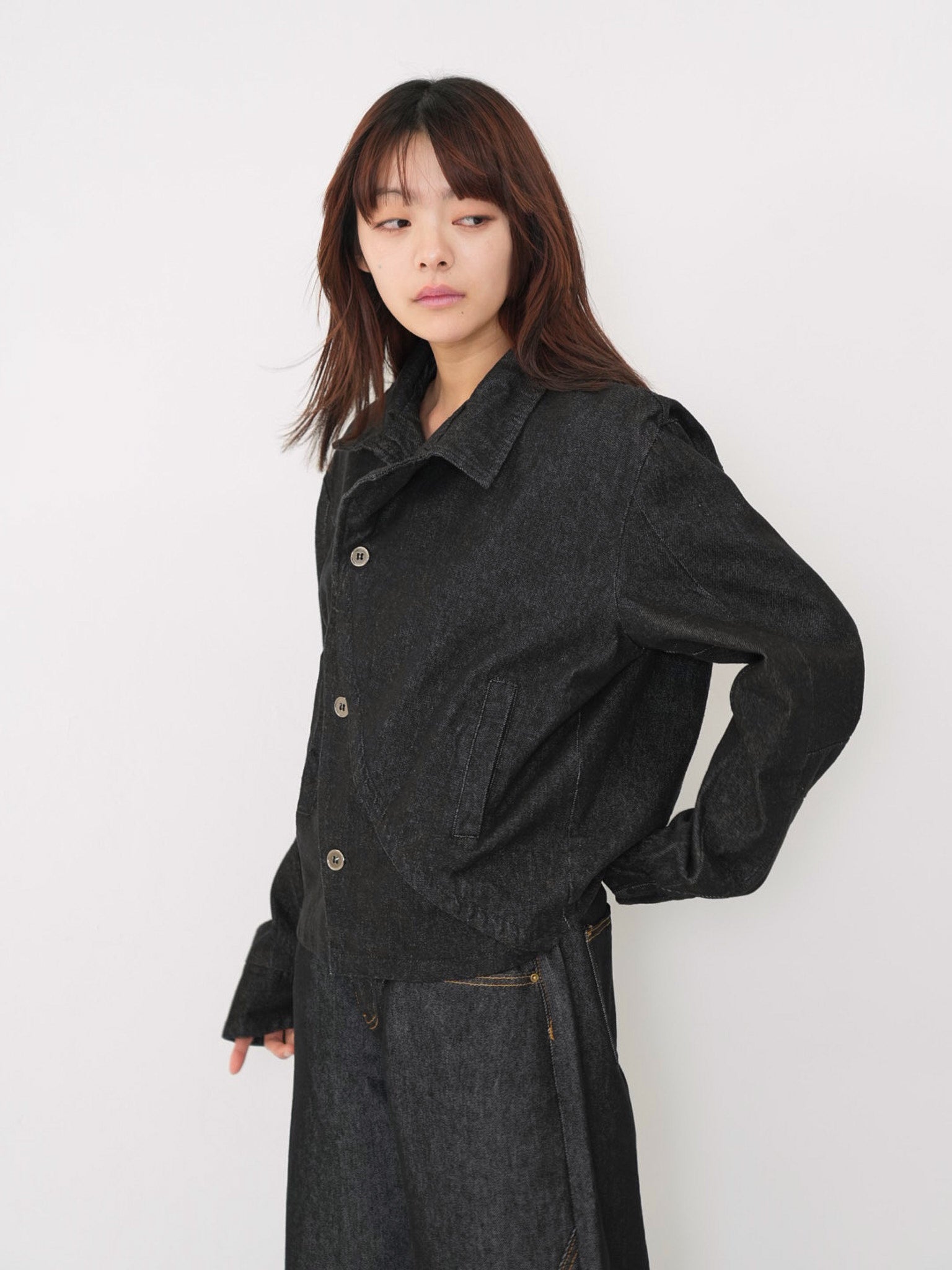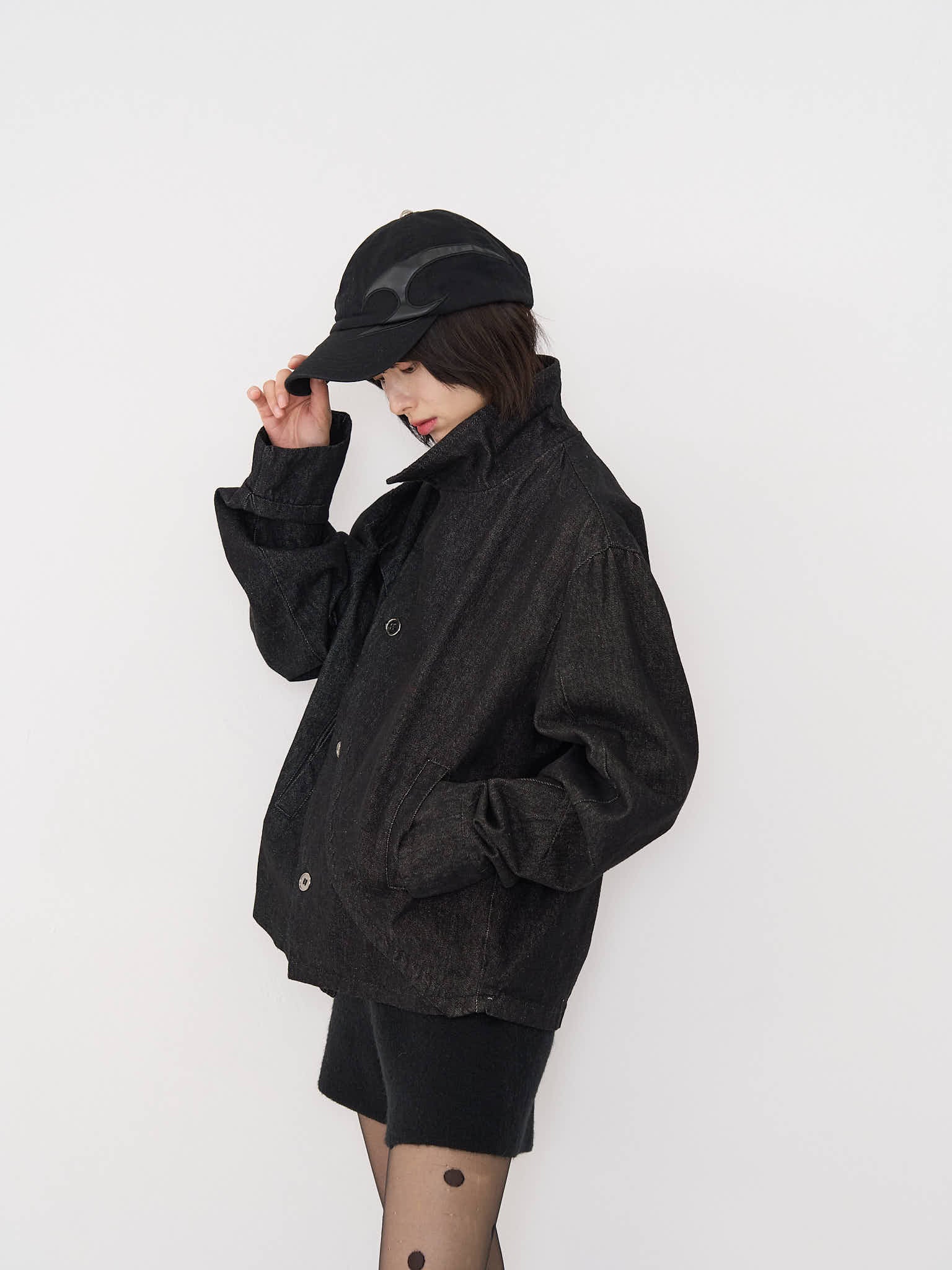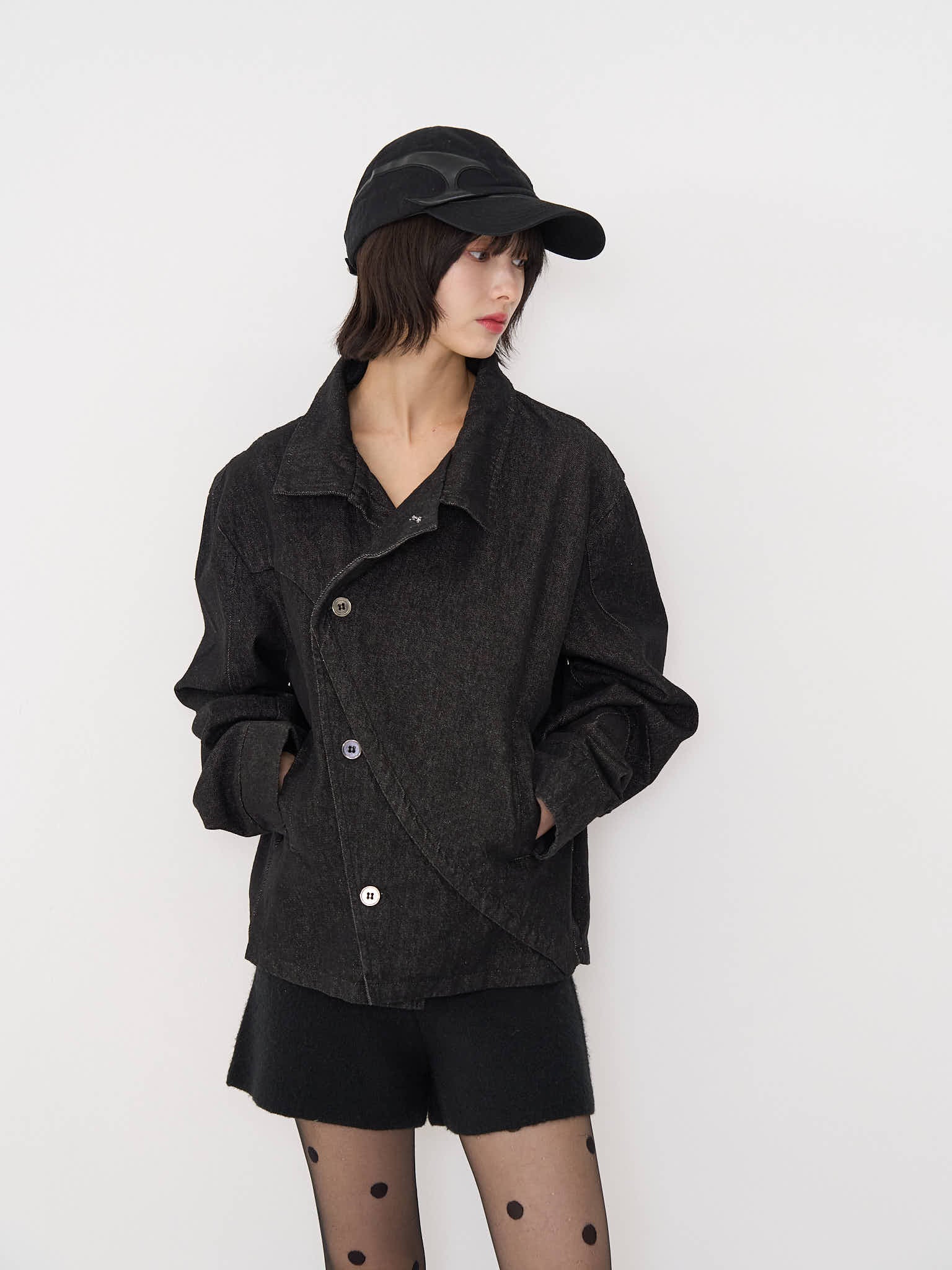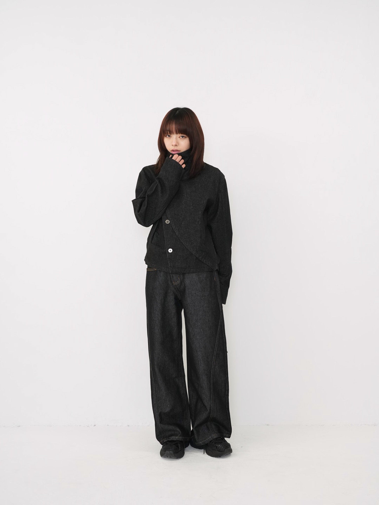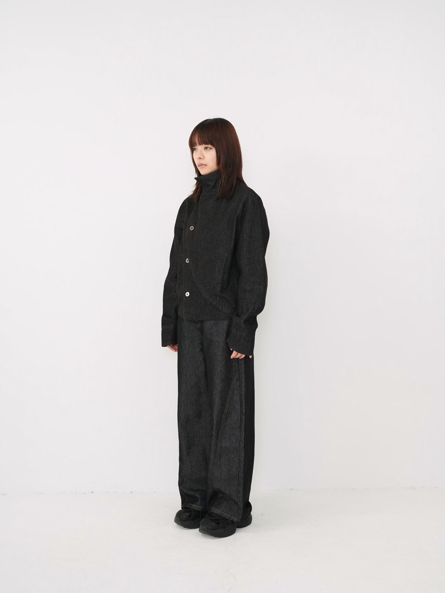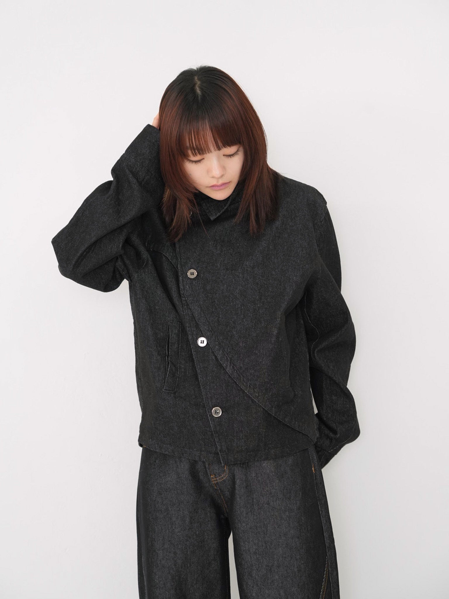 斜めに配されたボタンデザインが印象的なスタンドカラーアウター。コンパクトな丈感と程よく構築されたシルエットで、全体をシャープに引き締める。無駄を削ぎ落としたデザインながら、着るだけで強さと品を纏える一着。