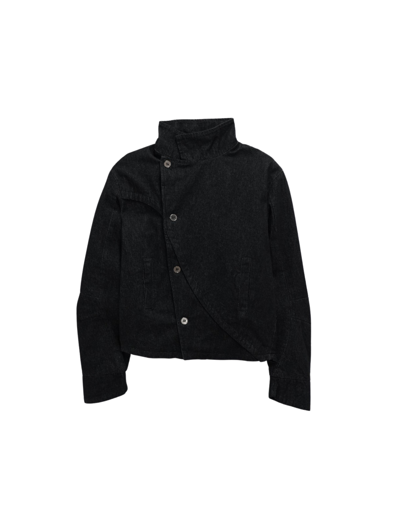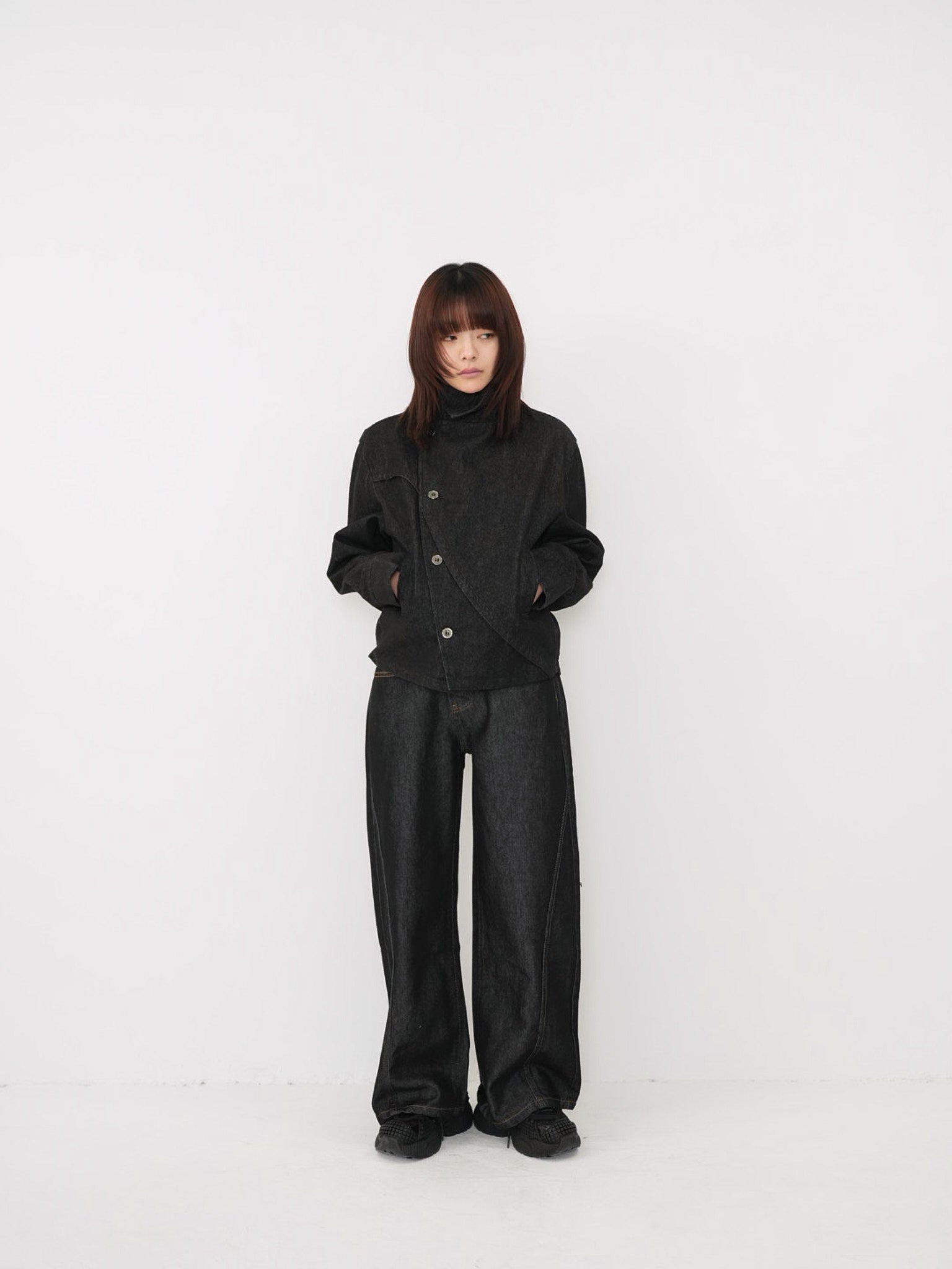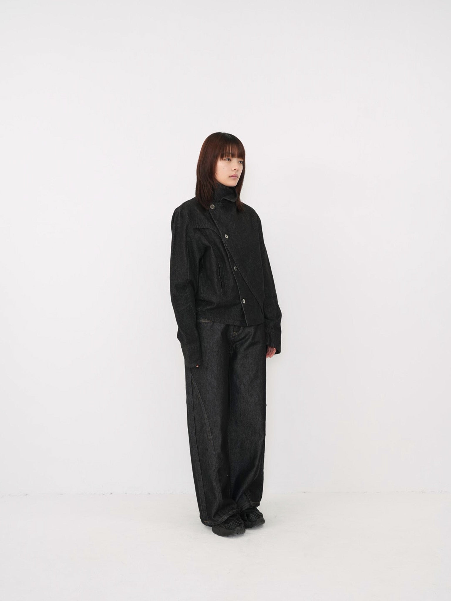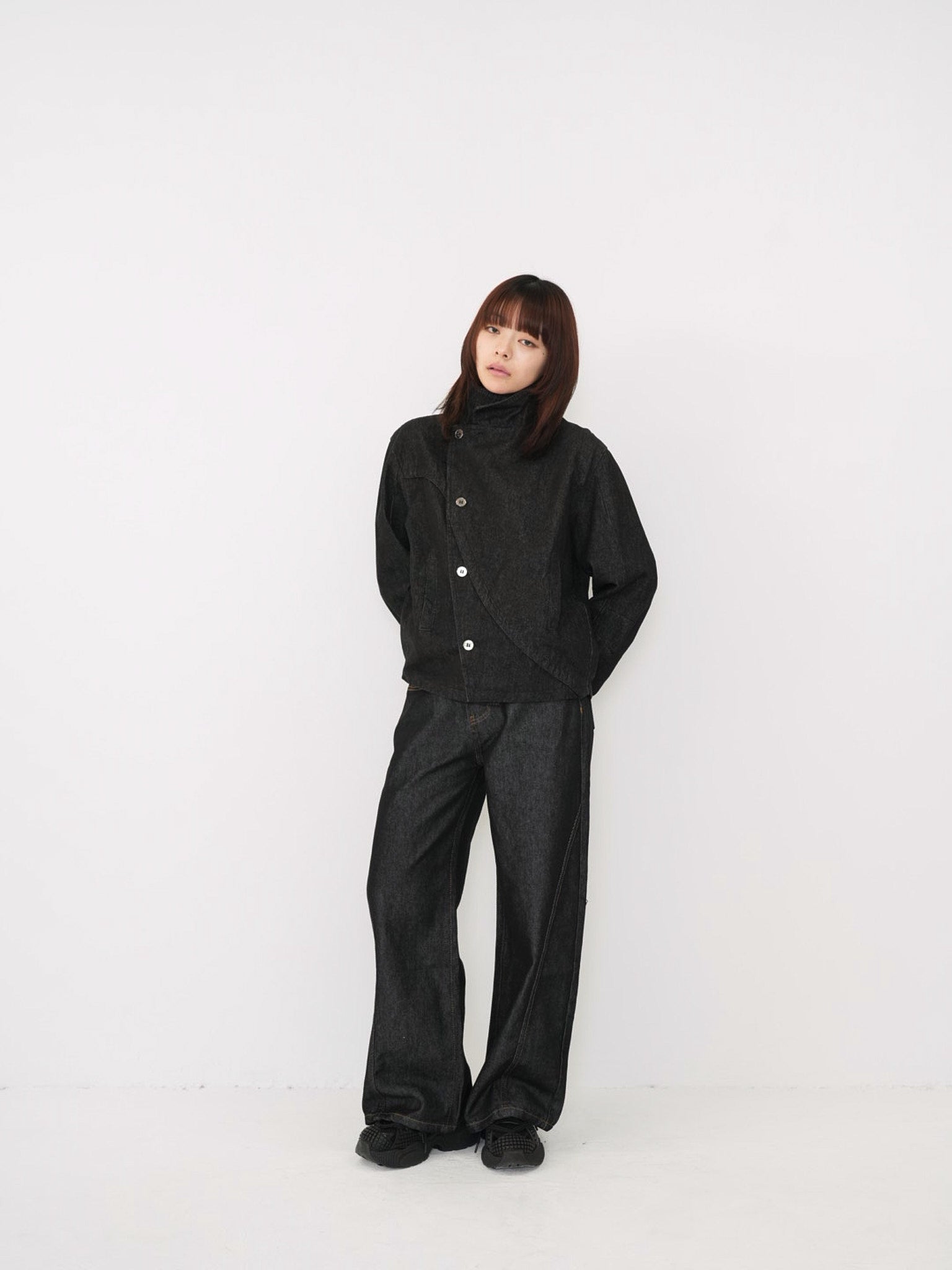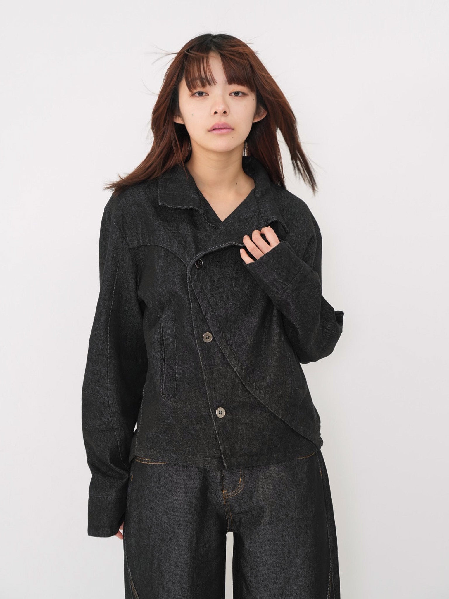 斜めに配されたボタンデザインが印象的なスタンドカラーアウター。コンパクトな丈感と程よく構築されたシルエットで、全体をシャープに引き締める。無駄を削ぎ落としたデザインながら、着るだけで強さと品を纏える一着。